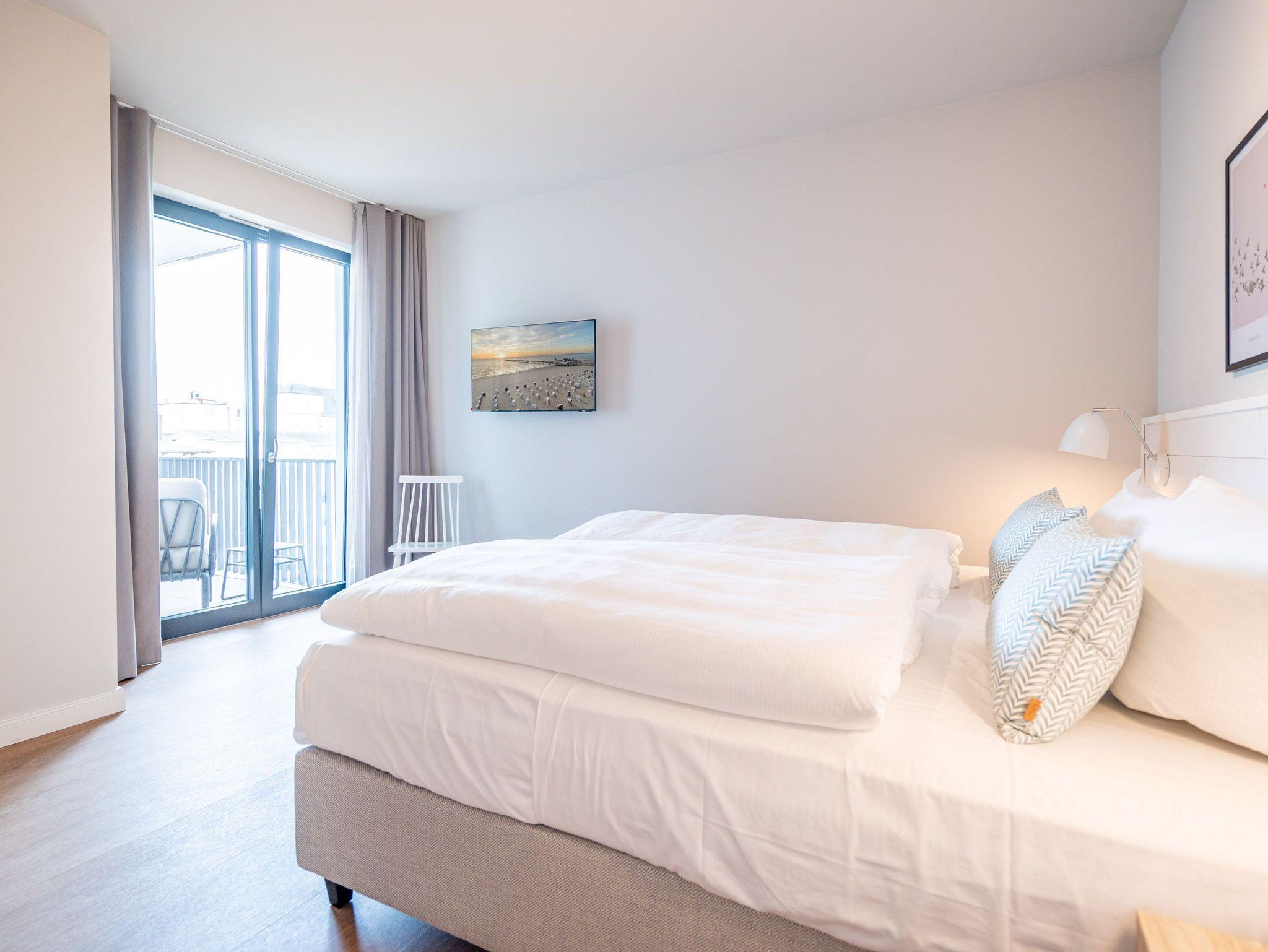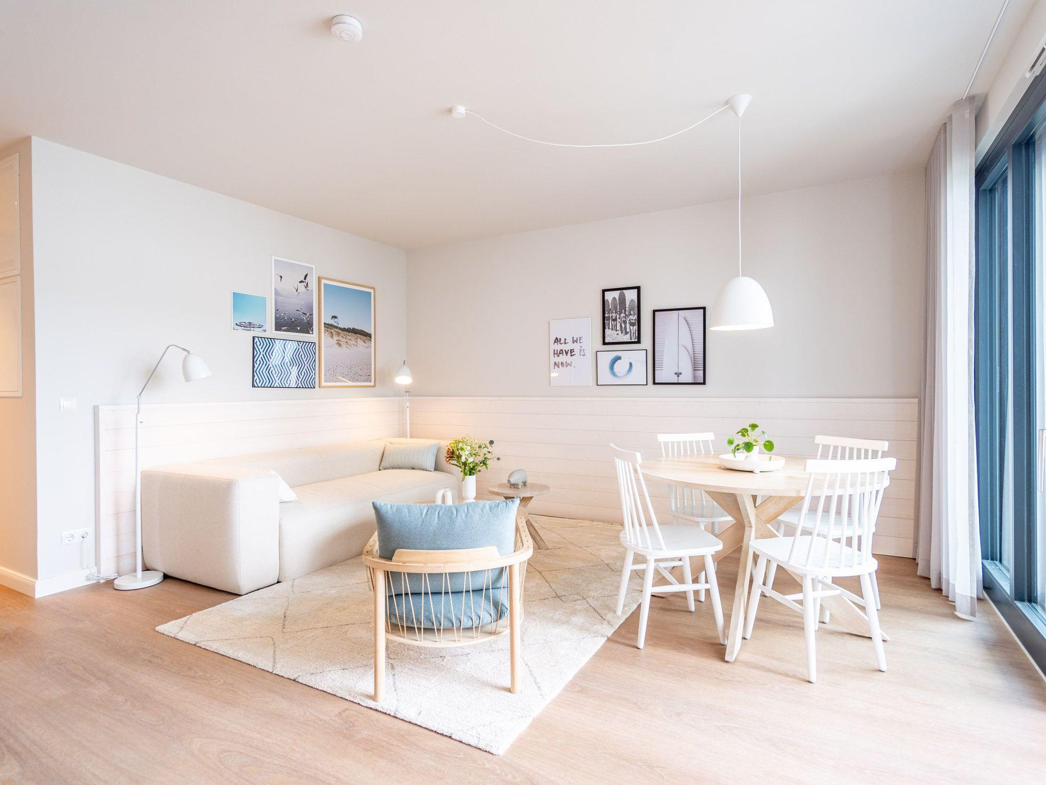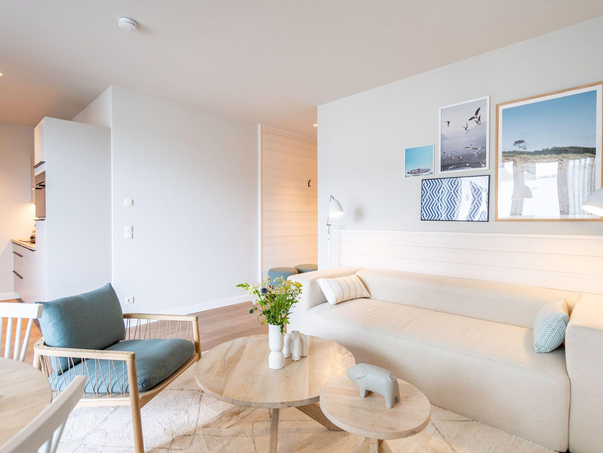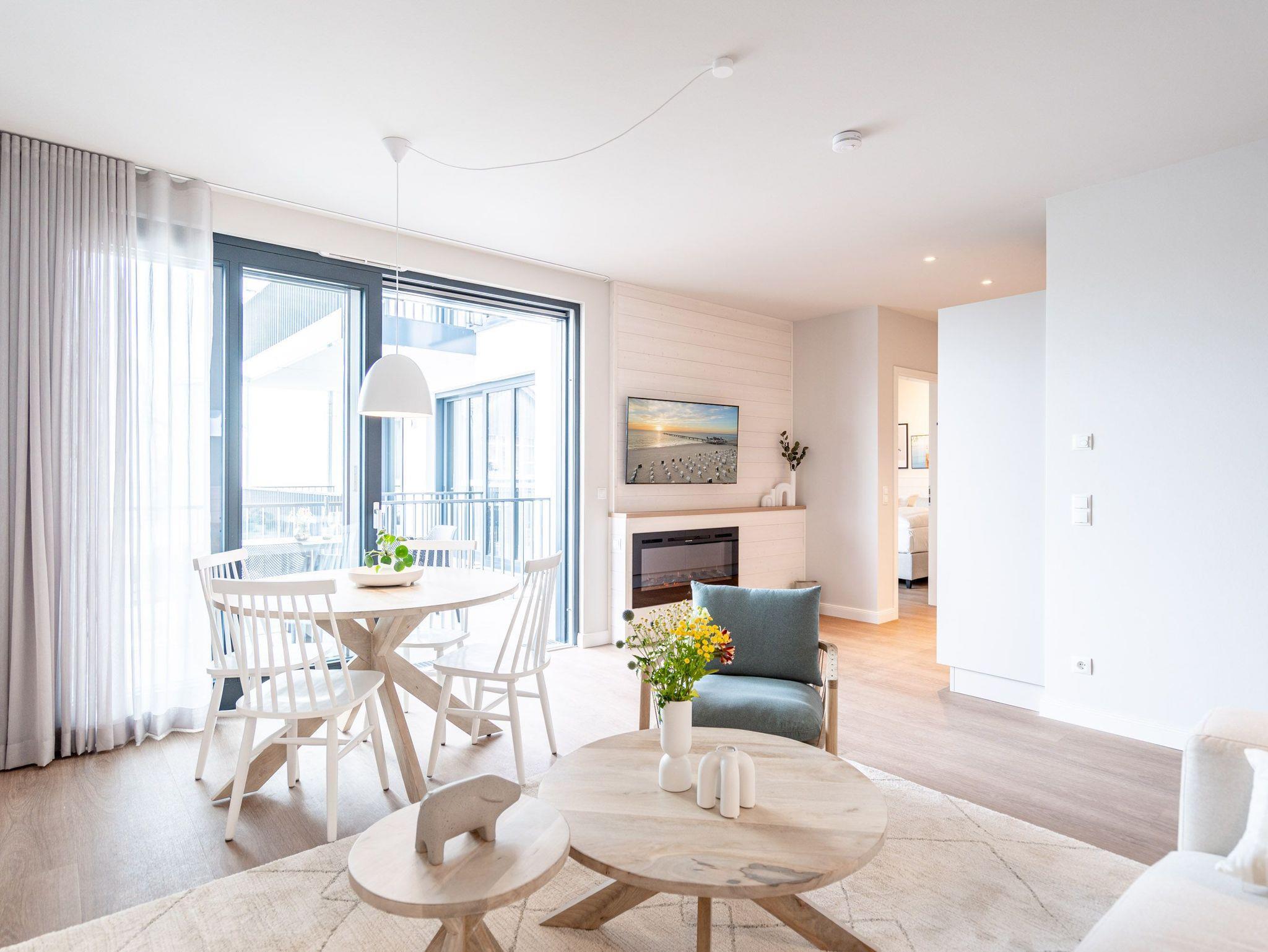 Helle, lichtdurchflutete Räume, ein hyggeliges Designkonzept und allen Komfort, den man sich nur wünschen kann ? das 2-Raum-Appartement B 2.9 (Haus B) in der 2. Etage der Strandterrasse bietet auf 60 Quadratmetern zwei Personen und einem Kind bis 5 Jahre all das und noch viele weitere Annehmlichkeiten. Hier wird Ihre Ostseeauszeit zu einem unvergesslich schönen Erlebnis, denn Sie wohnen in einem Urlaubsparadies, aus dem Sie am liebsten gar nicht wieder ausziehen wollen. Das großzügige und wunderschön eingerichtete Wohn-Esszimmer lädt zum Genießen am großen Esstisch und zum Relaxen auf der gemütlichen Sofa-Sitzgruppe ein. Ein Flat-TV (50 Zoll) sorgt für Kinounterhaltung und ein Elektrokamin (ohne Wärmeabgabe) schafft mit seinem flackernden Flammenspiel eine kuschelig romantische Atmosphäre. In der offenen Küchenzeile ist alles vorhanden, was Sie für die Zubereitung gemeinsamer Mahlzeiten brauchen. Dazu gehören ein Backofen, ein 3-Platten-Induktionsherd, ein Toaster, ein Wasserkocher, eine Kaffeemaschine und eine Nespresso-Kapselmaschine. Sowohl vom Schlafzimmer als auch vom Wohnzimmer aus haben Sie Zugang auf einen Nord-Ost-Balkon. Ob morgens gleich nach dem Aufstehen oder beim Essen unter freiem Himmel ? lassen Sie sich sie frische Ostseeluft, die vom nahen Strand herüberrauscht, genüsslich um die Nase wehen. Sie ist sehr gesund. Im Schlafzimmer wartet ein komfortables Boxspringdoppelbett (1,80m x 2,00m) und ein Kindertagesbett (0,80m x 1,40m) nur darauf, Ihnen himmlische Träume zu verschaffen. Im modernen Badezimmer gibt es neben der Dusche, dem Waschtisch und dem WC sogar eine Infrarotsauna. Hier können Sie in wohliger Wärme die Zeit vergessen. Ein PKW-Stellplatz in der Tiefgarage sorgt für bequemes Parken. Wir wünschen Ihnen viel Freude in diesem charmanten Urlaubsdomizil.