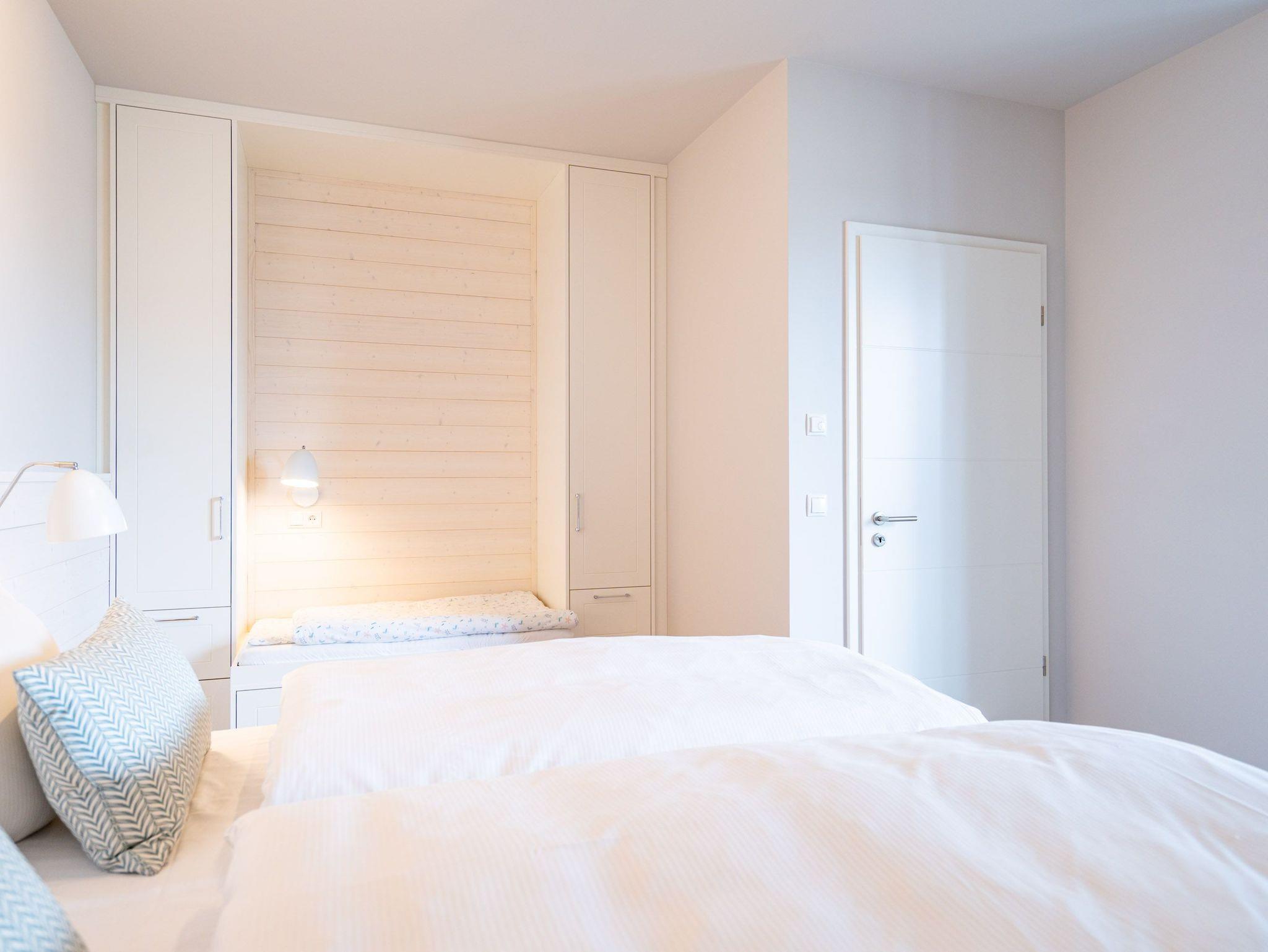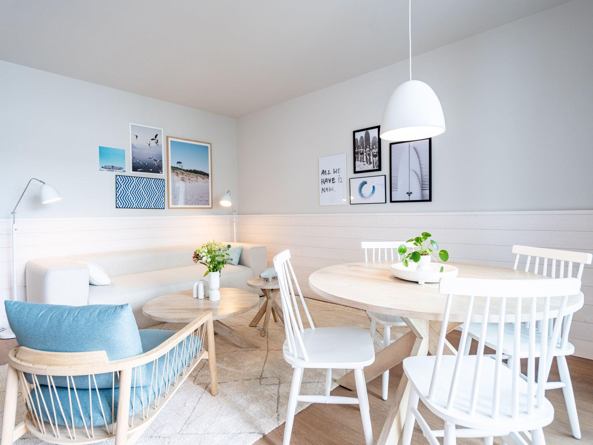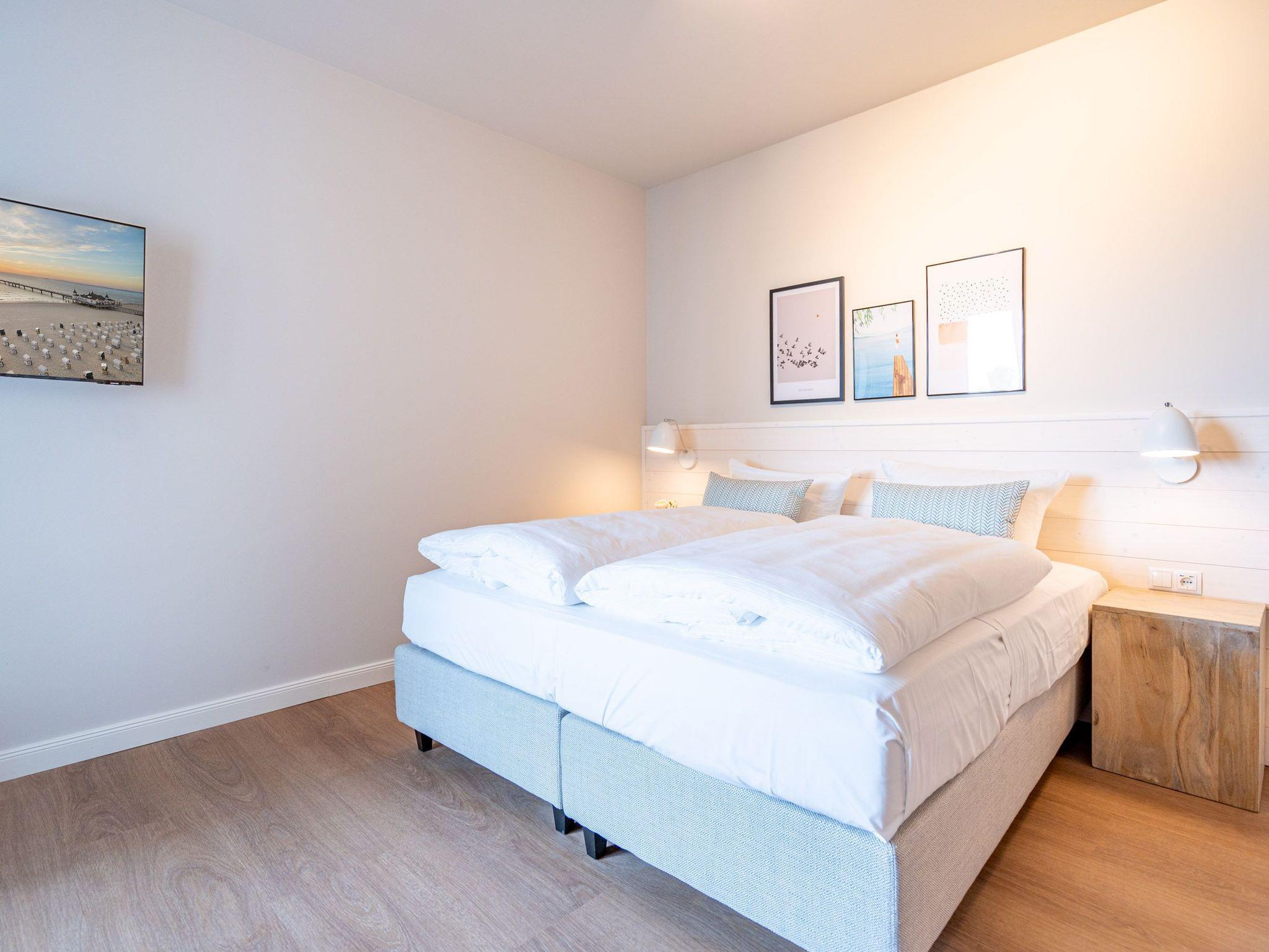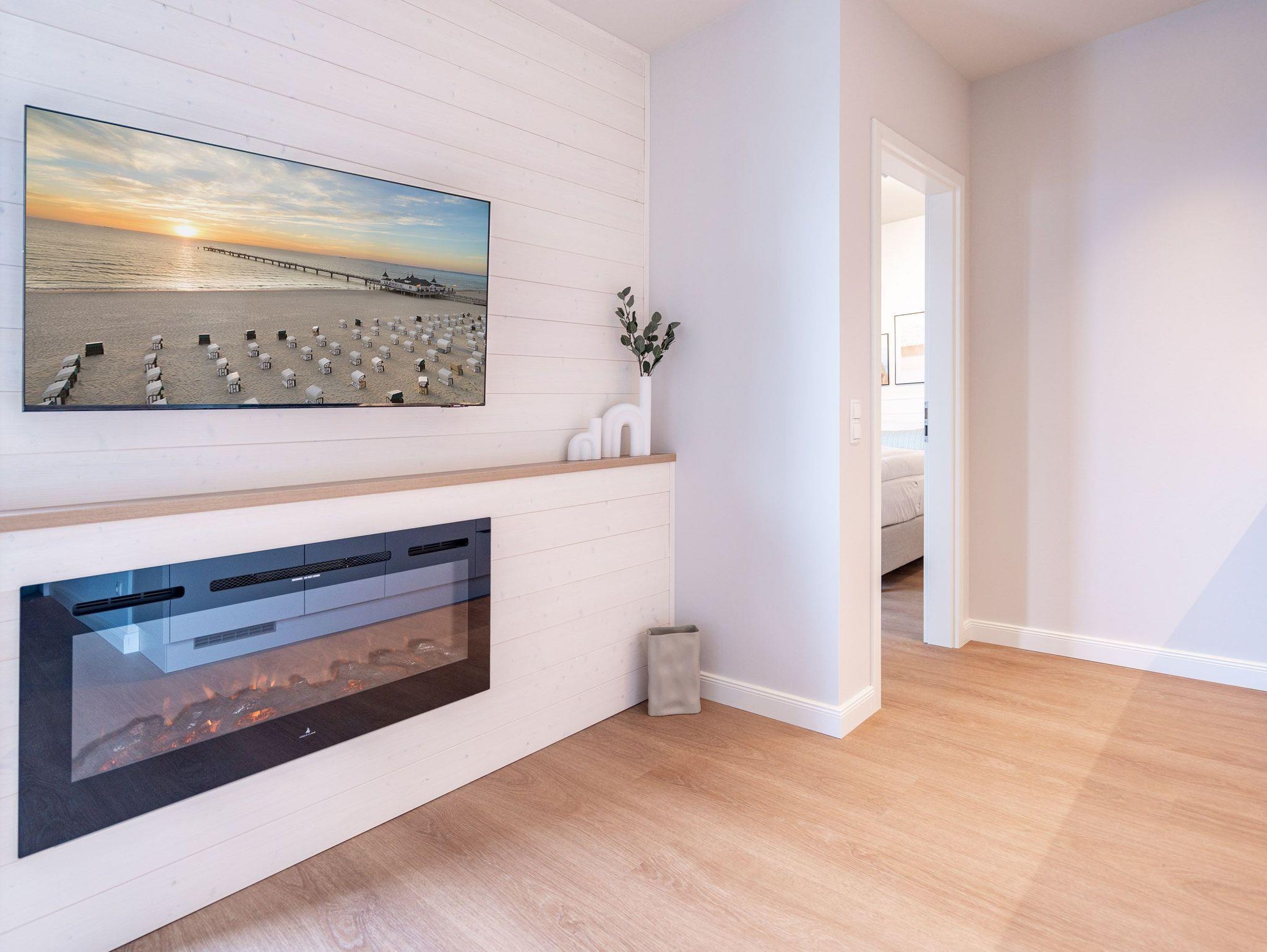 Helle, lichtdurchflutete Räume, ein hyggeliges Designkonzept und allen Komfort, den man sich nur wünschen kann ? das 2-Raum-Appartement B 2.9 (Haus B) in der 2. Etage der Strandterrasse bietet auf 60 Quadratmetern zwei Personen und einem Kind bis 5 Jahre all das und noch viele weitere Annehmlichkeiten. Hier wird Ihre Ostseeauszeit zu einem unvergesslich schönen Erlebnis, denn Sie wohnen in einem Urlaubsparadies, aus dem Sie am liebsten gar nicht wieder ausziehen wollen. Das großzügige und wunderschön eingerichtete Wohn-Esszimmer lädt zum Genießen am großen Esstisch und zum Relaxen auf der gemütlichen Sofa-Sitzgruppe ein. Ein Flat-TV (50 Zoll) sorgt für Kinounterhaltung und ein Elektrokamin (ohne Wärmeabgabe) schafft mit seinem flackernden Flammenspiel eine kuschelig romantische Atmosphäre. In der offenen Küchenzeile ist alles vorhanden, was Sie für die Zubereitung gemeinsamer Mahlzeiten brauchen. Dazu gehören ein Backofen, ein 3-Platten-Induktionsherd, ein Toaster, ein Wasserkocher, eine Kaffeemaschine und eine Nespresso-Kapselmaschine. Sowohl vom Schlafzimmer als auch vom Wohnzimmer aus haben Sie Zugang auf einen Nord-Ost-Balkon. Ob morgens gleich nach dem Aufstehen oder beim Essen unter freiem Himmel ? lassen Sie sich sie frische Ostseeluft, die vom nahen Strand herüberrauscht, genüsslich um die Nase wehen. Sie ist sehr gesund. Im Schlafzimmer wartet ein komfortables Boxspringdoppelbett (1,80m x 2,00m) und ein Kindertagesbett (0,80m x 1,40m) nur darauf, Ihnen himmlische Träume zu verschaffen. Im modernen Badezimmer gibt es neben der Dusche, dem Waschtisch und dem WC sogar eine Infrarotsauna. Hier können Sie in wohliger Wärme die Zeit vergessen. Ein PKW-Stellplatz in der Tiefgarage sorgt für bequemes Parken. Wir wünschen Ihnen viel Freude in diesem charmanten Urlaubsdomizil.