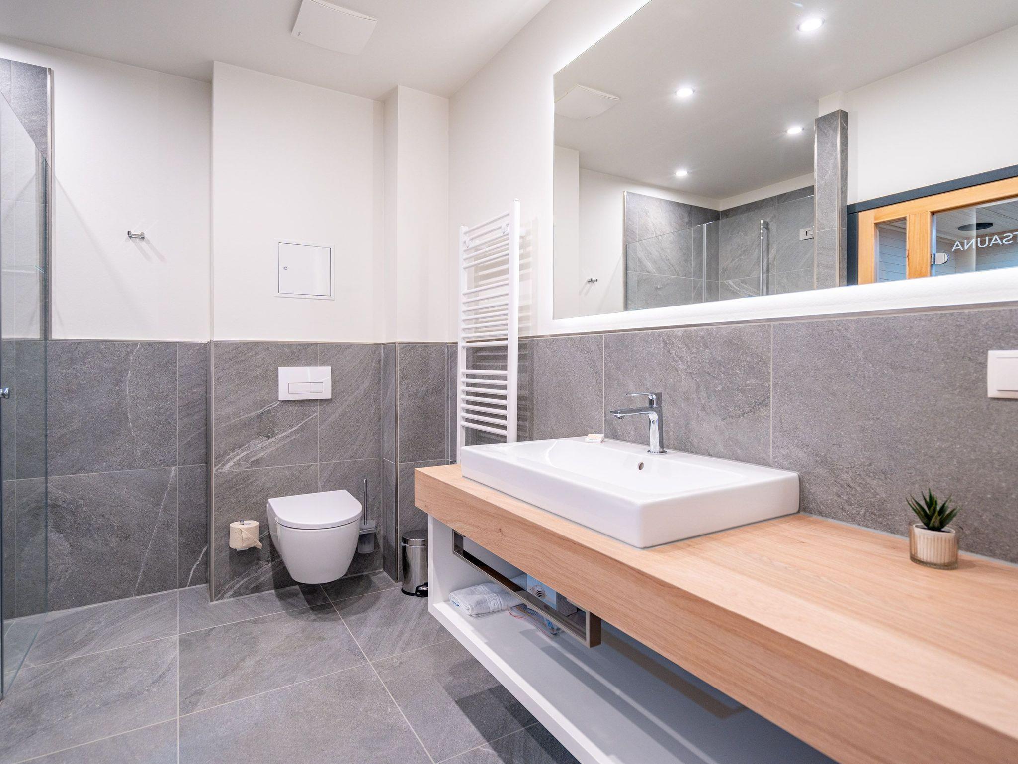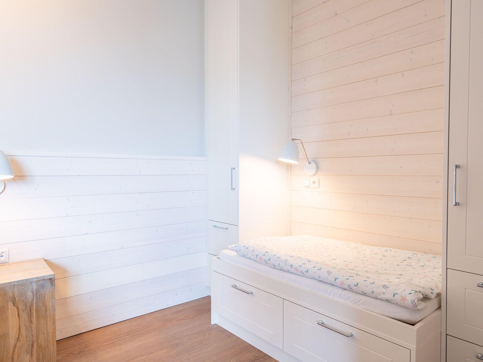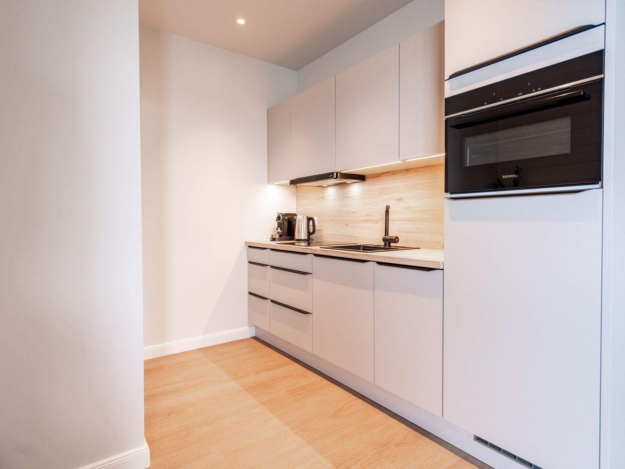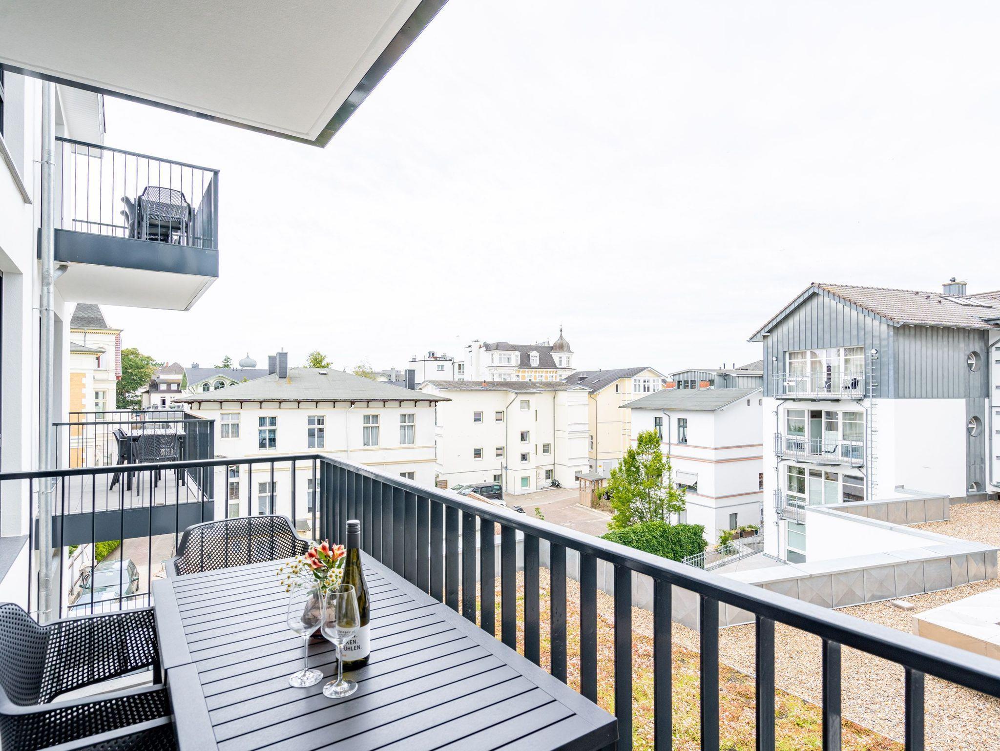 Helle, lichtdurchflutete Räume, ein hyggeliges Designkonzept und allen Komfort, den man sich nur wünschen kann ? das 2-Raum-Appartement B 2.9 (Haus B) in der 2. Etage der Strandterrasse bietet auf 60 Quadratmetern zwei Personen und einem Kind bis 5 Jahre all das und noch viele weitere Annehmlichkeiten. Hier wird Ihre Ostseeauszeit zu einem unvergesslich schönen Erlebnis, denn Sie wohnen in einem Urlaubsparadies, aus dem Sie am liebsten gar nicht wieder ausziehen wollen. Das großzügige und wunderschön eingerichtete Wohn-Esszimmer lädt zum Genießen am großen Esstisch und zum Relaxen auf der gemütlichen Sofa-Sitzgruppe ein. Ein Flat-TV (50 Zoll) sorgt für Kinounterhaltung und ein Elektrokamin (ohne Wärmeabgabe) schafft mit seinem flackernden Flammenspiel eine kuschelig romantische Atmosphäre. In der offenen Küchenzeile ist alles vorhanden, was Sie für die Zubereitung gemeinsamer Mahlzeiten brauchen. Dazu gehören ein Backofen, ein 3-Platten-Induktionsherd, ein Toaster, ein Wasserkocher, eine Kaffeemaschine und eine Nespresso-Kapselmaschine. Sowohl vom Schlafzimmer als auch vom Wohnzimmer aus haben Sie Zugang auf einen Nord-Ost-Balkon. Ob morgens gleich nach dem Aufstehen oder beim Essen unter freiem Himmel ? lassen Sie sich sie frische Ostseeluft, die vom nahen Strand herüberrauscht, genüsslich um die Nase wehen. Sie ist sehr gesund. Im Schlafzimmer wartet ein komfortables Boxspringdoppelbett (1,80m x 2,00m) und ein Kindertagesbett (0,80m x 1,40m) nur darauf, Ihnen himmlische Träume zu verschaffen. Im modernen Badezimmer gibt es neben der Dusche, dem Waschtisch und dem WC sogar eine Infrarotsauna. Hier können Sie in wohliger Wärme die Zeit vergessen. Ein PKW-Stellplatz in der Tiefgarage sorgt für bequemes Parken. Wir wünschen Ihnen viel Freude in diesem charmanten Urlaubsdomizil.
