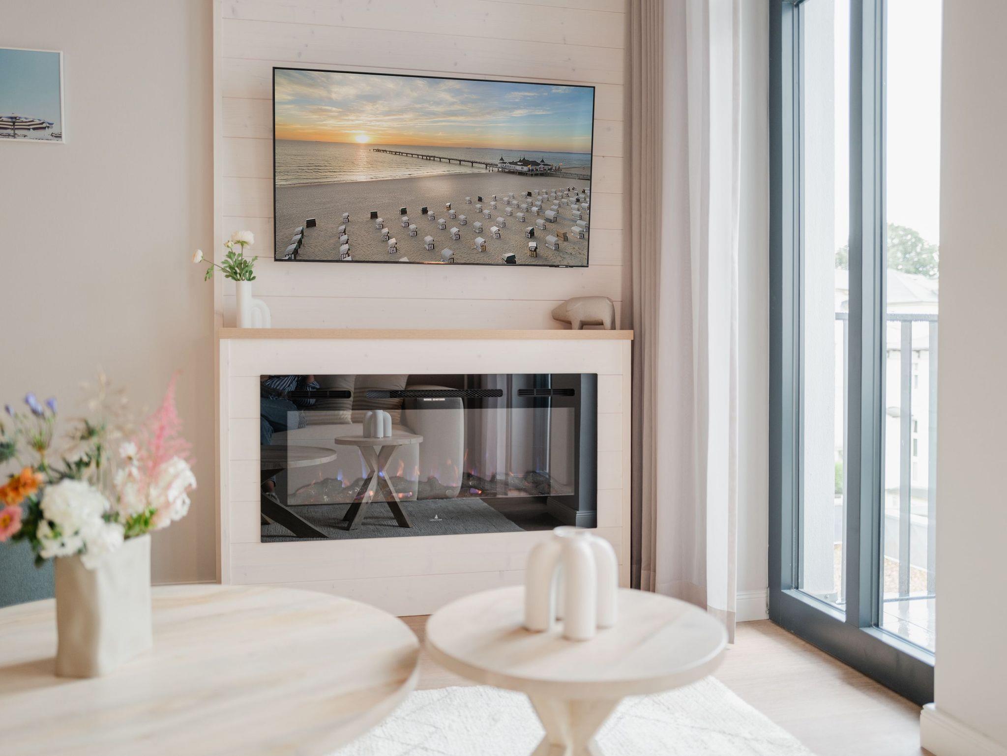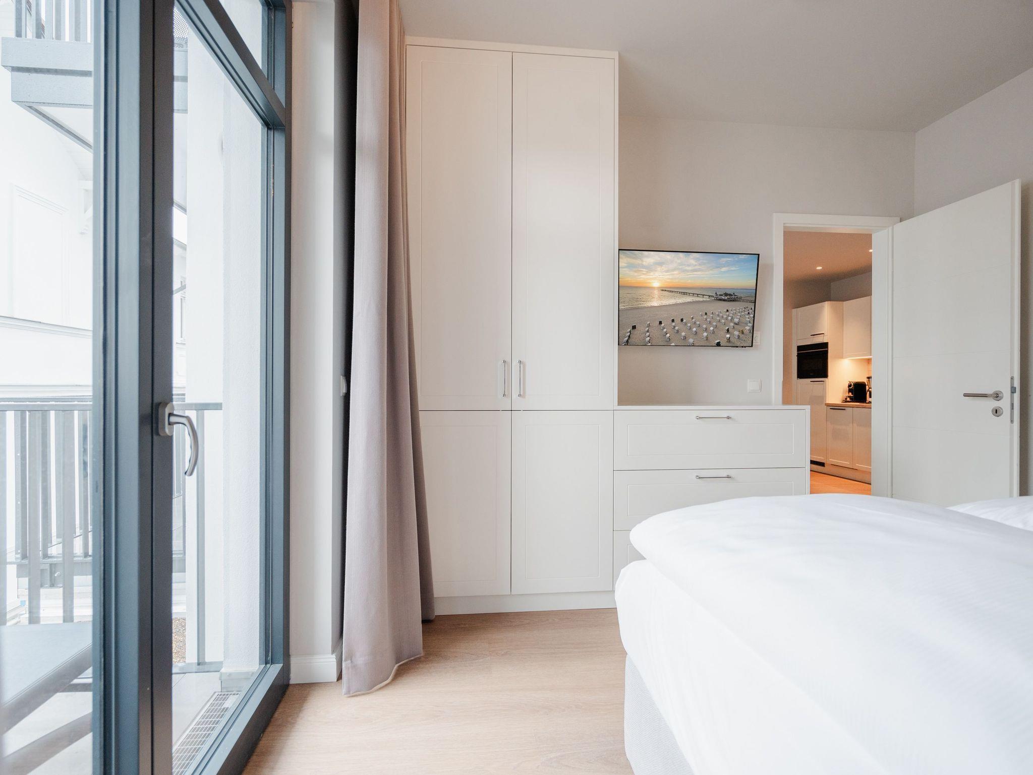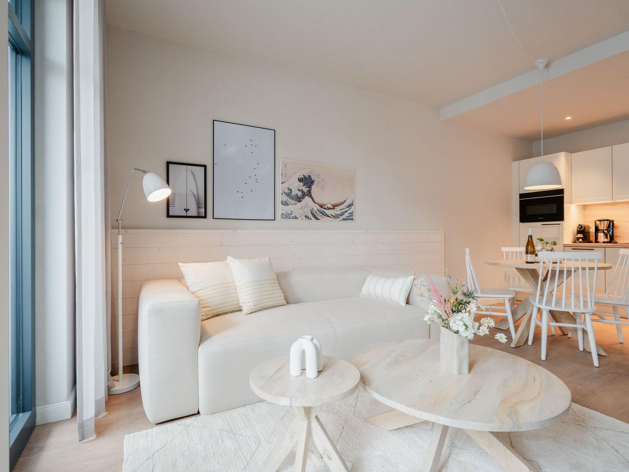 Die 2024 fertig gestellte Strandterrasse liegt direkt an der belebten Strandpromenade und bietet einen einzigartigen Ausblick auf die Grand Dame der historischen Seebrücken sowie die historische Konzertmuschel, einem beliebten Treffpunkt für Kunst und Kultur. Dahinter liegt die Ostsee ? ein Panorama, das zu den schönsten in den Kaiserbädern gehört. Es ist wie das Abtauchen in eine andere Zeit. In eine Zeit, in der man mit Stock, Sonnenschirm und Hut fürs „Sehen und gesehen werden“ über die Promenade schlenderte; aber auch in eine Zeit, in der ? damals wie heute ? Zeit einmal für eine kurze Weile keine Rolle spielt. Weil man angekommen ist im Loslassen, Entspannen und Genießen. Es ist dieser besondere Geruch nach Meeresluft und Freiheit, der in Erinnerung bleibt. Dazu die Bilder, die man mitnimmt. Von langen Strandspaziergängen, vom Lachen in fröhlich schäumenden Ostseewellen, von der Zeit in einem wunderschönen Urlaubsdomizil. Denn genau das ist die Strandterrasse mit ihren 56 modernen und exklusiven Ferienappartements direkt gegenüber der Ahlbecker Seebrücke. Die Ein-, Zwei- oder Dreizimmerwohnungen ? zwischen 40 und 70 Quadratmeter groß ? sind von einer Innenarchitektin gemeinsam mit unserem Erfahrungsschatz an Gästewünschen mit viel Liebe zum Detail und ganz individuell konzipiert worden. Entspannung und Wohlfühlen stehen an erster Stelle. Alles ist aufeinander abgestimmt und sorgt für eine gemütliche Atmosphäre. Wählen Sie zwischen einem Domizil in einem hellen, sandfarbenen Designkonzept oder einem Appartement mit anthrazitfarbenen Farbakzenten. Alle Appartements verfügen gleichermaßen über eine stilvolle und komfortable Einrichtung, die passgenau angefertigt worden ist, sowie über moderne Küchen und Bäder. Jedem Schlafzimmer ist ein eigenes Bad mit Dusche zugeordnet (außer App. B4.5). Die Appartements besitzen fast alle einen Balkon ? viele schauen sogar zur Ostsee hinaus. Die meisten Feriendomizile haben einen Elektrokamin und Infrarotsaunen. Im Erdgeschoss befindet sich ein separater Gemeinschaftsraum für Fahrräder. Außerdem besteht die Möglichkeit, im Gemeinschaftswaschraum 2 Waschmaschinen [&] Trockner zu nutzen. Ergänzt wird das Angebot durch eine Gemeinschaftssauna, die täglich von 11:00 bis 22:00 Uhr nutzbar ist. In der Tiefgarage (Einfahrtshöhe 2,03 Meter) steht für jede Wohnung 1 Pkw-Stellplatz zur Verfügung. Ist alles zur Zufriedenheit untergebracht? Dann kann der Urlaub ja beginnen. Und beim Blick vom Balkon über die Ostsee treffen sich zum Sonnenaufgang das Heute und das Damals. Gelassenheit legt sich beim Gang hinunter an den Strand auf die Seele. Jetzt darf die Zeit stehenbleiben.