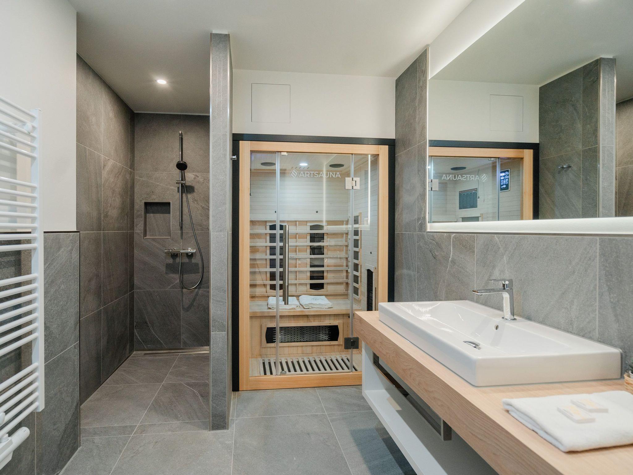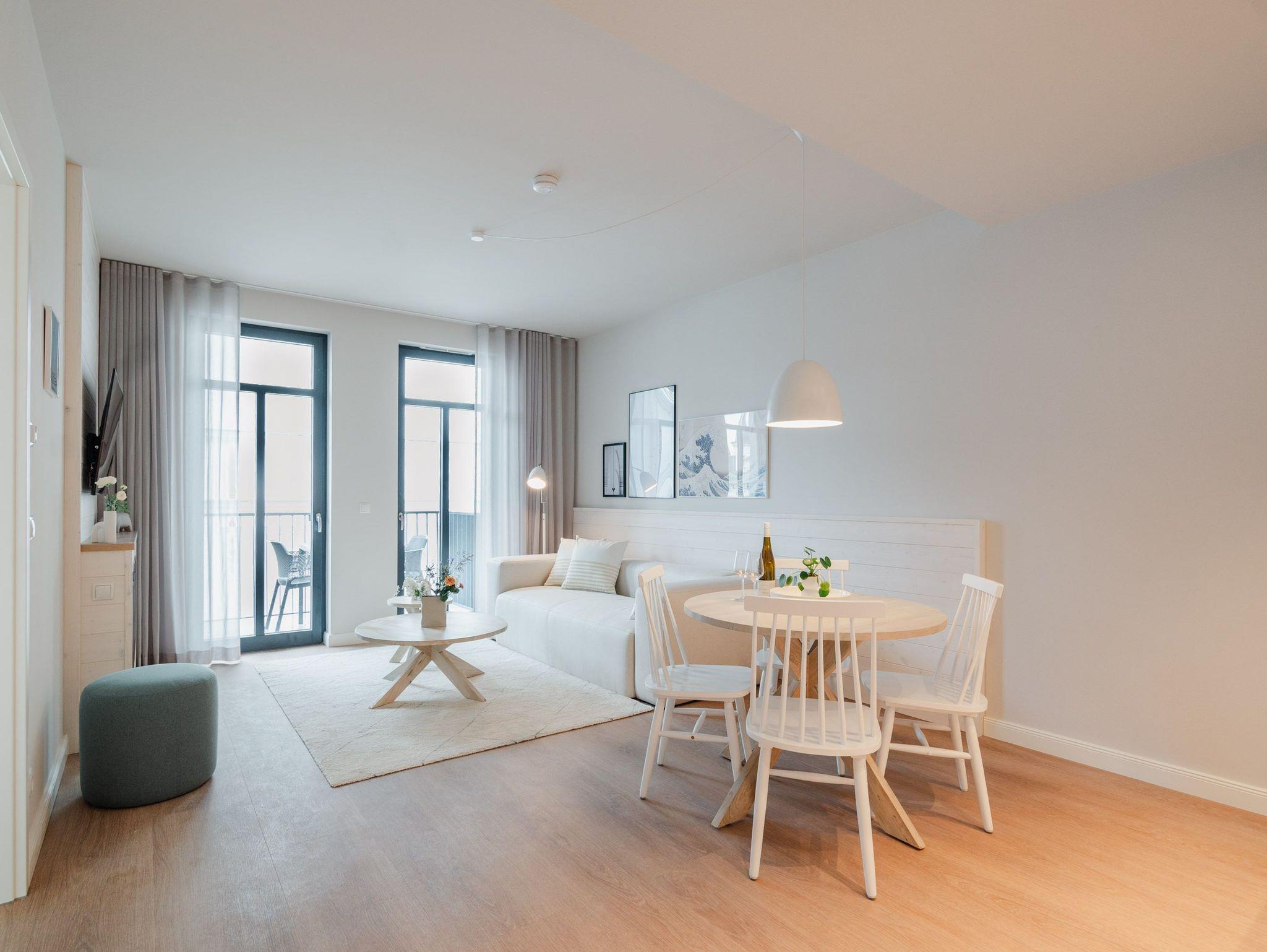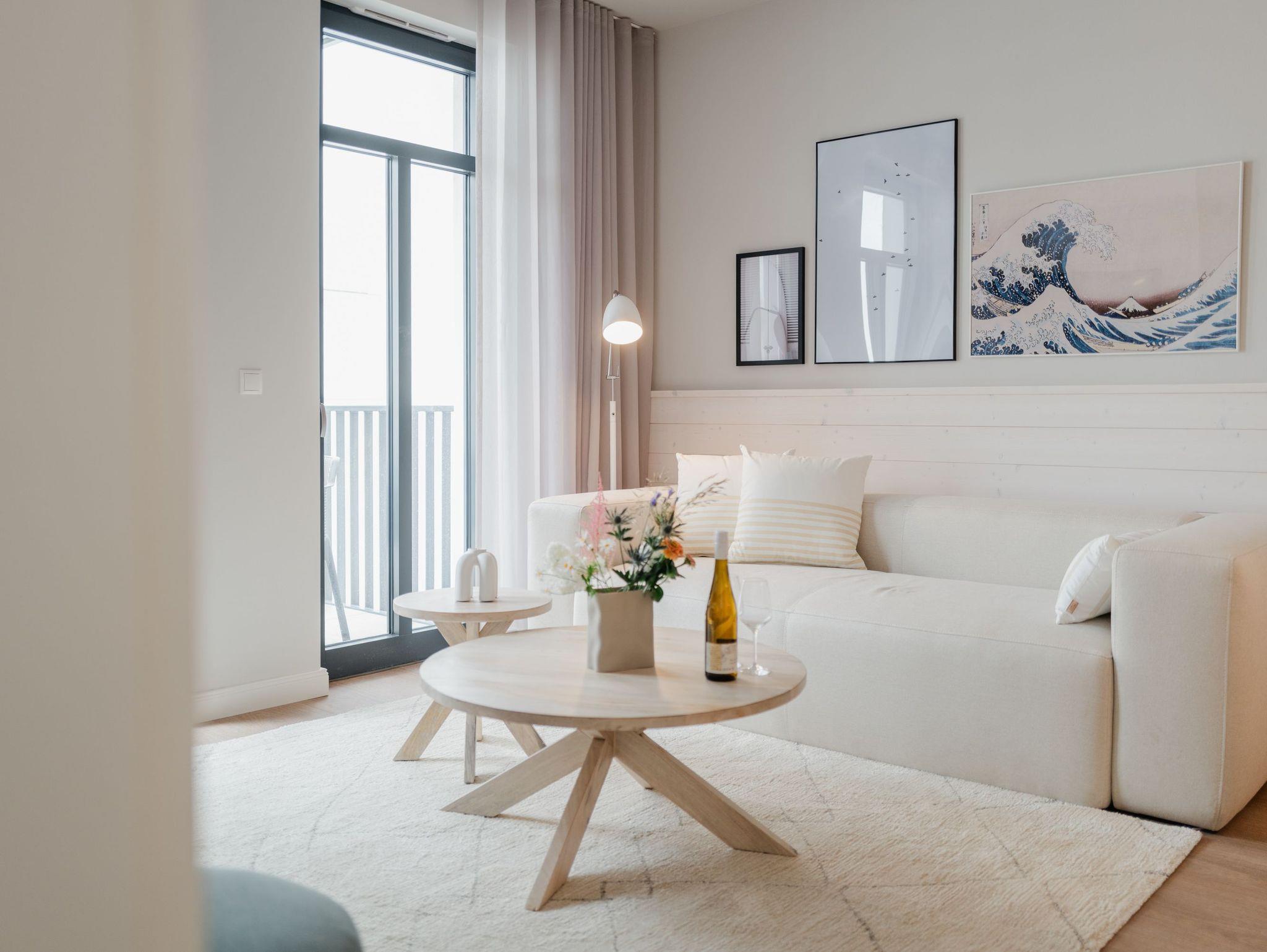 Die 2024 fertig gestellte Strandterrasse liegt direkt an der belebten Strandpromenade und bietet einen einzigartigen Ausblick auf die Grand Dame der historischen Seebrücken sowie die historische Konzertmuschel, einem beliebten Treffpunkt für Kunst und Kultur. Dahinter liegt die Ostsee ? ein Panorama, das zu den schönsten in den Kaiserbädern gehört. Es ist wie das Abtauchen in eine andere Zeit. In eine Zeit, in der man mit Stock, Sonnenschirm und Hut fürs „Sehen und gesehen werden“ über die Promenade schlenderte; aber auch in eine Zeit, in der ? damals wie heute ? Zeit einmal für eine kurze Weile keine Rolle spielt. Weil man angekommen ist im Loslassen, Entspannen und Genießen. Es ist dieser besondere Geruch nach Meeresluft und Freiheit, der in Erinnerung bleibt. Dazu die Bilder, die man mitnimmt. Von langen Strandspaziergängen, vom Lachen in fröhlich schäumenden Ostseewellen, von der Zeit in einem wunderschönen Urlaubsdomizil. Denn genau das ist die Strandterrasse mit ihren 56 modernen und exklusiven Ferienappartements direkt gegenüber der Ahlbecker Seebrücke. Die Ein-, Zwei- oder Dreizimmerwohnungen ? zwischen 40 und 70 Quadratmeter groß ? sind von einer Innenarchitektin gemeinsam mit unserem Erfahrungsschatz an Gästewünschen mit viel Liebe zum Detail und ganz individuell konzipiert worden. Entspannung und Wohlfühlen stehen an erster Stelle. Alles ist aufeinander abgestimmt und sorgt für eine gemütliche Atmosphäre. Wählen Sie zwischen einem Domizil in einem hellen, sandfarbenen Designkonzept oder einem Appartement mit anthrazitfarbenen Farbakzenten. Alle Appartements verfügen gleichermaßen über eine stilvolle und komfortable Einrichtung, die passgenau angefertigt worden ist, sowie über moderne Küchen und Bäder. Jedem Schlafzimmer ist ein eigenes Bad mit Dusche zugeordnet (außer App. B4.5). Die Appartements besitzen fast alle einen Balkon ? viele schauen sogar zur Ostsee hinaus. Die meisten Feriendomizile haben einen Elektrokamin und Infrarotsaunen. Im Erdgeschoss befindet sich ein separater Gemeinschaftsraum für Fahrräder. Außerdem besteht die Möglichkeit, im Gemeinschaftswaschraum 2 Waschmaschinen [&] Trockner zu nutzen. Ergänzt wird das Angebot durch eine Gemeinschaftssauna, die täglich von 11:00 bis 22:00 Uhr nutzbar ist. In der Tiefgarage (Einfahrtshöhe 2,03 Meter) steht für jede Wohnung 1 Pkw-Stellplatz zur Verfügung. Ist alles zur Zufriedenheit untergebracht? Dann kann der Urlaub ja beginnen. Und beim Blick vom Balkon über die Ostsee treffen sich zum Sonnenaufgang das Heute und das Damals. Gelassenheit legt sich beim Gang hinunter an den Strand auf die Seele. Jetzt darf die Zeit stehenbleiben.