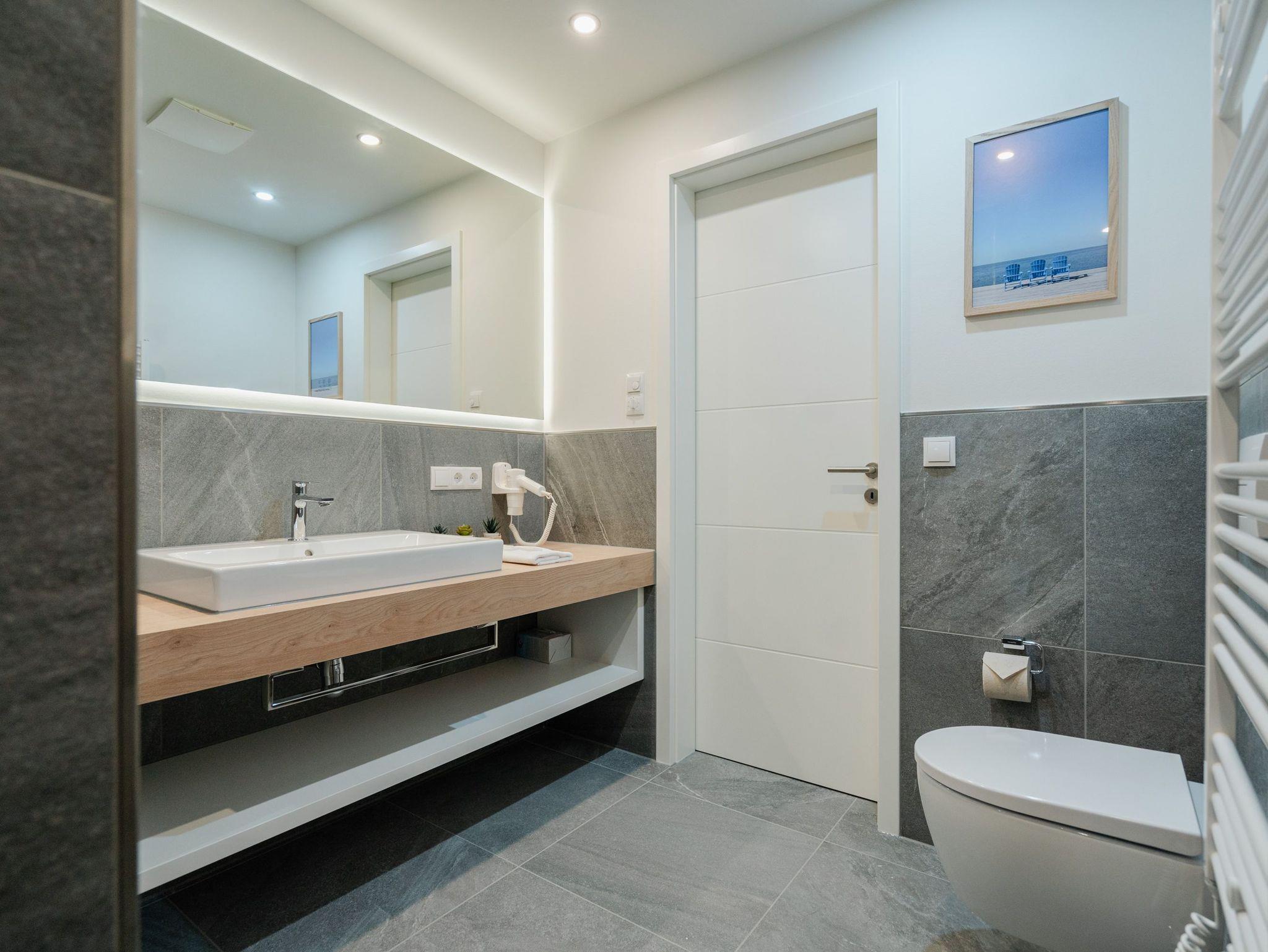 Die 2024 fertig gestellte Strandterrasse liegt direkt an der belebten Strandpromenade und bietet einen einzigartigen Ausblick auf die Grand Dame der historischen Seebrücken sowie die historische Konzertmuschel, einem beliebten Treffpunkt für Kunst und Kultur. Dahinter liegt die Ostsee ein Panorama, das zu den schönsten in den Kaiserbädern gehört. Es ist wie das Abtauchen in eine andere Zeit. In eine Zeit, in der man mit Stock, Sonnenschirm und Hut fürs Sehen und gesehen werden über die Promenade schlenderte; aber auch in eine Zeit, in der damals wie heute Zeit einmal für eine kurze Weile keine Rolle spielt. Weil man angekommen ist im Loslassen, Entspannen und Genießen. Es ist dieser besondere Geruch nach Meeresluft und Freiheit, der in Erinnerung bleibt. Dazu die Bilder, die man mitnimmt. Von langen Strandspaziergängen, vom Lachen in fröhlich schäumenden Ostseewellen, von der Zeit in einem wunderschönen Urlaubsdomizil. Denn genau das ist die Strandterrasse mit ihren 56 modernen und exklusiven Ferienappartements direkt gegenüber der Ahlbecker Seebrücke. Die Ein-, Zwei- oder Dreizimmerwohnungen zwischen 40 und 70 Quadratmeter groß sind von einer Innenarchitektin gemeinsam mit unserem Erfahrungsschatz an Gästewünschen mit viel Liebe zum Detail und ganz individuell konzipiert worden. Entspannung und Wohlfühlen stehen an erster Stelle. Alles ist aufeinander abgestimmt und sorgt für eine gemütliche Atmosphäre. Wählen Sie zwischen einem Domizil in einem hellen, sandfarbenen Designkonzept oder einem Appartement mit anthrazitfarbenen Farbakzenten. Alle Appartements verfügen gleichermaßen über eine stilvolle und komfortable Einrichtung, die passgenau angefertigt worden ist, sowie über moderne Küchen und Bäder. Jedem Schlafzimmer ist ein eigenes Bad mit Dusche zugeordnet (außer App. B4.5). Die Appartements besitzen fast alle einen Balkon viele schauen sogar zur Ostsee hinaus. Die meisten Feriendomizile haben einen Elektrokamin und Infrarotsaunen. Im Erdgeschoss befindet sich ein separater Gemeinschaftsraum für Fahrräder. Außerdem besteht die Möglichkeit, im Gemeinschaftswaschraum 2 Waschmaschinen [&] Trockner zu nutzen. Ergänzt wird das Angebot durch eine Gemeinschaftssauna, die täglich von 11:00 bis 22:00 Uhr nutzbar ist. In der Tiefgarage (Einfahrtshöhe 2,03 Meter) steht für jede Wohnung 1 Pkw-Stellplatz zur Verfügung. Ist alles zur Zufriedenheit untergebracht? Dann kann der Urlaub ja beginnen. Und beim Blick vom Balkon über die Ostsee treffen sich zum Sonnenaufgang das Heute und das Damals. Gelassenheit legt sich beim Gang hinunter an den Strand auf die Seele. Jetzt darf die Zeit stehenbleiben.