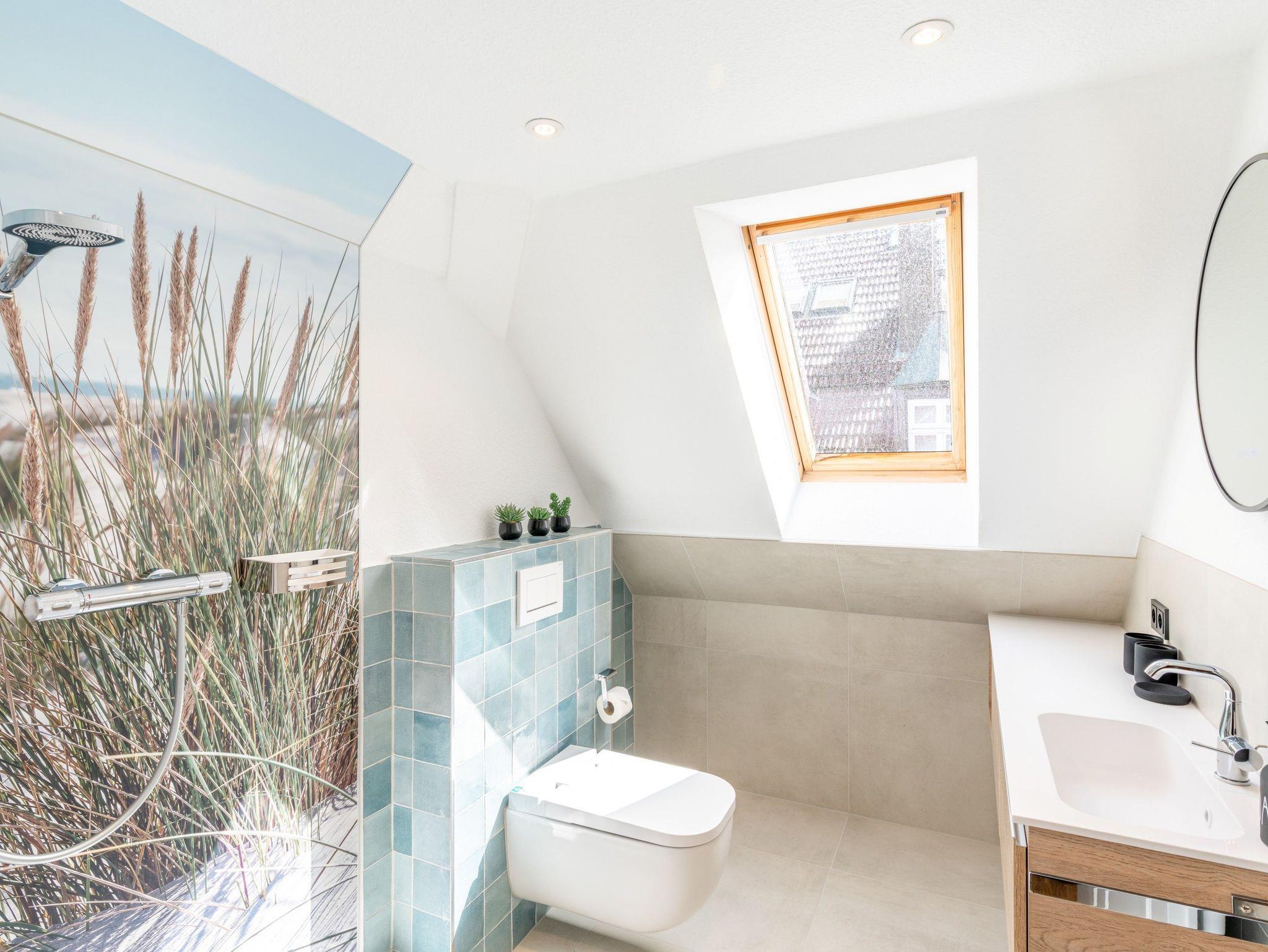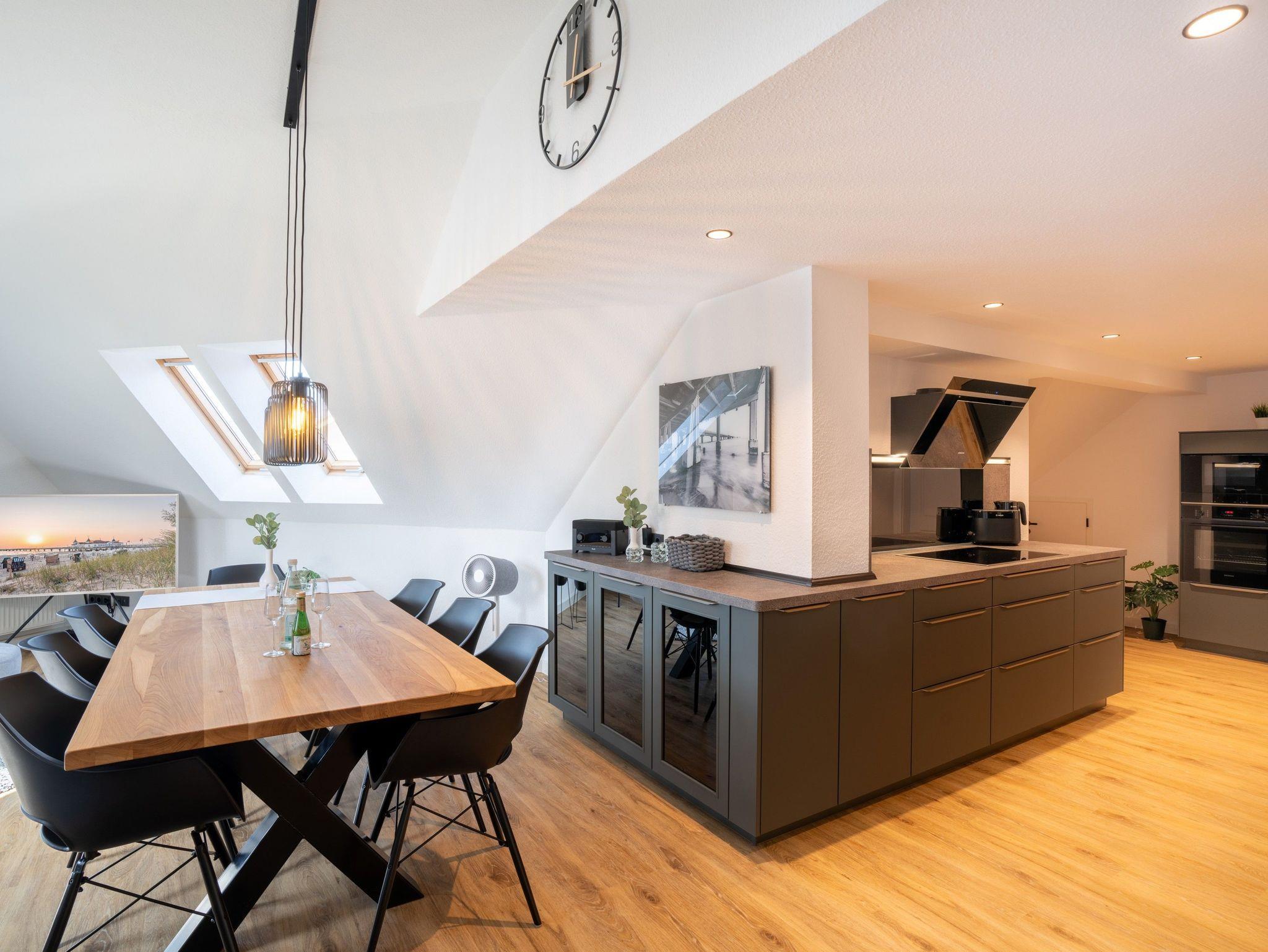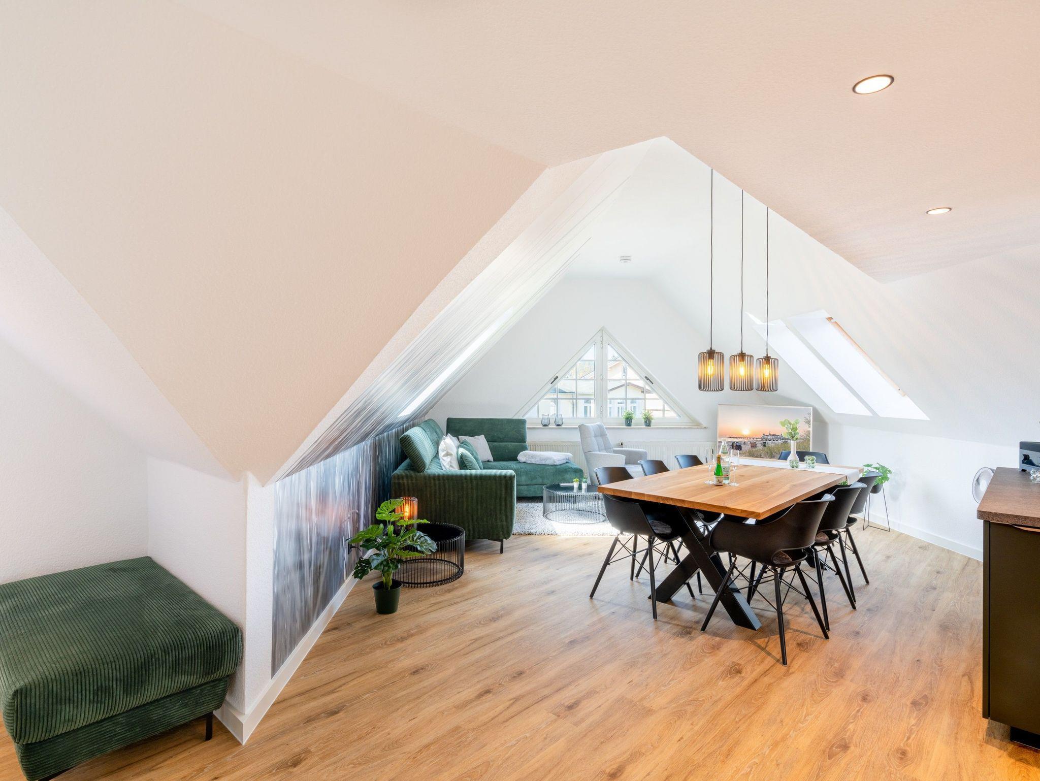 Die 96 qm große und komfortable Wohnung befindet sich im Dachgeschoss und ist für bis zu sechs Personen ausgestattet. Sie wurde 2024 komplett renoviert. Die Wohnung verfügt über drei separate Schlafzimmer mit Doppelbett (mit zusätzlichem TV-Gerät), ein Wohnzimmer mit großzügiger und gemütlicher Couch-Ecke, TV sowie eine offene moderne Küche, ausgestattet mit einem Kühlschrank, Herd, Mikrowelle, Spülmaschine u.v.m.. Zwei Bäder mit ebenerdiger Dusche und WC. Bitte beachten Sie, dass durch die Lage im Dachgeschoss, die Deckenhöhe teilweise etwas niedrig ist.