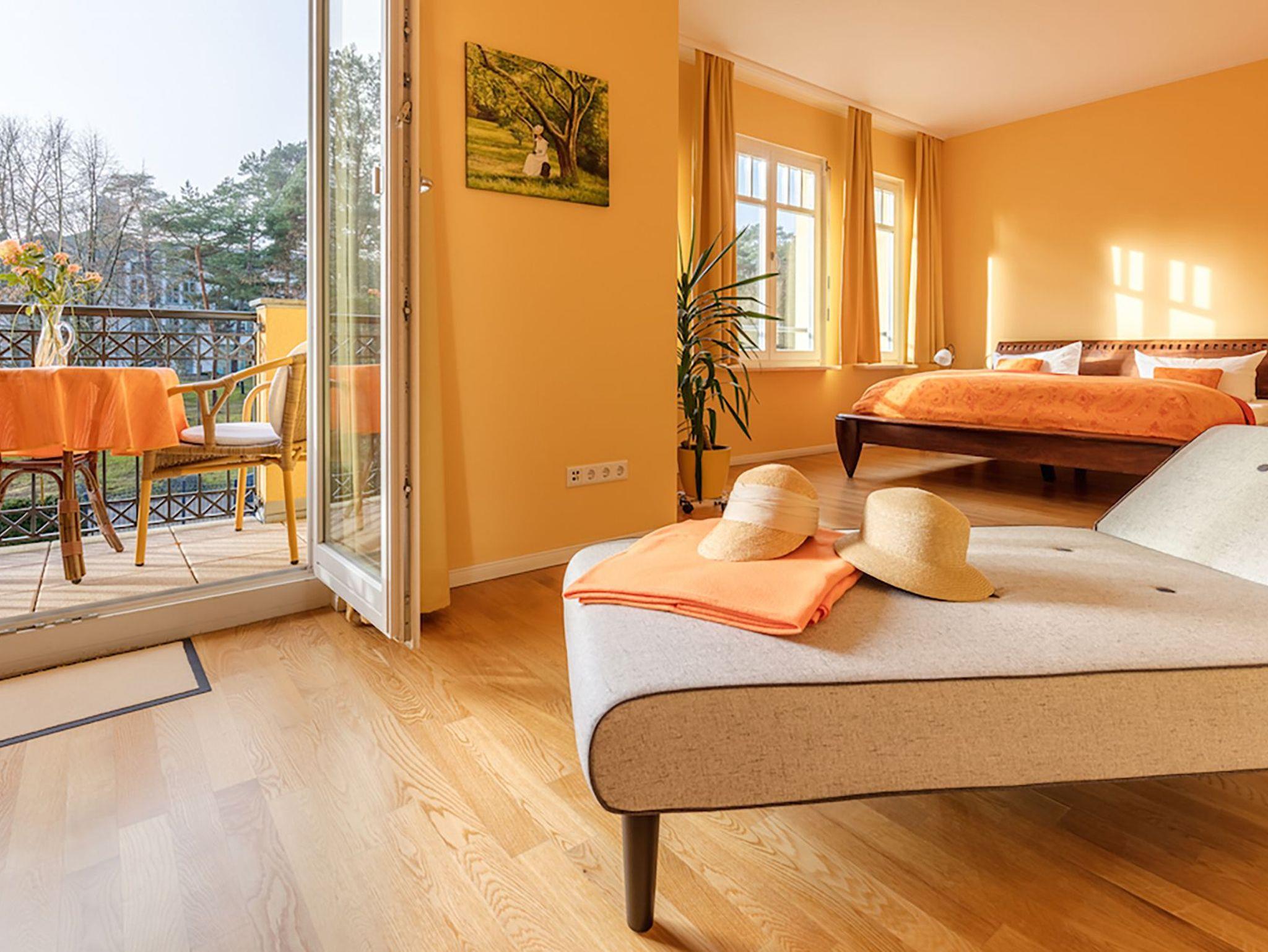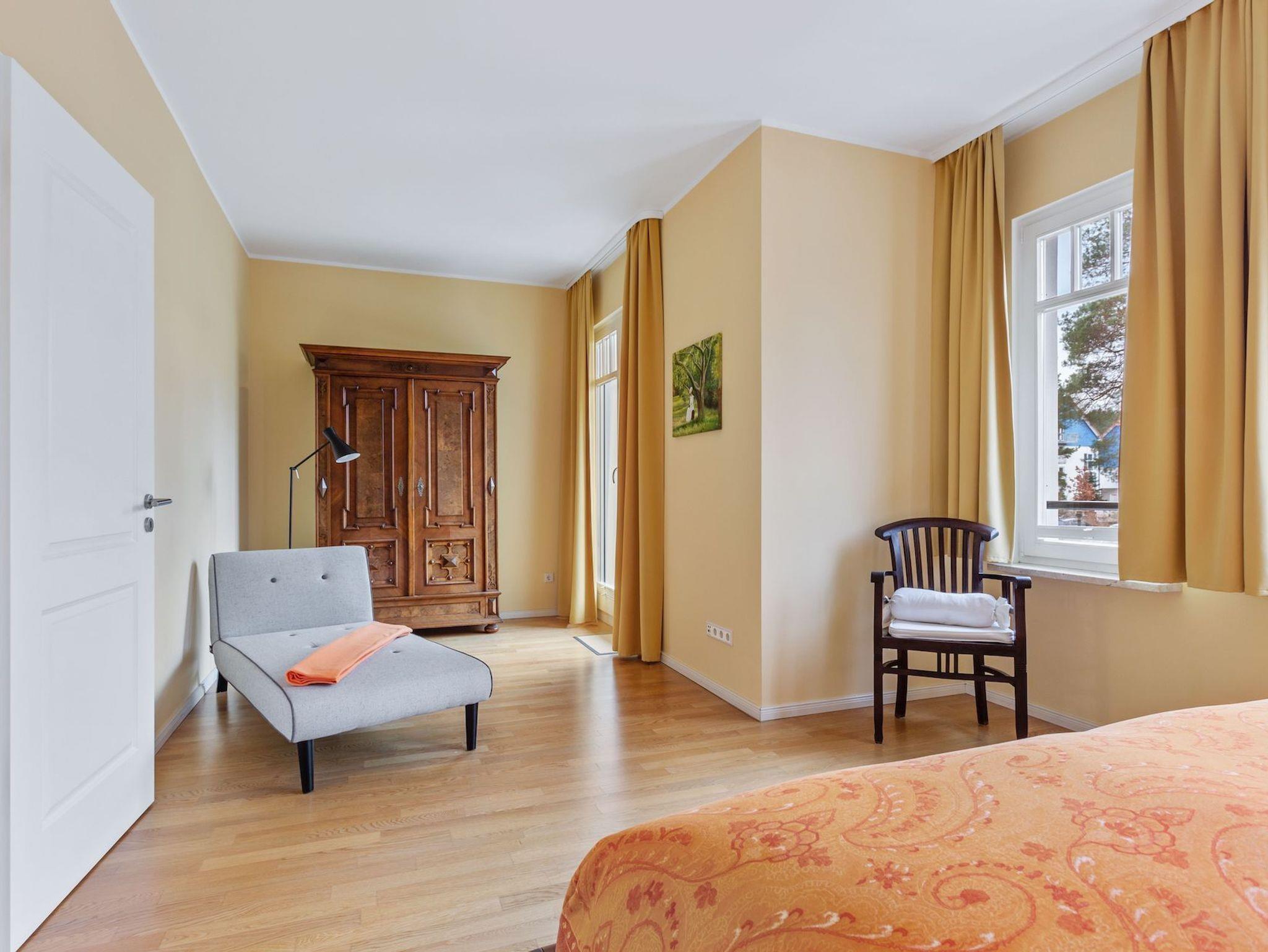 Willkommen im 71 m² großen 2-Raum-Apartment ?Vilm? im 2. Obergeschoss ? ideal für 2 Erwachsene und 1 Kind bis 16 Jahre. Lichtdurchflutete Räume, zwei Balkone und stilvolle Details machen dieses Urlaubsdomizil zu einem besonderen Rückzugsort. Beginnen Sie den Tag auf dem Balkon am Wohnzimmer zur Seeseite ? bei Frühstück und Morgensonne, während Sie den Blick zur Ostsee schweifen lassen. Am Abend genießen Sie auf dem Südbalkon am Schlafzimmer die warmen Sonnenstrahlen und den Blick auf einen kleinen Park. Das Apartment kombiniert moderne Ausstattung mit liebevoll ausgewählten antiken Einzelstücken. Im Wohnbereich erwarten Sie eine bequeme Ledercouch, ein Stressless-Relaxsessel, UHD-LED-TV sowie ein separater Essplatz. Das geräumige Schlafzimmer bietet ein komfortables Doppelbett, eine Relaxliege (geeignet als Aufbettung für Kinder bis 16 Jahre) sowie viel Stauraum durch Schränke und einen Wandschrank mit Safe. Das großzügige Badezimmer verfügt über Dusche, Badewanne, Waschtisch, WC und Tageslichtfenster. Für angenehme Wohnatmosphäre sorgen Echtholzparkett in allen Zimmern, schwellenfreier Zugang und Fußbodenheizung im gesamten Appartement. Ein eigener PKW-Stellplatz am Haus rundet das Angebot ab. Hier wohnen Sie hell, stilvoll und nur einen Augenblick vom Ostseestrand entfernt ? perfekt für erholsame Tage und lange Abende mit Meerblick.
