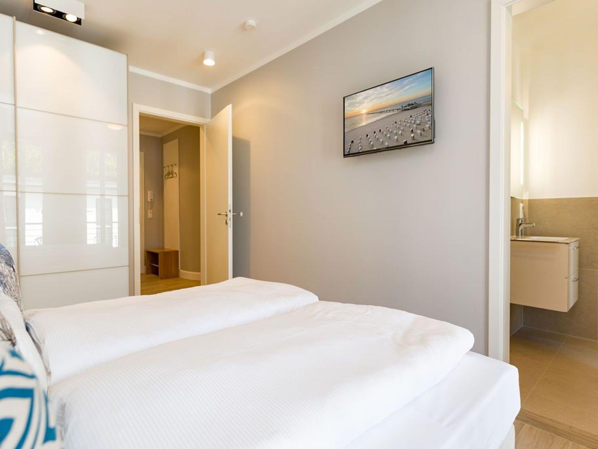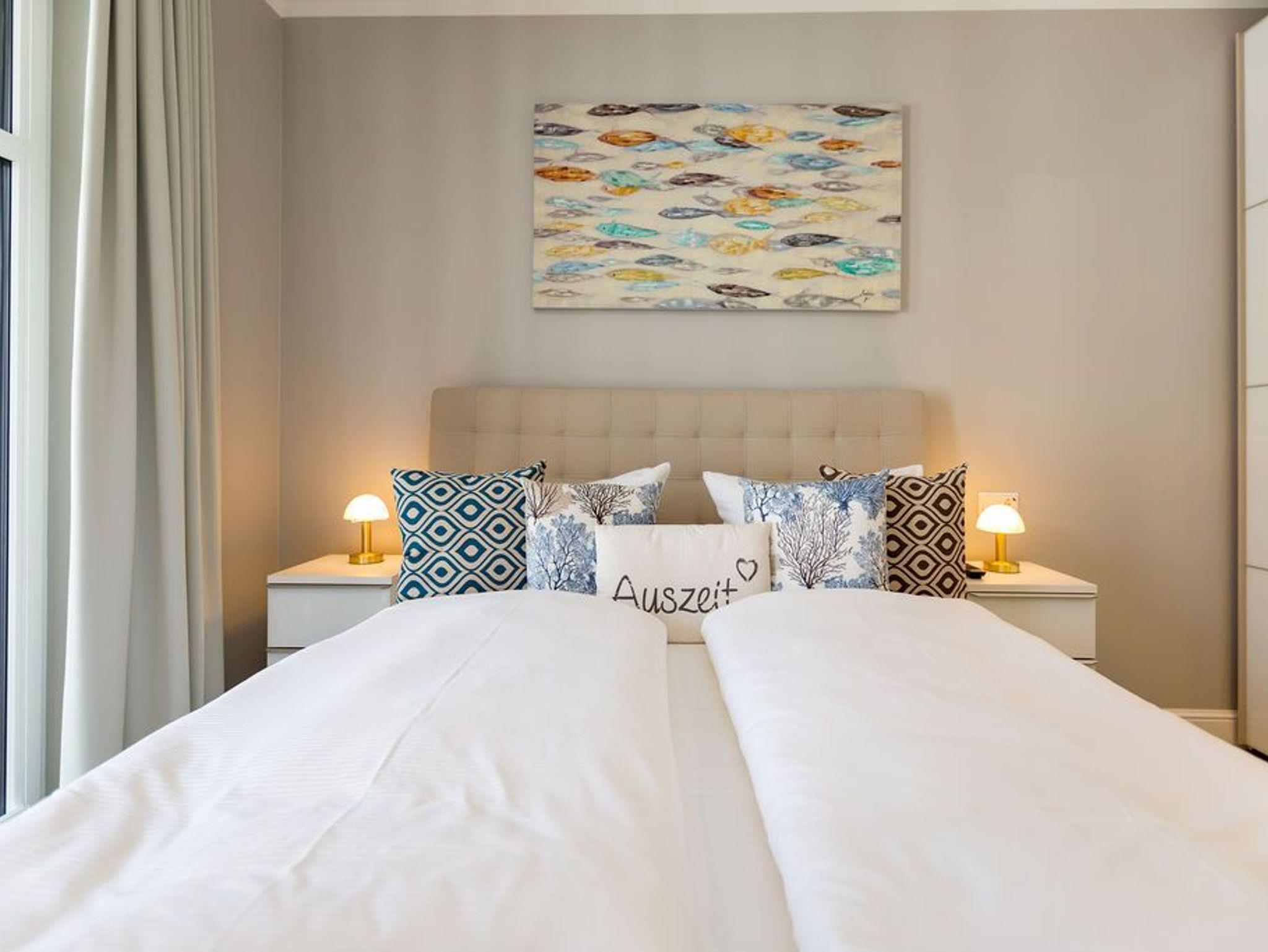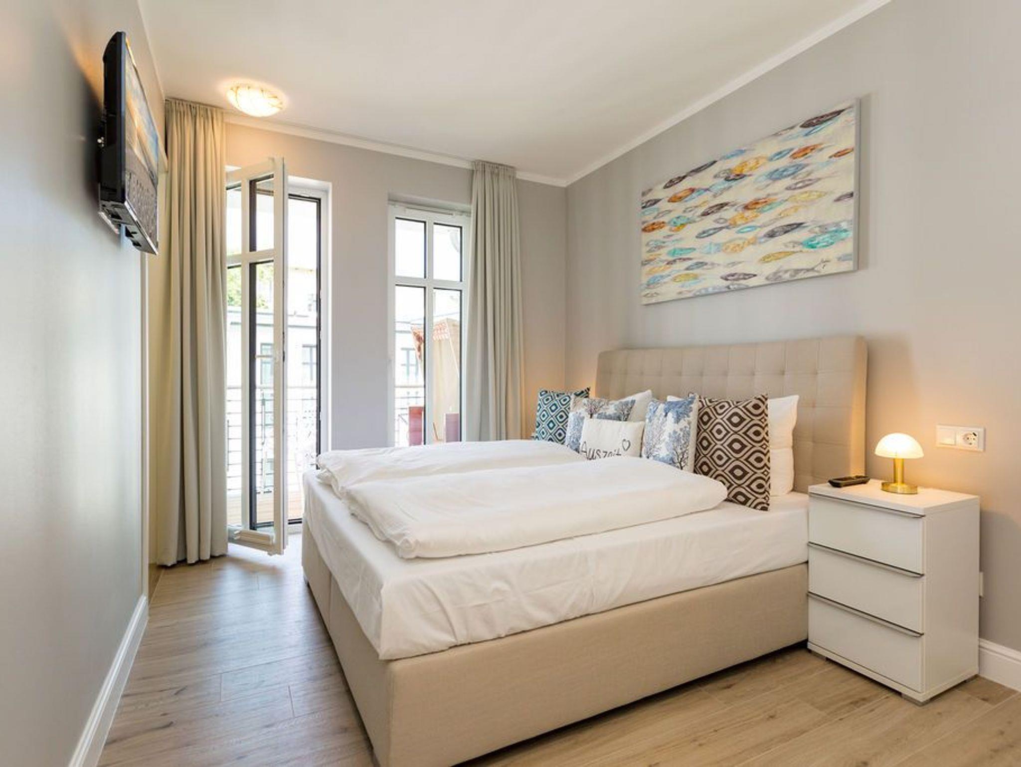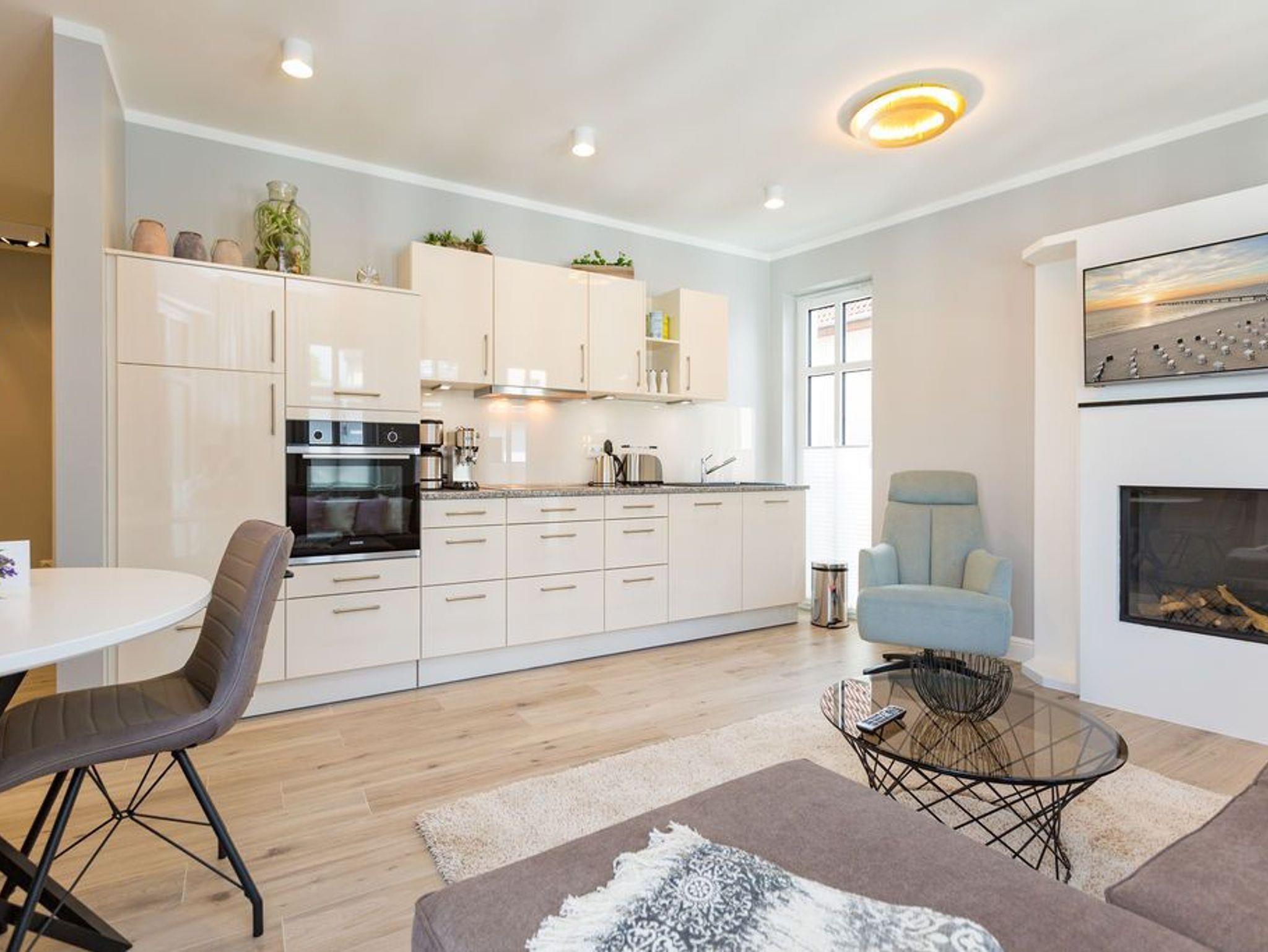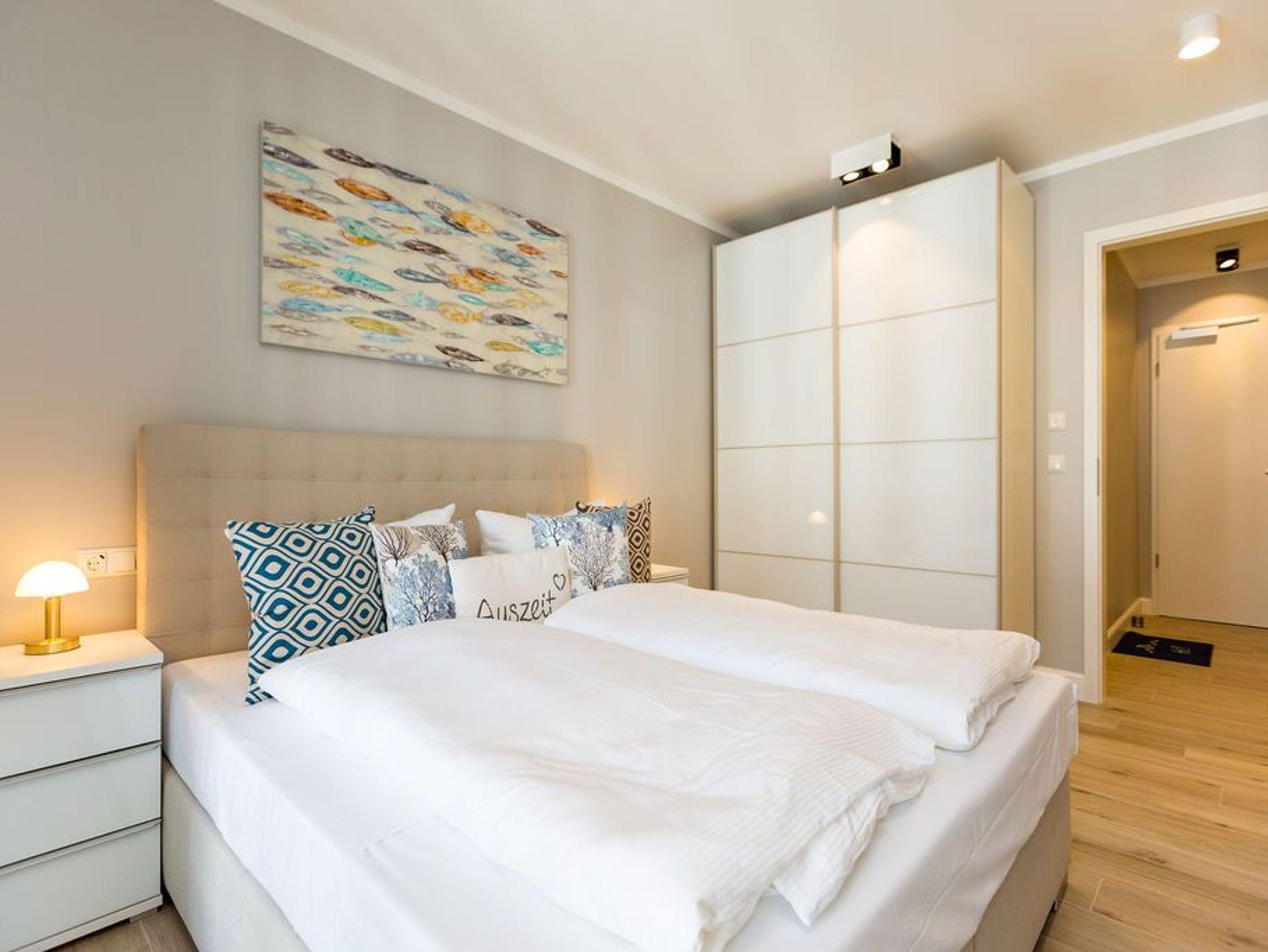 Alltag? 0815? Nicht in diesem wunderbar hellen und modernen Appartement Nummer 5 im 1. Obergeschoss. Ein Fahrstuhl bringt Sie und die bis zu drei Mitreisenden plus ein Kleinkind bis zwei Jahre (im Kinderreisebett) bequem bis hinauf in Ihr 78 Quadratmeter großes Urlaubsparadies. Angefangen beim stilvollen Interieur bis zur technischen Ausstattung bietet das Appartement alles, was Sie sich für einen erholsamen Urlaub an der Ostsee nur wünschen können. Schöne Möbel wie die große Sofalandschaft oder der bequeme Lesesessel sorgen für Gemütlichkeit. Hier heißt es nur: Fallen lassen und entspannen. Ein großer Flat-TV bietet Home-Entertainment. Das WLAN ist kostenfrei. Oder machen Sie es sich mit dem Gas-Kamin so richtig heimelig. Die gesamte Wohnung hat zudem Fußbodenheizung. Kalte Füße gehören hier der Vergangenheit an. Ein Balkon Richtung Westen eignet sich ideal zum Sonnenbaden und Dinieren. Denn im Strandkorb und an den Balkonmöbeln haben alle Platz. Einen schönen Essplatz gibt es auch im großzügigen Wohnzimmer, das sich zur voll ausgestatteten Küche hin öffnet. Hier finden Sie alle notwendigen Küchengeräte und auch erlesenes Geschirr. Sämtlich Geräte - vom Toaster, über den Herd und die Mikrowelle bis hin zur Spülmaschine - sind hochwertige High-Endgeräte. Zwei Schlafzimmer - eines davon mit eigenem Badezimmerzugang - bringen Erholung im Schlaf. Sie sind jeweils mit einem breiten Boxspringdoppelbett (1,80 m x 2,00 m), einem Flat-TV und einem großen Kleiderschrank ausgestattet. Das Masterbad verfügt neben einer Dusche, Waschtisch und WC auch über eine kleine Finnische Sauna. Ein perfekter, kleiner Private SPA. Handtücher liegen bei Anreise schon bereit. Sie brauchen also nur noch ins Schwitzen kommen. Das zweite Badezimmer hat ebenfalls eine Dusche, einen Waschtisch und ein WC. Die Betten sind bei Ihrer Ankunft bezogen. In einem Abstellraum befindet sich eine Waschmaschine. Ein Pkw-Stellplatz ist in der Tiefgarage reserviert.