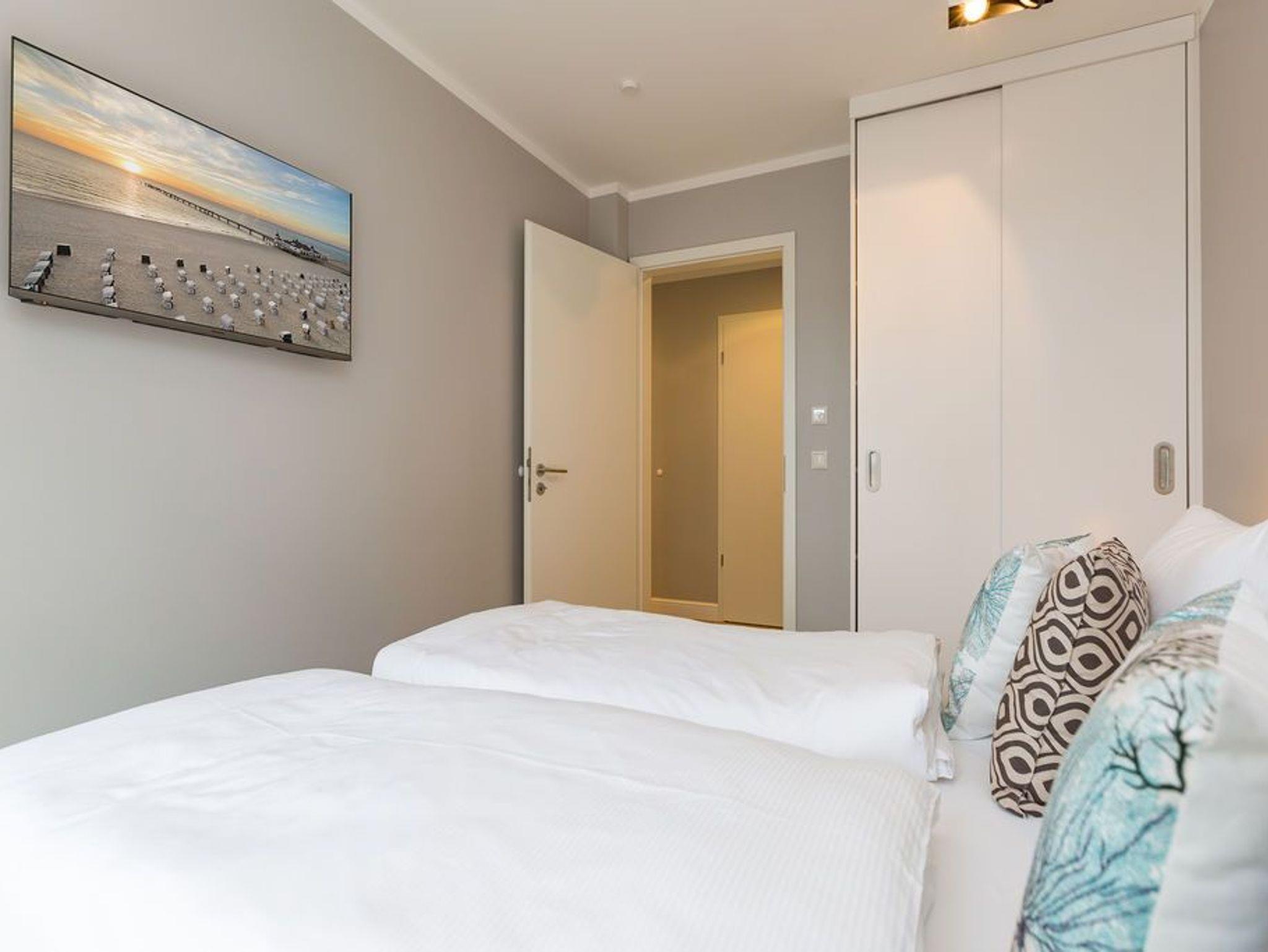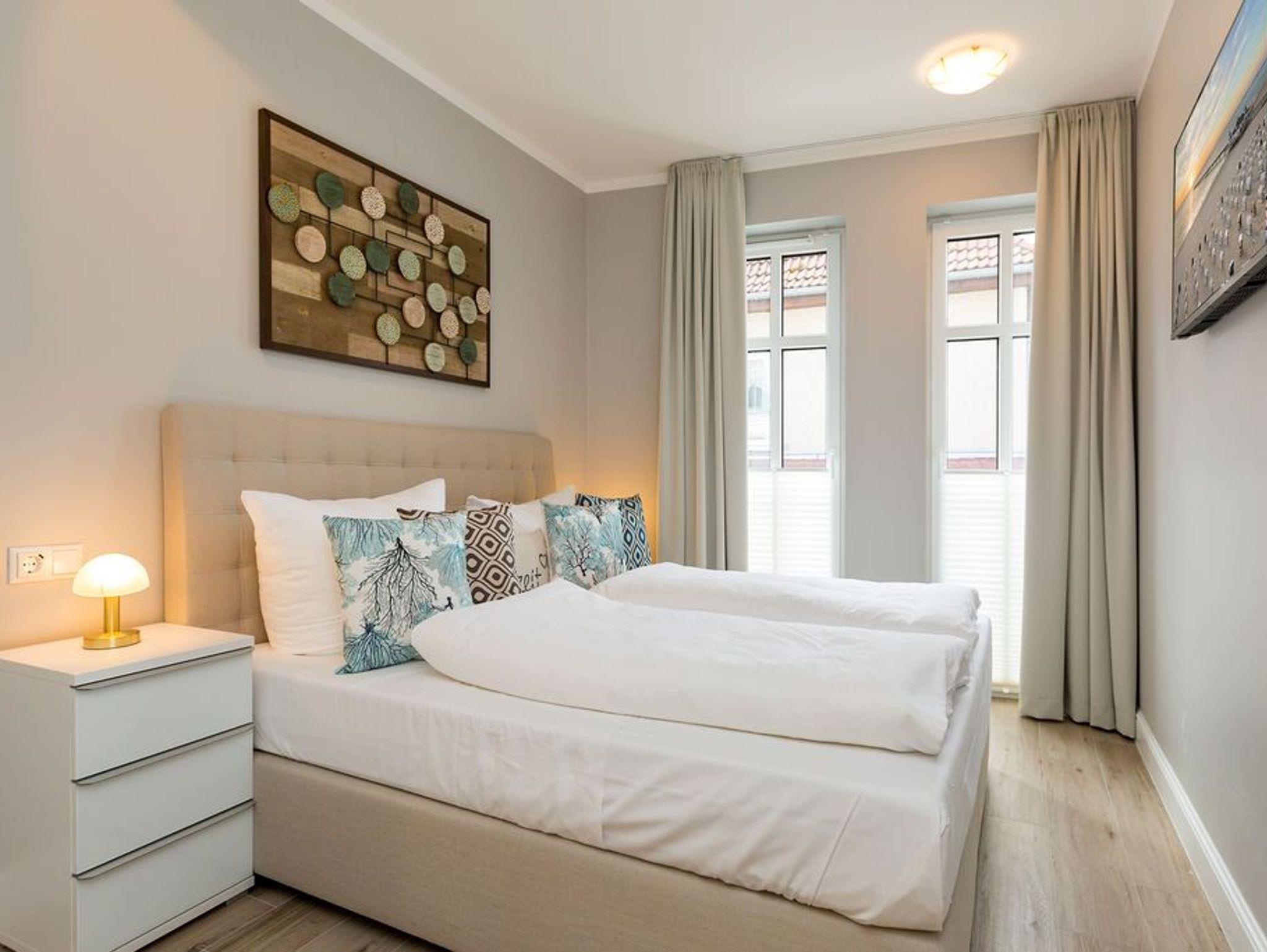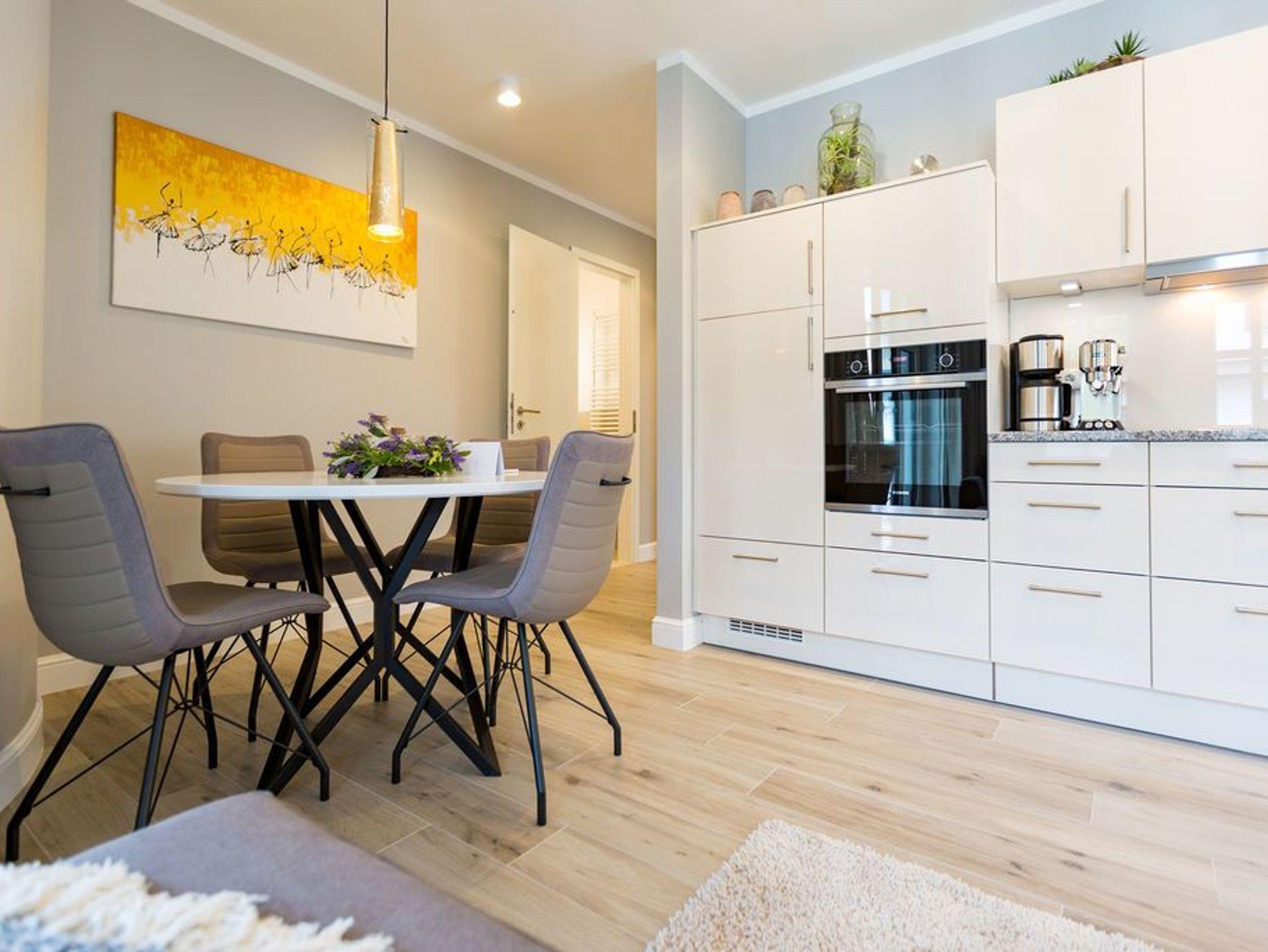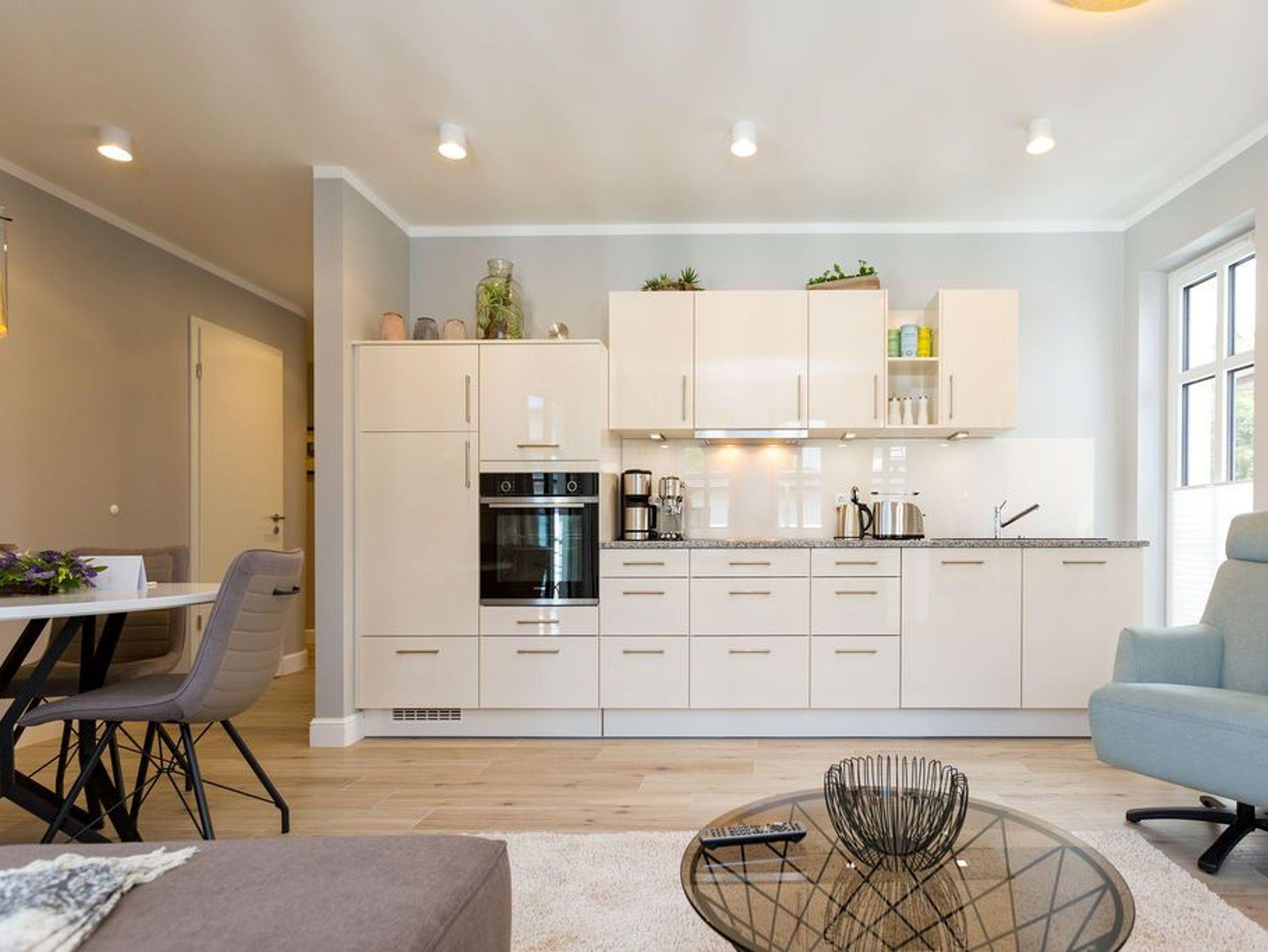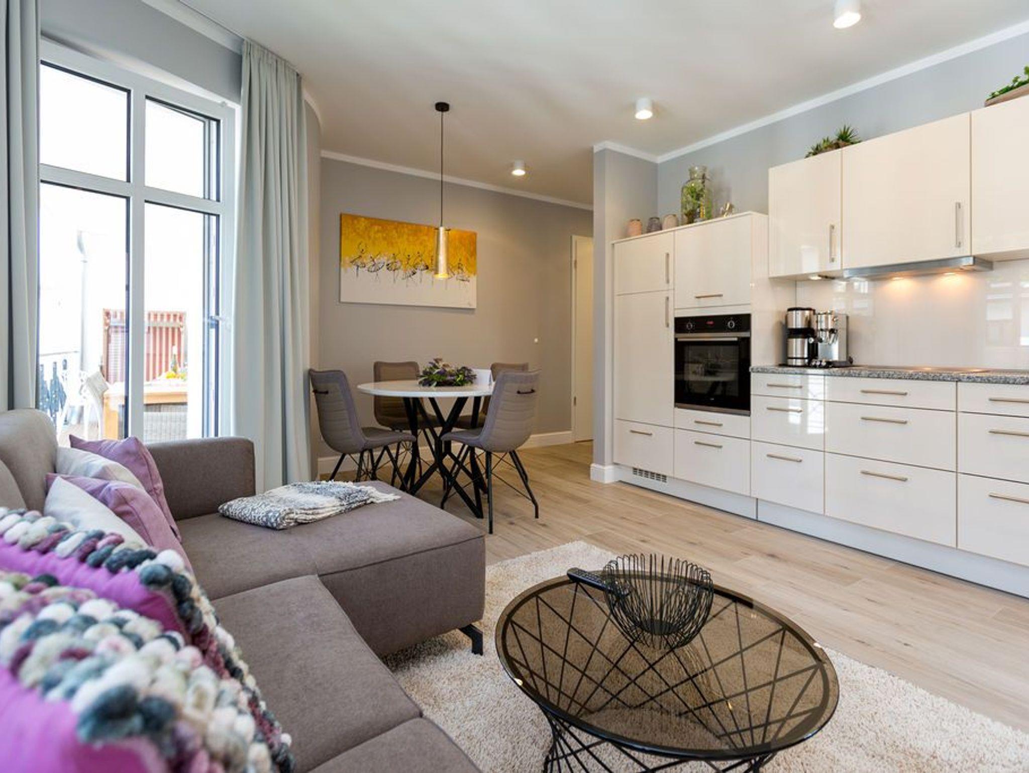 Alltag? 0815? Nicht in diesem wunderbar hellen und modernen Appartement Nummer 5 im 1. Obergeschoss. Ein Fahrstuhl bringt Sie und die bis zu drei Mitreisenden plus ein Kleinkind bis zwei Jahre (im Kinderreisebett) bequem bis hinauf in Ihr 78 Quadratmeter großes Urlaubsparadies. Angefangen beim stilvollen Interieur bis zur technischen Ausstattung bietet das Appartement alles, was Sie sich für einen erholsamen Urlaub an der Ostsee nur wünschen können. Schöne Möbel wie die große Sofalandschaft oder der bequeme Lesesessel sorgen für Gemütlichkeit. Hier heißt es nur: Fallen lassen und entspannen. Ein großer Flat-TV bietet Home-Entertainment. Das WLAN ist kostenfrei. Oder machen Sie es sich mit dem Gas-Kamin so richtig heimelig. Die gesamte Wohnung hat zudem Fußbodenheizung. Kalte Füße gehören hier der Vergangenheit an. Ein Balkon Richtung Westen eignet sich ideal zum Sonnenbaden und Dinieren. Denn im Strandkorb und an den Balkonmöbeln haben alle Platz. Einen schönen Essplatz gibt es auch im großzügigen Wohnzimmer, das sich zur voll ausgestatteten Küche hin öffnet. Hier finden Sie alle notwendigen Küchengeräte und auch erlesenes Geschirr. Sämtlich Geräte - vom Toaster, über den Herd und die Mikrowelle bis hin zur Spülmaschine - sind hochwertige High-Endgeräte. Zwei Schlafzimmer - eines davon mit eigenem Badezimmerzugang - bringen Erholung im Schlaf. Sie sind jeweils mit einem breiten Boxspringdoppelbett (1,80 m x 2,00 m), einem Flat-TV und einem großen Kleiderschrank ausgestattet. Das Masterbad verfügt neben einer Dusche, Waschtisch und WC auch über eine kleine Finnische Sauna. Ein perfekter, kleiner Private SPA. Handtücher liegen bei Anreise schon bereit. Sie brauchen also nur noch ins Schwitzen kommen. Das zweite Badezimmer hat ebenfalls eine Dusche, einen Waschtisch und ein WC. Die Betten sind bei Ihrer Ankunft bezogen. In einem Abstellraum befindet sich eine Waschmaschine. Ein Pkw-Stellplatz ist in der Tiefgarage reserviert.