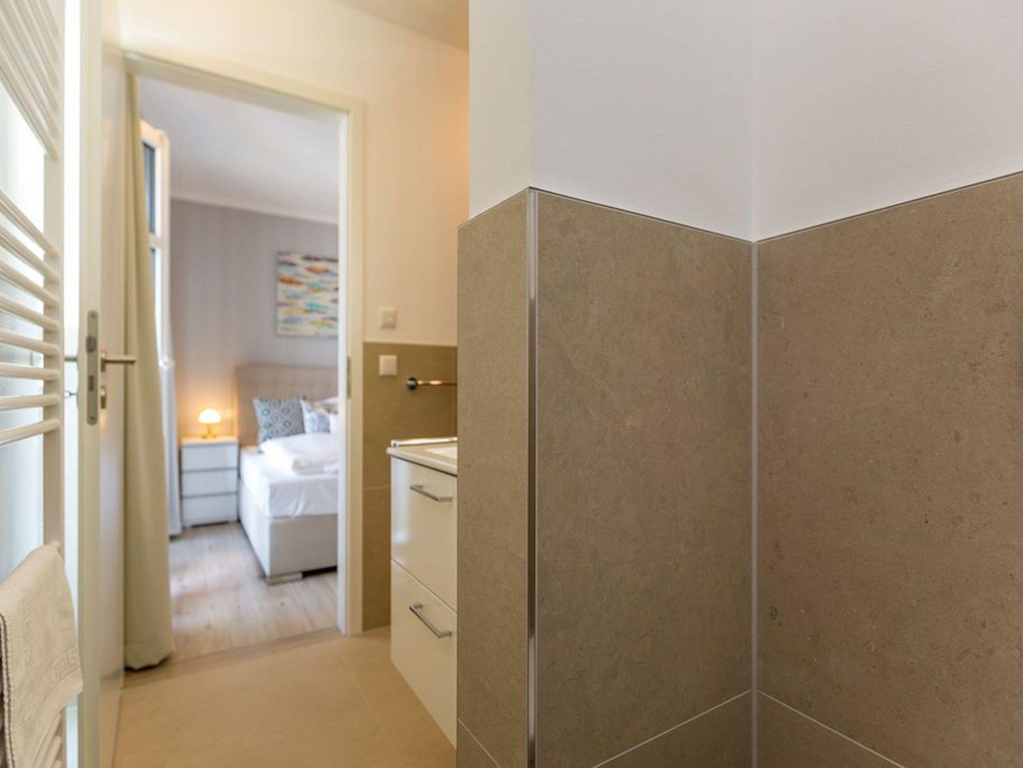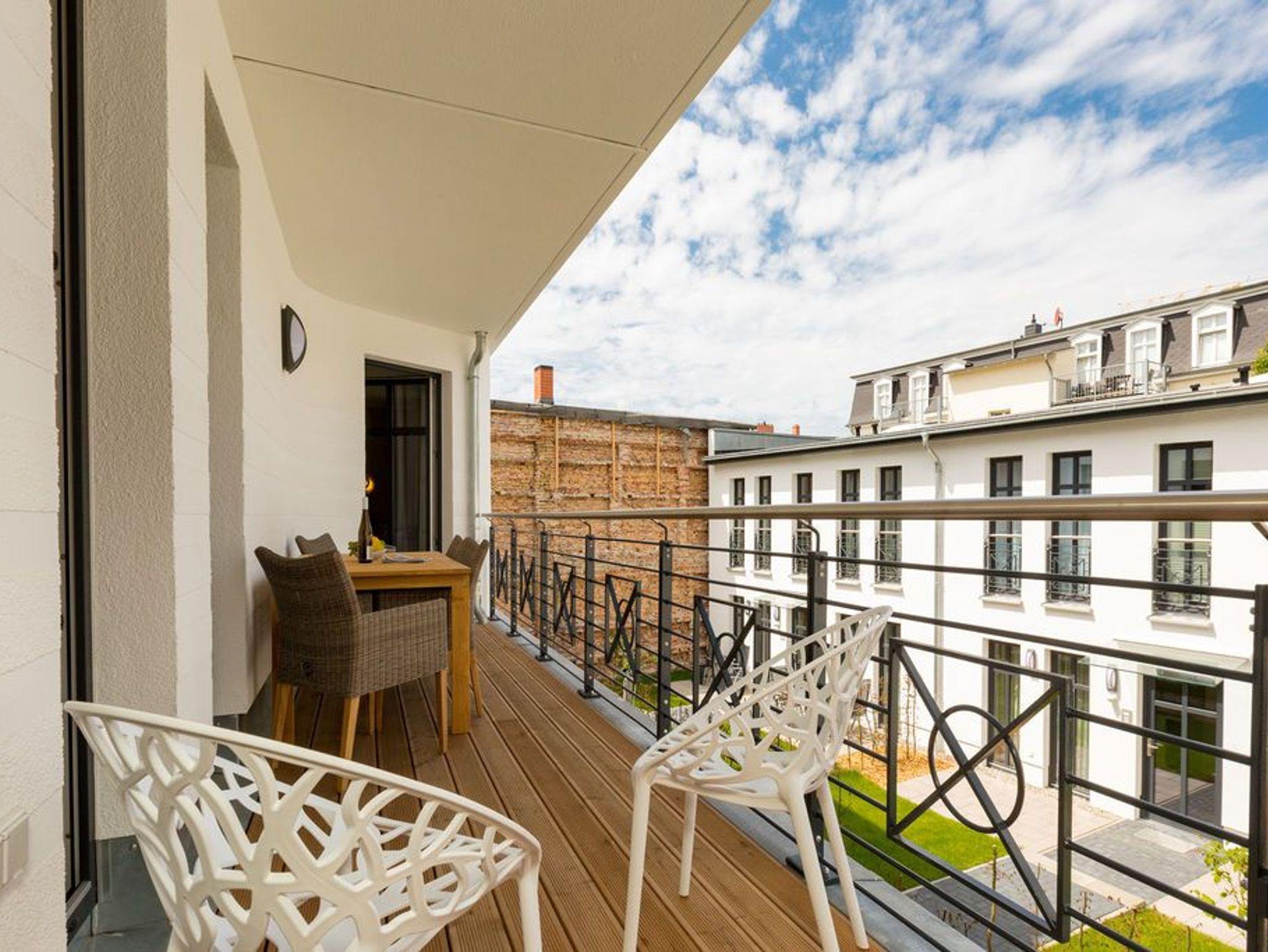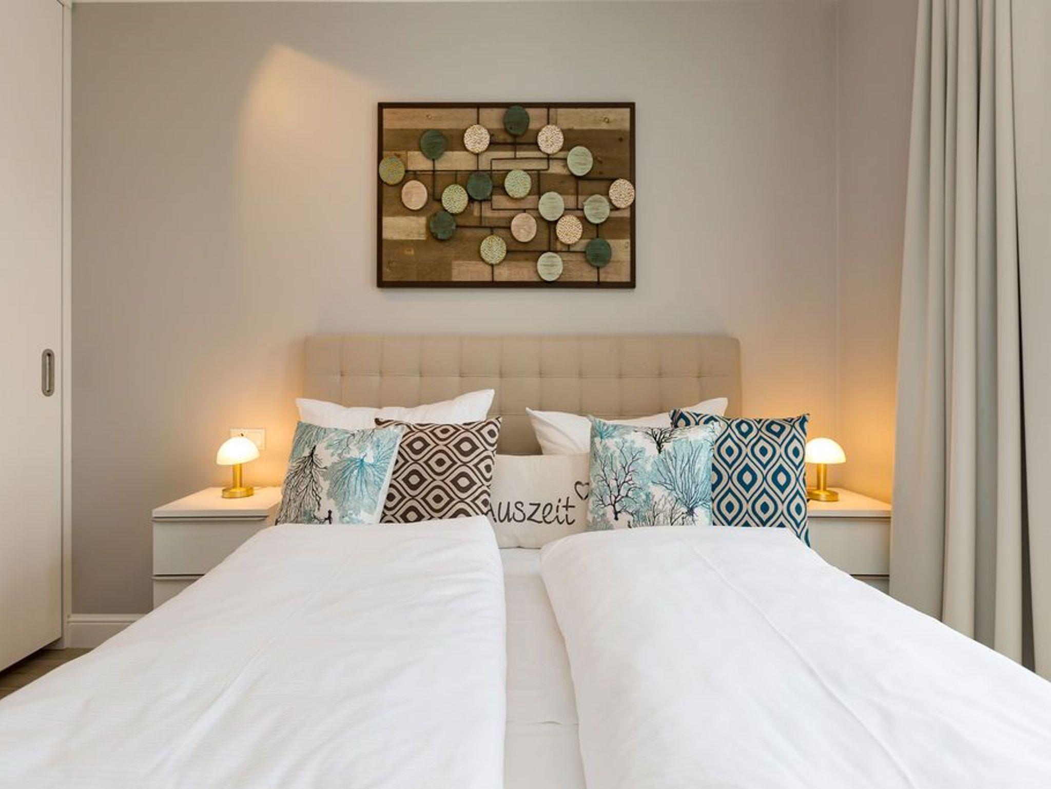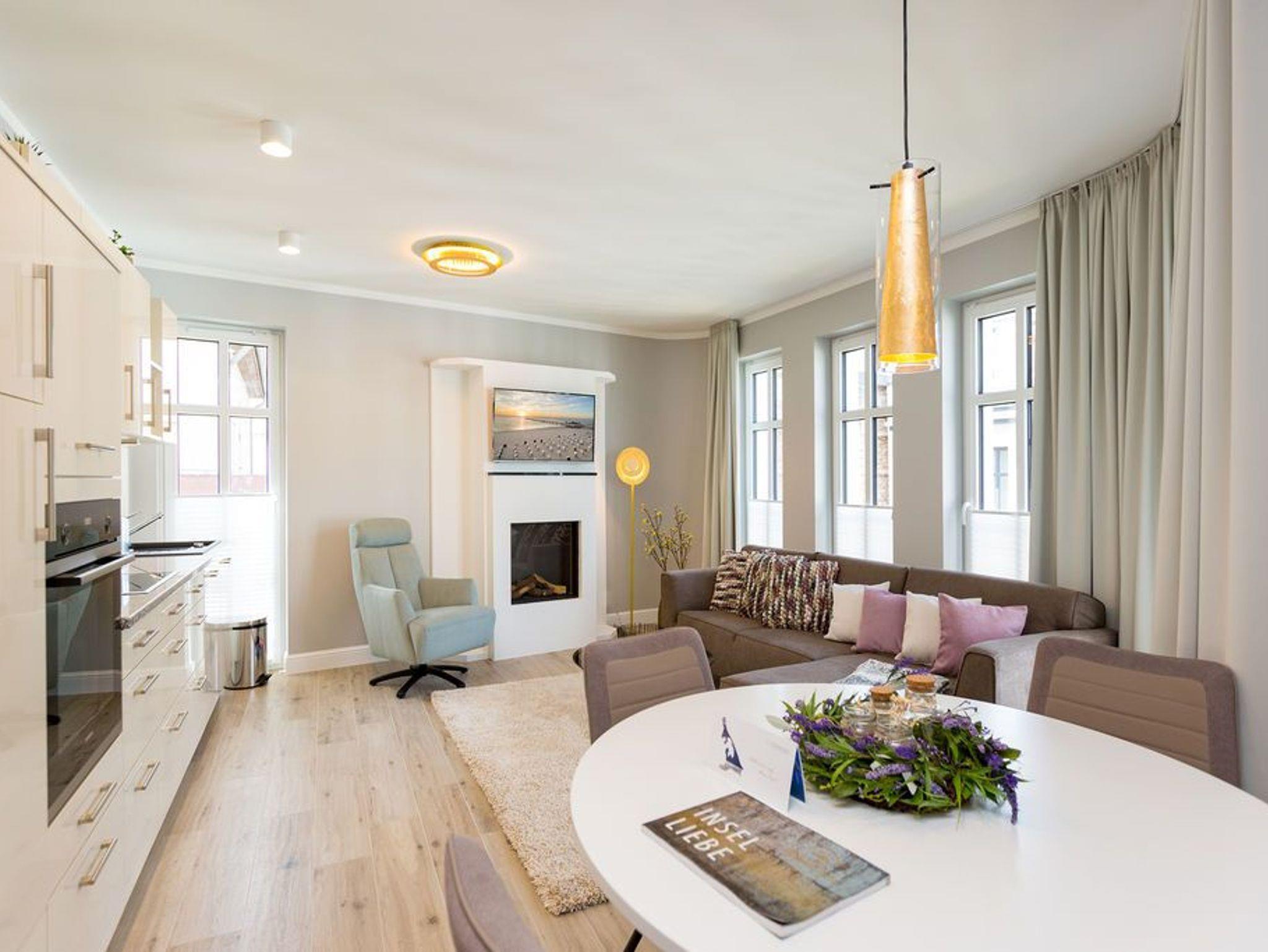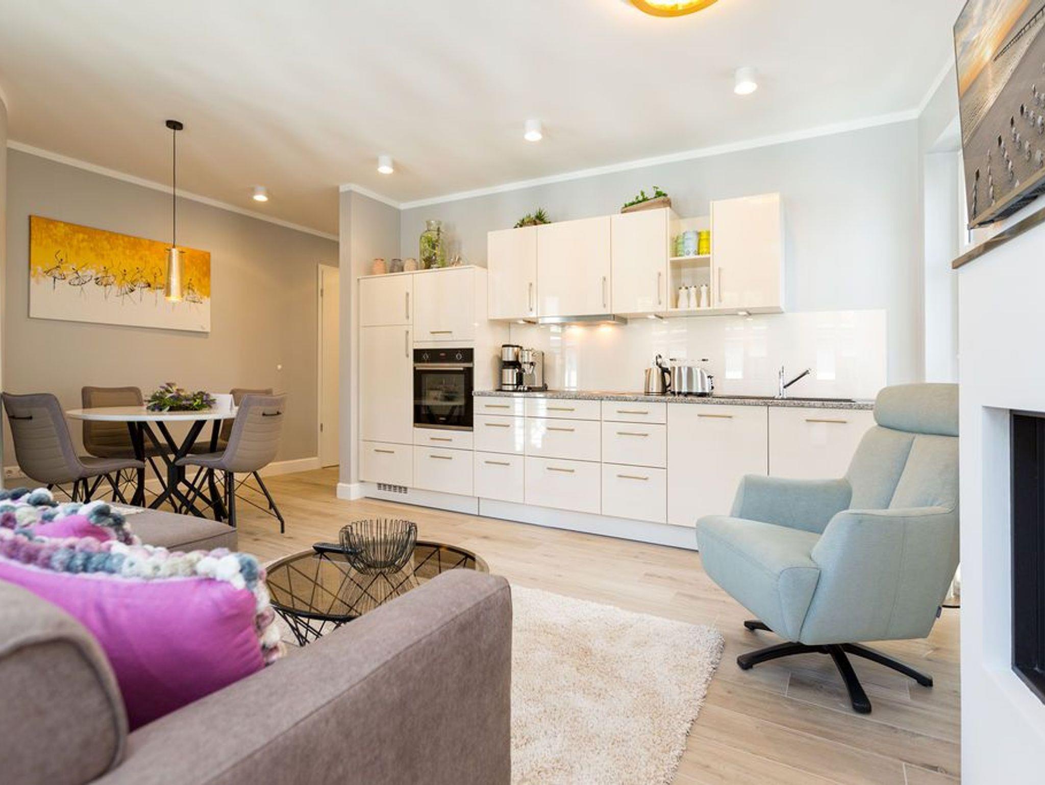 Alltag? 0815? Nicht in diesem wunderbar hellen und modernen Appartement Nummer 5 im 1. Obergeschoss. Ein Fahrstuhl bringt Sie und die bis zu drei Mitreisenden plus ein Kleinkind bis zwei Jahre (im Kinderreisebett) bequem bis hinauf in Ihr 78 Quadratmeter großes Urlaubsparadies. Angefangen beim stilvollen Interieur bis zur technischen Ausstattung bietet das Appartement alles, was Sie sich für einen erholsamen Urlaub an der Ostsee nur wünschen können. Schöne Möbel wie die große Sofalandschaft oder der bequeme Lesesessel sorgen für Gemütlichkeit. Hier heißt es nur: Fallen lassen und entspannen. Ein großer Flat-TV bietet Home-Entertainment. Das WLAN ist kostenfrei. Oder machen Sie es sich mit dem Gas-Kamin so richtig heimelig. Die gesamte Wohnung hat zudem Fußbodenheizung. Kalte Füße gehören hier der Vergangenheit an. Ein Balkon Richtung Westen eignet sich ideal zum Sonnenbaden und Dinieren. Denn im Strandkorb und an den Balkonmöbeln haben alle Platz. Einen schönen Essplatz gibt es auch im großzügigen Wohnzimmer, das sich zur voll ausgestatteten Küche hin öffnet. Hier finden Sie alle notwendigen Küchengeräte und auch erlesenes Geschirr. Sämtlich Geräte - vom Toaster, über den Herd und die Mikrowelle bis hin zur Spülmaschine - sind hochwertige High-Endgeräte. Zwei Schlafzimmer - eines davon mit eigenem Badezimmerzugang - bringen Erholung im Schlaf. Sie sind jeweils mit einem breiten Boxspringdoppelbett (1,80 m x 2,00 m), einem Flat-TV und einem großen Kleiderschrank ausgestattet. Das Masterbad verfügt neben einer Dusche, Waschtisch und WC auch über eine kleine Finnische Sauna. Ein perfekter, kleiner Private SPA. Handtücher liegen bei Anreise schon bereit. Sie brauchen also nur noch ins Schwitzen kommen. Das zweite Badezimmer hat ebenfalls eine Dusche, einen Waschtisch und ein WC. Die Betten sind bei Ihrer Ankunft bezogen. In einem Abstellraum befindet sich eine Waschmaschine. Ein Pkw-Stellplatz ist in der Tiefgarage reserviert.