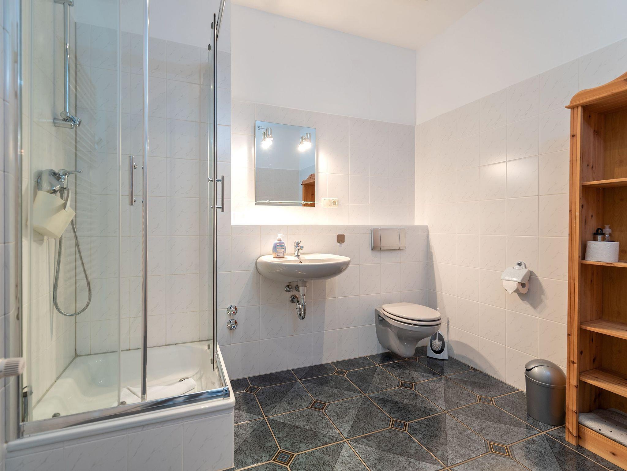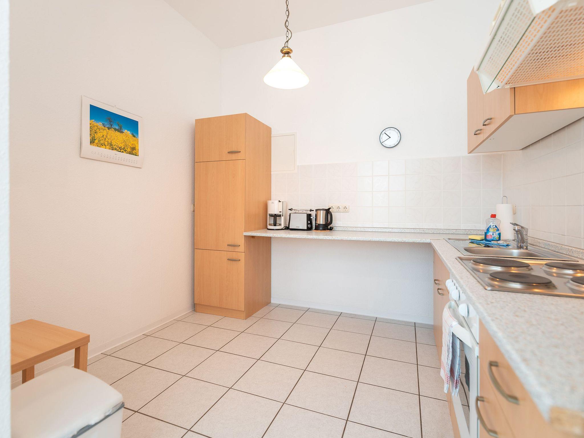Die kleine Ferienwohnung „Ostsee“ liegt im ersten Stock der Villa Krause. Hier finden drei Personen plus Kleinkind im Kinderreisebett Platz. Es gibt ein Wohnzimmer mit Couch und TV, ein Schlafzimmer mit Boxspringbett, ein Badezimmer mit Dusche und eine Küche mit Essbereich. Wlan ist vorhanden.
