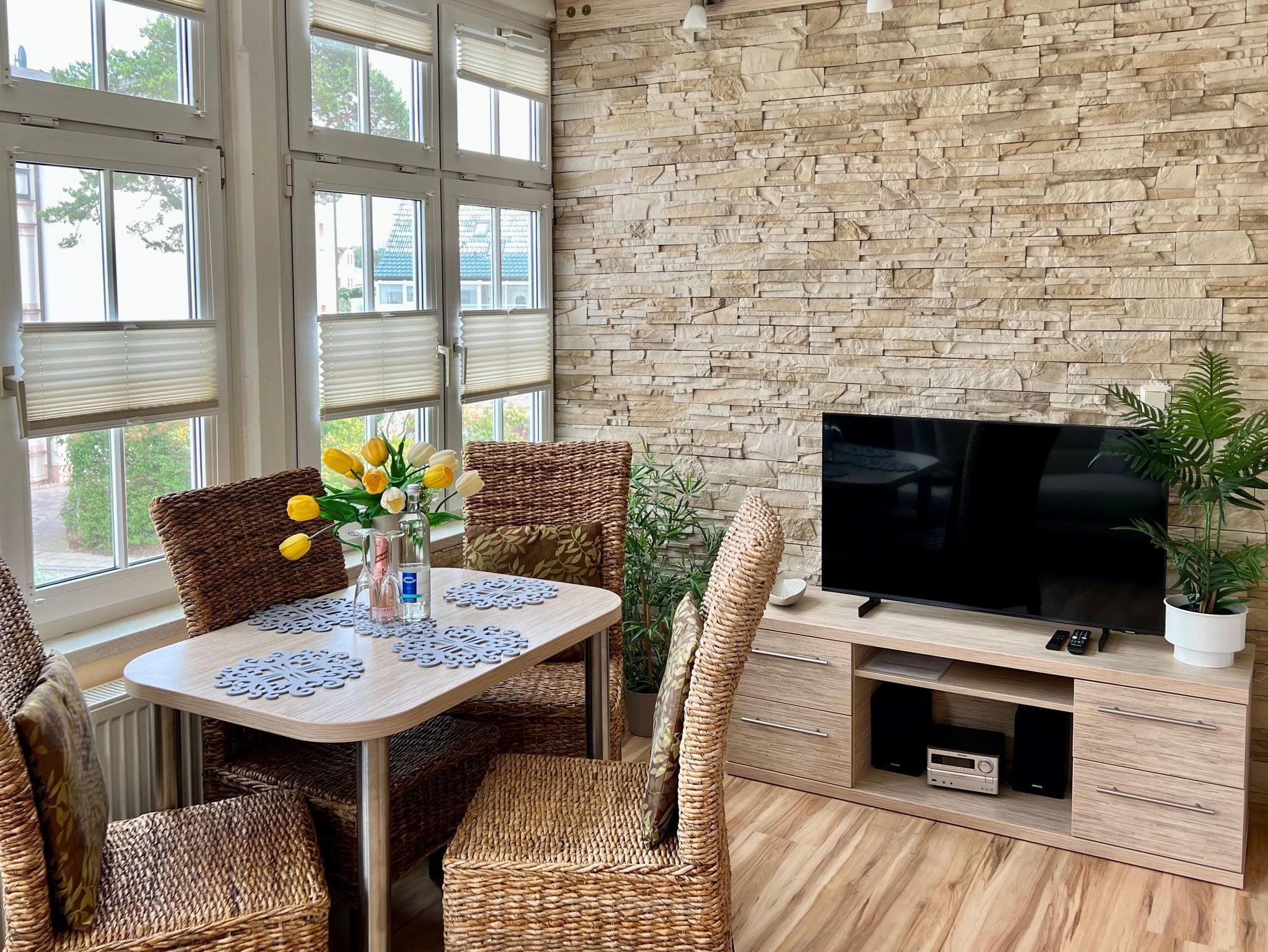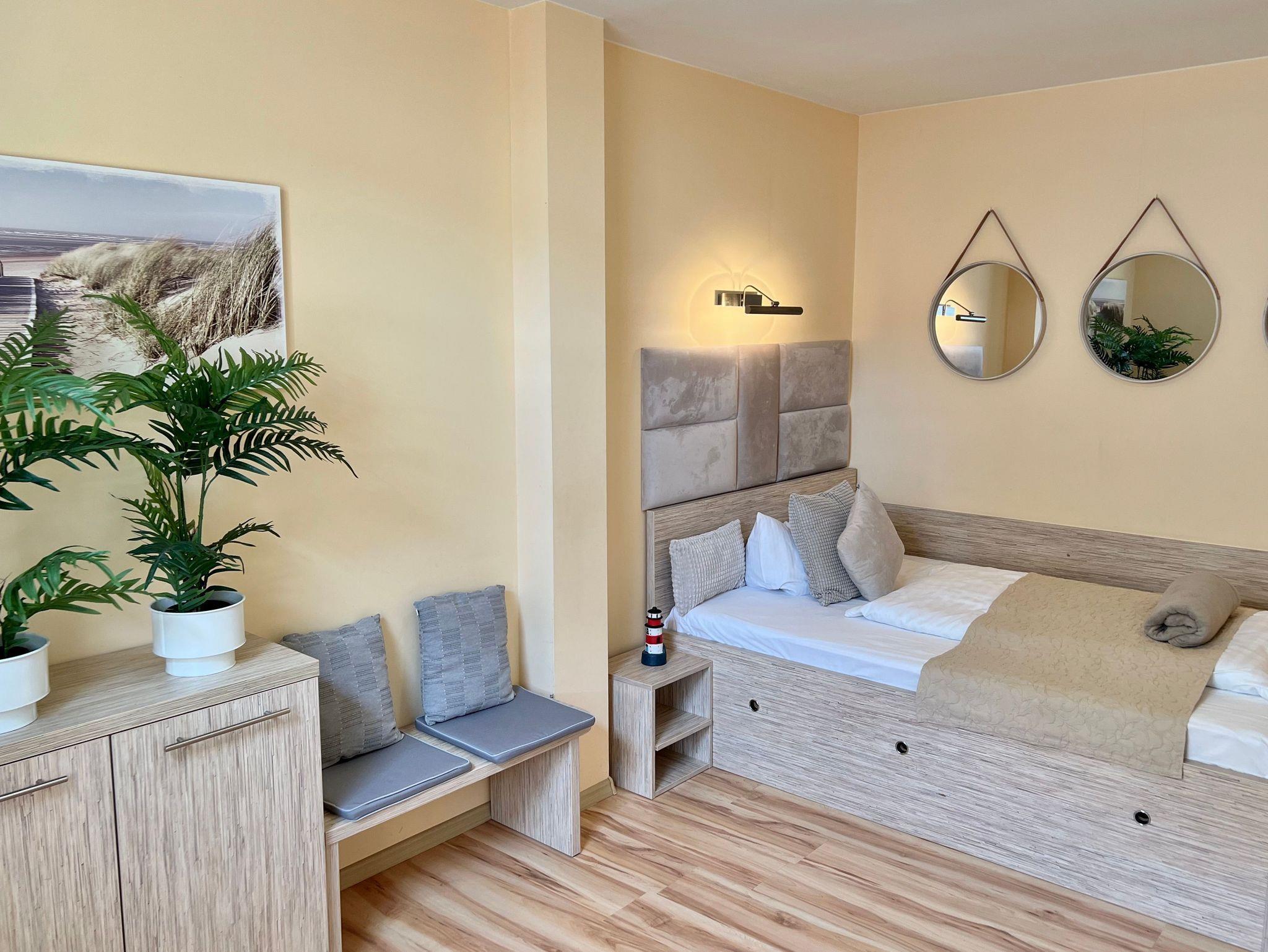 Die nur 80 Meter vom Strand entfernte Obergeschosswohnung besticht durch seine Helligkeit. Viele Fenster mit speziell beschichteten Plissees sorgen für ein individuelles Raumklima. Ein großzügiger Wohn-/Schlafraum sowie ein zweites, separates Schlafzimmer dienen Familien mit ausreichend Platz. Zwei große Betten (160cm und 140cm) sowie eine farblich harmonische Sitzecke lassen Ihrer Ruhe keine Wünsche offen. Eine moderne, grundausgestattete Einbauküche, LED-SMART-TV, HiFi-Anlage und Internetzugang lassen Sie bei uns alle Sorgen vergessen. Ihr Appartement ist sowohl Allergiker wie Nichtraucher freundlich. Weiße, kräftige Baumwollbettwäsche und weiche Handtücher werden Ihnen schmeicheln. Geschirrtücher und Duschvorleger sind vorhanden. Interessant für junge Familien sind die Unterbringungsmöglichkeiten mitgebrachten Eigentums (entweder im Haus Ihres Appartements Parterre oder im Fahrradschuppen). Auf dem Hof finden Sie Wäscheständer für Ihre nasse Wäsche. Ihrem Fahrzeug ist ein Parkplatz direkt am Ferienhaus reserviert. Für eventuell benötigte Hochstühle oder Kinderreisebetten entstehen Ihnen nach Rücksprache keine zusätzlichen Kosten. Bitte informieren Sie uns über Ihre Wünsche rechtzeitig.