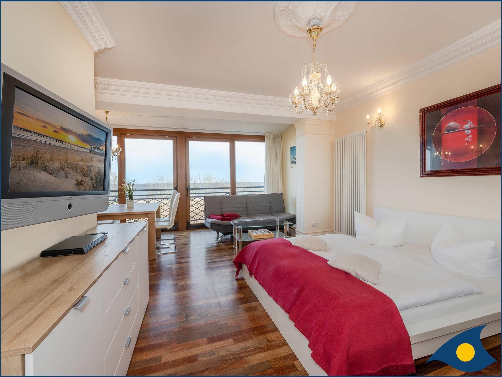 Die Wohnung verfügt über einen großzügigen Wohn-/Schlafbereich mit bodentiefen Fenstern, einem Doppelboxspringbett und einer bequemen Couch. Die in den Wohnraum integrierte, offene Küche ist mit einer Spülmaschine, einer Mikrowelle, einem 2 Platten-Ceranfeld und Kühlschrank ausgestattet. Vom Essplatz können Sie den wundervollen Blick durch die Bäume über die Ostsee schweifen lassen.