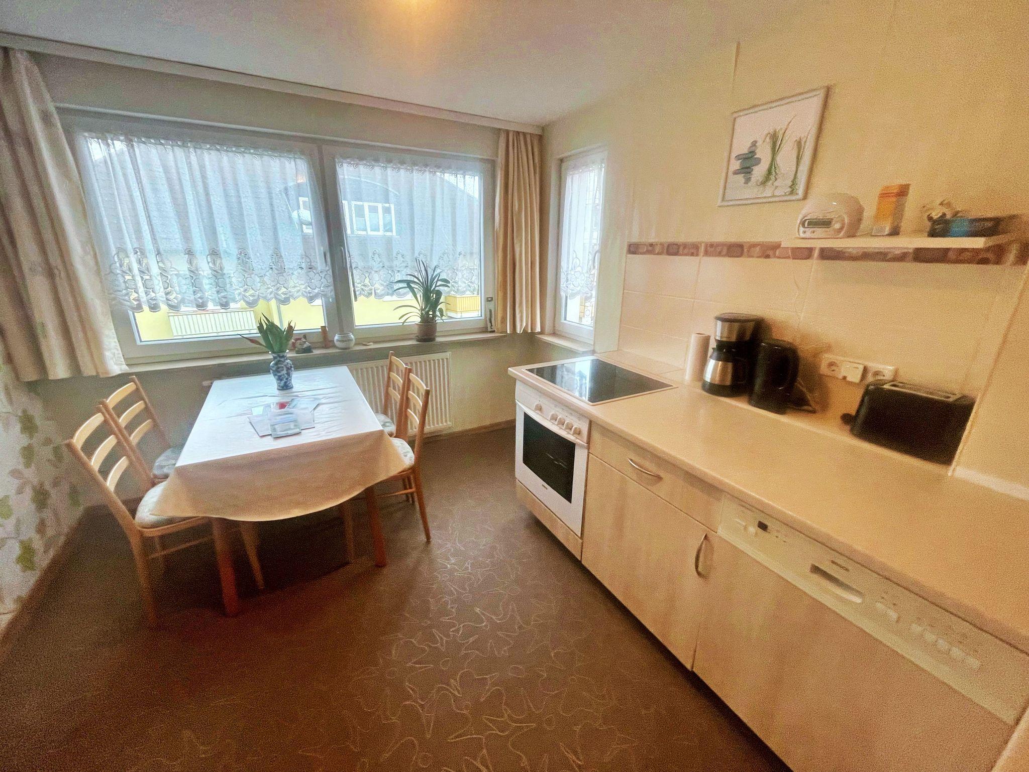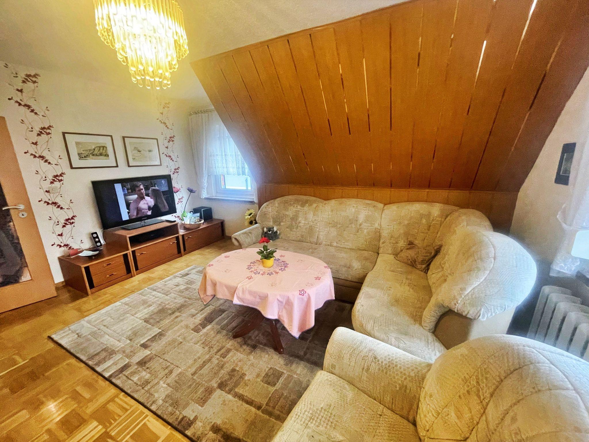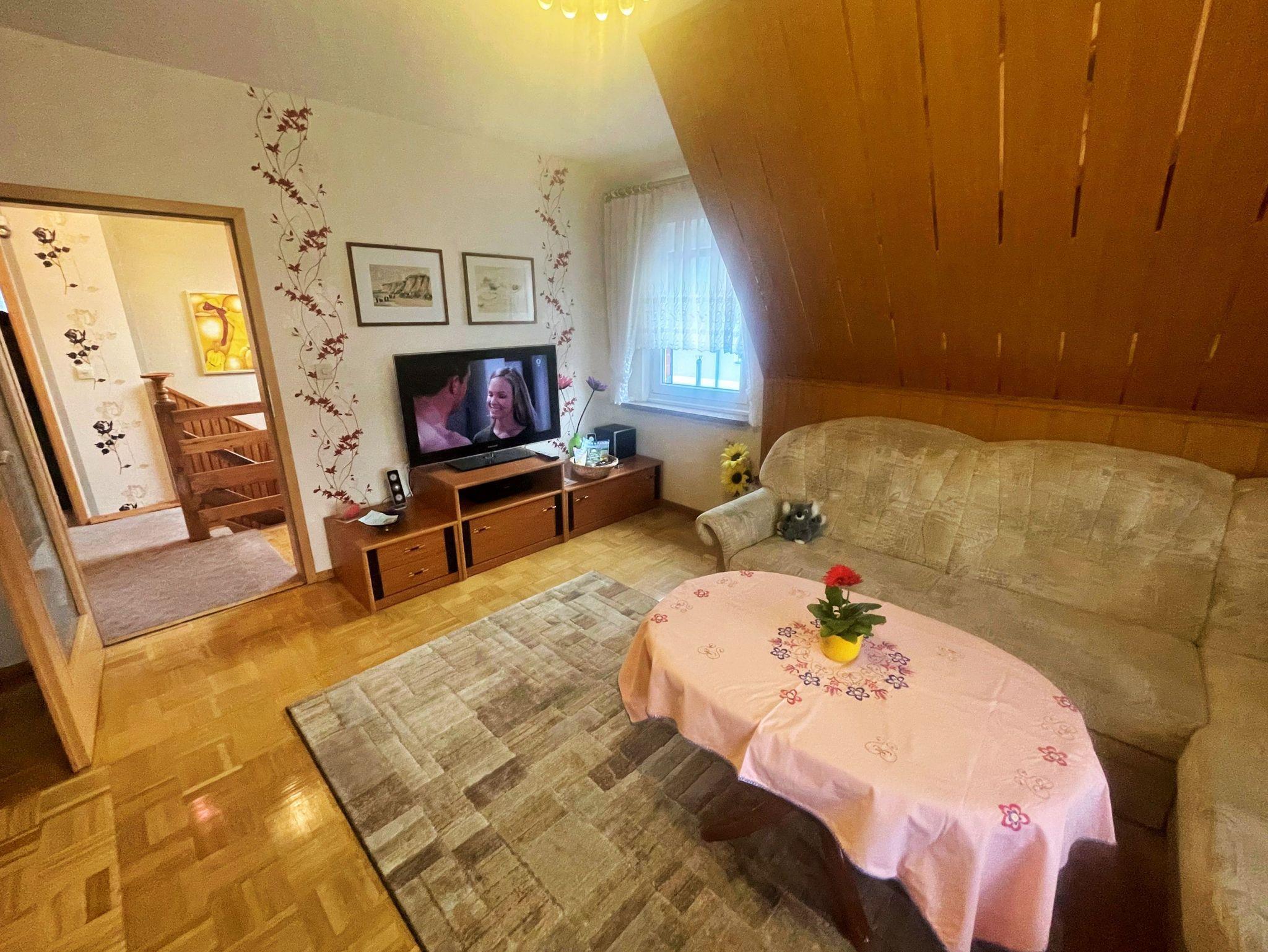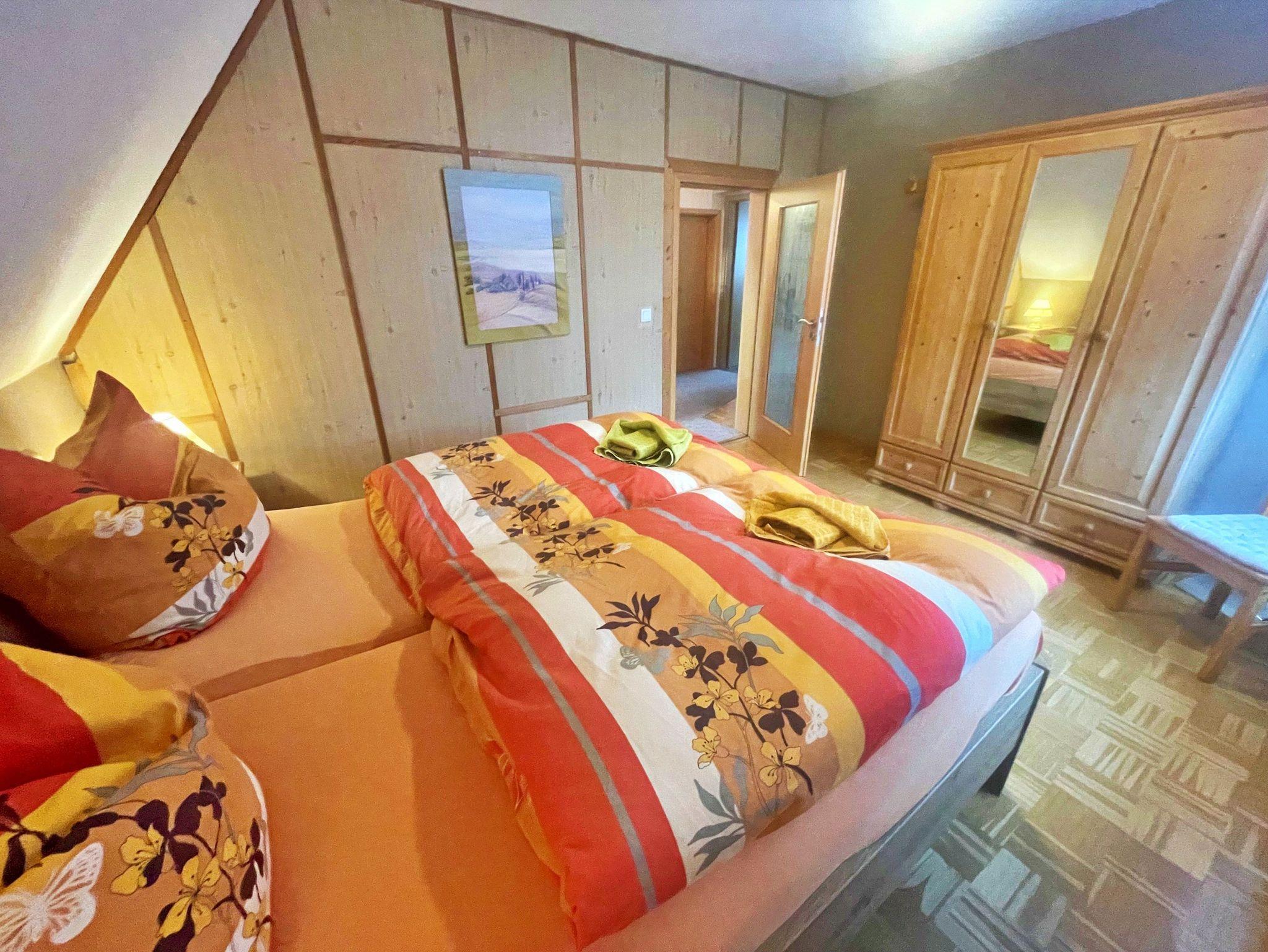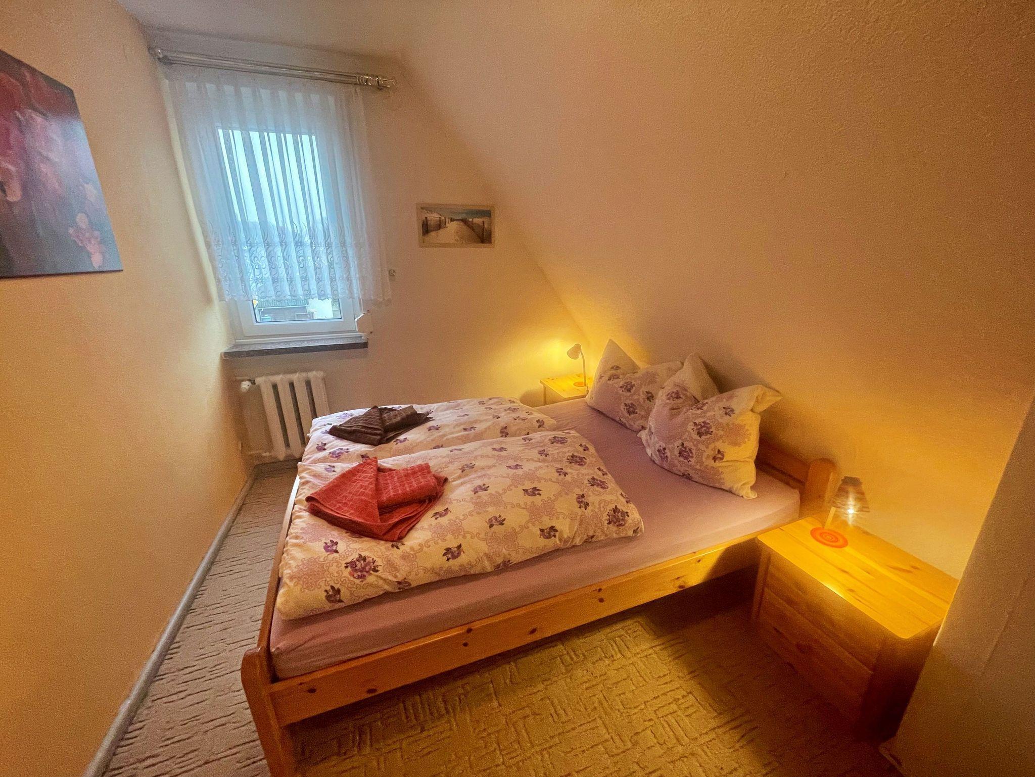 Die gemütlich eingerichtete Ferienwohnung im Obergeschoss des Wohnhaus des Vermieters verfügt über einen separaten Eingang über den Wintergarten, von dort aus gelangt man durch eine Tür ca. 70 cm, zur Treppe, die in die Wohnung führt. Die Ferienwohnung teilt sich auf in ein großes Wohnzimmer mit Couchsitzecke, Wohnwand, Flat-TV und Bibliothek. Das Schlafzimmer verfügt über ein Doppelbett und einen geräumigen Kleiderschrank. Das zweite Schlafzimmer verfügt über ein Doppelbett (1,40 x 2 m) und einen Kleiderschrank. Die helle, gut ausgestattete separate Küche verfügt über einen 4-Platten-Ceranherd mit Backofen, Geschirrspülmaschine und Kühlschrank sowie einen schönen Essplatz für 2-4 Personen. Das Badezimmer verfügt über eine Glasdusche und WC sowie Haartrockner. Die Erstausstattung Bettwäsche und Handtücher, Endreinigung sowie der Parkplatz sind im Preis inklusive.