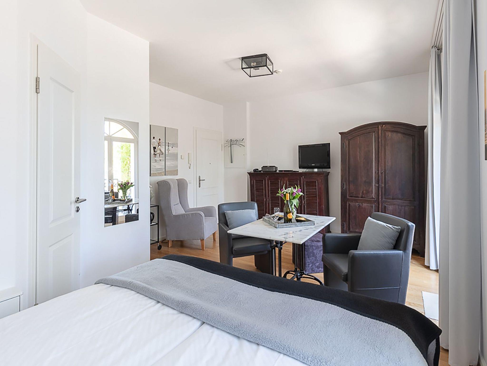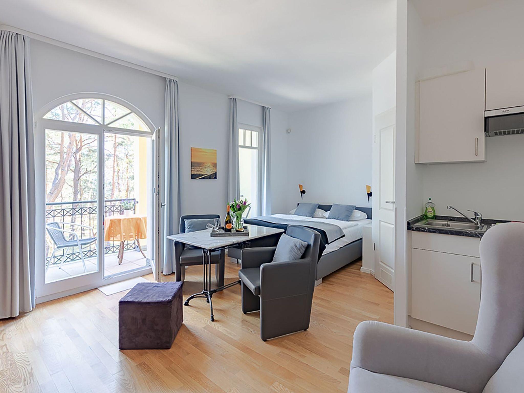 Das 25 m² große 1-Raum-Appartement Oie in der 2. Etage begrüßt Sie mit dem beruhigenden Klang der Ostseewellen. Im Sommer erleben Sie den Sonnenaufgang bequem aus dem Bett ? ein perfekter Start in den Tag. Der über die gesamte Breite des Appartements reichende, eingebaute Balkon lädt zu gemütlichen Stunden ein, ob mit Sonnenhut oder Kuscheldecke. Vom bequemen Ohrensessel genießen Sie den Blick aufs Meer, während Sie lesen, fernsehen oder einfach entspannen. Die kompakte Küchenzeile (1 m breit) mit 2-Platten-Cerankochfeld, Spüle und Kühlschrank mit Gefrierfach ist mit allem ausgestattet, was Sie für die Zubereitung kleiner Mahlzeiten zu zweit benötigen. Als Gast haben Sie jederzeit Zugang zum hauseigenen Wellnessbereich mit Ruheraum ? ideal zum Lesen, Entspannen oder einfach zum Abschalten nach einem Strandtag. Ihre leeren Gepäckstücke können Sie bequem in einer Abstellkammer auf derselben Etage unterbringen. Ein eigener PKW-Stellplatz am Haus steht Ihnen während des gesamten Aufenthalts zur Verfügung.
