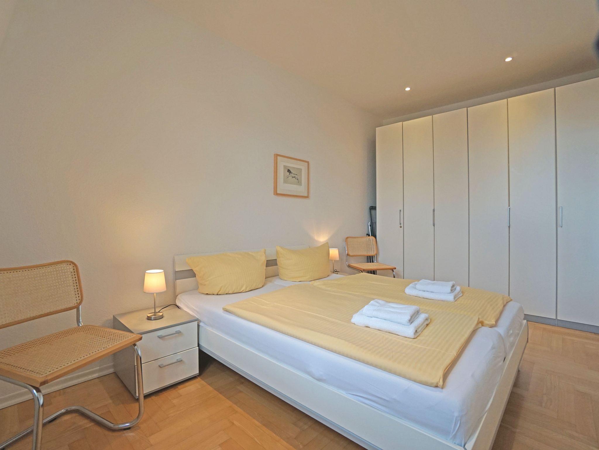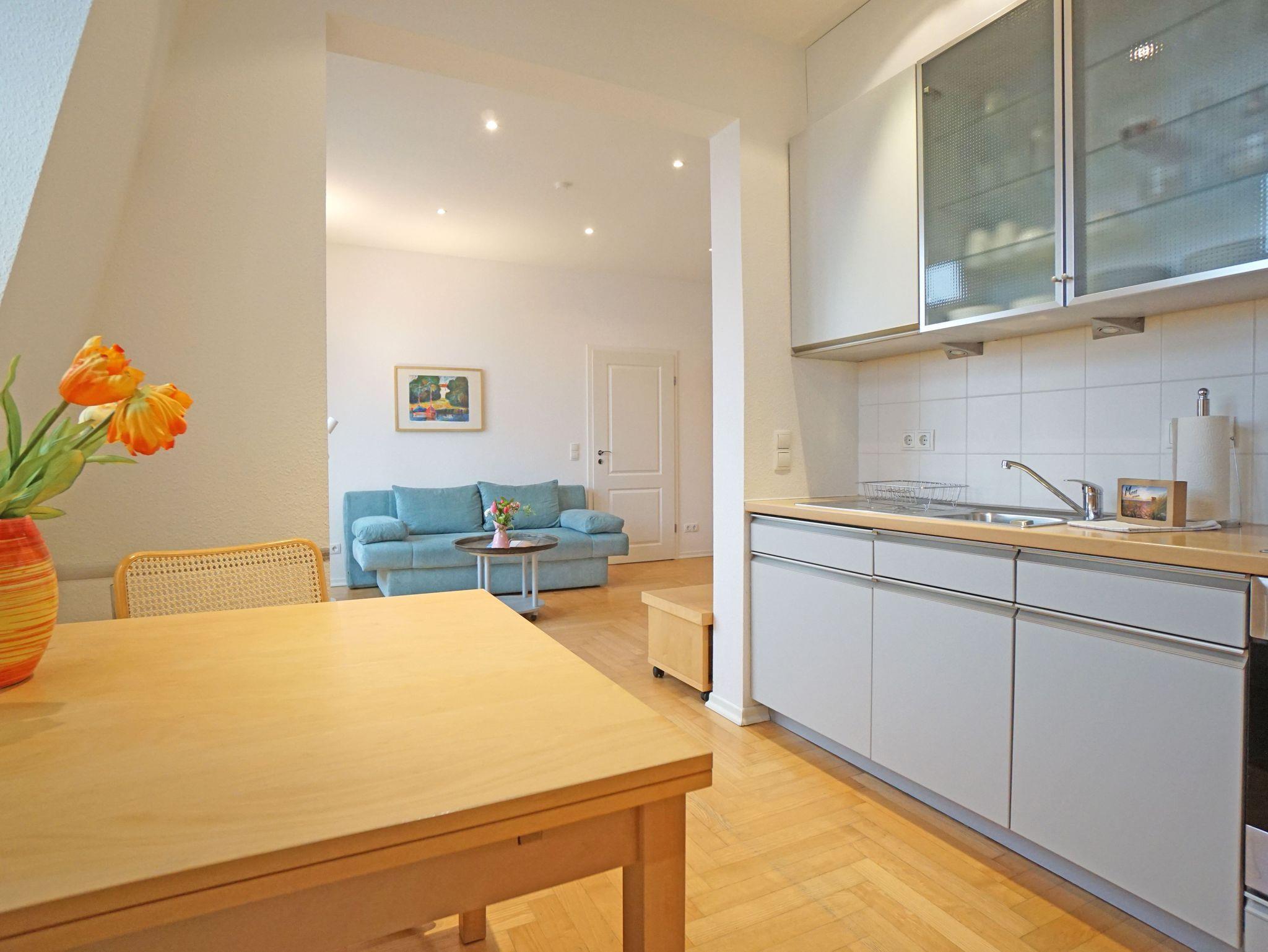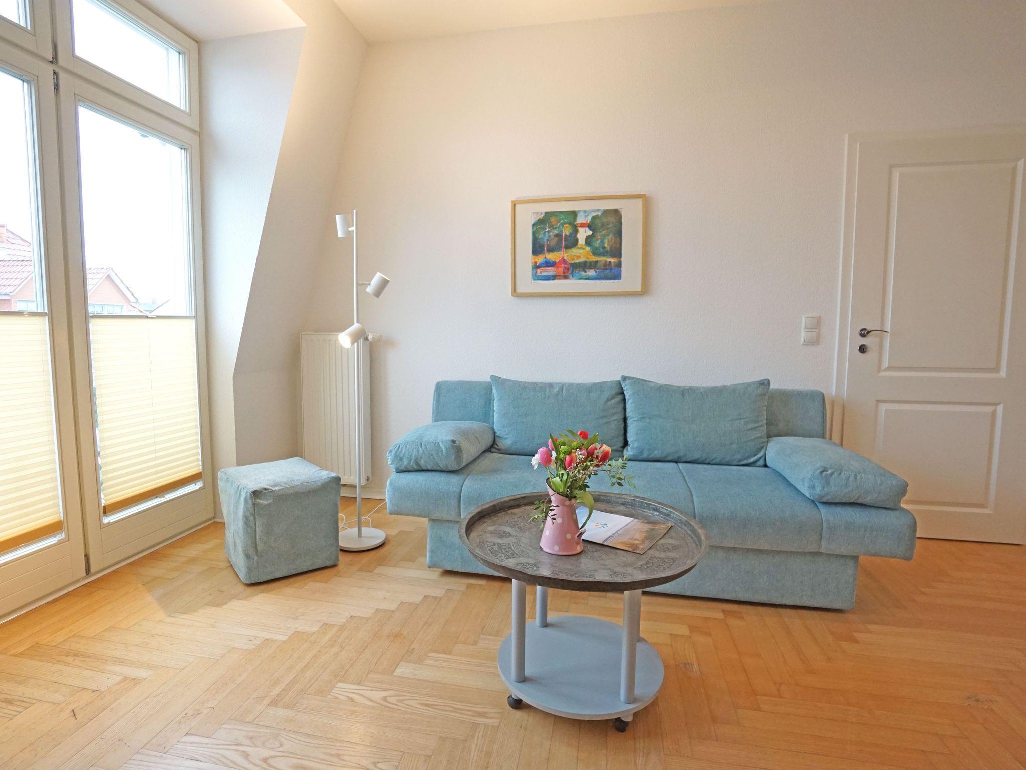Die großzügige und modern eingerichtete 2-Zimmer Nichtraucherwohnung (42m²) liegt im obersten Stockwerk (2. Etage)der 2005 restaurierten Villa Quisisana. Die Wohnung verfügt über ein Schlafzimmer mit Doppelbett und einen sonnigen Balkon in Südwestlage. Im großen Wohnzimmer befindet sich eine komplett eingerichtete Küchenzeile, ein Essplatz sowie eine Sitzgruppe mit einer Schlafcouch (Liegefläche:1,20m).