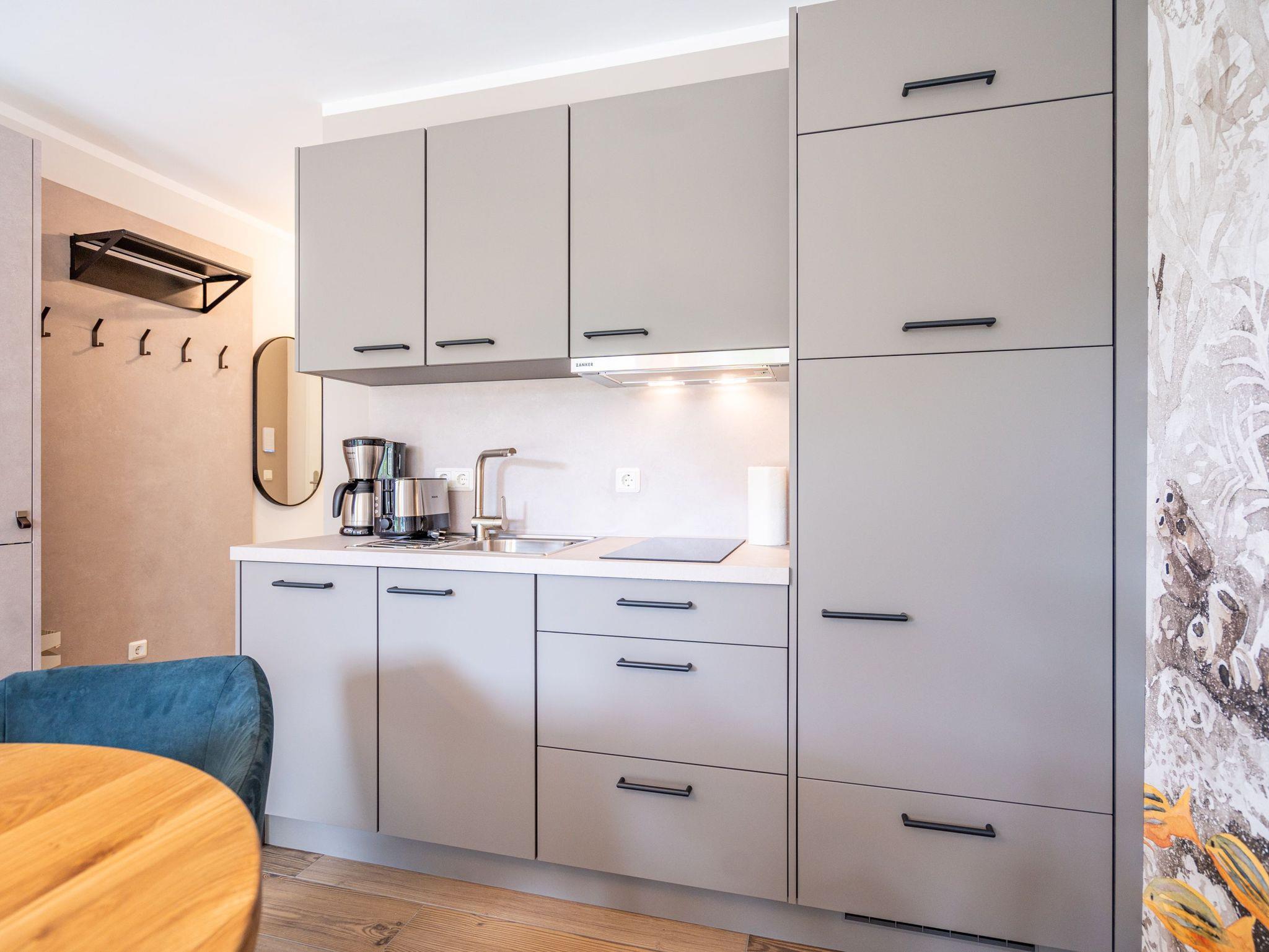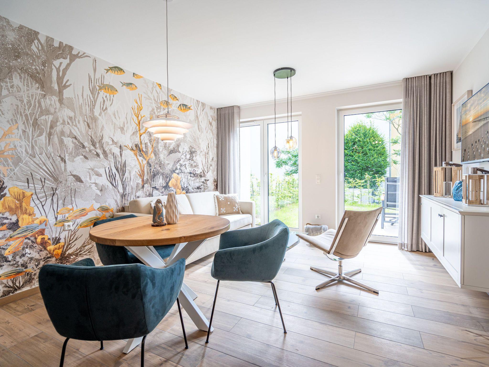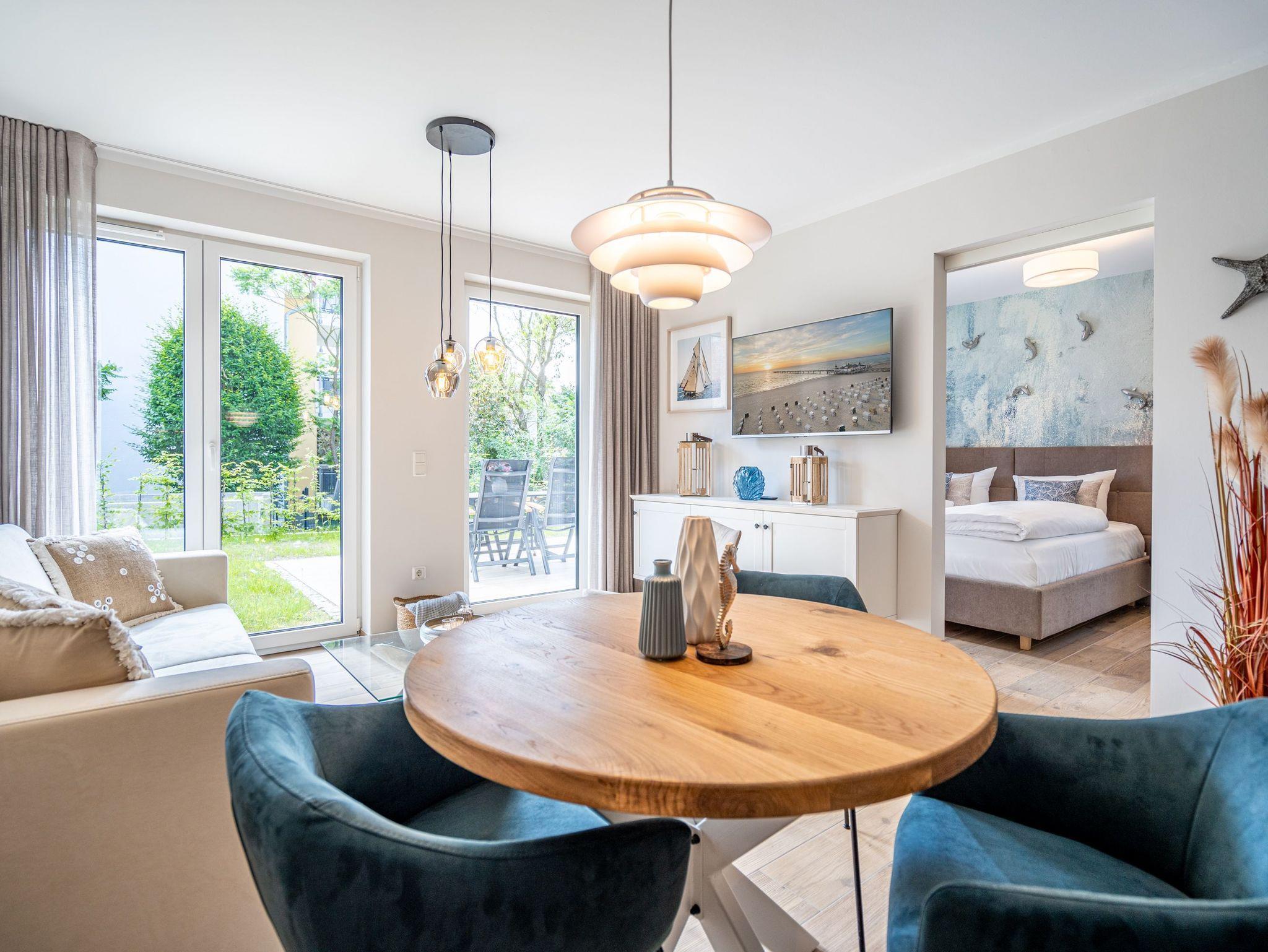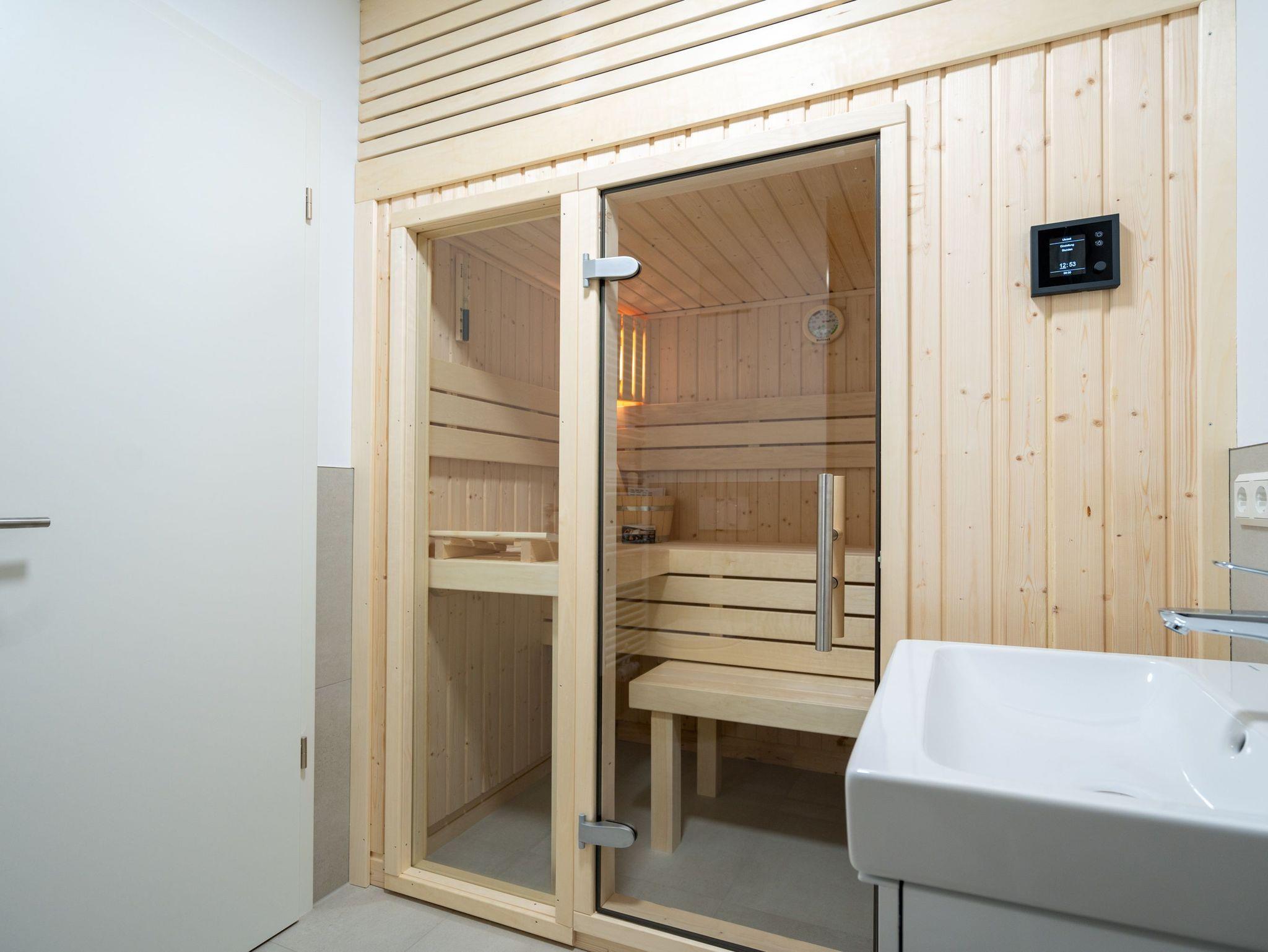 Herzlich willkommen im charmanten 2-Raum-Appartement Nr. 04! Mit einer Größe von 46 qm bietet es Platz für 2 Erwachsene und 1 Kind (bis 15 Jahre) und befindet sich im Erdgeschoss. Erleben Sie Ihren Urlaub in dieser liebevoll eingerichteten Ferienwohnung, die Ihnen alle Annehmlichkeiten für einen erholsamen Aufenthalt bietet. Der offene Wohnbereich lädt mit einer gemütlichen Schlafcouch, die als zusätzliche Schlafmöglichkeit für eine Person dient, und einem Flat-TV zum Verweilen ein. Die voll ausgestattete Küchenzeile lässt keine Wünsche offen und bietet neben einem 2-Platten Induktionsherd auch eine Mikrowelle und einen Geschirrspüler. Am Esstisch finden bequem 3 Personen Platz. Im separaten Schlafzimmer erwartet Sie ein komfortables Boxspringdoppelbett (1,80m x 2,00m) für erholsame Nächte. Ein Kleiderschrank bietet ausreichend Stauraum für Ihre Garderobe. Auch hier steht Ihnen ein weiterer Flat-TV zur Verfügung. Entspannen Sie nach einem erlebnisreichen Tag in unserem modernen Badezimmer mit Sauna. Eine Dusche, ein Waschtisch und ein WC runden das Angebot ab. Genießen Sie die frische Luft auf der 8 qm großen Süd-Ost-Terrasse, die sowohl vom Wohn- als auch vom Schlafbereich zugänglich ist. Hier können Sie Ihren Morgenkaffee genießen oder den Tag gemütlich ausklingen lassen. Für Ihren Komfort steht Ihnen ein PKW-Stellplatz in der Tiefgarage zur Verfügung. Wir freuen uns darauf, Sie bald bei uns begrüßen zu dürfen und wünschen Ihnen einen wunderbaren Aufenthalt!