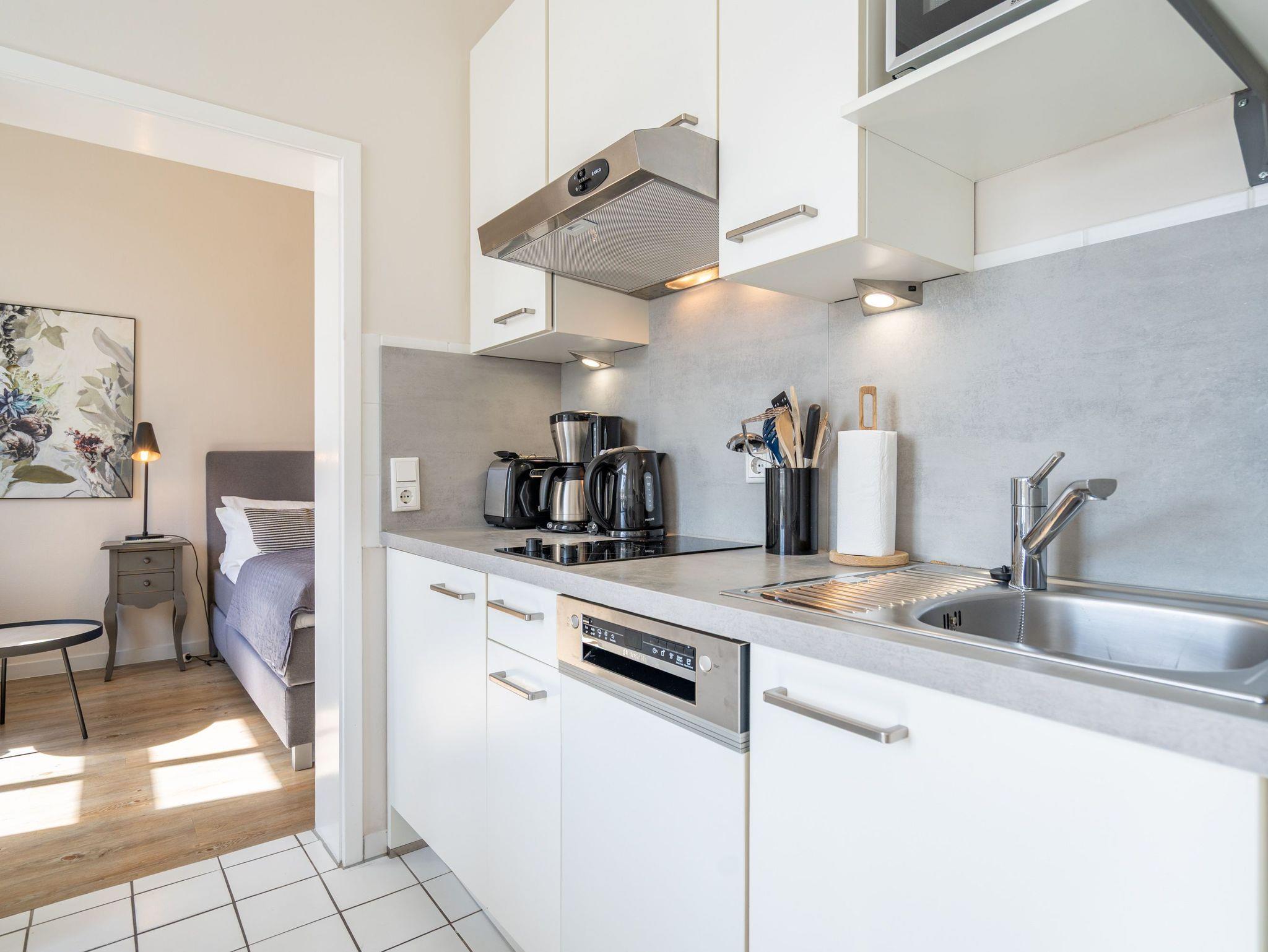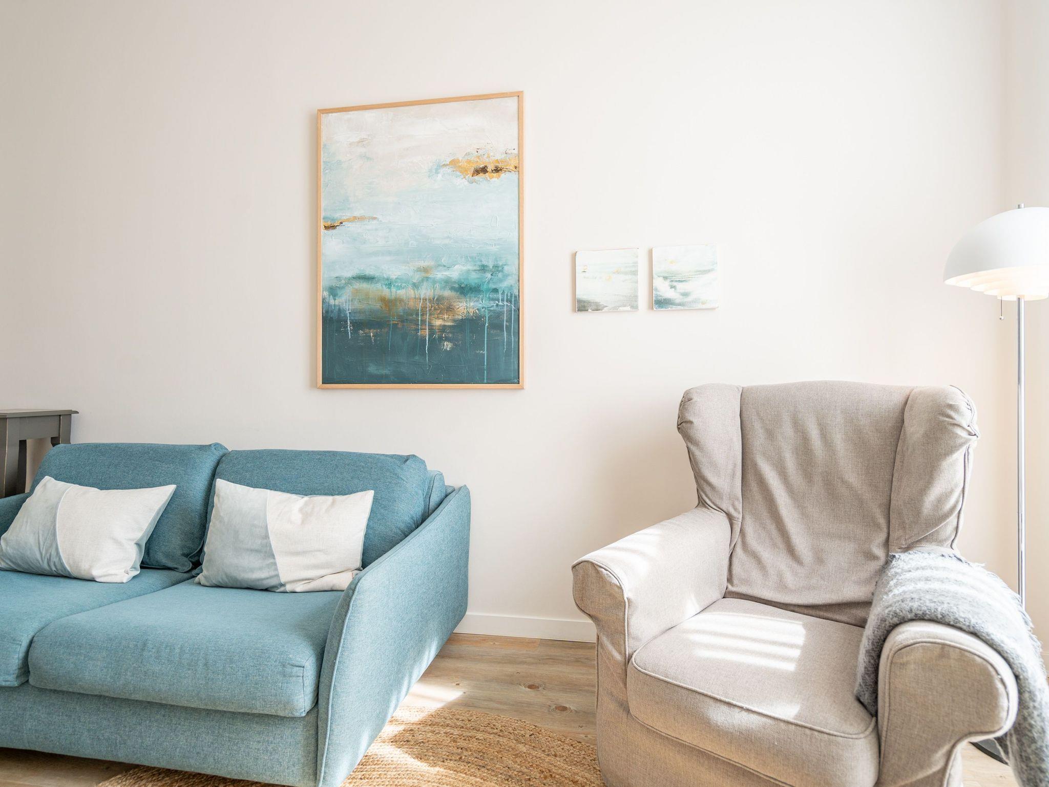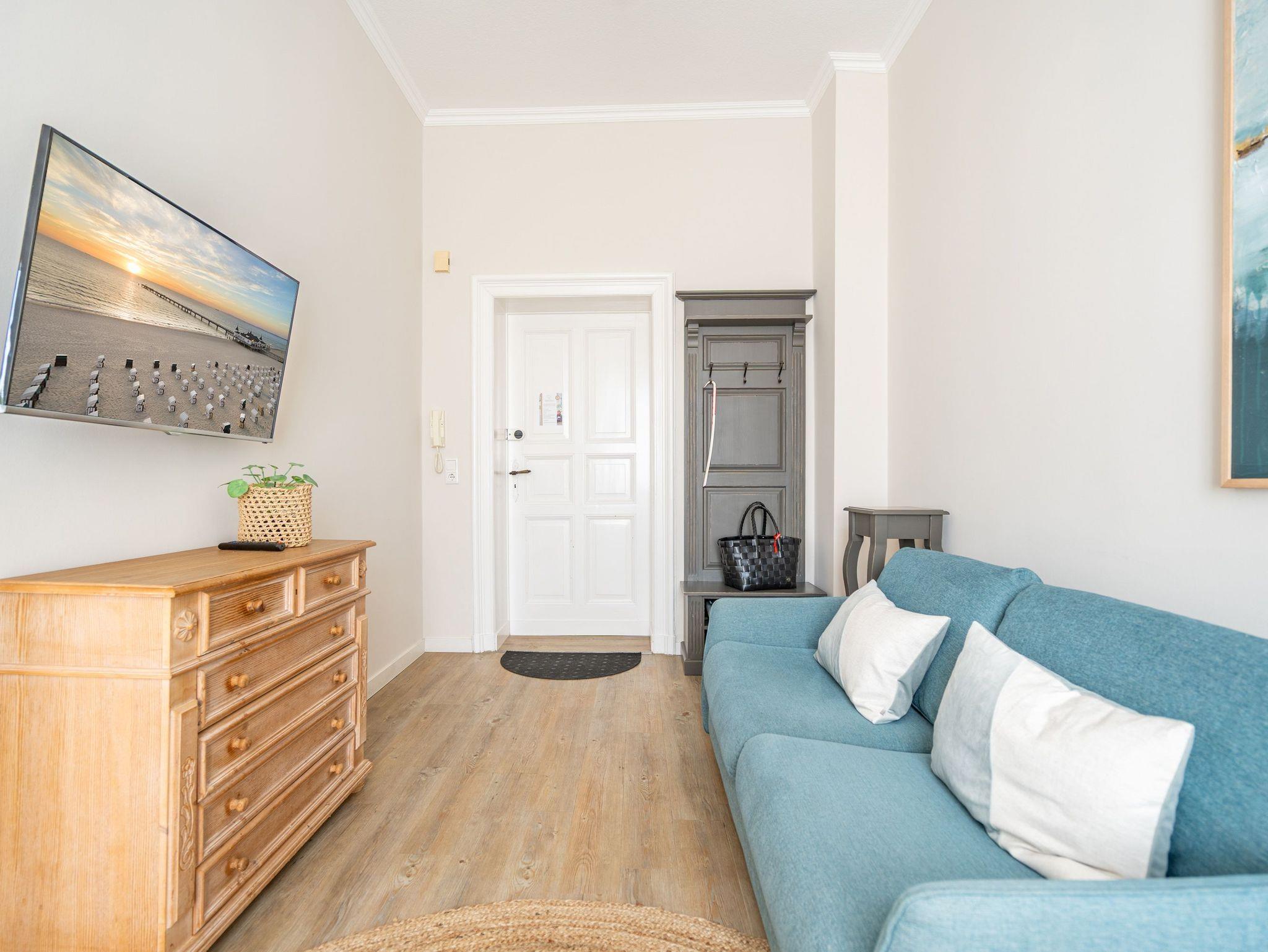 Eintreten und Wohlfühlen! Im 1. Obergeschoss der Villa Albertine befindet sich diese schön gestaltete 2-Raum-Ferienwohnung (35 qm) für 2 Personen und ein Kind ab 5 Jahre. Helle Räume und Farben und die modernen Möbel sorgen gleich für Urlaubslaune. Der gemütliche Wohnbereich mit Sofa (Aufbettung für die 3. Person) und Flat-TV lädt zum Entspannen ein. Durch die moderne Küche mit Essplatz gelangt man in das Schlafzimmer mit Boxspringdoppelbett (1,60m x 2,00m) [&] Flat-TV und das sich daran anschließende Duschbad. Der große Ostbalkon ist mit Sitzmöbeln ausgestattet und bietet teilweise Blick auf die Ostsee. Aufgrund der historischen, niedrigen Brüstungshöhe des Balkons ist das Appartement nicht für Kleinkinder unter 5 Jahren geeignet. Ein Pkw-Stellplatz Nr. 7 befindet sich auf dem Grundstück.