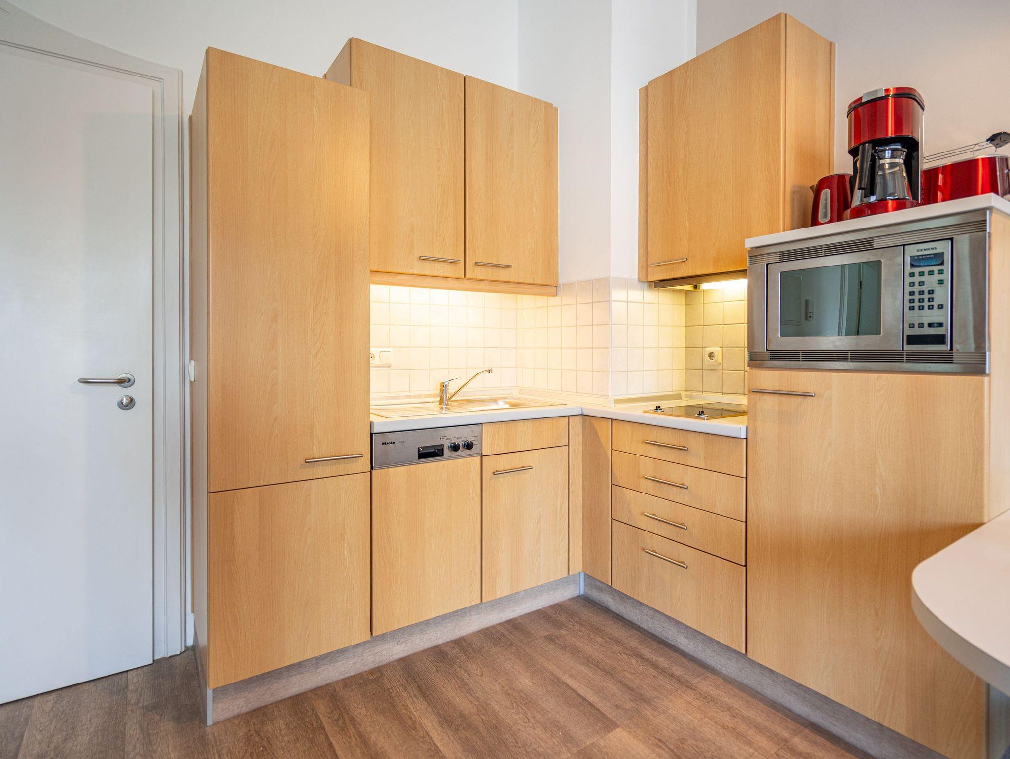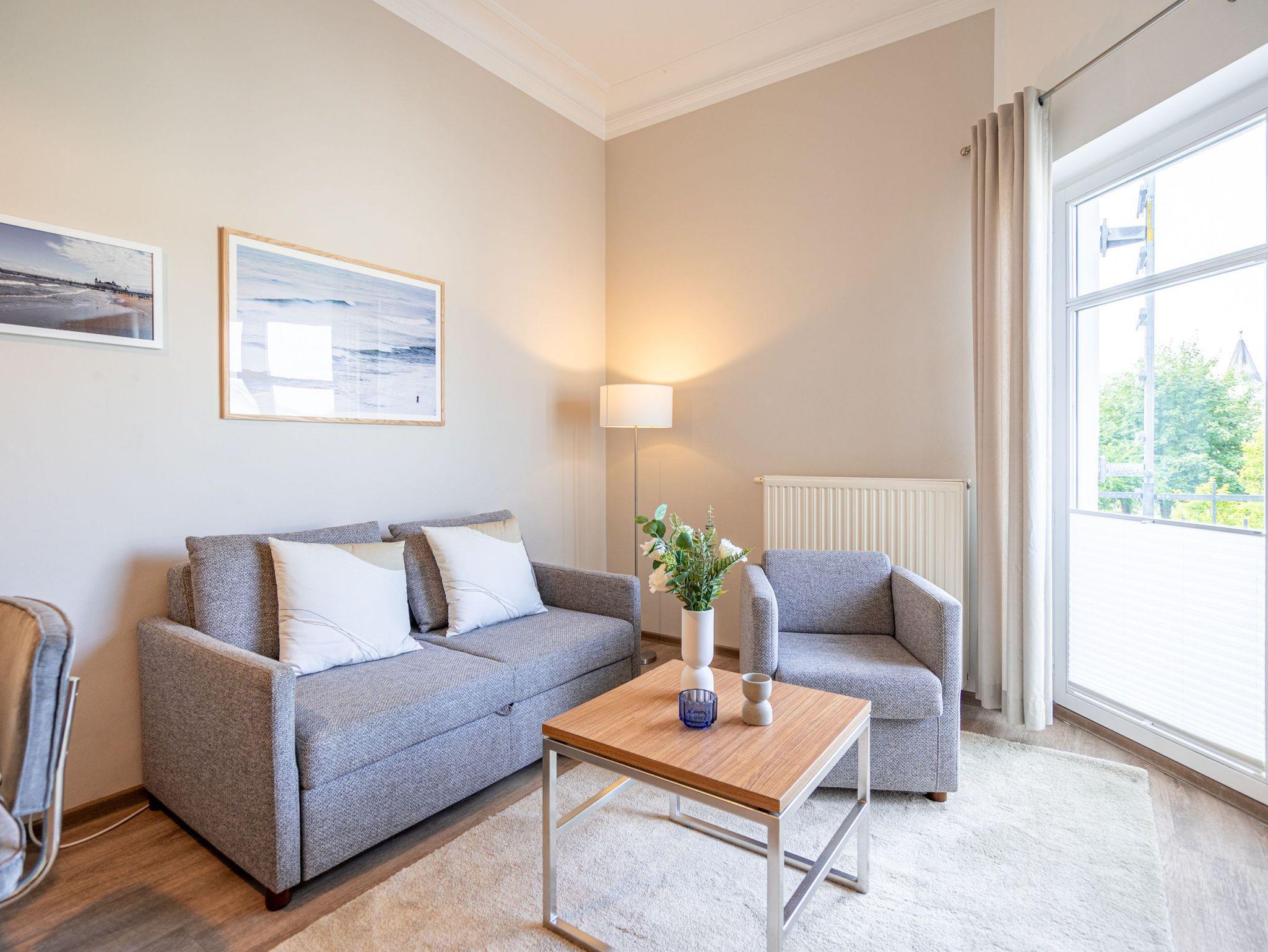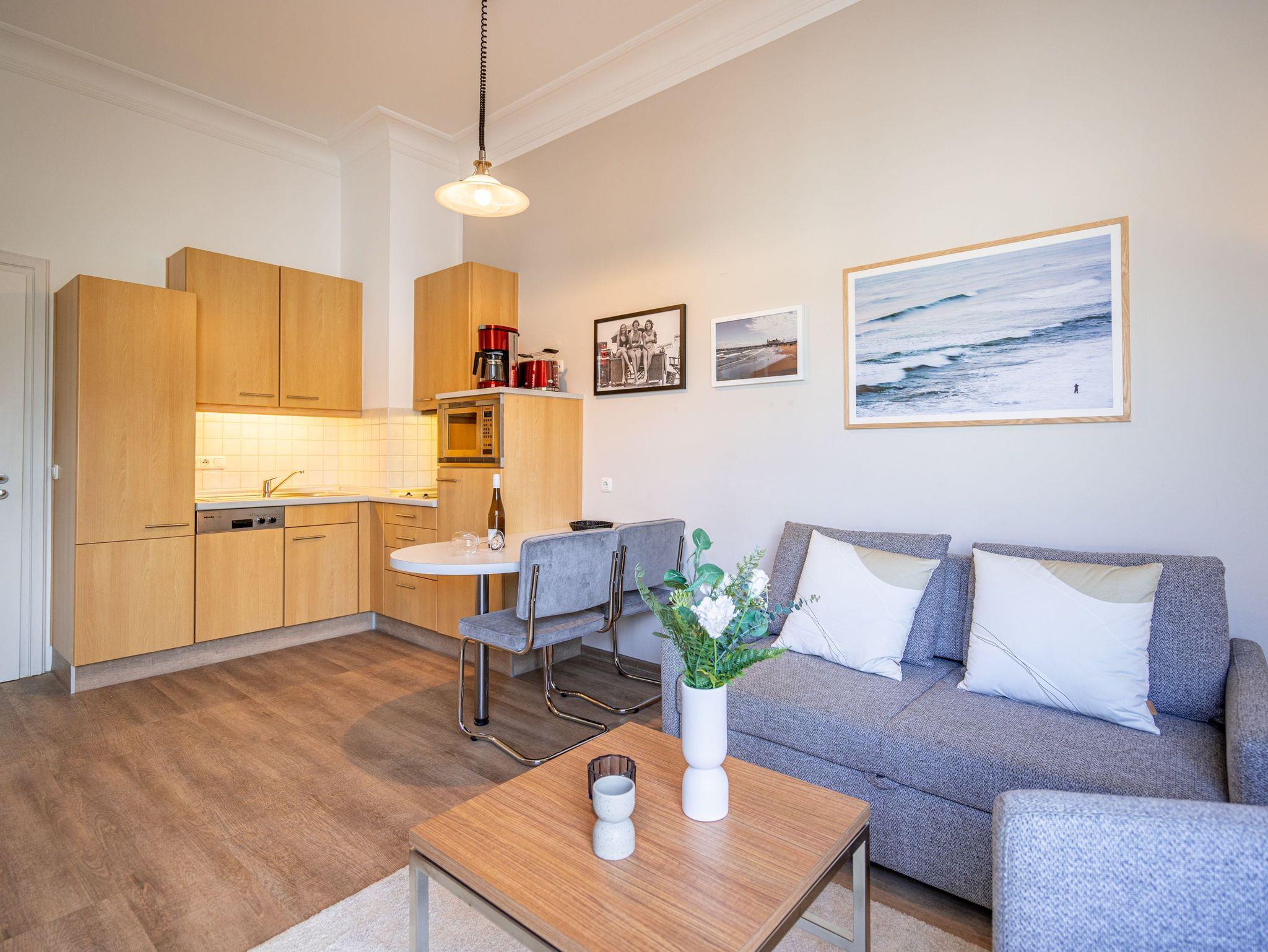 Die 2-Raum-Ferienwohnung Nr. C04 in der Villa Seedüwel bietet auf 38 qm Platz für zwei Personen und befindet sich im 1. Obergeschoss. Der offene Wohnbereich umfasst eine Küchenzeile mit einem 2-Platten-Cerankochfeld, einer Mikrowelle und einem Kühlschrank mit Gefrierfach. Ein Essplatz für zwei Personen, eine gemütliche Sitzgruppe und ein Flat-TV runden den Wohnbereich ab. Vom Wohnbereich aus gelangen Sie auf den ca. 4 qm großen West-Balkon, wo Sie entspannen können. Das Schlafzimmer ist mit einem Doppelbett (1,60 m x 2,00 m) und einem Kleiderschrank ausgestattet. Das innenliegende Bad verfügt über eine Dusche und ein Waschbecken, zudem gibt es ein separates WC. Ein Stellplatz in der Tiefgarage ( Einfahrthöhe 2,03m) des benachbarten Hauses „Strandterrasse“ ist für Sie reserviert. WLAN steht Ihnen kostenfrei zur Verfügung.