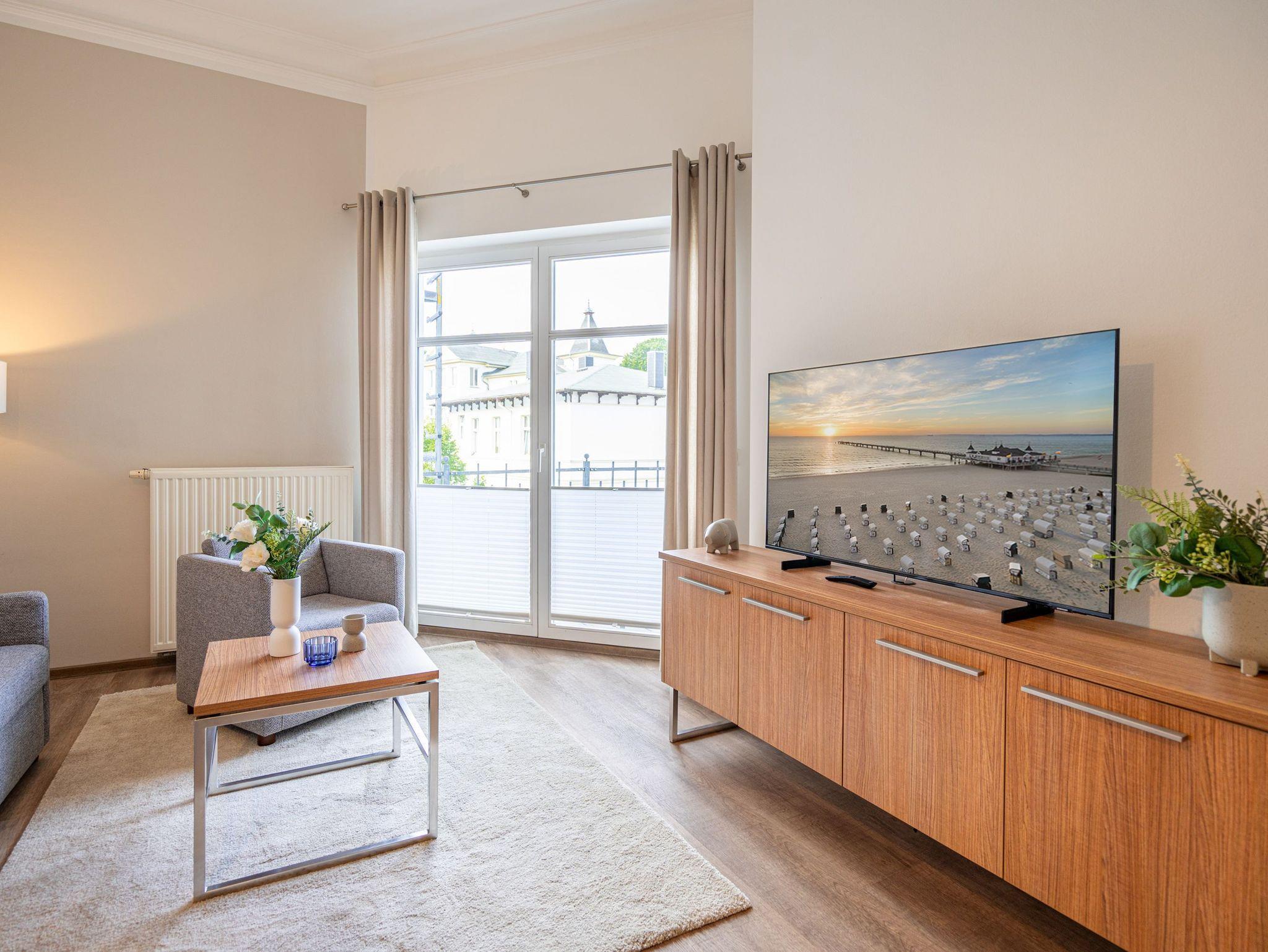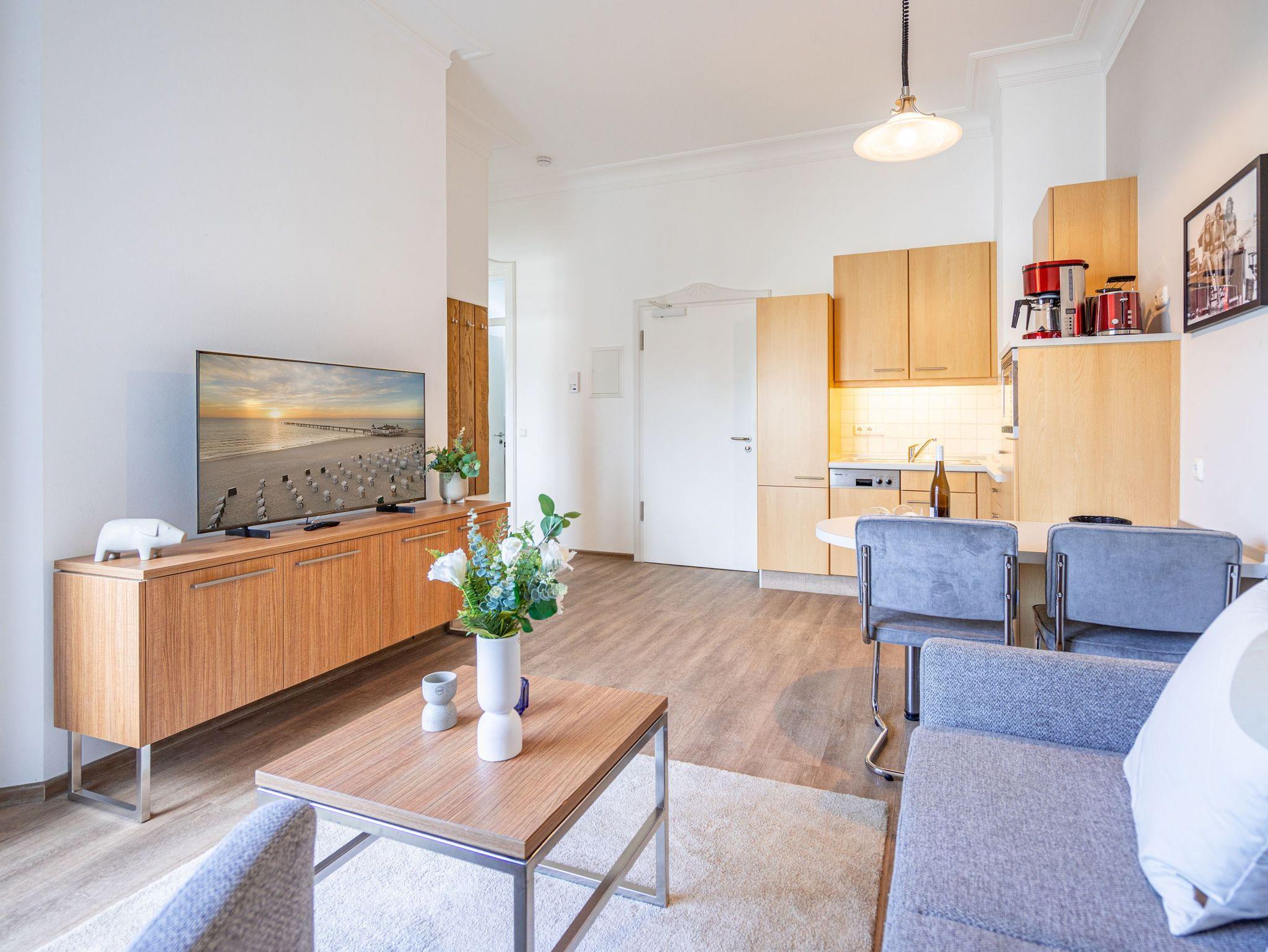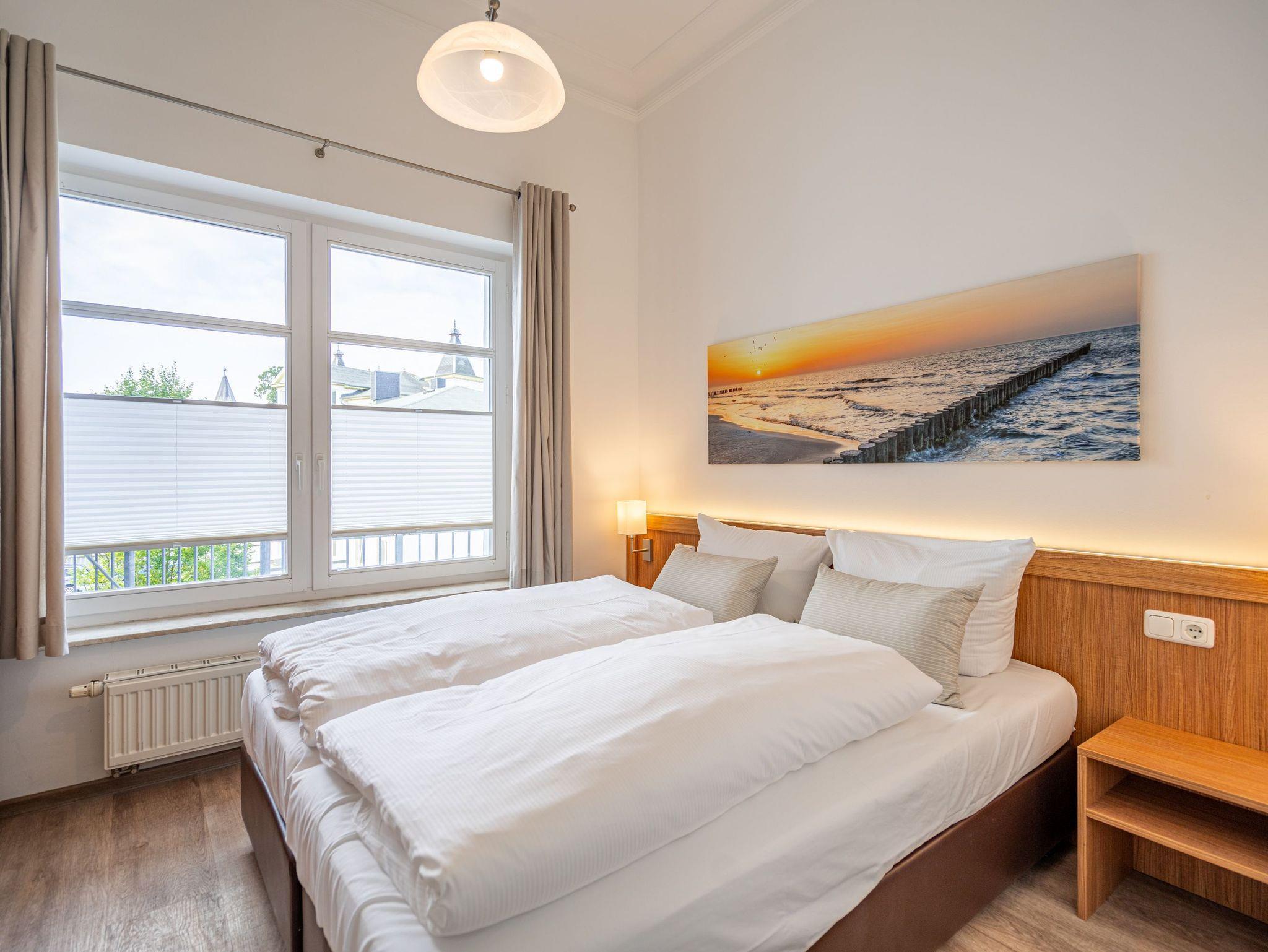 Die 2-Raum-Ferienwohnung Nr. C04 in der Villa Seedüwel bietet auf 38 qm Platz für zwei Personen und befindet sich im 1. Obergeschoss. Der offene Wohnbereich umfasst eine Küchenzeile mit einem 2-Platten-Cerankochfeld, einer Mikrowelle und einem Kühlschrank mit Gefrierfach. Ein Essplatz für zwei Personen, eine gemütliche Sitzgruppe und ein Flat-TV runden den Wohnbereich ab. Vom Wohnbereich aus gelangen Sie auf den ca. 4 qm großen West-Balkon, wo Sie entspannen können. Das Schlafzimmer ist mit einem Doppelbett (1,60 m x 2,00 m) und einem Kleiderschrank ausgestattet. Das innenliegende Bad verfügt über eine Dusche und ein Waschbecken, zudem gibt es ein separates WC. Ein Stellplatz in der Tiefgarage ( Einfahrthöhe 2,03m) des benachbarten Hauses „Strandterrasse“ ist für Sie reserviert. WLAN steht Ihnen kostenfrei zur Verfügung.