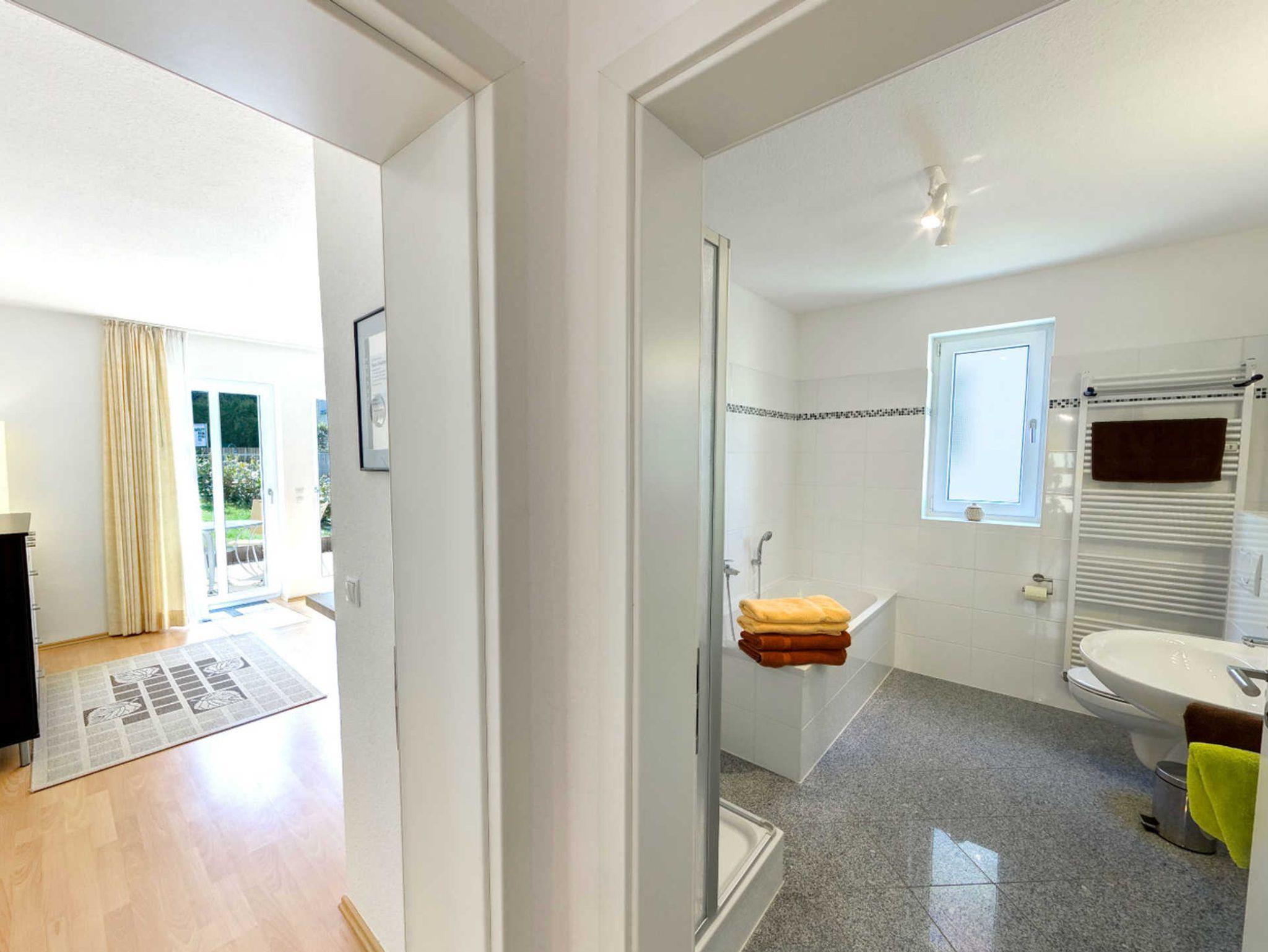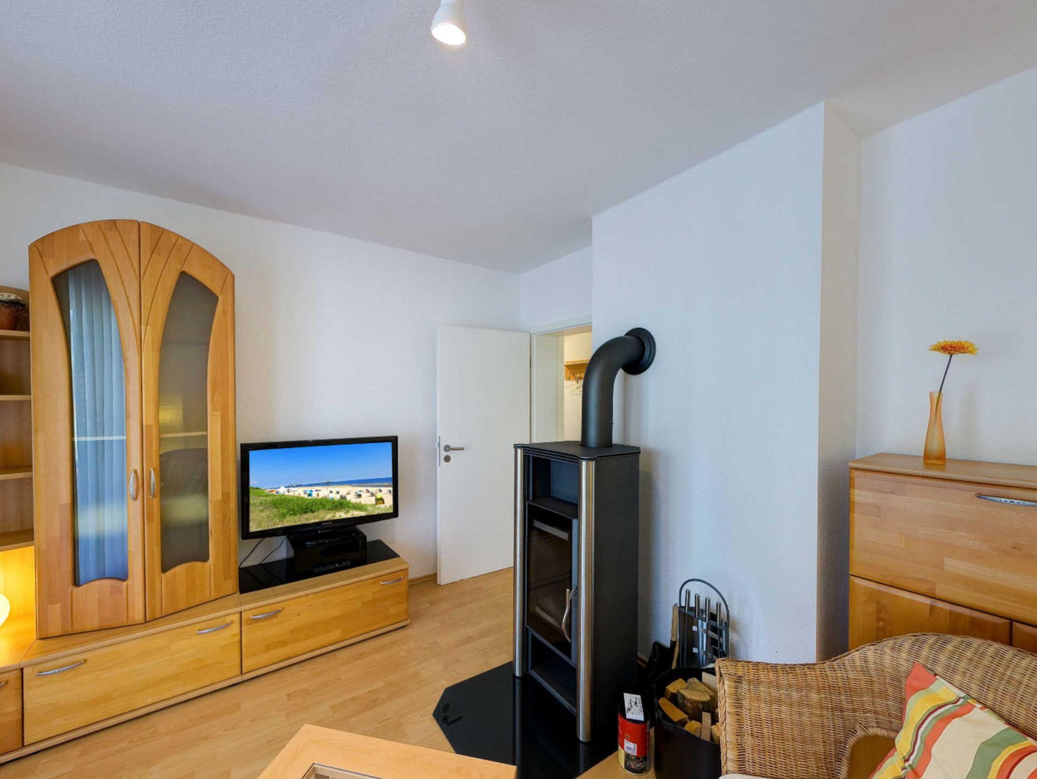 Die Wohnung mit einem separaten Eingang verfügt über zwei separate Schlafzimmer mit je einem Doppelbett sowie Fernseher sowie einem Wohnraum mit gemütlicher Sitzecke und einer ausziehbaren Couch, auf der eine Aufbettung für die 5. Person vorgenommen werden kann (Breite 1,40m). Highlight im Wohnbereich ist der dänische Eisen-Kaminofen für warme Stunden gerade in der kalten Jahreszeit sowie der möblierte Balkon zur Seeseite. In der separaten, voll ausgestatteten Küche mit Kaffeemaschine, Wasserkocher, Toaster, Mikrowelle, Backofen und Geschirrspüler befindet sich ein großer Essbereich mit ausreichend Platz. Zwei Bäder, eines mit Wanne und Dusche, eines mit Dusche bieten auch mit 5 Personen höchsten Wohnkomfort. Auf der möblierten Südterrasse können Sie bis Abends die Sonne genießen. Ein Garagenstellplatz steht Ihnen kostenfrei auf dem Grundstück zur Verfügung. Fahrräder können auf dem Grundstück abgestellt werden.