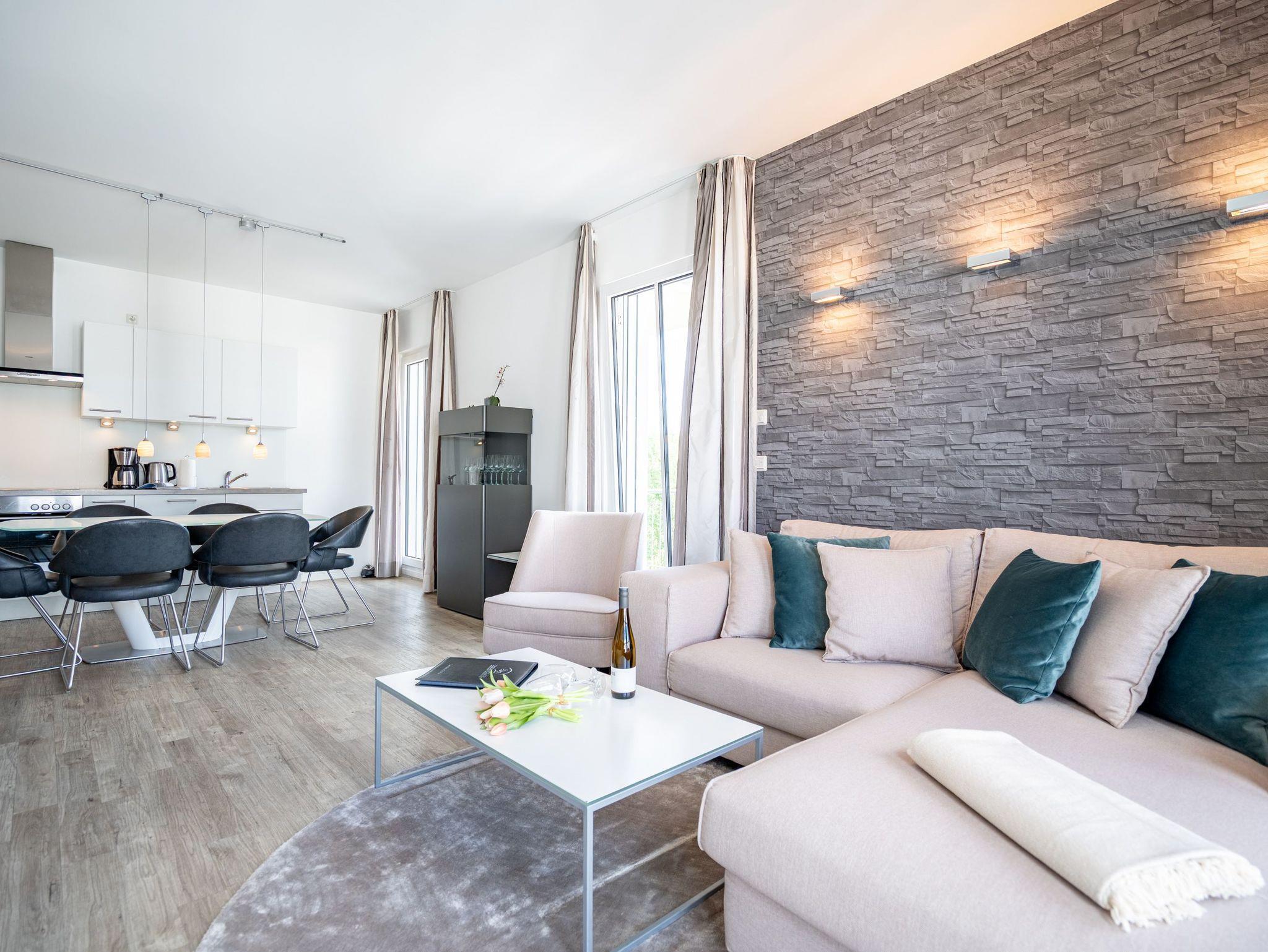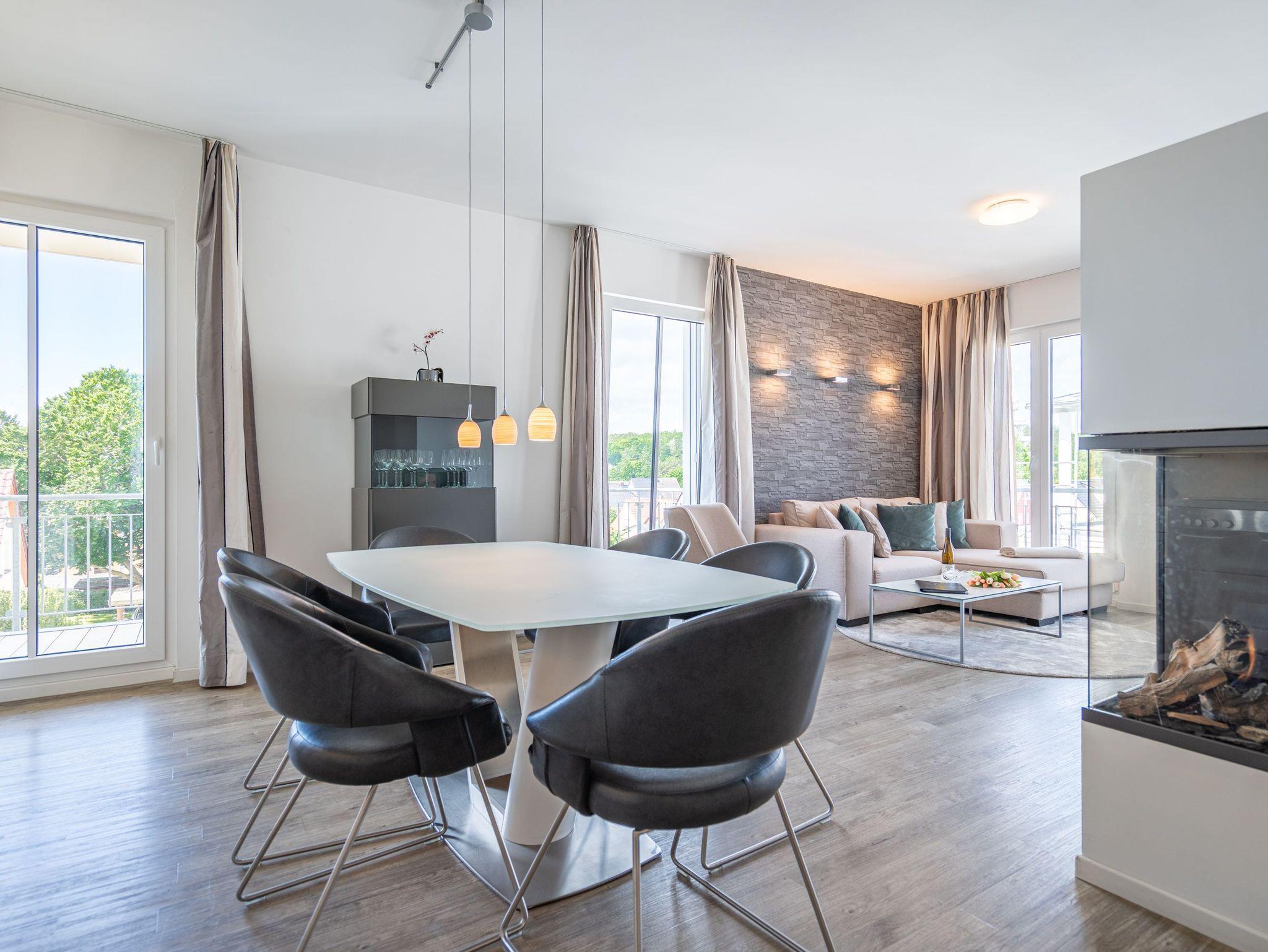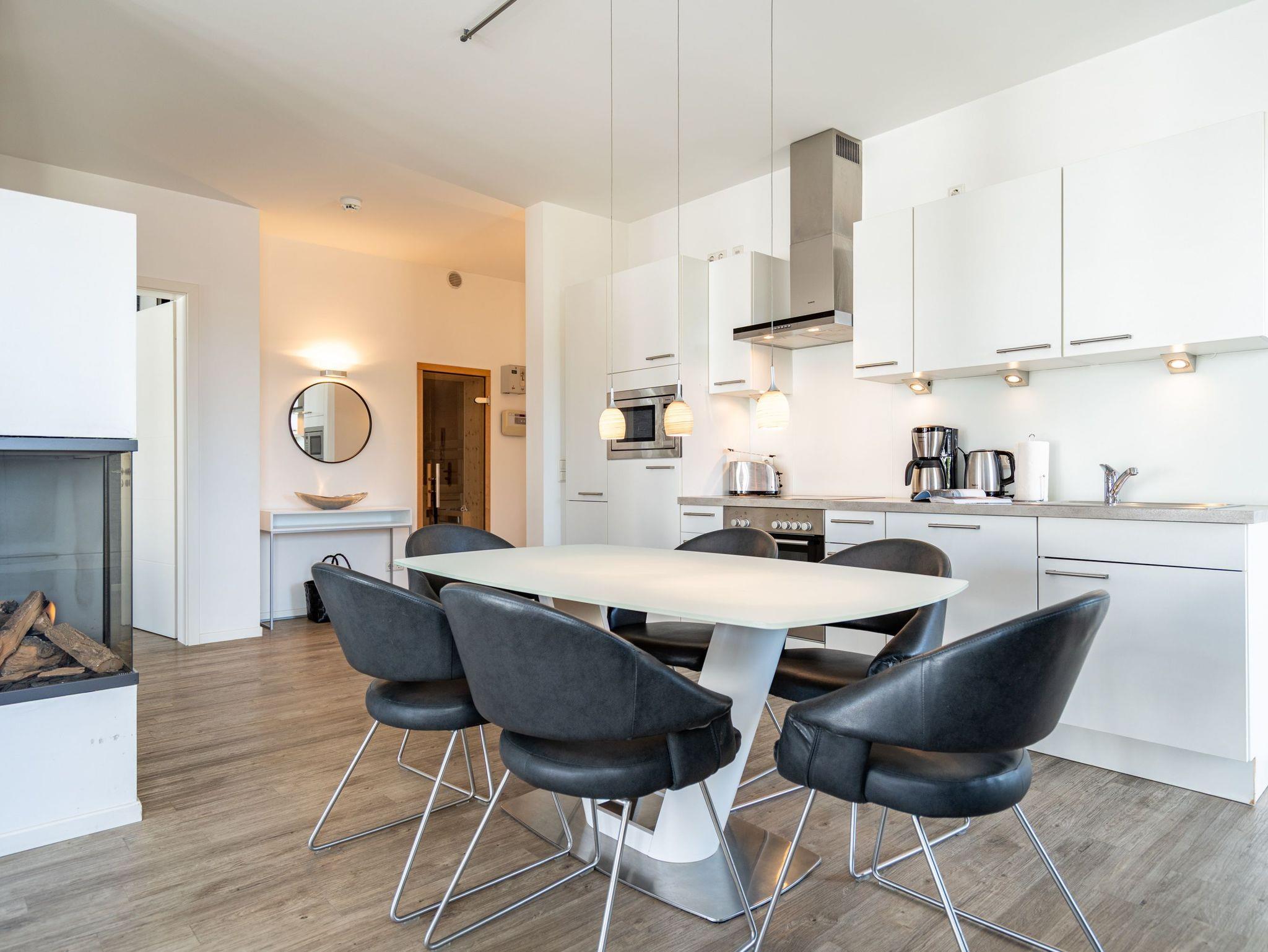 Modern und stylisch gestaltet - Willkommen in der Ferienwohnung 19 - im Südhaus des Dünenpalais. Das großzügige 2-Raum-Appartement (60 qm) für 2 Personen und ein Kleinkind (bis 3 Jahre im Kinderreisebett) wurde von einer Innenarchitektin designt und überzeugt nicht nur mit geschmackvoller Ausstattung, sondern auch zwei besonderen Highlights. Die wohnungseigene kleine Sauna ist gegen eine Gebühr von 2,00 EUR / Stunde zu nutzen. Und der per Fernbedienung zu bedienende Gaskamin sorgt nicht nur in der Winterzeit für gemütliche Stunden auf der Couch. Der Wohnbereich mit Sitzgruppe und offener Küche mit großem Esstisch, wird ergänzt durch ein großzügiges Schlafzimmer mit Doppelbett (und zusätzlichem TV) und ein modernes Bad mit Dusche und WC. Auf 2 schönen Balkonen mit Gartenmöbeln (1x Südseite/ 1x Westseite) genießen Sie bis in die Abendstunden hinein die Usedomer Sonne. 1 PKW-Stellplatz steht vor dem Haus zur Verfügung. Für Ihren Komfort sind die Betten bei der Anreise bezogen und ein Handtuchpaket liegt bereit. Auf Wunsch stellen wir ein Kinderreisebett (ohne Matratze [&] Bettzeug) und einen Kinderhochstuhl gegen einen Aufpreis zur Verfügung.