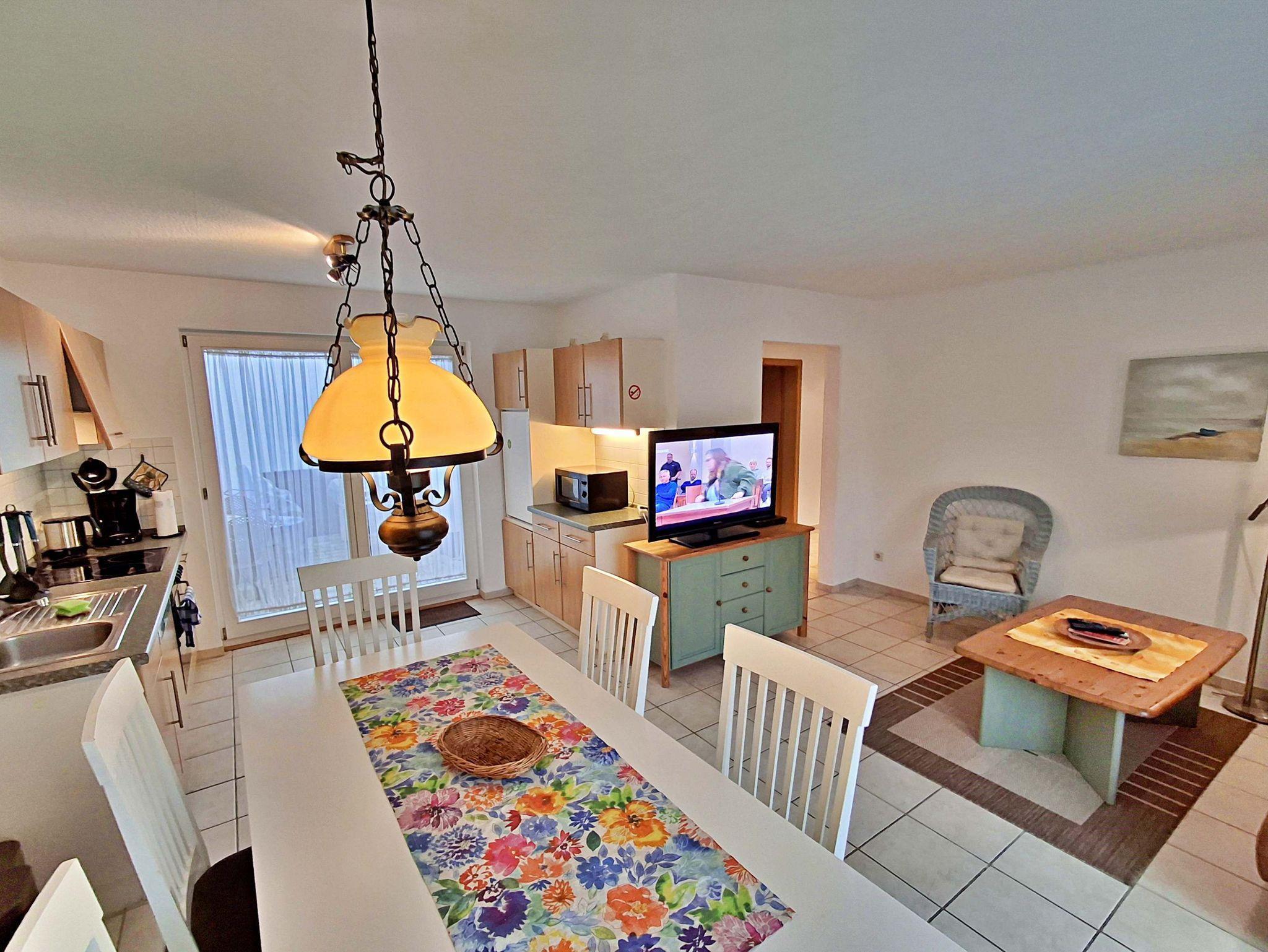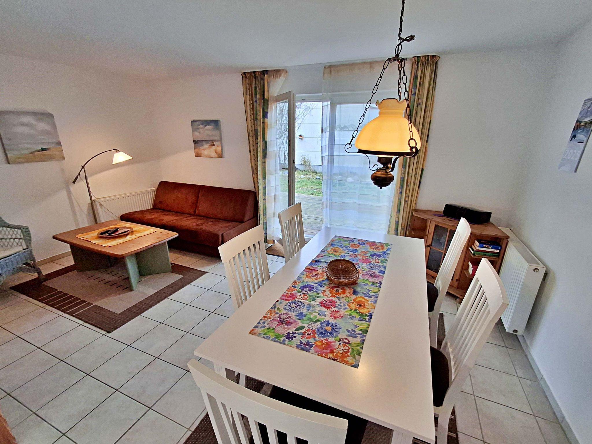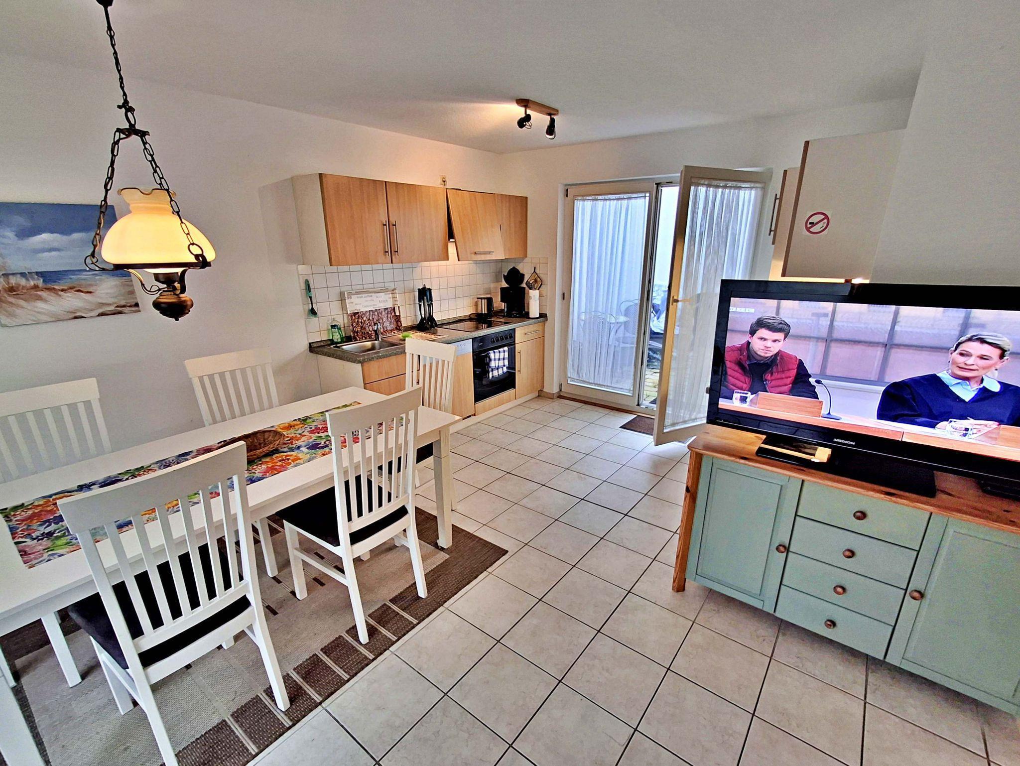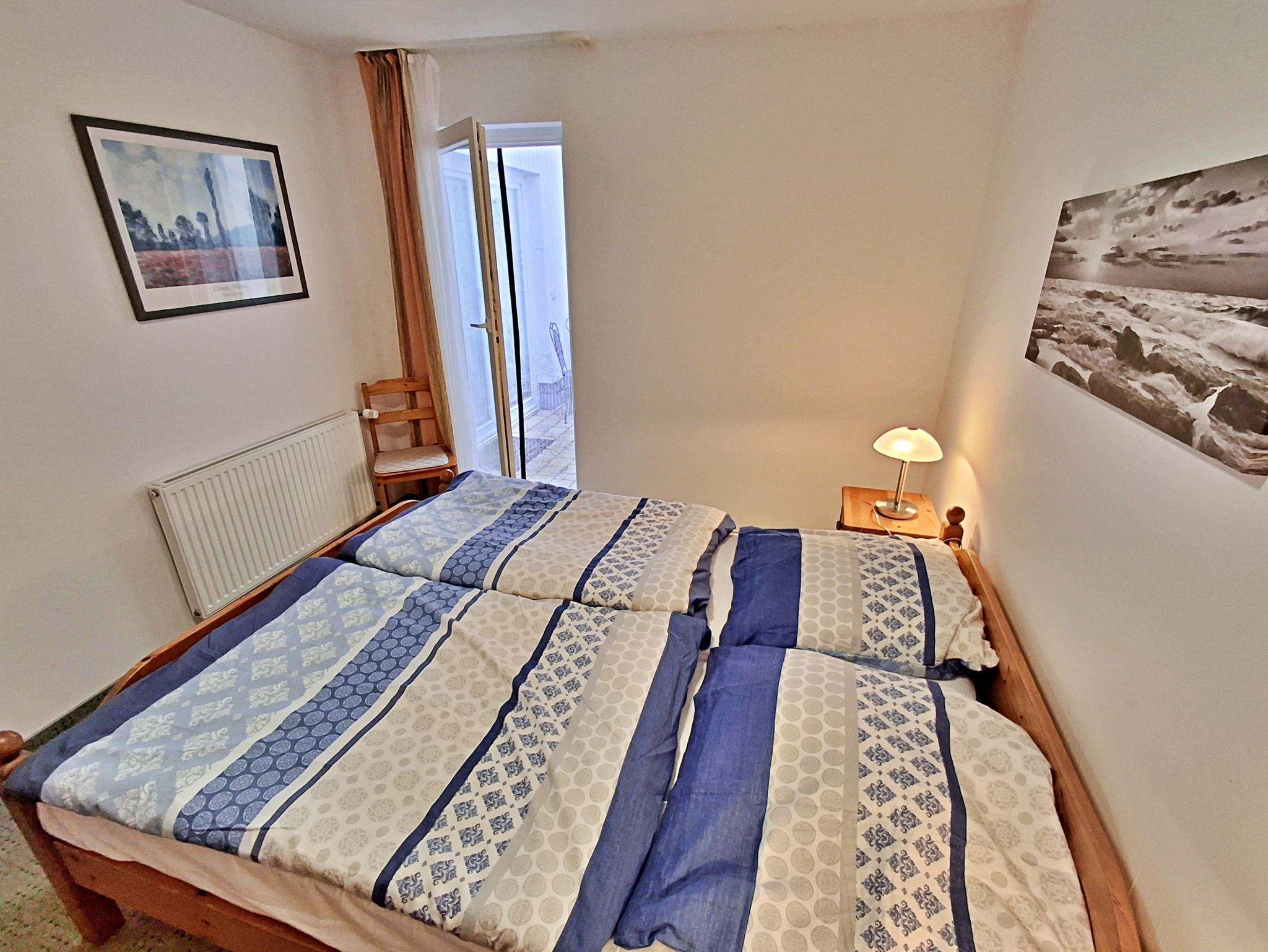 Diese moderne 65qm große 3-Raum-Ferienwohnung im Erdgeschoss verfügt über einen kombinierten Wohn- und Schlafraum (Schlafcouch für max. 1 Kind bis acht Jahre) mit Sat-TV und Radio, zwei Schlafzimmer mit jeweils einem Doppelbett sowie eine Küchenzeile mit 4-Platten-Ceranherd, Backofen, Spülmaschine, Mikrowelle, Kühlschrank mit Gefriermöglichkeit, Kaffeemaschine, Wasserkocher, Toaster und Geschirr. Das Badezimmer hat Dusche/WC und Fußbodenheizung. Die Terrasse, sowie die nnenliegende Terrasse mit Sitzmöbeln lädt zum Verweilen ein und vervollständigt die gemütliche Ausstattung der Wohnung. Ihren Pkw können Sie gern an der Ferienwohnung parken (nicht für Kleinbusse und Anhänger geeignet).