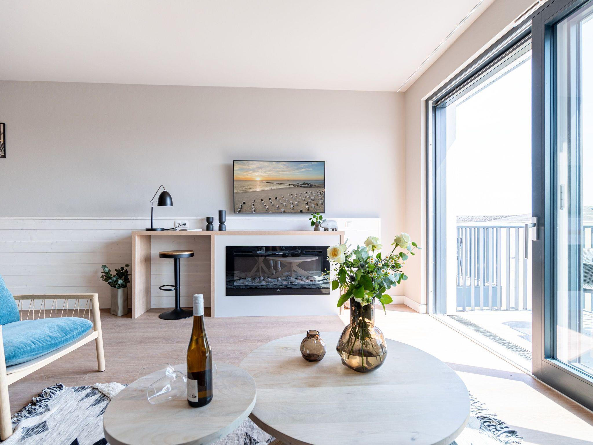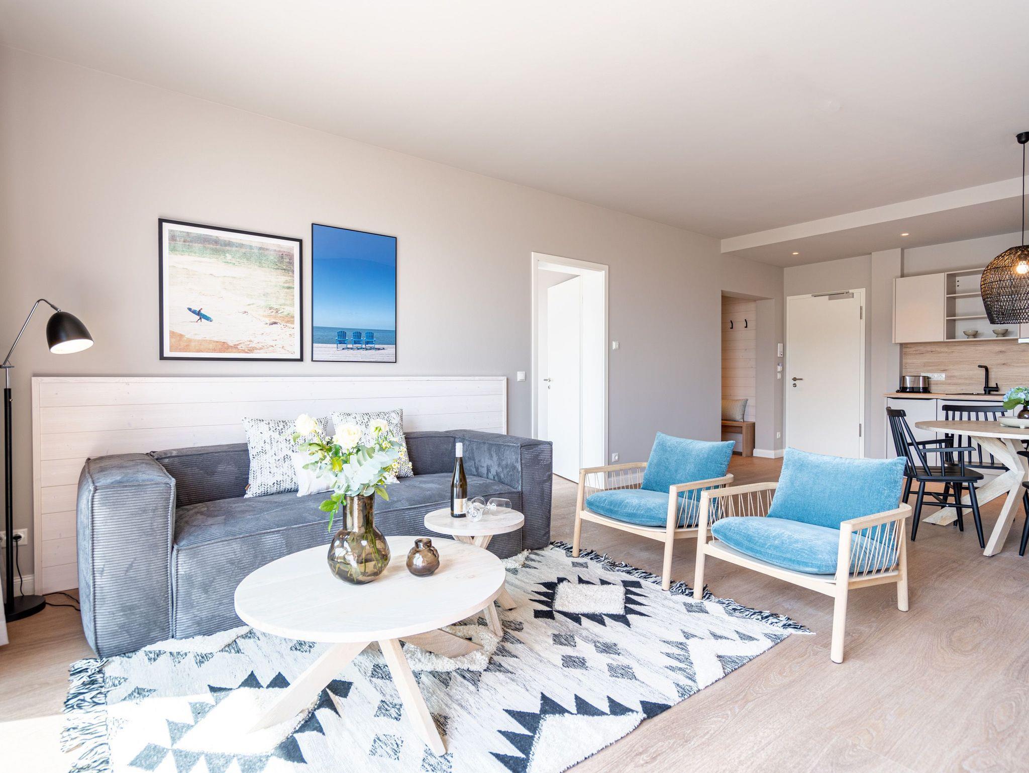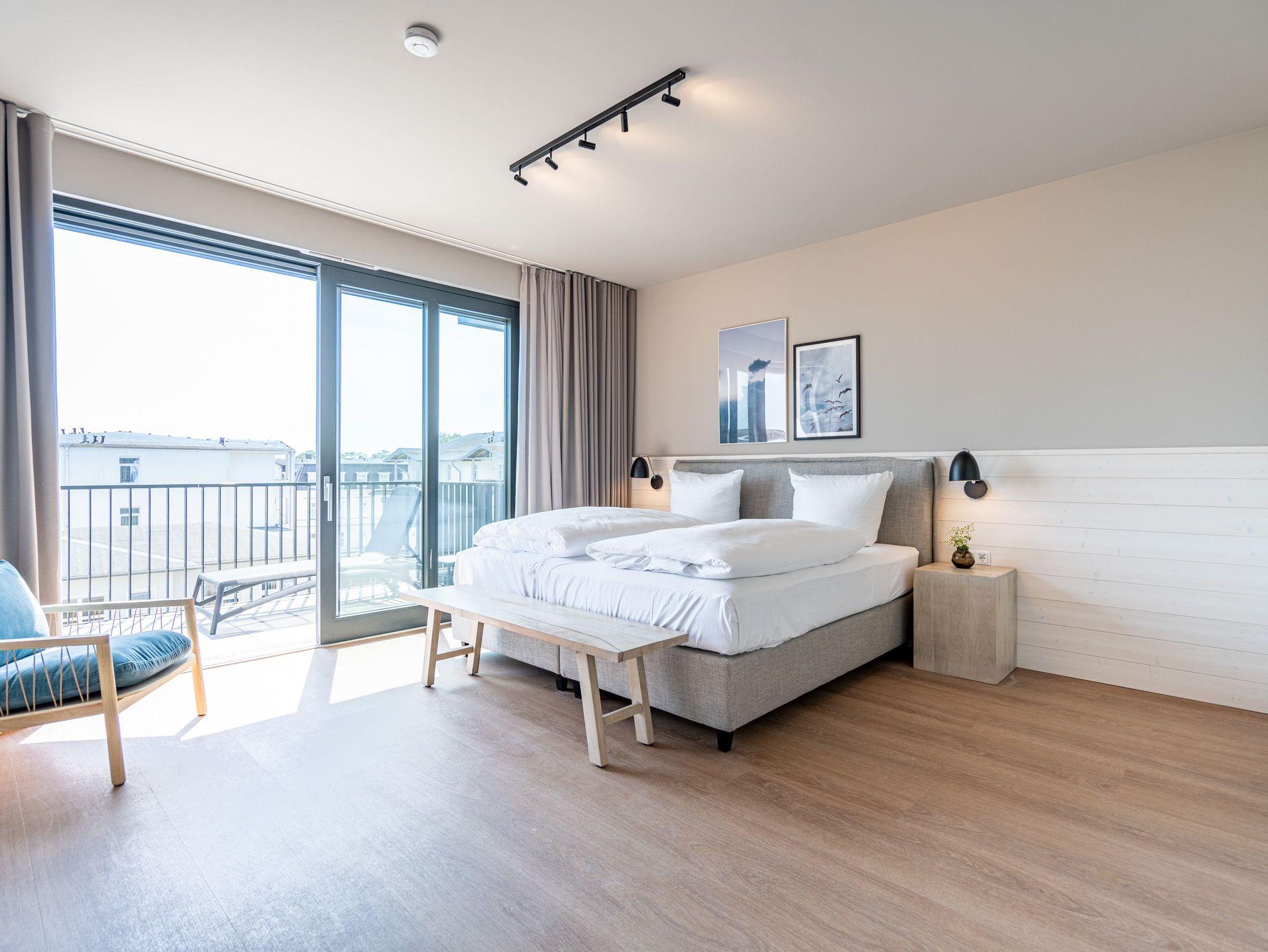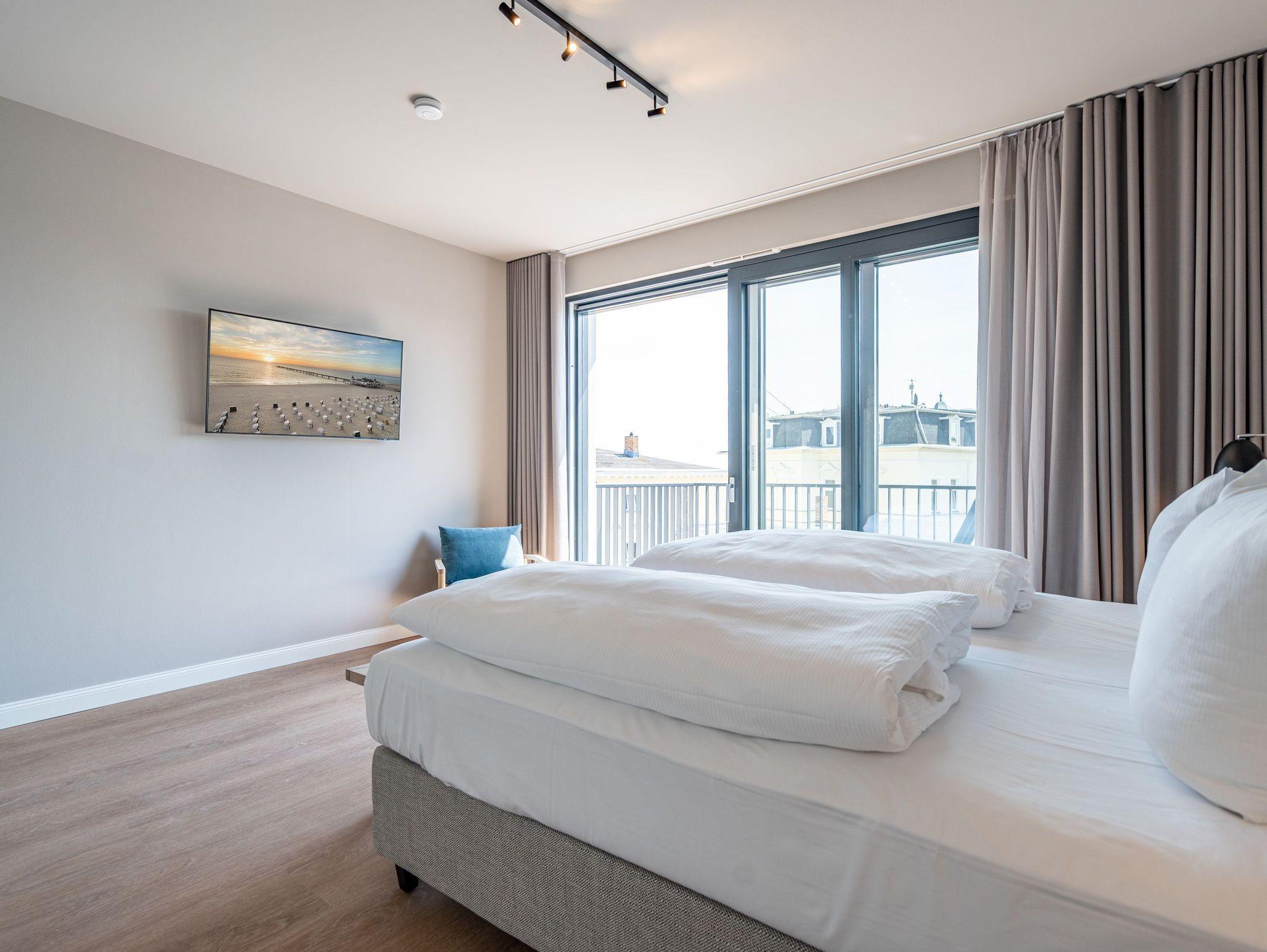 Herzlich willkommen im 2-Raum-Appartement B 3.3 (Haus B) in der 3. Etage der Strandterrasse. Die 77 Quadratmeter dieser großzügigen und modern eingerichteten Wohnung sind für 2 Personen und ein Kleinkind im Babybett ein idealer Rückzugsort direkt an der Ostsee. Sie lieben das Meer? Dann können Sie sich hier auf viel Meerblick freuen. Von gleich zwei Balkonen haben Sie aus dieser Wohnung eine herrliche Aussicht auf die Ostsee. Die Balkone sind nach Osten hin ausgerichtet. Dadurch können Sie schon morgens die Sonne aufgehen sehen. Genießen Sie die Zeit an der frischen Ostseeluft, ganz gleich, ob beim Essen am Balkontisch oder auf der Sonnenliege. Das Wohn-Esszimmer lädt zu entspannten Stunden auf der Sofa-Sitzgruppe ein. Ein Elektrokamin (ohne Wärmeabgabe) sorgt für eine romantische Atmosphäre und der große Flat-TV (50 Zoll) für spannende Unterhaltung. Kochen können Sie in der offenen Küche an hochwertigen Elektrogeräten. Vom Backofen über einen 3-Platten-Induktionsherd, eine Geschirrspülmaschine, Kaffeemaschine und sogar eine Nespresso-Kapselmaschine ist alles vorhanden, was man braucht. Essen können Sie am schönen, großen Tisch mit 4 Stühlen. Sie werden herrlich schlafen, denn das bequeme und äußerst große Boxspringdoppelbett (2,00m x 2,00m) im Schlafzimmer wird Ihnen zu himmlischen Träumen verhelfen. Zudem ist es mit einem geräumigen Kleiderschrank, einem festen Babybett und einem Flat-TV (50 Zoll) ausgestattet. Das Schlafzimmer verfügt über einen Zugang zu einem der beiden Balkone. Das Wohnzimmer gewährt Zutritt zum anderen Balkon. Das Badezimmer verfügt über eine Dusche, einen Waschtisch und ein WC. Als zusätzliches Wellness-Gimmick gibt es eine Infrarotsaunakabine. Zur Wohnung gehört in der Tiefgarage ein PKW-Stellplatz. Sie brauchen als nur noch Ankommen und Reinspringen in Ihre Meerauszeit. Viel Vergnügen!