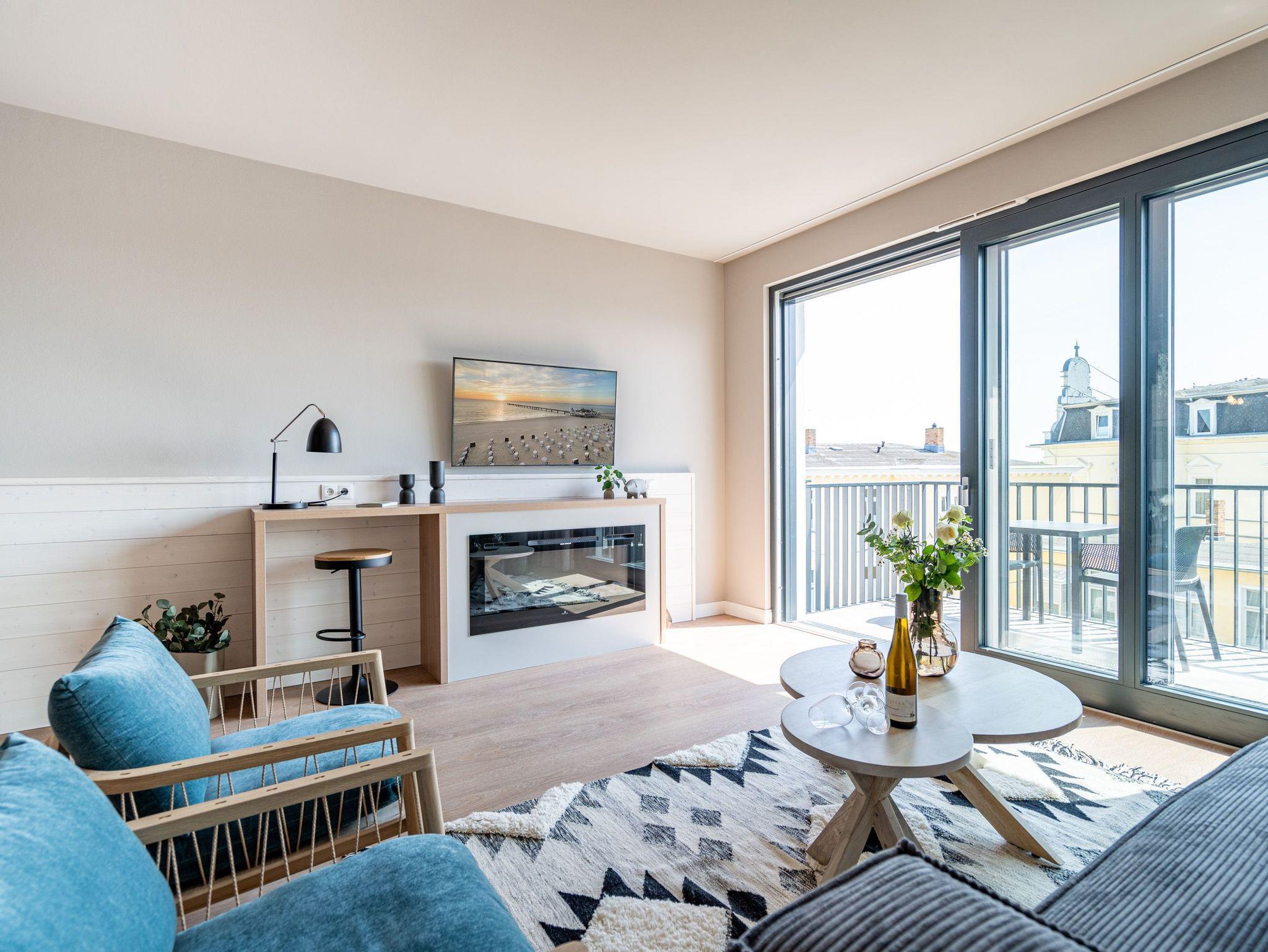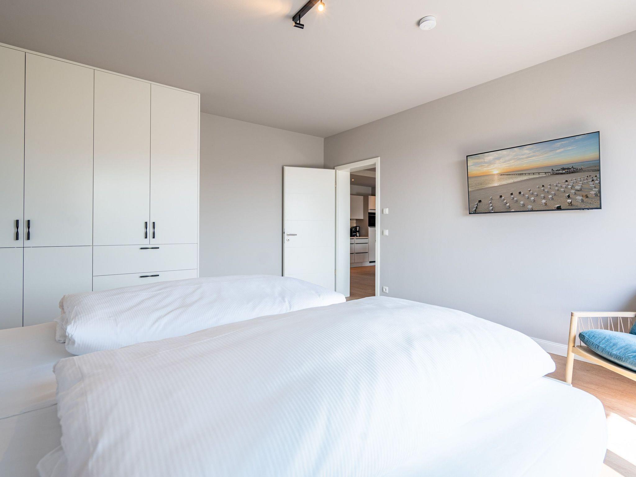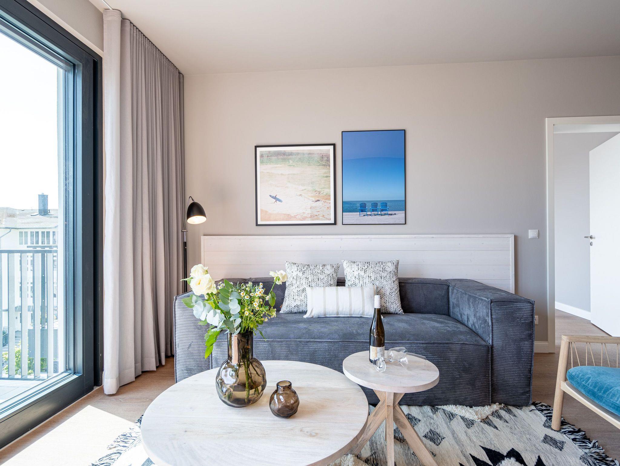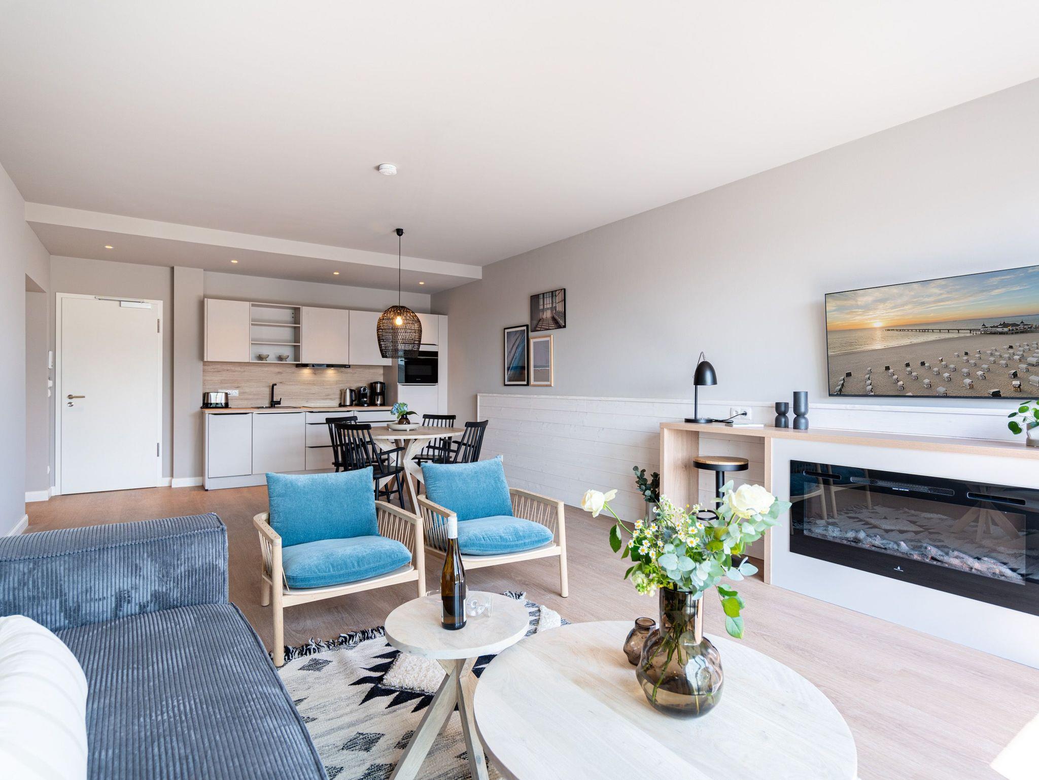Herzlich willkommen im 2-Raum-Appartement B 3.3 (Haus B) in der 3. Etage der Strandterrasse. Die 77 Quadratmeter dieser großzügigen und modern eingerichteten Wohnung sind für 2 Personen und ein Kleinkind im Babybett ein idealer Rückzugsort direkt an der Ostsee. Sie lieben das Meer? Dann können Sie sich hier auf viel Meerblick freuen. Von gleich zwei Balkonen haben Sie aus dieser Wohnung eine herrliche Aussicht auf die Ostsee. Die Balkone sind nach Osten hin ausgerichtet. Dadurch können Sie schon morgens die Sonne aufgehen sehen. Genießen Sie die Zeit an der frischen Ostseeluft, ganz gleich, ob beim Essen am Balkontisch oder auf der Sonnenliege. Das Wohn-Esszimmer lädt zu entspannten Stunden auf der Sofa-Sitzgruppe ein. Ein Elektrokamin (ohne Wärmeabgabe) sorgt für eine romantische Atmosphäre und der große Flat-TV (50 Zoll) für spannende Unterhaltung. Kochen können Sie in der offenen Küche an hochwertigen Elektrogeräten. Vom Backofen über einen 3-Platten-Induktionsherd, eine Geschirrspülmaschine, Kaffeemaschine und sogar eine Nespresso-Kapselmaschine ist alles vorhanden, was man braucht. Essen können Sie am schönen, großen Tisch mit 4 Stühlen. Sie werden herrlich schlafen, denn das bequeme und äußerst große Boxspringdoppelbett (2,00m x 2,00m) im Schlafzimmer wird Ihnen zu himmlischen Träumen verhelfen. Zudem ist es mit einem geräumigen Kleiderschrank, einem festen Babybett und einem Flat-TV (50 Zoll) ausgestattet. Das Schlafzimmer verfügt über einen Zugang zu einem der beiden Balkone. Das Wohnzimmer gewährt Zutritt zum anderen Balkon. Das Badezimmer verfügt über eine Dusche, einen Waschtisch und ein WC. Als zusätzliches Wellness-Gimmick gibt es eine Infrarotsaunakabine. Zur Wohnung gehört in der Tiefgarage ein PKW-Stellplatz. Sie brauchen als nur noch Ankommen und Reinspringen in Ihre Meerauszeit. Viel Vergnügen!
