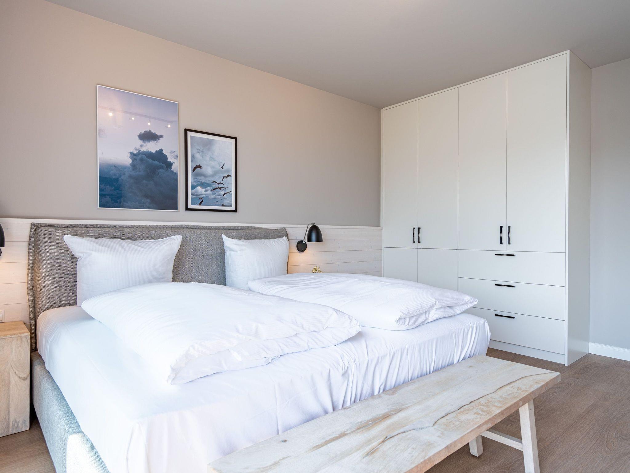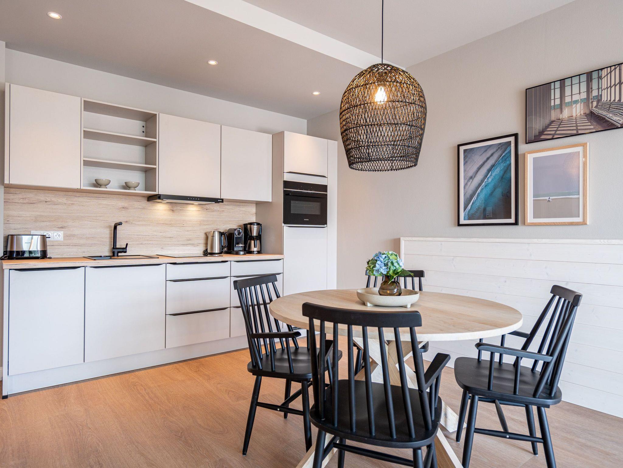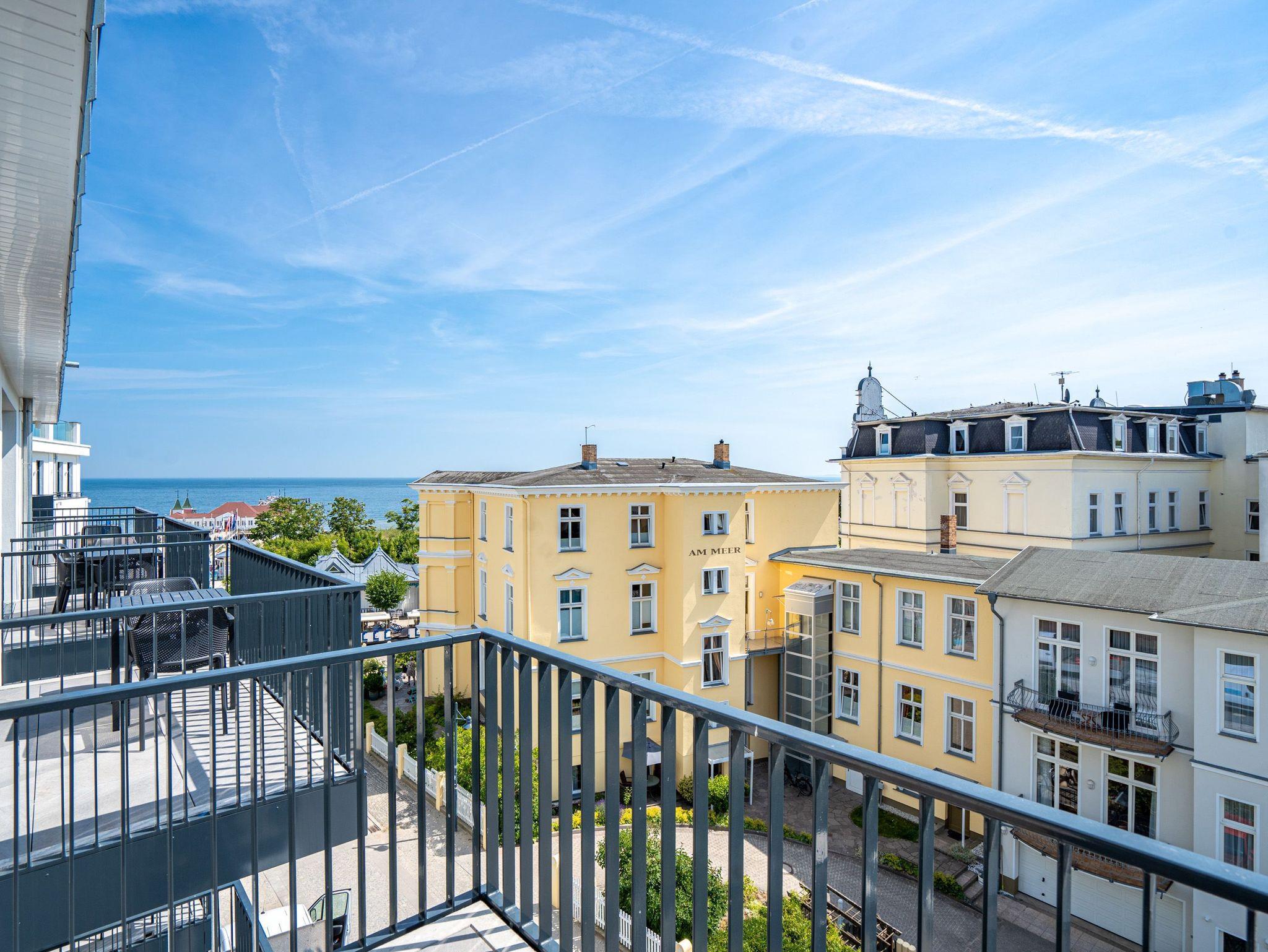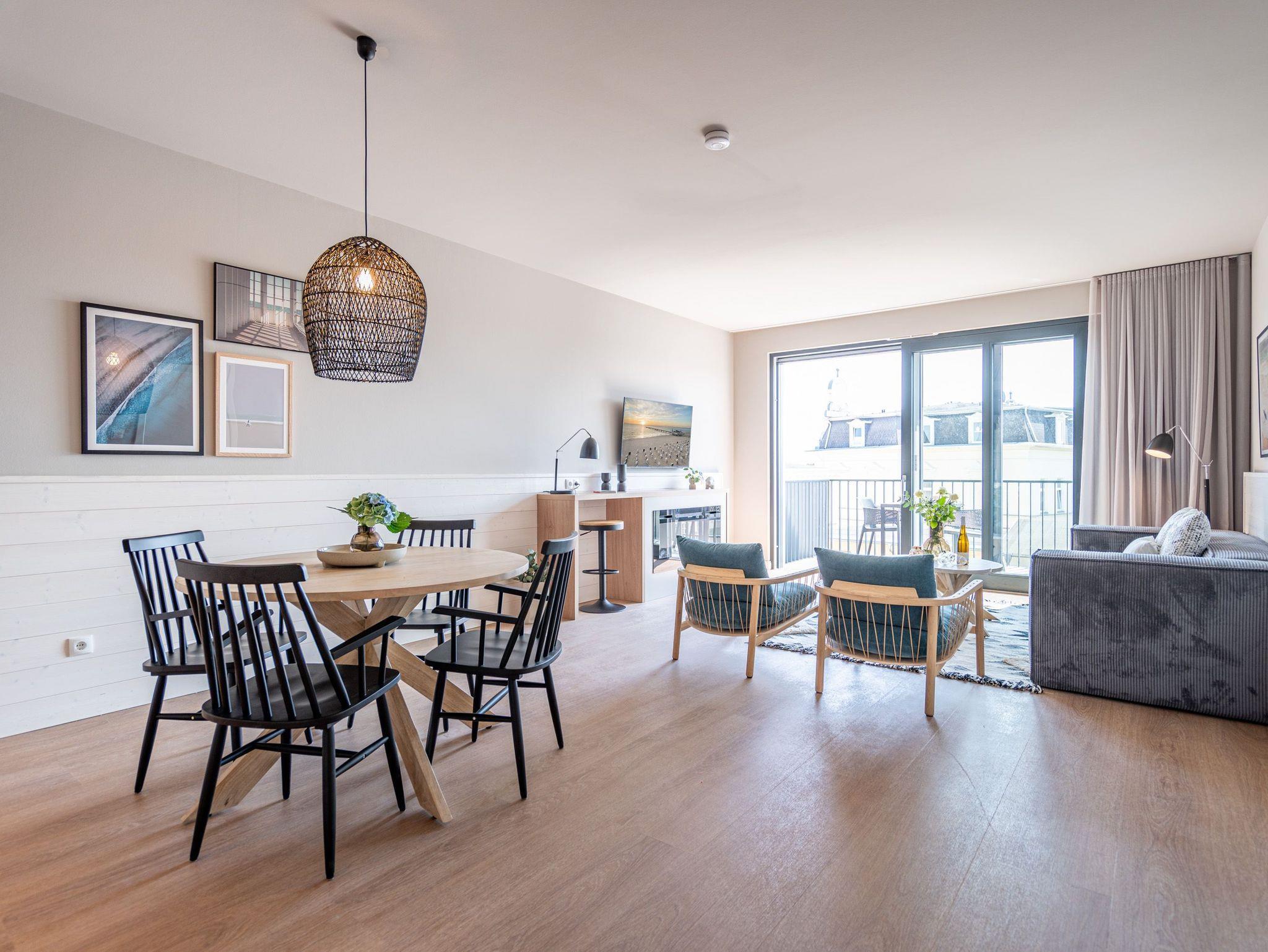 Herzlich willkommen im 2-Raum-Appartement B 3.3 (Haus B) in der 3. Etage der Strandterrasse. Die 77 Quadratmeter dieser großzügigen und modern eingerichteten Wohnung sind für 2 Personen und ein Kleinkind im Babybett ein idealer Rückzugsort direkt an der Ostsee. Sie lieben das Meer? Dann können Sie sich hier auf viel Meerblick freuen. Von gleich zwei Balkonen haben Sie aus dieser Wohnung eine herrliche Aussicht auf die Ostsee. Die Balkone sind nach Osten hin ausgerichtet. Dadurch können Sie schon morgens die Sonne aufgehen sehen. Genießen Sie die Zeit an der frischen Ostseeluft, ganz gleich, ob beim Essen am Balkontisch oder auf der Sonnenliege. Das Wohn-Esszimmer lädt zu entspannten Stunden auf der Sofa-Sitzgruppe ein. Ein Elektrokamin (ohne Wärmeabgabe) sorgt für eine romantische Atmosphäre und der große Flat-TV (50 Zoll) für spannende Unterhaltung. Kochen können Sie in der offenen Küche an hochwertigen Elektrogeräten. Vom Backofen über einen 3-Platten-Induktionsherd, eine Geschirrspülmaschine, Kaffeemaschine und sogar eine Nespresso-Kapselmaschine ist alles vorhanden, was man braucht. Essen können Sie am schönen, großen Tisch mit 4 Stühlen. Sie werden herrlich schlafen, denn das bequeme und äußerst große Boxspringdoppelbett (2,00m x 2,00m) im Schlafzimmer wird Ihnen zu himmlischen Träumen verhelfen. Zudem ist es mit einem geräumigen Kleiderschrank, einem festen Babybett und einem Flat-TV (50 Zoll) ausgestattet. Das Schlafzimmer verfügt über einen Zugang zu einem der beiden Balkone. Das Wohnzimmer gewährt Zutritt zum anderen Balkon. Das Badezimmer verfügt über eine Dusche, einen Waschtisch und ein WC. Als zusätzliches Wellness-Gimmick gibt es eine Infrarotsaunakabine. Zur Wohnung gehört in der Tiefgarage ein PKW-Stellplatz. Sie brauchen als nur noch Ankommen und Reinspringen in Ihre Meerauszeit. Viel Vergnügen!