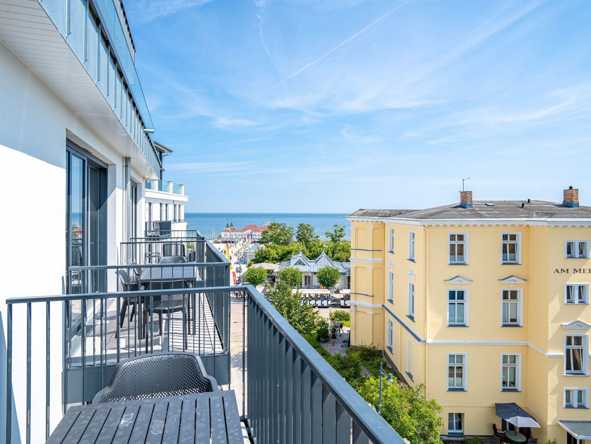Die 2024 fertig gestellte Strandterrasse liegt direkt an der belebten Strandpromenade und bietet einen einzigartigen Ausblick auf die Grand Dame der historischen Seebrücken sowie die historische Konzertmuschel, einem beliebten Treffpunkt für Kunst und Kultur. Dahinter liegt die Ostsee ? ein Panorama, das zu den schönsten in den Kaiserbädern gehört. Es ist wie das Abtauchen in eine andere Zeit. In eine Zeit, in der man mit Stock, Sonnenschirm und Hut fürs ?Sehen und gesehen werden? über die Promenade schlenderte; aber auch in eine Zeit, in der ? damals wie heute ? Zeit einmal für eine kurze Weile keine Rolle spielt. Weil man angekommen ist im Loslassen, Entspannen und Genießen. Es ist dieser besondere Geruch nach Meeresluft und Freiheit, der in Erinnerung bleibt. Dazu die Bilder, die man mitnimmt. Von langen Strandspaziergängen, vom Lachen in fröhlich schäumenden Ostseewellen, von der Zeit in einem wunderschönen Urlaubsdomizil. Denn genau das ist die Strandterrasse mit ihren 56 modernen und exklusiven Ferienappartements direkt gegenüber der Ahlbecker Seebrücke. Die Ein-, Zwei- oder Dreizimmerwohnungen ? zwischen 40 und 70 Quadratmeter groß ? sind von einer Innenarchitektin gemeinsam mit unserem Erfahrungsschatz an Gästewünschen mit viel Liebe zum Detail und ganz individuell konzipiert worden. Entspannung und Wohlfühlen stehen an erster Stelle. Alles ist aufeinander abgestimmt und sorgt für eine gemütliche Atmosphäre. Wählen Sie zwischen einem Domizil in einem hellen, sandfarbenen Designkonzept oder einem Appartement mit anthrazitfarbenen Farbakzenten. Alle Appartements verfügen gleichermaßen über eine stilvolle und komfortable Einrichtung, die passgenau angefertigt worden ist, sowie über moderne Küchen und Bäder. Jedem Schlafzimmer ist ein eigenes Bad mit Dusche zugeordnet (außer App. B4.5). Die Appartements besitzen fast alle einen Balkon ? viele schauen sogar zur Ostsee hinaus. Die meisten Feriendomizile haben einen Elektrokamin und Infrarotsaunen. Im Erdgeschoss befindet sich ein separater Gemeinschaftsraum für Fahrräder. Außerdem besteht die Möglichkeit, im Gemeinschaftswaschraum 2 Waschmaschinen [&] Trockner zu nutzen. Ergänzt wird das Angebot durch eine Gemeinschaftssauna, die täglich von 11:00 bis 22:00 Uhr nutzbar ist. In der Tiefgarage (Einfahrtshöhe 2,03 Meter) steht für jede Wohnung 1 Pkw-Stellplatz zur Verfügung. Ist alles zur Zufriedenheit untergebracht? Dann kann der Urlaub ja beginnen. Und beim Blick vom Balkon über die Ostsee treffen sich zum Sonnenaufgang das Heute und das Damals. Gelassenheit legt sich beim Gang hinunter an den Strand auf die Seele. Jetzt darf die Zeit stehenbleiben.