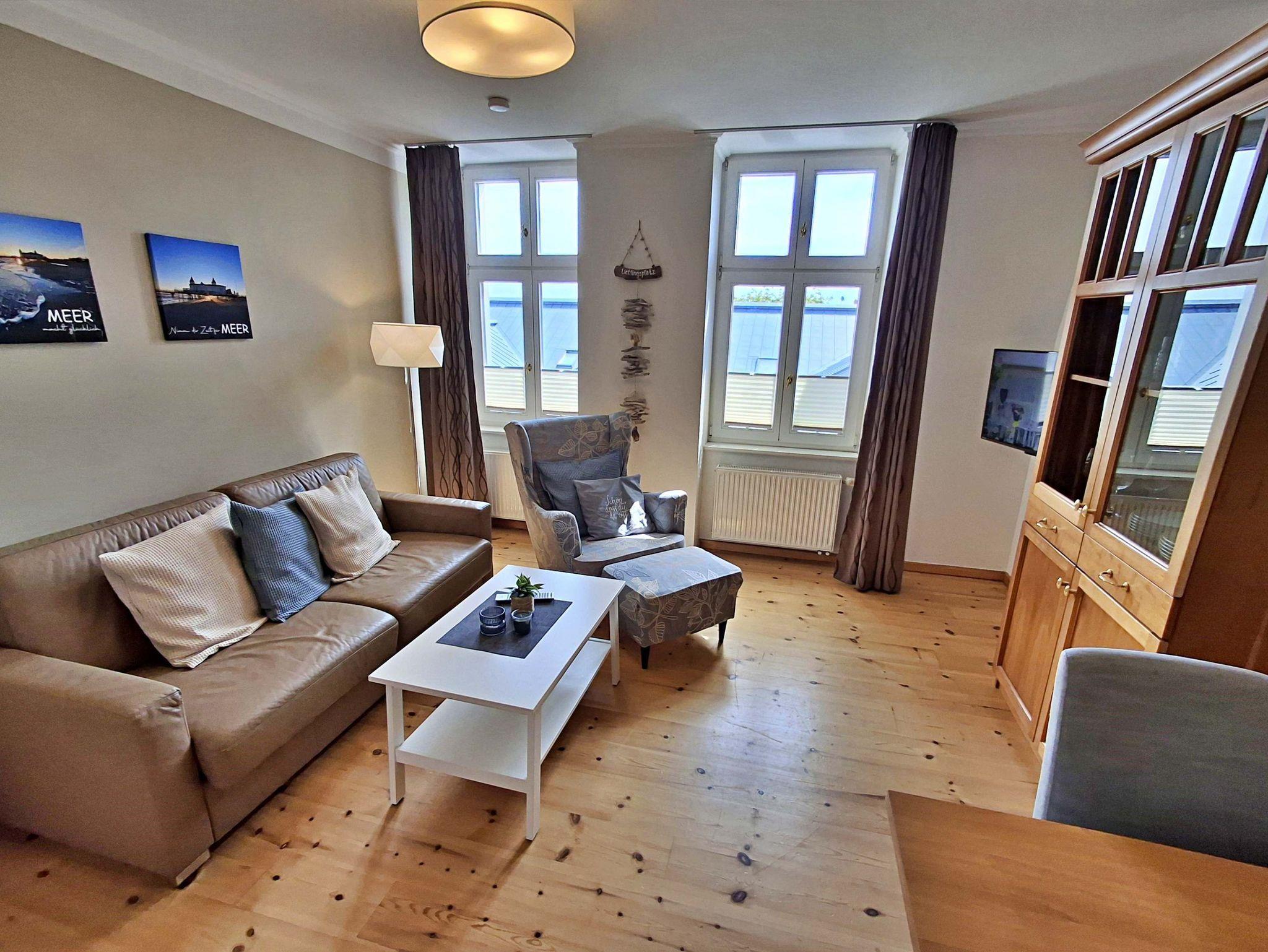 Die charmante 2-Zimmer-Wohnung Ahrenshoop im 2. Obergeschoss für max. 3 Erwachsene und 1 Kleinkind bis 3 Jahre befindet sich in der stilvoll restaurierten Villa Ahlbeck - nur wenige Schritte von der Promenade und dem Strand entfernt. Im hellen Wohnbereich befinden sich neben einer gemütlichen Couch (Aufbettungsmöglichkeit für 2 Personen) auch ein Esstisch mit 4 Stühlen, der genügend Platz für 4 Personen bietet sowie ein Sessel mit passendem Fußhocker. Die moderne Küchenzeile mit Ceranherd, Backofen, Geschirrspüler, Mikrowelle, Kaffeemaschine, Wasserkocher und Toaster lässt keine Wünsche offen. Für die Unterhaltung sorgen ein Smart-TV und kostenfreies W-LAN. Das Schlafzimmer verfügt über ein Doppelbett und das Badezimmer hat DU/WC.