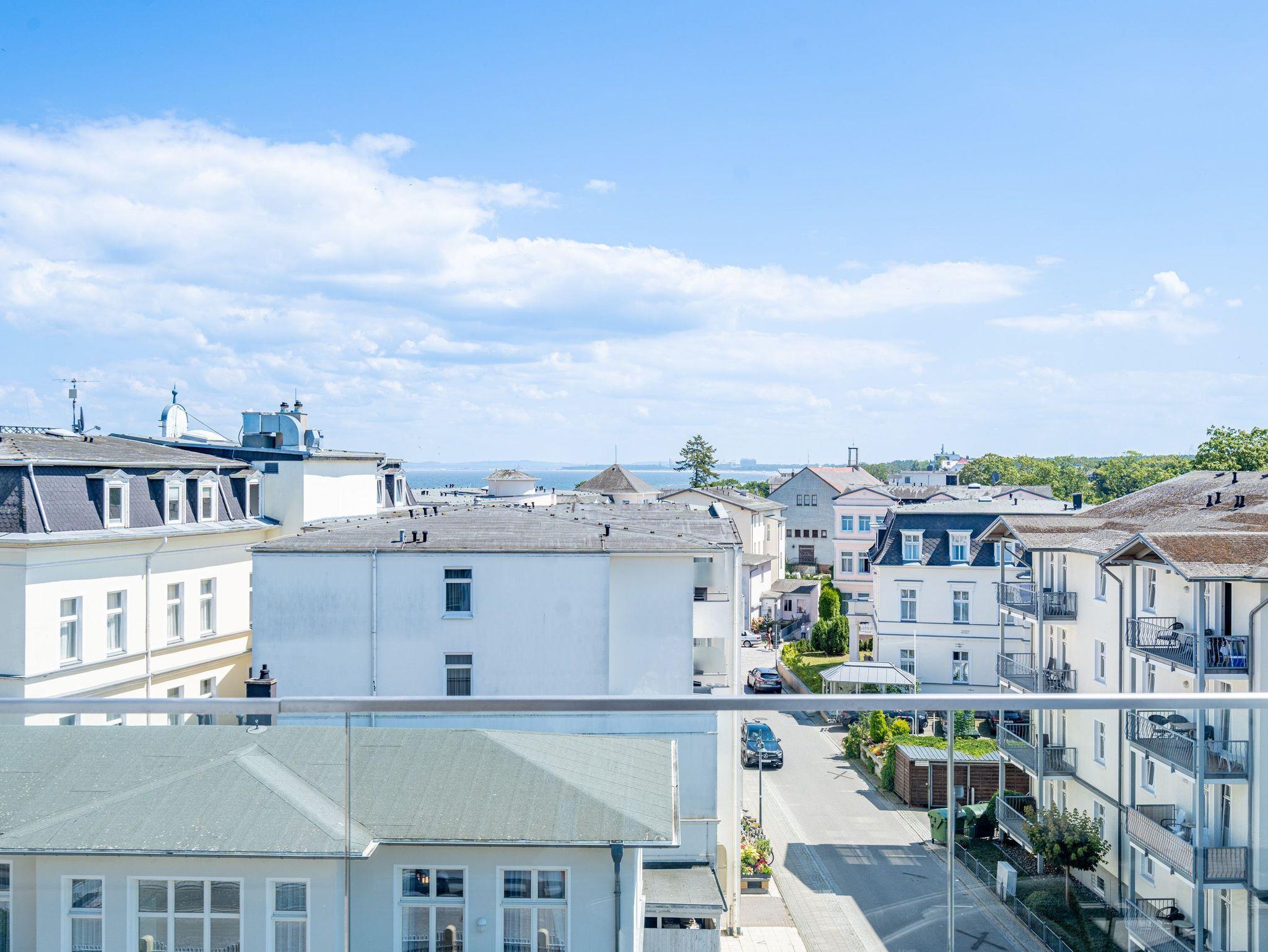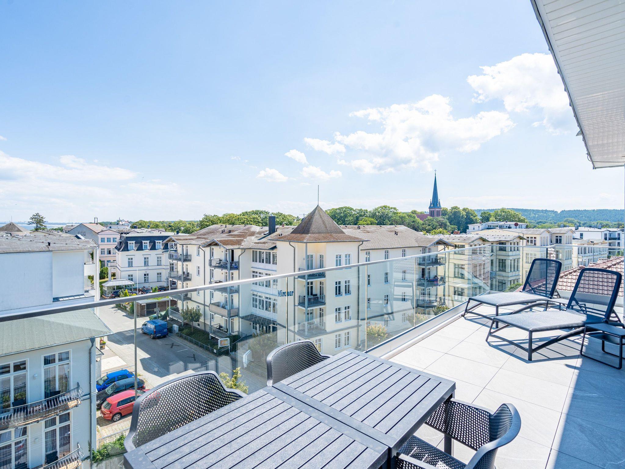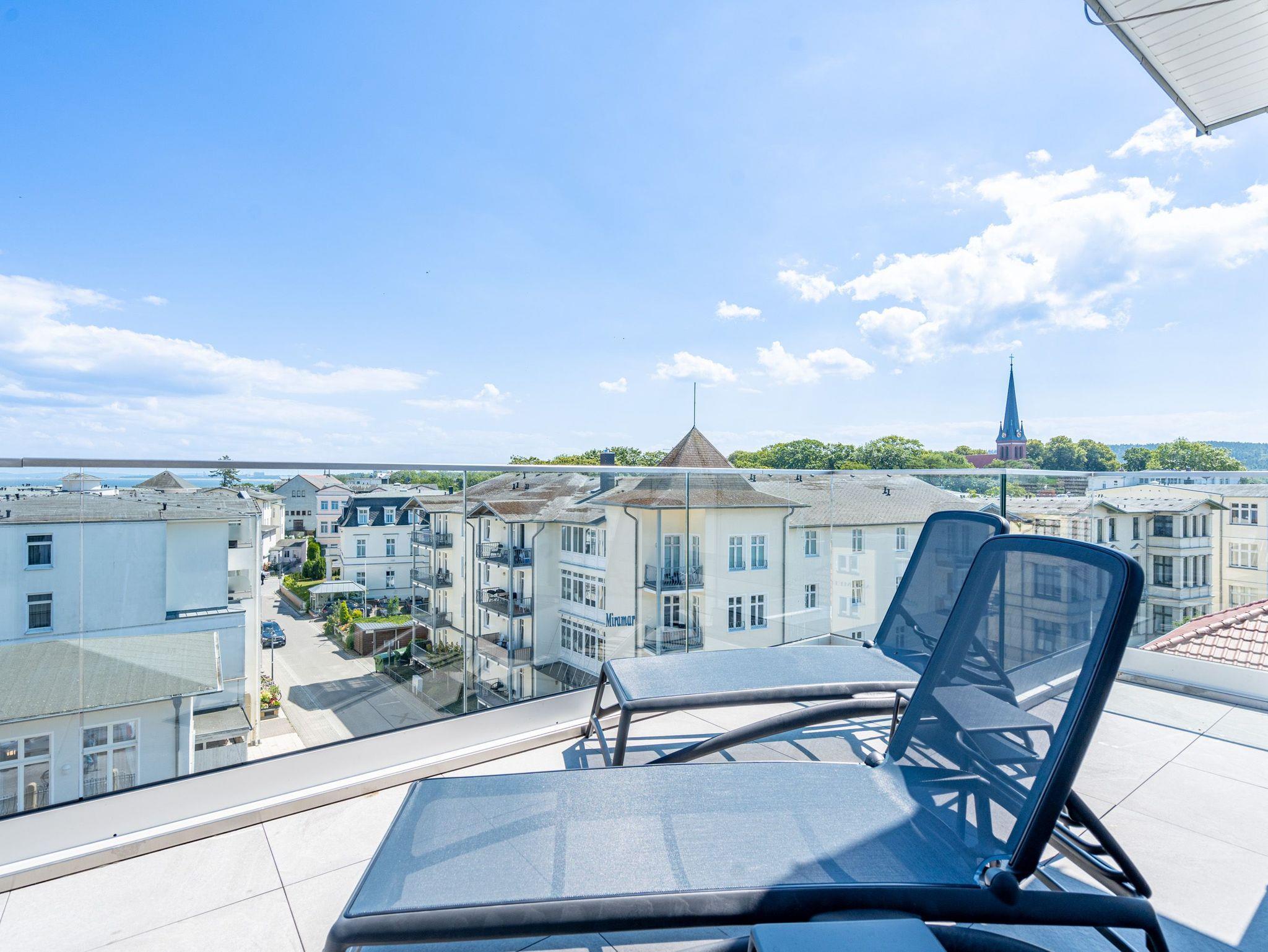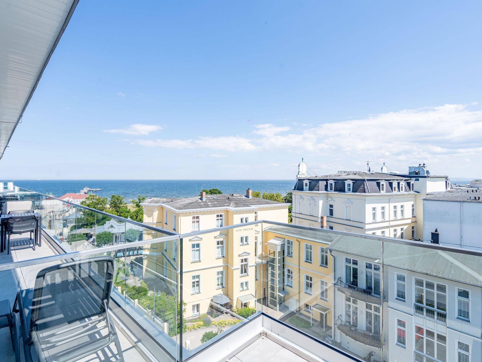 Das erste, was Sie sehen wollen und sehen werden, ist der atemberaubende Blick auf die Ostsee, den Sie vom Balkon dieses stilvollen Rückzugsortes aus genießen können. Das 2-Raum-Appartement B 4.4 (Haus B) in der Strandterrasse befindet sich hoch oben in der 4. Etage. Auf 67 Quadratmetern bietet das geräumige Appartement viel Platz für Entspannung. Die bis zu 2 Gäste, die es beherbergen kann, werden sich hier pudelwohl fühlen. Schon beim Eintreten empfängt Sie eine moderne und gemütliche Einrichtung. Stilvolle Designmöbel wie das komfortable Sofa nebst Sessel, die beide zum Faulenzen einladen, ein schöner, großer Esstisch und die vielen liebevollen Wohnaccessoires sorgen für eine kuschelige Atmosphäre. Erfreuen Sie sich am Flammenspiel des Elektrokamins (ohne Wärmeabgabe), der sogar im Sommer eine romantische Stimmung verbreitet. Ein 50 Zoll Flat-TV bietet Heimkinofeeling. Die offene Küche ist mit allen modernen Annehmlichkeiten ausgestattet, die Sie für die Zubereitung köstlicher Gerichte benötigen. Hochwertige Siemensgeräte wie ein Backofen, ein 3-Platten-Induktionsherd, ein Geschirrspüler, Kaffeemaschine und Nespresso-Kapselmaschine sind wertvolle Helfer, die das Kochen zum Vergnügen machen. Der Abwasch macht sich im Nachhinein ganz von selbst. Das wahre Highlight dieser Wohnung ist jedoch der umlaufende Süd-Ostbalkon mit einem atemberaubenden Blick auf das Seebad Ahlbeck und die Ostsee. Hier können Sie die Sonne den ganzen Tag genießen. Mit einem Tisch, 4 Stühlen, 2 Gartenliegen und zusätzlichen Sitzmöglichkeiten für 2 Personen finden Sie hier den perfekten Ort, um zu entspannen und den Panoramablick über die Dächer auf das Meer zu bewundern. Zu süßen Träumen verhilft Ihnen das komfortable Boxspringdoppelbett (1,80m x 2,00m) im Schlafzimmer ? eine Kuschelzone, die zu langem Ausschlafen und entspannten Stunden einlädt. Im Schlafzimmer gibt es auch einen geräumigen Kleiderschrank mit viel Platz für Bikini und Gummistiefel. Zur Ausstattung gehört außerdem ein weiterer Flat-TV (43 Zoll). Auch vom Schlafzimmer aus können Sie auf den Balkon treten und den Tag mit einem Blick aufs Meer beginnen. Das Badezimmer hat Tageslicht und verfügt über eine Dusche, Waschtisch und WC. Eine Infrarotsaunakabine wird Ihnen an kühlen Tagen ordentlich einheizen. Ideale Voraussetzungen für eine erholsame Auszeit. Kommen Sie also ganz entspannt an. Stellen Sie Ihr Auto in der Tiefgarage ab und starten Sie in Ihr Ostseeabenteuer in einer wunderschönen Ferienwohnung.
