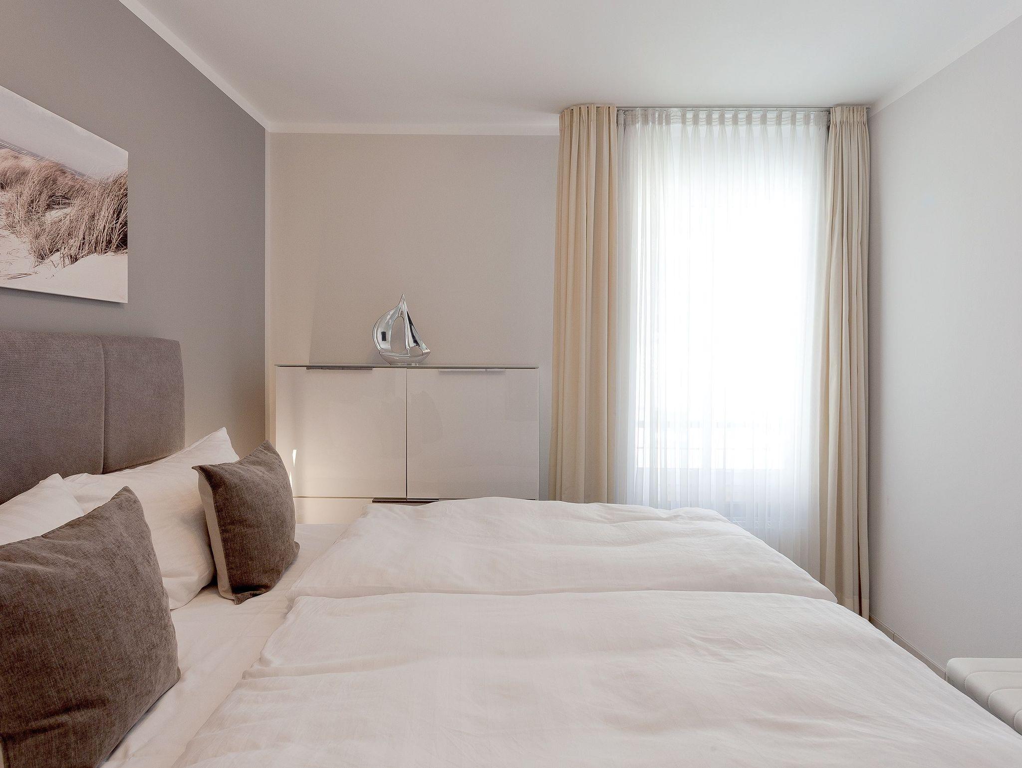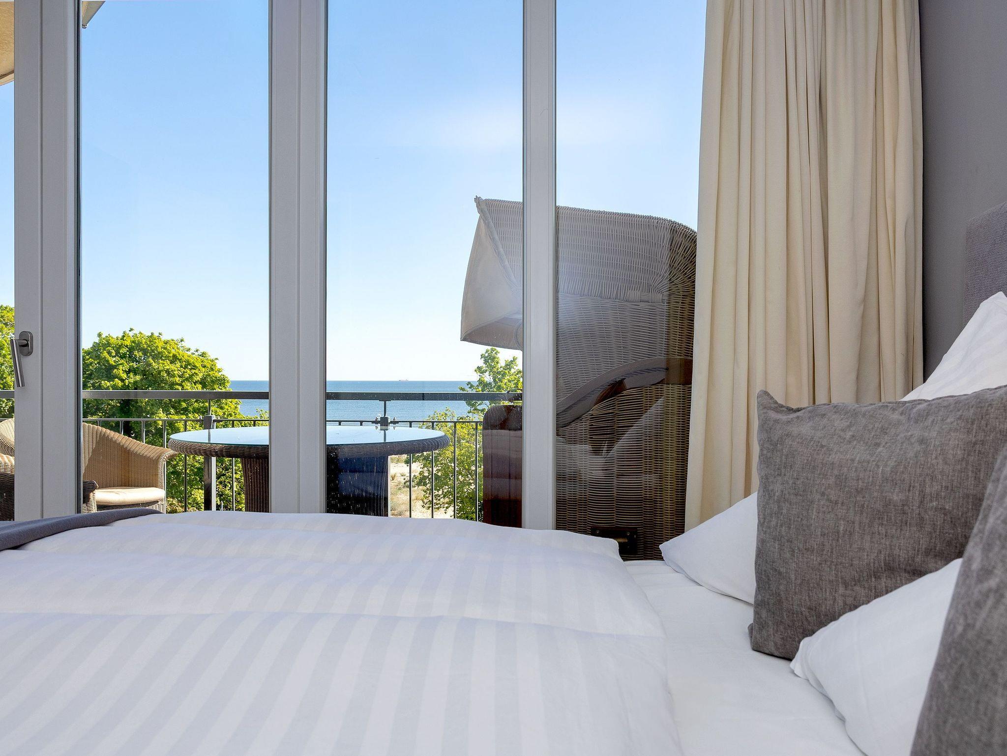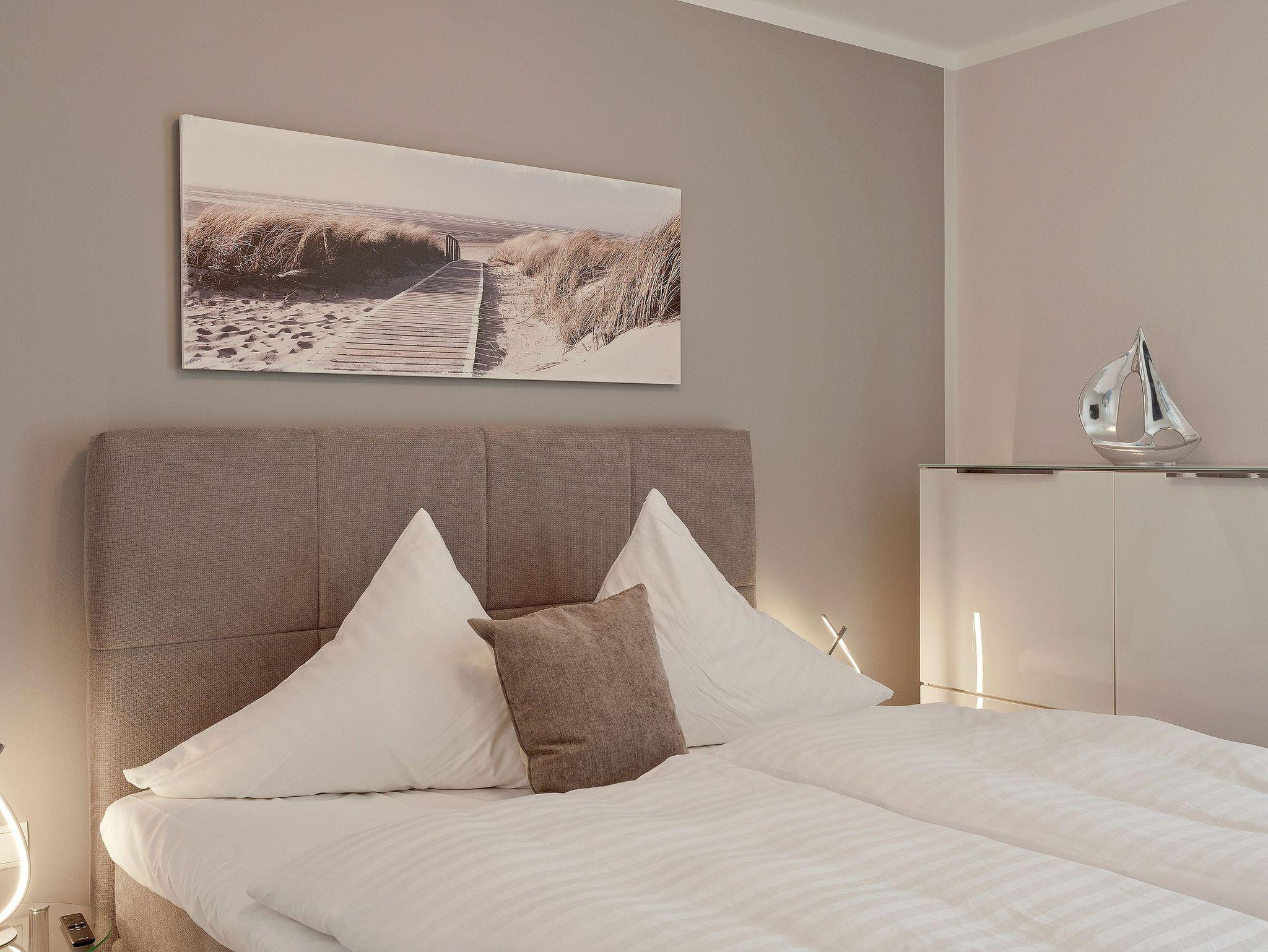 Vom Wohnbereich aus erreichen Sie den Nordostbalkon, der einen wundervollen Blick auf das glitzernde Meer und die Ahlbecker Seebrücke preisgibt. Der Strandkorb bietet den idealen Ruheort. Das Schlafzimmer ist mit einem Boxspringbett (160 x 200cm / durchgehende Matratze) und einem geräumigen Schrank für Ihr Hab und Gut ausgestattet. Auch vom Schlafzimmer haben Sie eine wundervolle Sicht auf die Ostsee und die Möglichkeit auf den Balkon zu gelangen. Das zweite Schlafzimmer ist ebenfalls mit einem hochwertigen Boxspringbett (160 x 200cm / zwei getrennte Matratzen) ausgestattet. Alle Wohn- und Schlafräume verfügen über einen Flat TV. Das exquisite Badezimmer besitzt eine bodengleiche Echtglasdusche, ein WC und ein Haartrockner sowie einen großen Waschtisch mit zwei Wasserhähnen und viele kleine Extras.