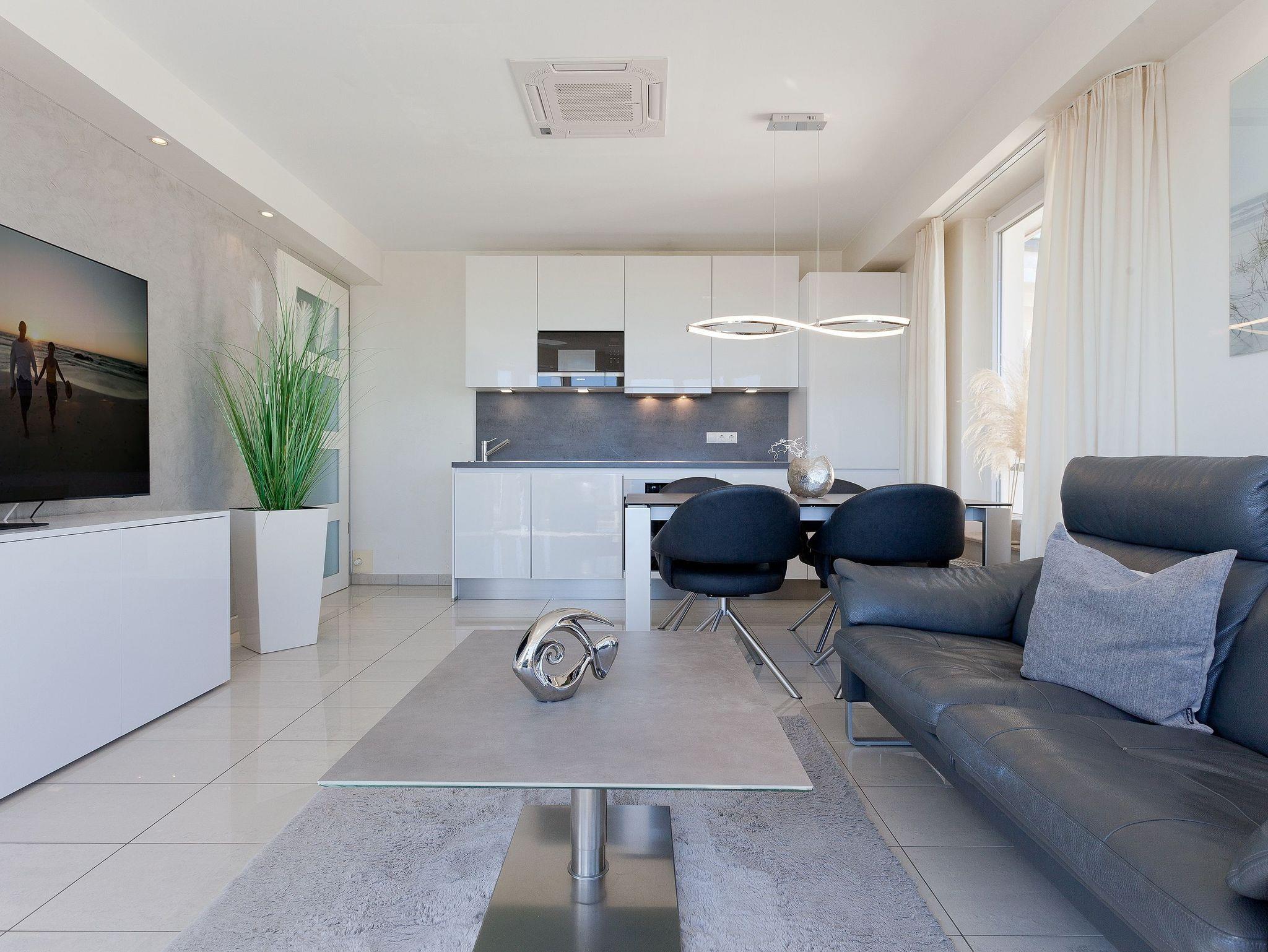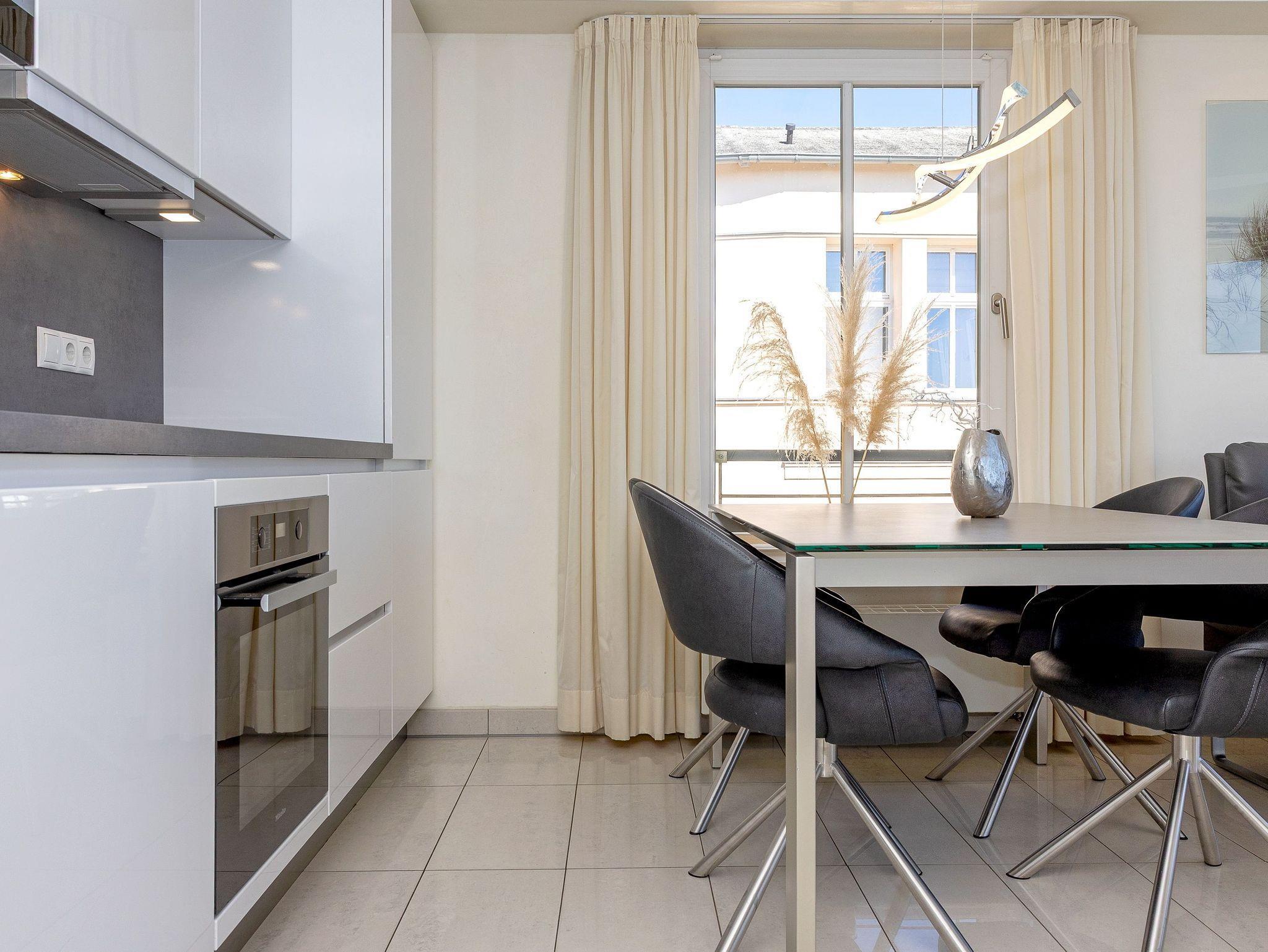 Das 55 Quadratmeter große 3-Zimmer-Appartement ist im 2. Obergeschoss der Villa Louise gelegen und das ideale Urlaubsdomizil für Familien. Bis zu vier Personen haben in dem luxuriösen Appartement Platz. Der kombinierte Wohn- und Kochbereich ist mit viel Liebe zum Detail eingerichtet und wartet mit jeglichen Raffinessen auf, die das Herz begehrt. Der Fußboden ist aus hochwertigem Feinsteinzeug gefertigt und mit einer Fußbodenheizung versehen. Die Klimaanlage sorgt stets für die richtige Wohlfühltemperatur. Die integrierte Küchenzeile verfügt über Induktionkochfeld, Mikrowelle, Backofen, Spülmaschine, Kühlschrank mit Gefrierfach, Wasserkocher, Toaster, Kaffeemaschine, so dass Sie für die Zubereitung Ihrer Lieblingsspeisen alle Utensilien zur Hand haben. Der Wohnbereich lockt mit einer edlen Ledersitzecke, in der Sie sich entspannen können und von der Sie einen einzigartigen Panoramablick auf die Ostsee genießen.