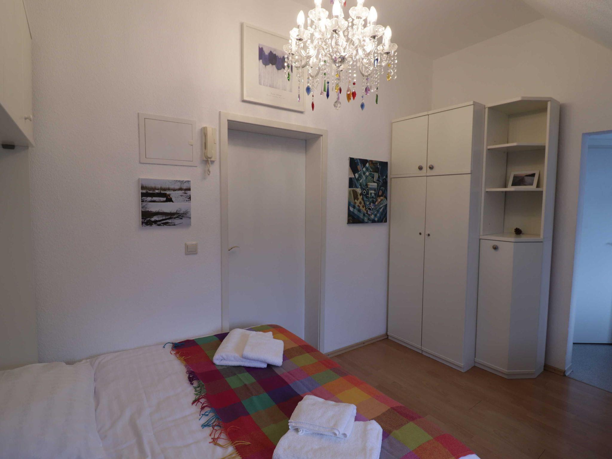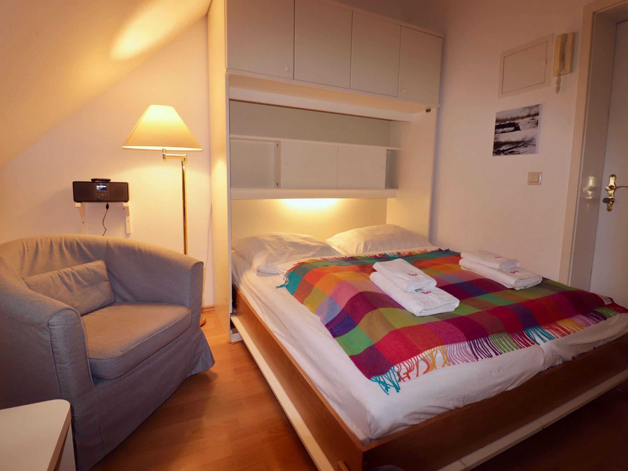 Das Wohnzimmer ist mit einem sehr komfortablen Schrankbett (160 x 200 cm, zwei Matratzen) ausgestattet, das durch einfache Handgriffe zu bedienen ist. Tagsüber kann das Bett hochgeklappt werden, wodurch das Zimmer zusätzlich an Fläche gewinnt. Der typgleiche Kleiderschrank aus weiß lackiertem Holz bietet hinreichend Staumöglichkeiten für zwei Personen. In einem ebenfalls weiß lackierten Sideboard befindet sich das Geschirr und andere Utensilien. Eine kleine Hifi-Anlage mit Internetradio und Bluetooth-Schnittstelle, sowie ein wandmontierter Smart-TV mit Kabelanschluss stehen zur Nutzung zur Verfügung. Unsere Gäste erhalten kostenlosen Zugang zu WLAN. Zwei gemütliche Polstersessel und ein dazu passender Tisch laden zum Verweilen und Entspannen ein. Der hochwertige Laminatfußboden im Wohnzimmer ist äußerst pflegeleicht und verleiht der Wohnung eine angenehme warme Note.