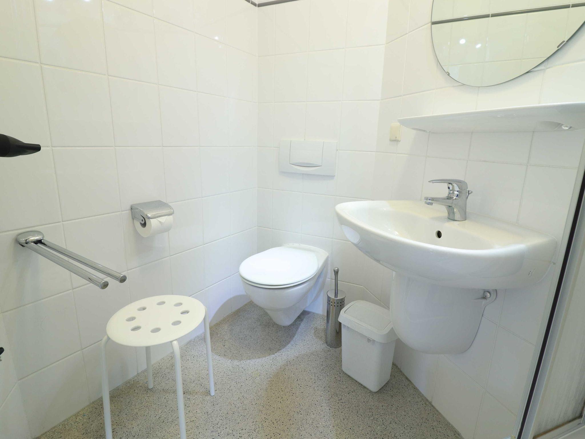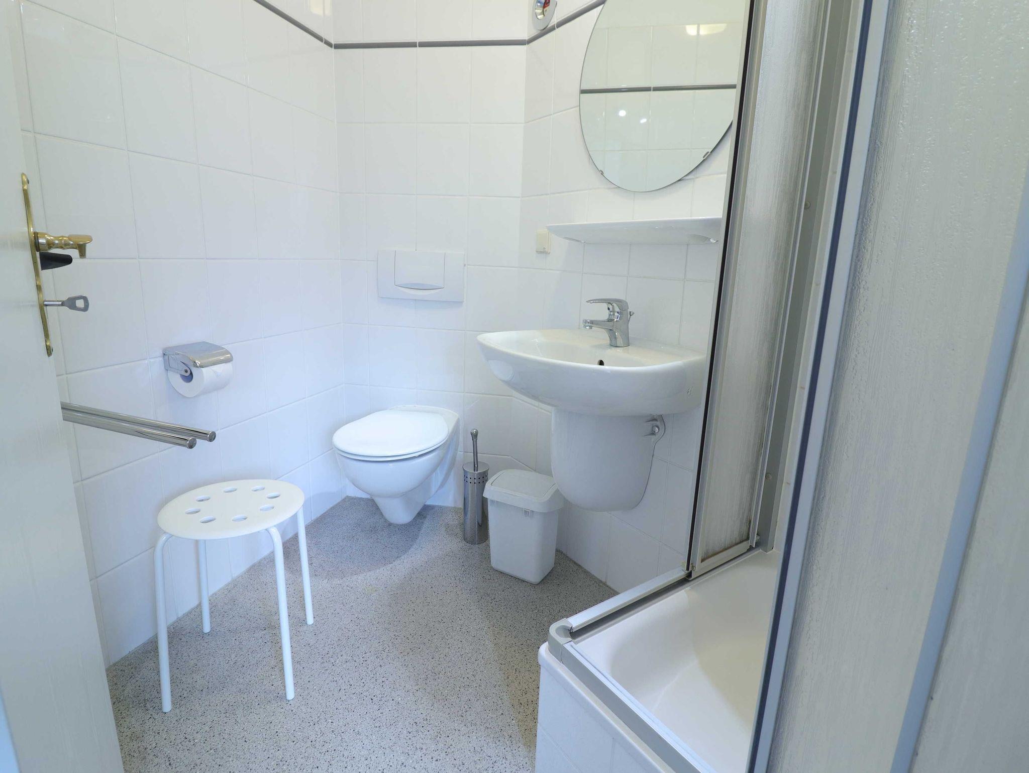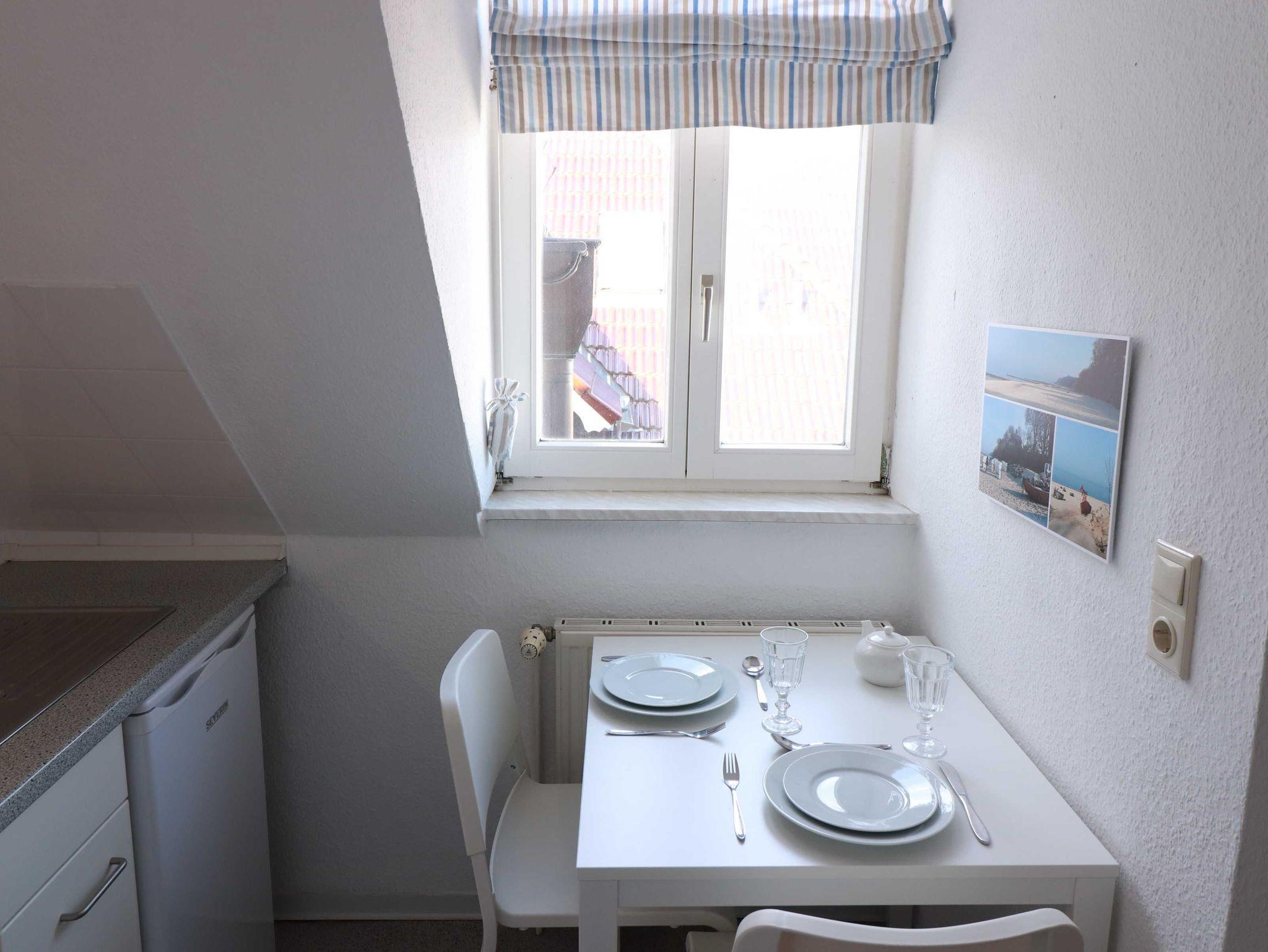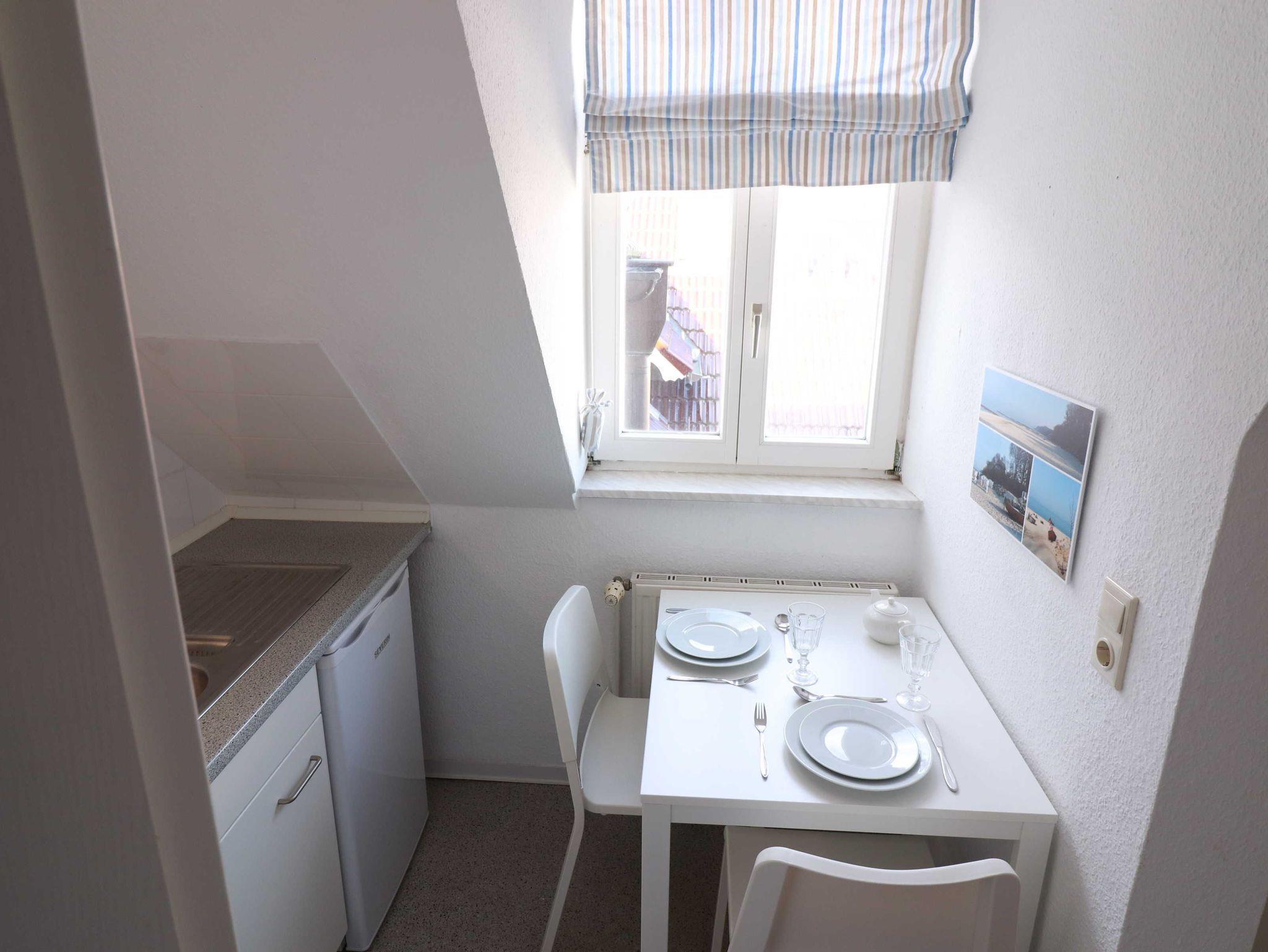 Durch einen offenen Durchgang vom Wohnzimmer getrennt, befindet sich die kleine Küche, die aus einer Einbauzeile mit zwei Herdplatten, Kühlschrank und Spüle besteht. Toaster, Nespressomaschine, aber auch eine Filterkaffeemaschine sowie Wasserkocher stehen zur Verfügung. Die Küche bietet außerdem Platz für einen Tisch und zwei Stühle. Von der Küche besteht Zugang zum weiß gefliesten Duschbad, das über WC, Waschbecken und Dusche verfügt.