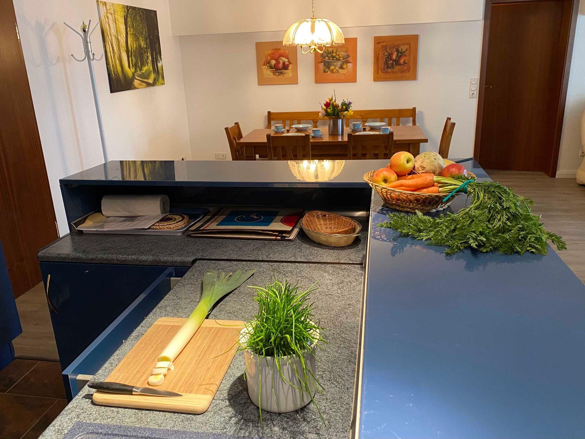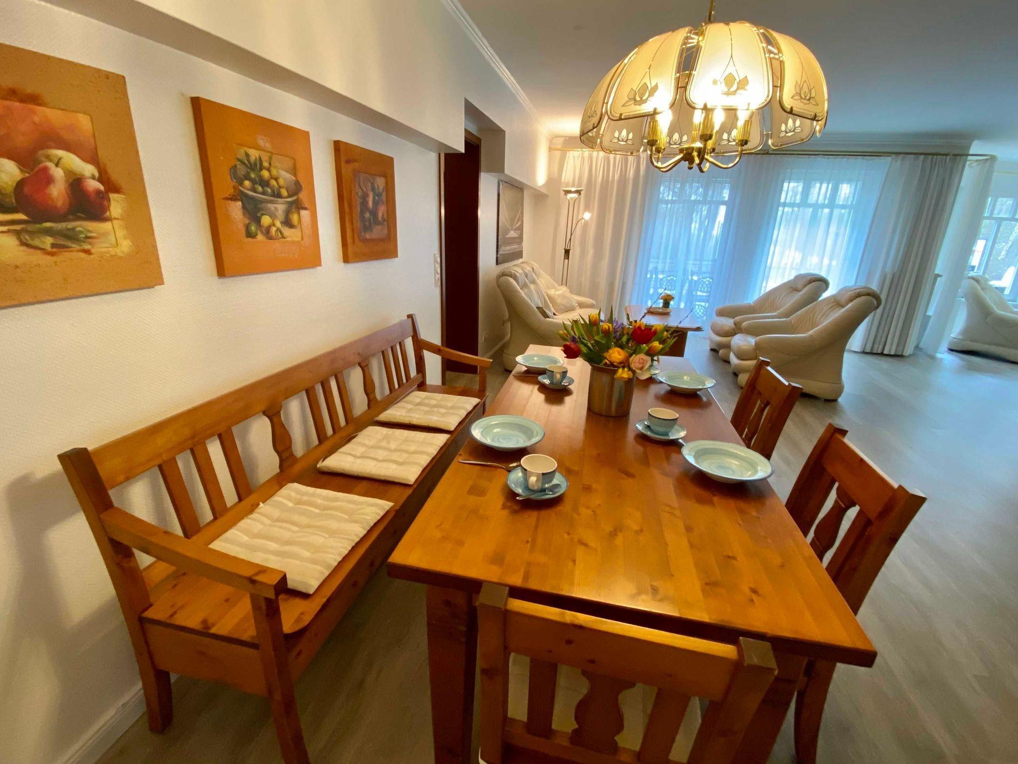 Im Wohnbereich befindet sich ein großer Esstisch und eine Schlafcouch, ideal für eine Großfamilie. Zur Wohnung gehört ein Tiefgaragenstellplatz