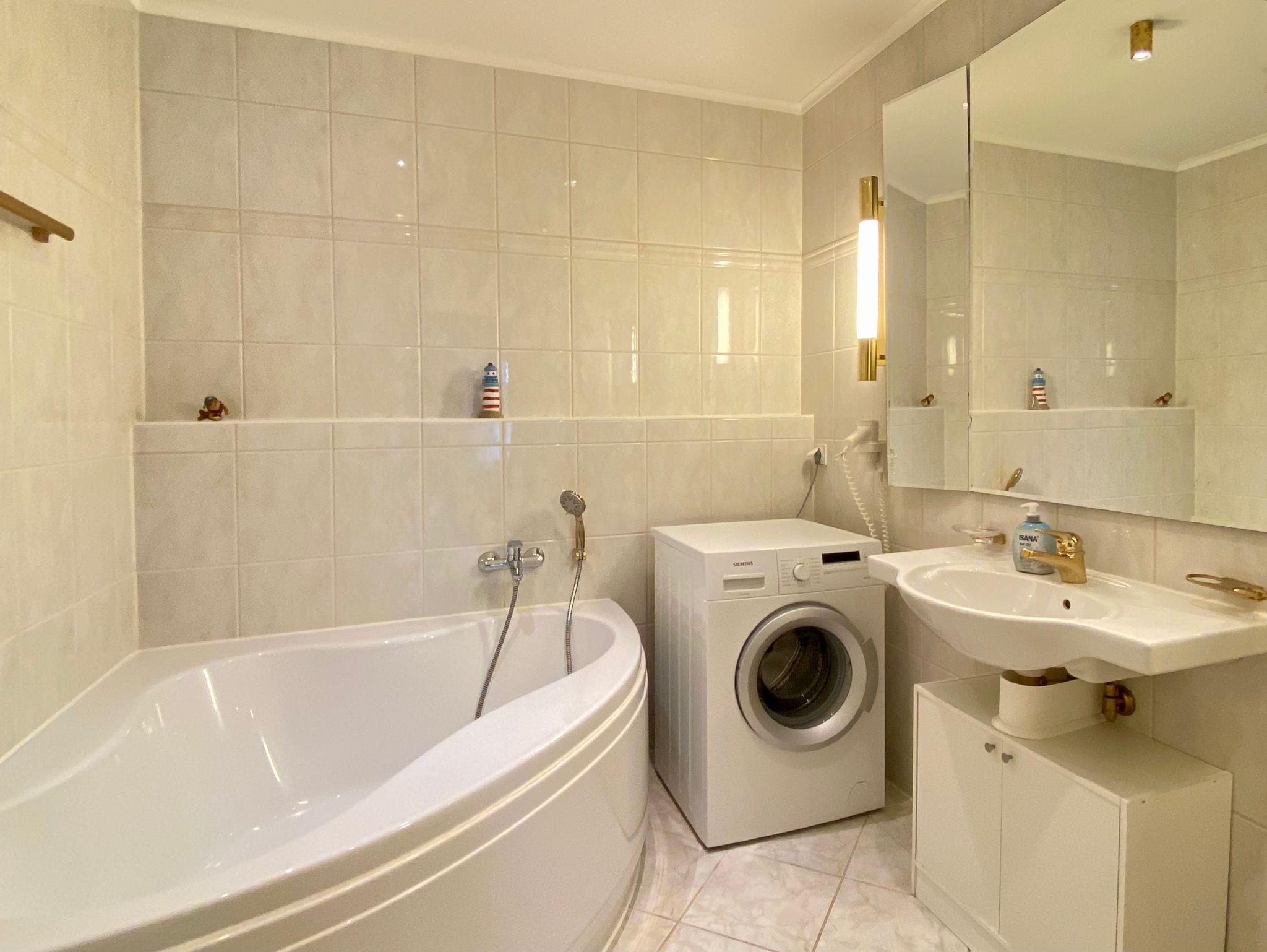 Sie verfügt über zwei separate Schlafzimmer und zwei Badezimmer mit Wanne und Dusche sowie eine Waschmaschine. Die Komplettküche ist offen und in den Wohnraum integriert.