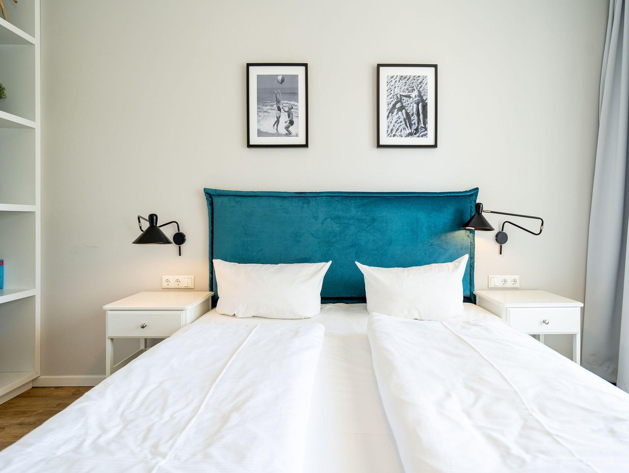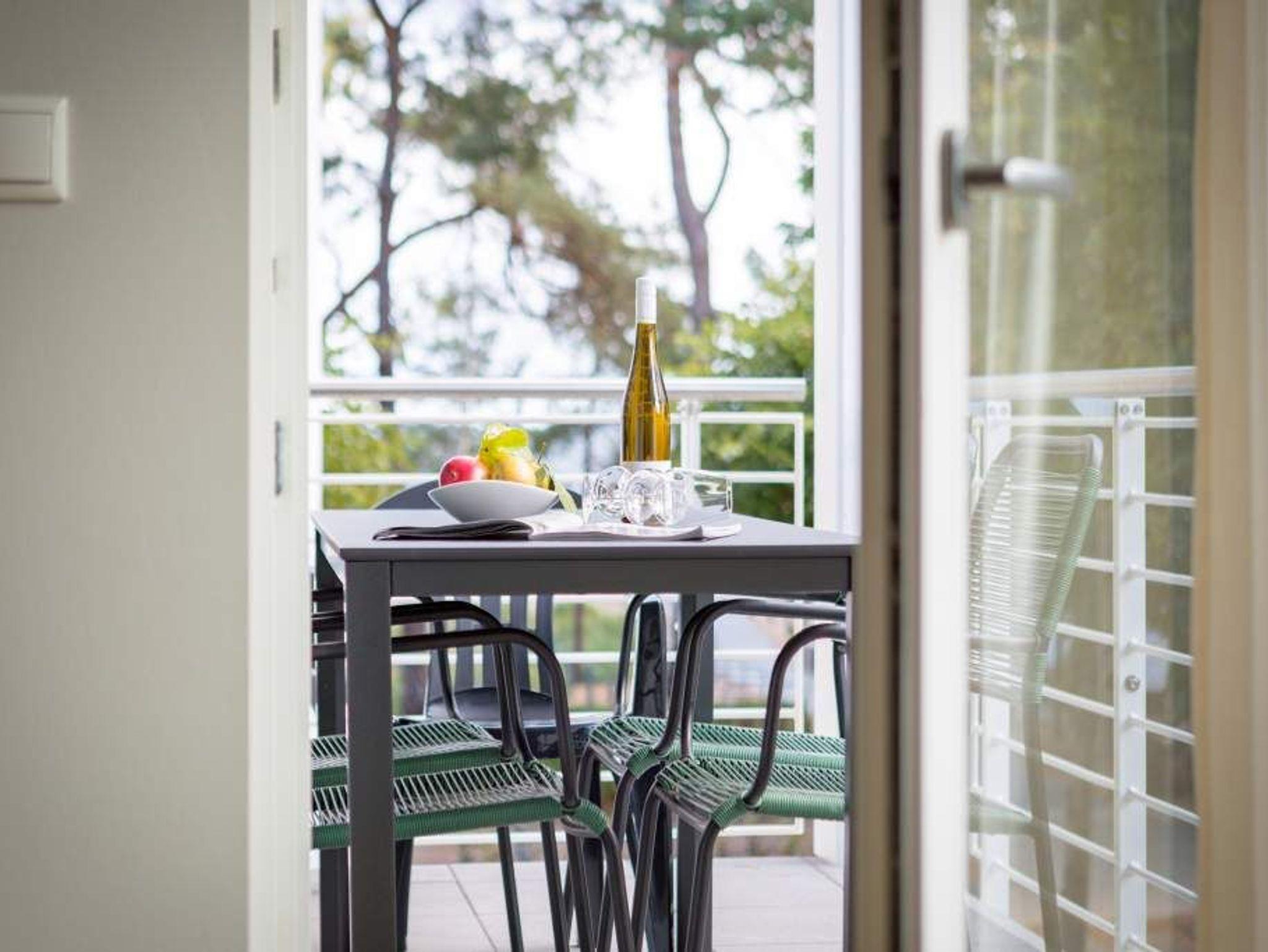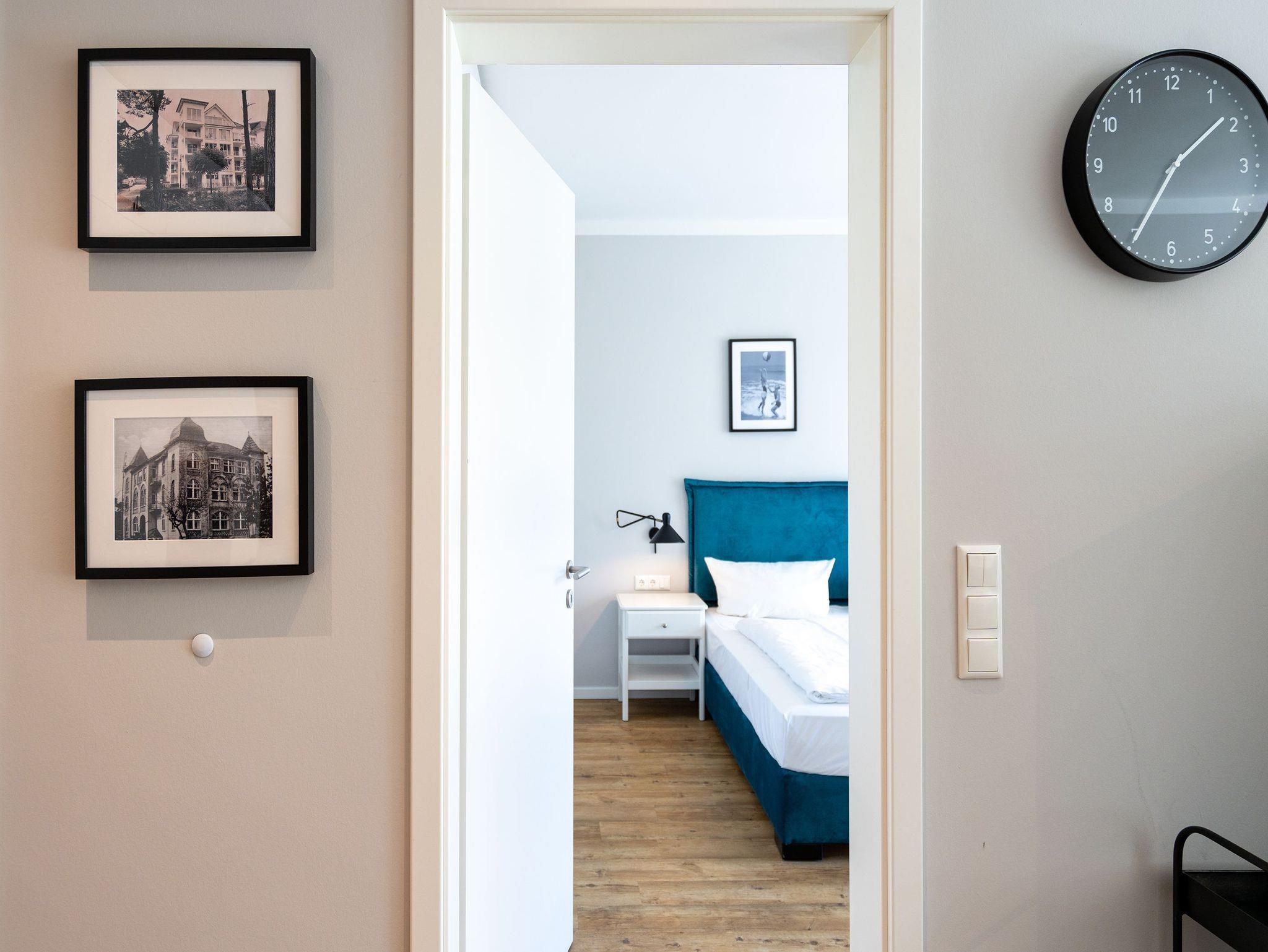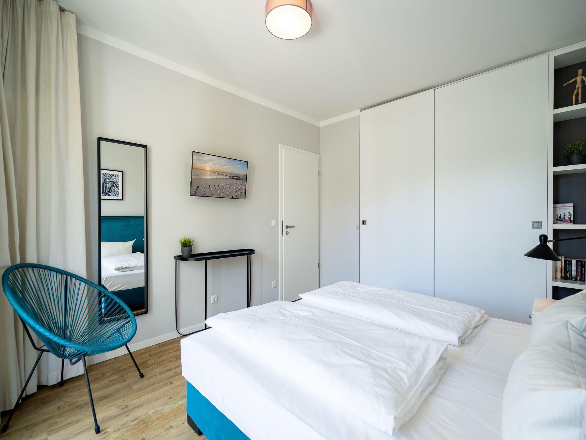 Die Ostsee rauscht durch die großen, offenen Fenster. Der Blick vom Balkon in die gleißende Morgensonne gibt den Blick auf viel Grün und ein bisschen Blau frei. Frühstücken unter freiem Himmel mit einer salzigen Brise in der Nase ? so können Urlaubstage immer beginnen. Die 57 Quadratmeter Ihres kleinen Urlaubsparadieses für zwei Personen und ein Kleinkind (im Kinderreisebett) sind modern und stylisch eingerichtet. Ein offener und lichtdurchfluteter Wohn-Essbereich lädt zum Entspannen und Erholen ein. Liegt man auf dem bequemen Sofa, weiß man gar nicht, wohin man schauen soll: auf den Elektrokamin oder den großen Flat-TV. Auch lesen, dösen oder kuscheln lässt es sich auf dem Sofa bestens. Alles ist in Weiß und dezenten Pastelltönen gehalten. Da fallen die Design-Stühle des Esstisches ganz besonders auf. Sie setzen mit ihrem Petrolton einen angenehmen Farbakzent, der sich in den Sofakissen widerspiegelt. Gleich neben dem Esstisch schließt sich die offene Küche an. Sie ist mit hochwertigen Geräten und edlem Geschirr voll ausgestattet. Das Farbkonzept setzt sich auch im gemütlichen Schlafzimmer fort. Ein großes Boxspringdoppelbett (1,80 m x 2,00 m) in Petrol verheißt Vergnügen nicht nur beim Schlafen. Der geräumige Schrank ist eine Maßanfertigung. Auch hier gibt es einen Flat-TV und Zugang zum Balkon. Das moderne Bad verfügt über eine Dusche, einen Waschtisch und ein WC. Das Badezimmer bietet ebenfalls viel Ablagefläche. Die Dusche ist ebenerdig. In der Wohnung haben Sie kostenloses WLAN. Die Betten sind bei Anreise bezogen und Handtücher liegen bereit. In der zu den Strandresidenzen gehörenden Tiefgarage ist ein Stellplatz Nr. 1.4 im Doppelparker (Fahrzeughöhe max. 1,90 m) für Sie reserviert. Außerdem können Waschmaschine [&] Trockner im Untergeschoss kostenfrei genutzt werden.