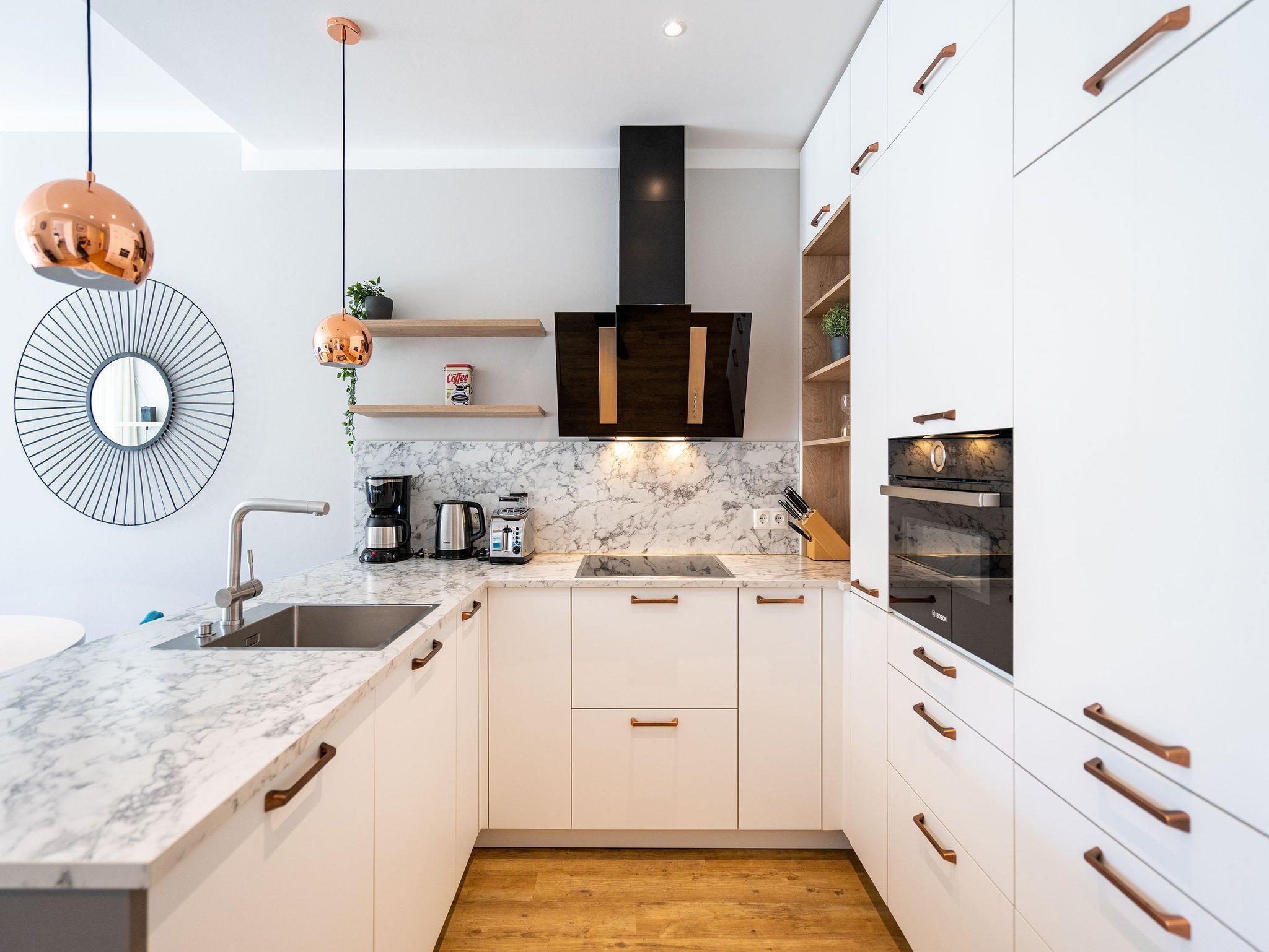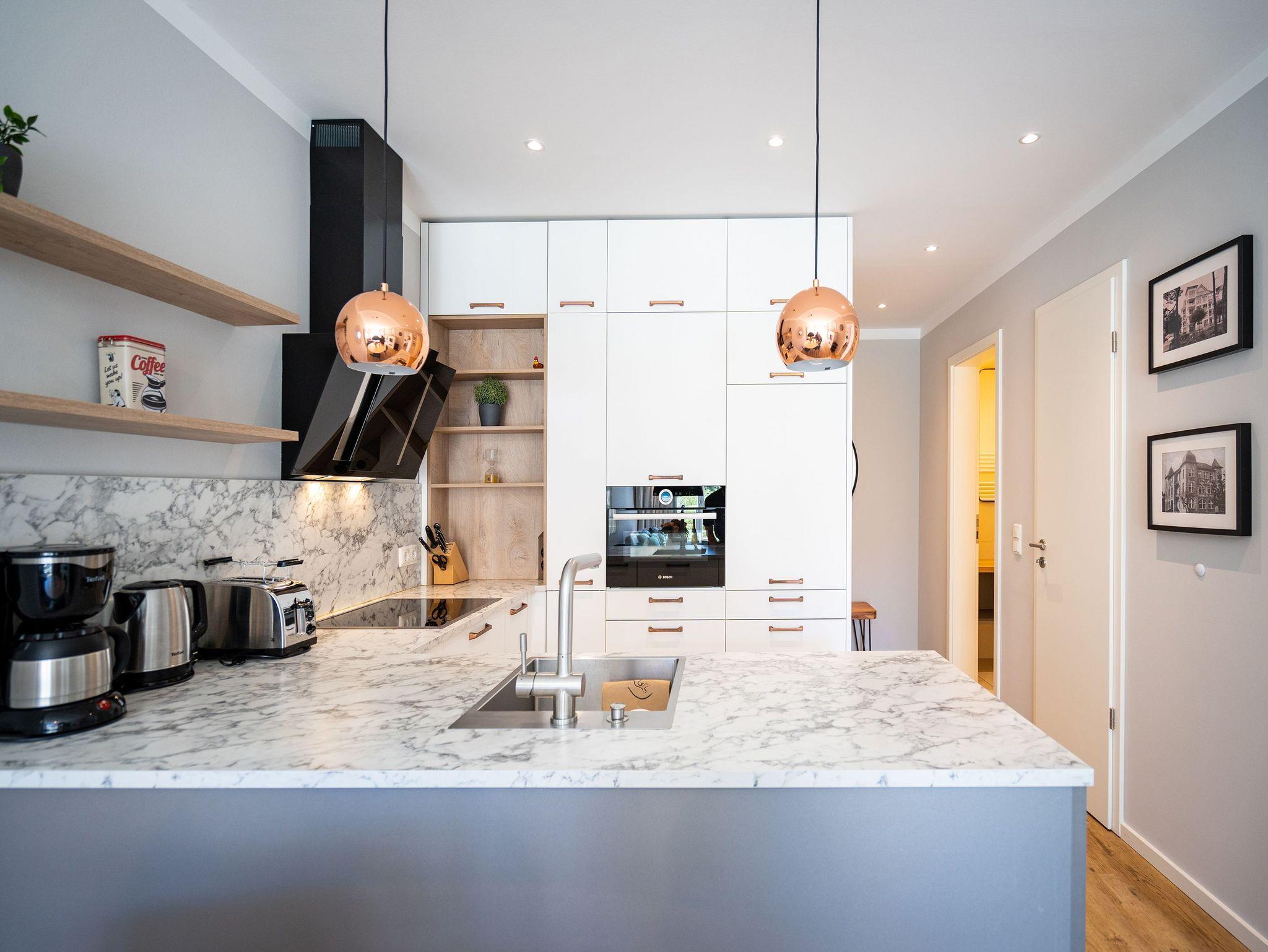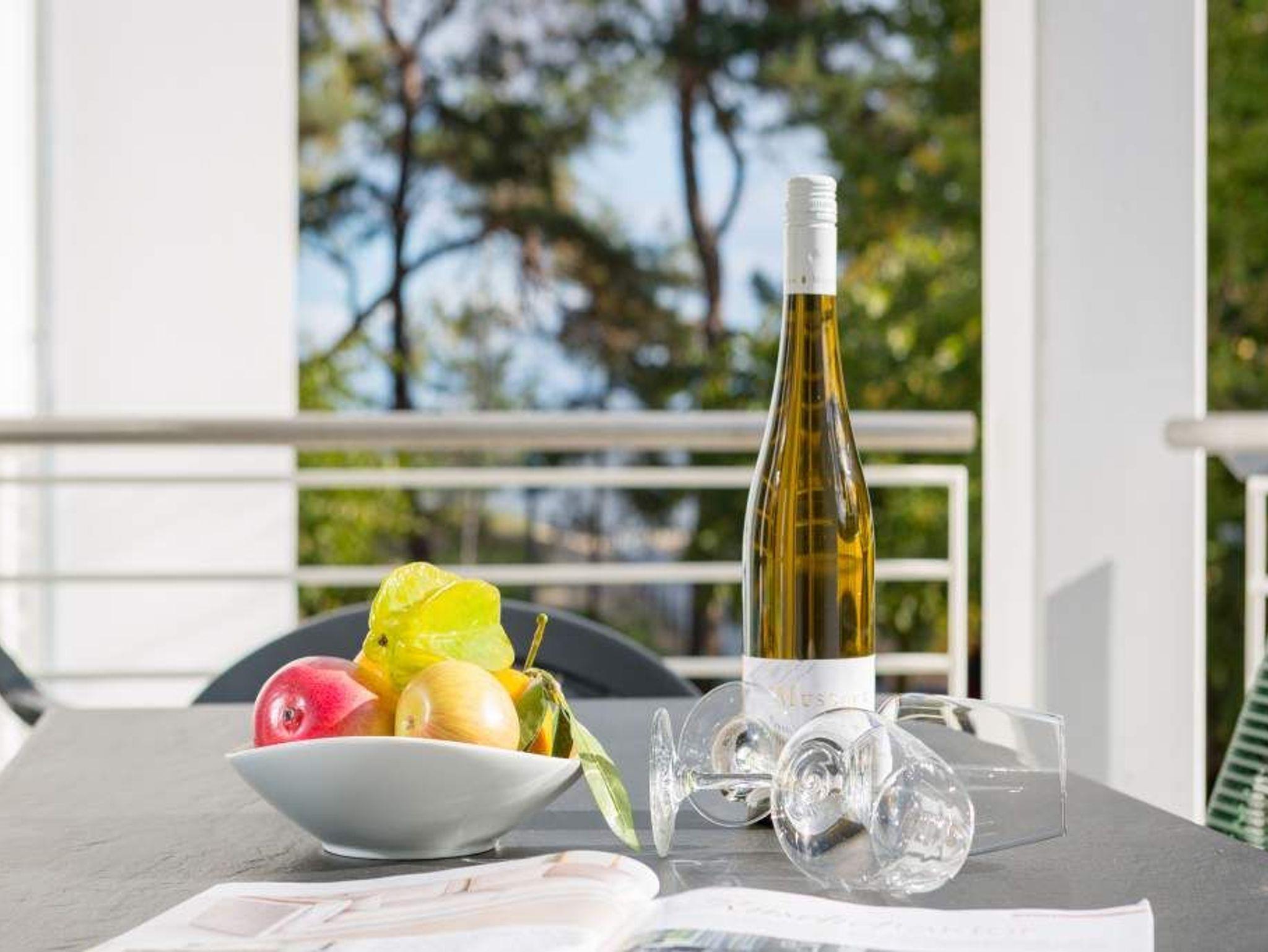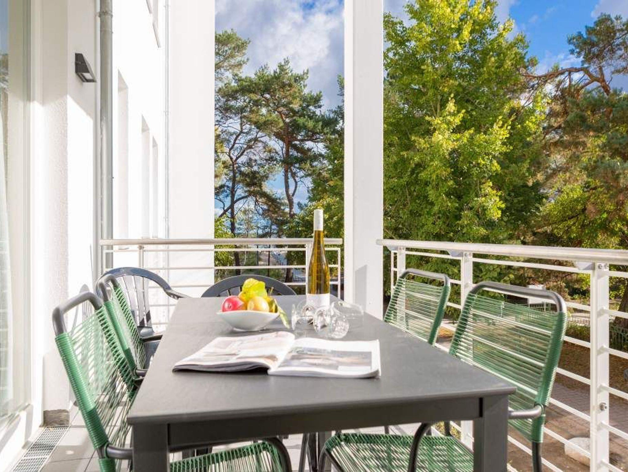 Die Ostsee rauscht durch die großen, offenen Fenster. Der Blick vom Balkon in die gleißende Morgensonne gibt den Blick auf viel Grün und ein bisschen Blau frei. Frühstücken unter freiem Himmel mit einer salzigen Brise in der Nase ? so können Urlaubstage immer beginnen. Die 57 Quadratmeter Ihres kleinen Urlaubsparadieses für zwei Personen und ein Kleinkind (im Kinderreisebett) sind modern und stylisch eingerichtet. Ein offener und lichtdurchfluteter Wohn-Essbereich lädt zum Entspannen und Erholen ein. Liegt man auf dem bequemen Sofa, weiß man gar nicht, wohin man schauen soll: auf den Elektrokamin oder den großen Flat-TV. Auch lesen, dösen oder kuscheln lässt es sich auf dem Sofa bestens. Alles ist in Weiß und dezenten Pastelltönen gehalten. Da fallen die Design-Stühle des Esstisches ganz besonders auf. Sie setzen mit ihrem Petrolton einen angenehmen Farbakzent, der sich in den Sofakissen widerspiegelt. Gleich neben dem Esstisch schließt sich die offene Küche an. Sie ist mit hochwertigen Geräten und edlem Geschirr voll ausgestattet. Das Farbkonzept setzt sich auch im gemütlichen Schlafzimmer fort. Ein großes Boxspringdoppelbett (1,80 m x 2,00 m) in Petrol verheißt Vergnügen nicht nur beim Schlafen. Der geräumige Schrank ist eine Maßanfertigung. Auch hier gibt es einen Flat-TV und Zugang zum Balkon. Das moderne Bad verfügt über eine Dusche, einen Waschtisch und ein WC. Das Badezimmer bietet ebenfalls viel Ablagefläche. Die Dusche ist ebenerdig. In der Wohnung haben Sie kostenloses WLAN. Die Betten sind bei Anreise bezogen und Handtücher liegen bereit. In der zu den Strandresidenzen gehörenden Tiefgarage ist ein Stellplatz Nr. 1.4 im Doppelparker (Fahrzeughöhe max. 1,90 m) für Sie reserviert. Außerdem können Waschmaschine [&] Trockner im Untergeschoss kostenfrei genutzt werden.