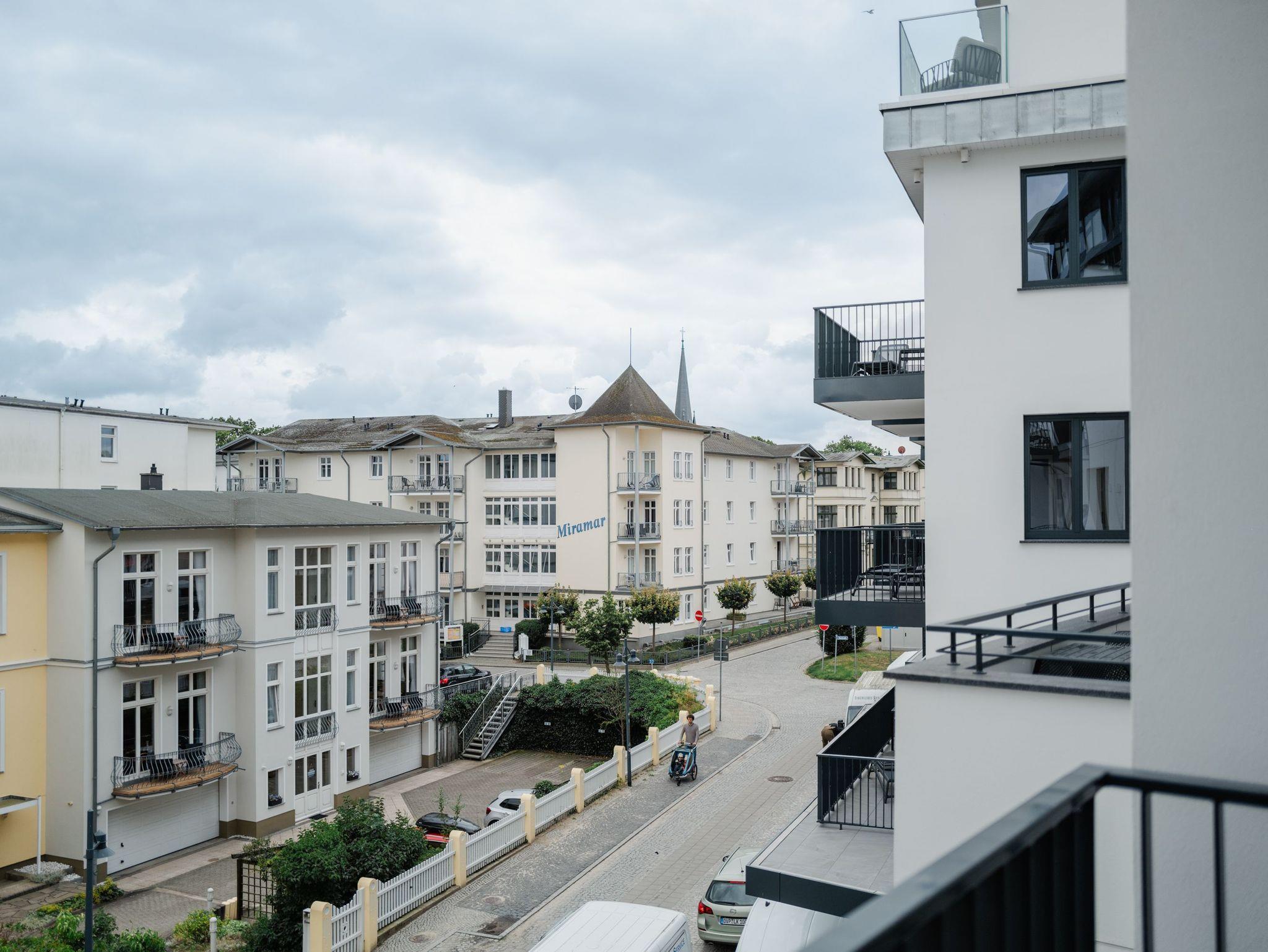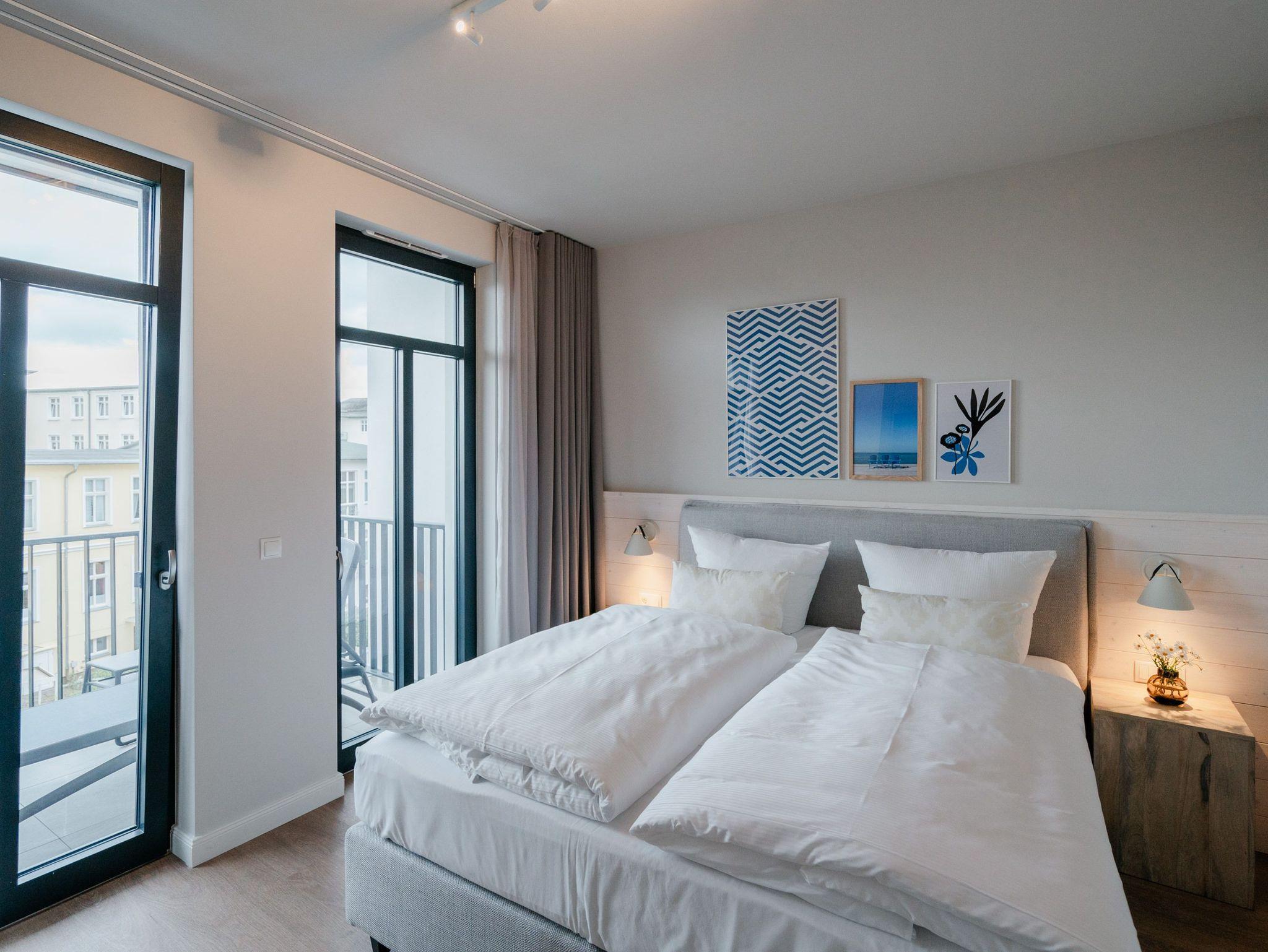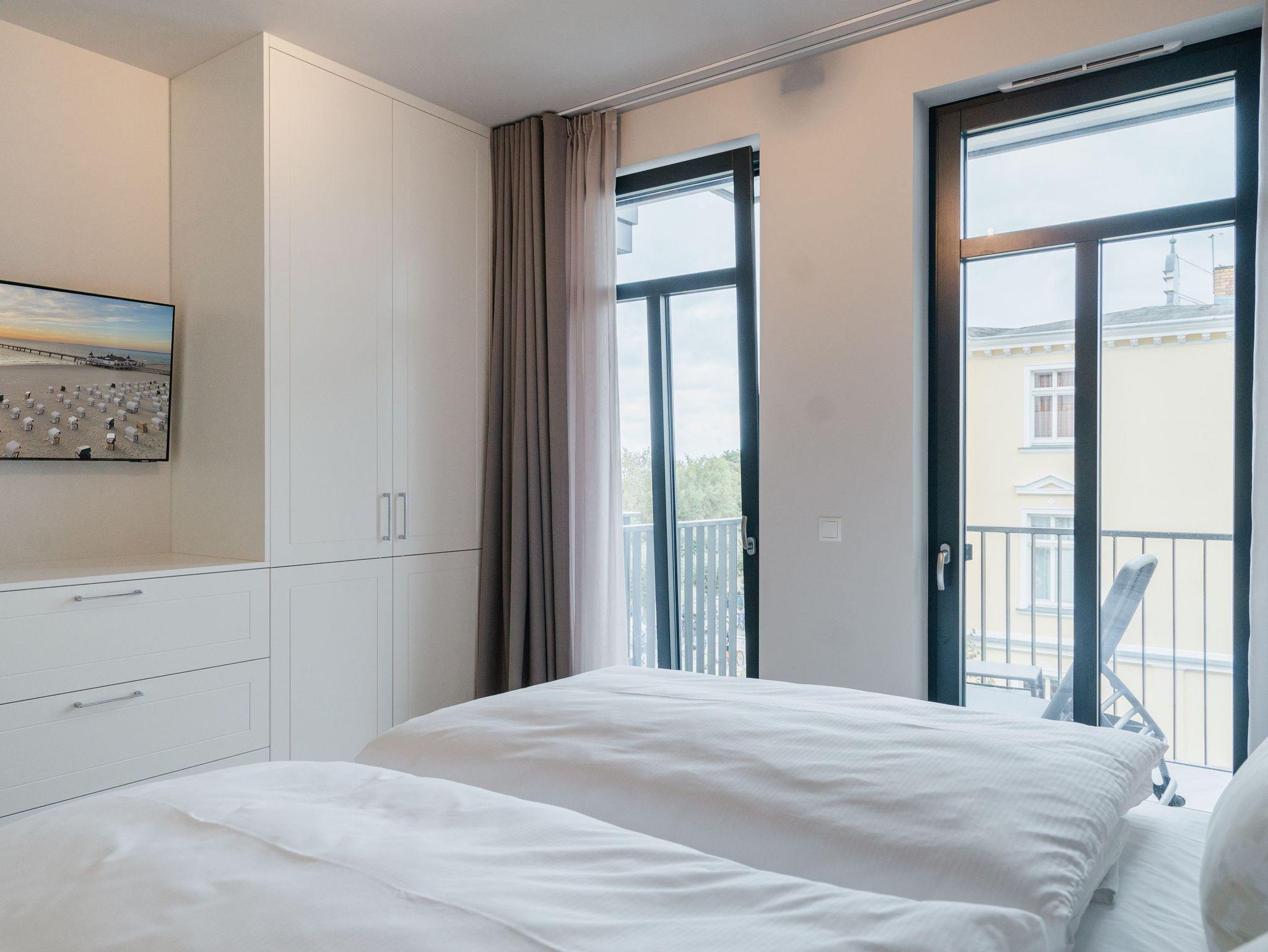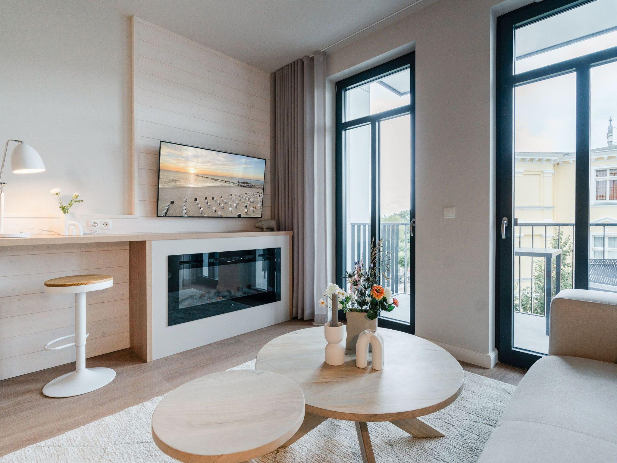 Die 2024 fertig gestellte Strandterrasse liegt direkt an der belebten Strandpromenade und bietet einen einzigartigen Ausblick auf die Grand Dame der historischen Seebrücken sowie die historische Konzertmuschel, einem beliebten Treffpunkt für Kunst und Kultur. Dahinter liegt die Ostsee ? ein Panorama, das zu den schönsten in den Kaiserbädern gehört. Es ist wie das Abtauchen in eine andere Zeit. In eine Zeit, in der man mit Stock, Sonnenschirm und Hut fürs „Sehen und gesehen werden“ über die Promenade schlenderte; aber auch in eine Zeit, in der ? damals wie heute ? Zeit einmal für eine kurze Weile keine Rolle spielt. Weil man angekommen ist im Loslassen, Entspannen und Genießen. Es ist dieser besondere Geruch nach Meeresluft und Freiheit, der in Erinnerung bleibt. Dazu die Bilder, die man mitnimmt. Von langen Strandspaziergängen, vom Lachen in fröhlich schäumenden Ostseewellen, von der Zeit in einem wunderschönen Urlaubsdomizil. Denn genau das ist die Strandterrasse mit ihren 56 modernen und exklusiven Ferienappartements direkt gegenüber der Ahlbecker Seebrücke. Die Ein-, Zwei- oder Dreizimmerwohnungen ? zwischen 40 und 70 Quadratmeter groß ? sind von einer Innenarchitektin gemeinsam mit unserem Erfahrungsschatz an Gästewünschen mit viel Liebe zum Detail und ganz individuell konzipiert worden. Entspannung und Wohlfühlen stehen an erster Stelle. Alles ist aufeinander abgestimmt und sorgt für eine gemütliche Atmosphäre. Wählen Sie zwischen einem Domizil in einem hellen, sandfarbenen Designkonzept oder einem Appartement mit anthrazitfarbenen Farbakzenten. Alle Appartements verfügen gleichermaßen über eine stilvolle und komfortable Einrichtung, die passgenau angefertigt worden ist, sowie über moderne Küchen und Bäder. Jedem Schlafzimmer ist ein eigenes Bad mit Dusche zugeordnet (außer App. B4.5). Die Appartements besitzen fast alle einen Balkon ? viele schauen sogar zur Ostsee hinaus. Die meisten Feriendomizile haben einen Elektrokamin und Infrarotsaunen. Im Erdgeschoss befindet sich ein separater Gemeinschaftsraum für Fahrräder. Außerdem besteht die Möglichkeit, im Gemeinschaftswaschraum 2 Waschmaschinen [&] Trockner zu nutzen. Ergänzt wird das Angebot durch eine Gemeinschaftssauna, die täglich von 11:00 bis 22:00 Uhr nutzbar ist. In der Tiefgarage (Einfahrtshöhe 2,03 Meter) steht für jede Wohnung 1 Pkw-Stellplatz zur Verfügung. Ist alles zur Zufriedenheit untergebracht? Dann kann der Urlaub ja beginnen. Und beim Blick vom Balkon über die Ostsee treffen sich zum Sonnenaufgang das Heute und das Damals. Gelassenheit legt sich beim Gang hinunter an den Strand auf die Seele. Jetzt darf die Zeit stehenbleiben.