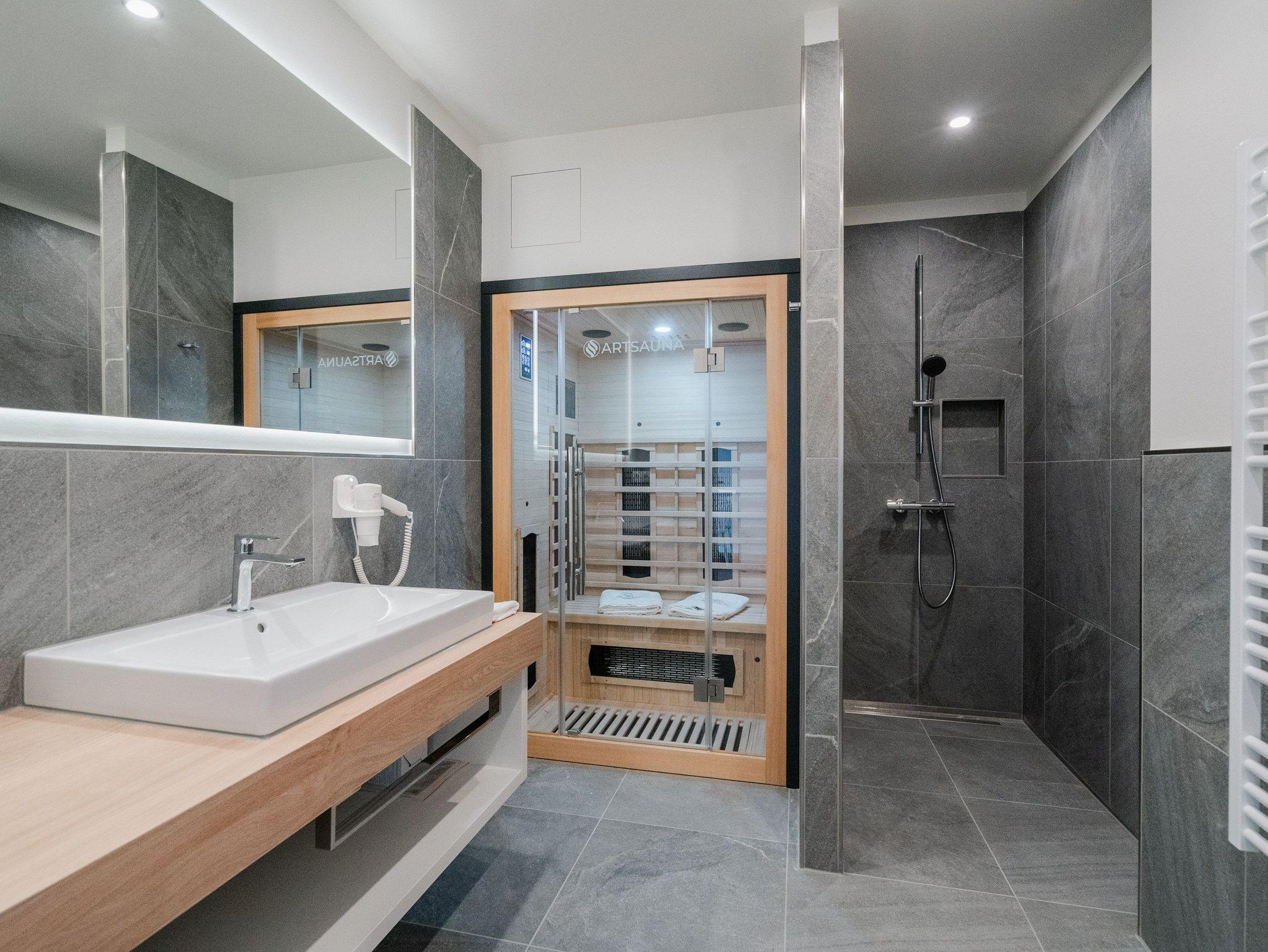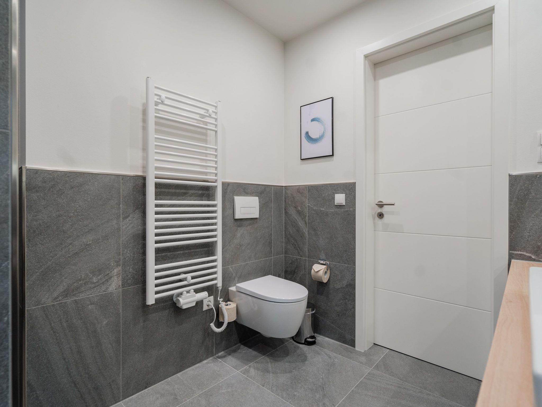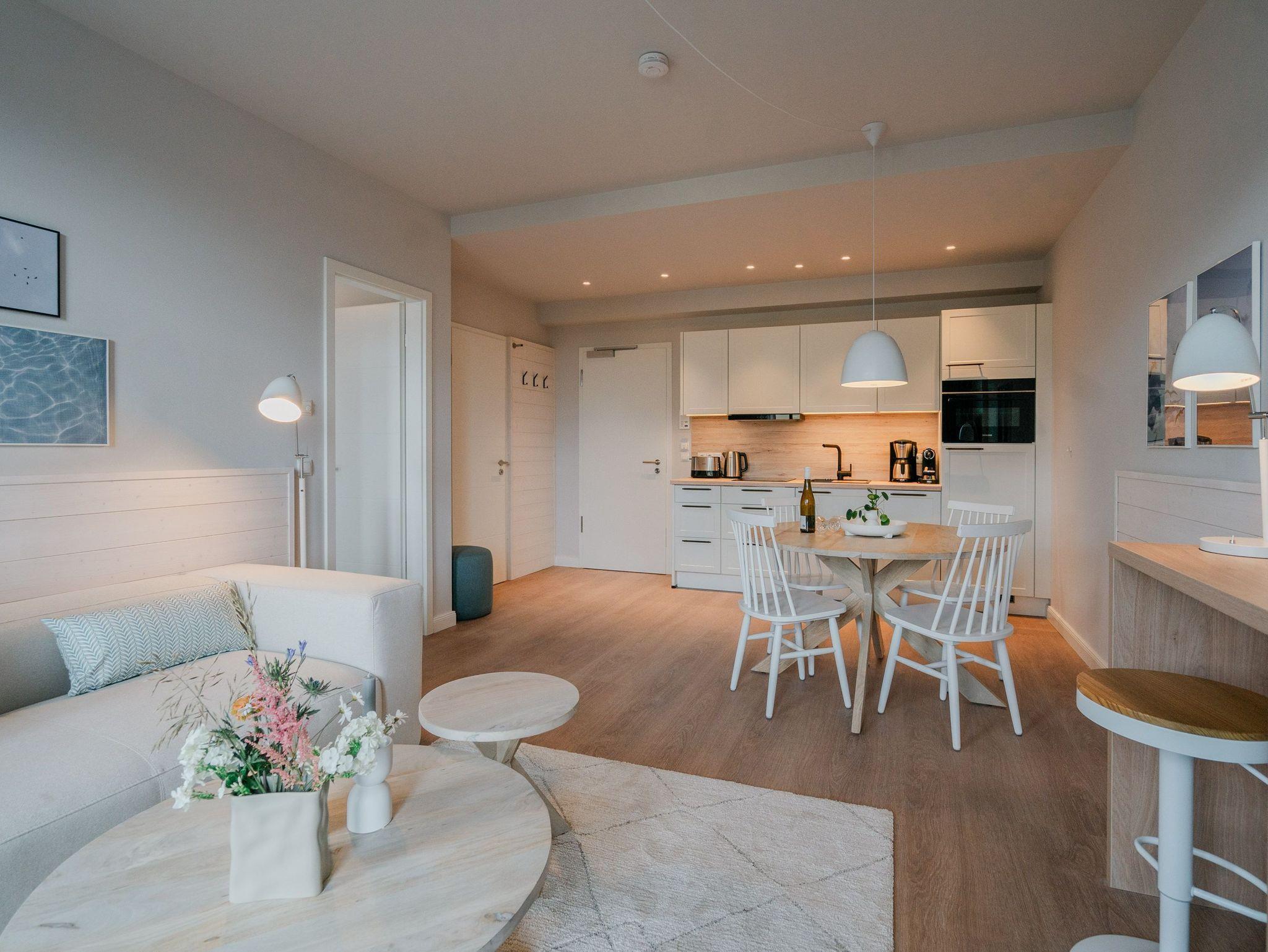 Dieses lichtdurchflutete und gemütliche 2-Raum-Appartement A2.5 mit Meerblick macht entspannte Urlaubsträume wahr. Es befindet sich im 2. Obergeschoss des Hauses A. Die Ostsee mit allen Sinnen genießen, das können bis zu zwei Personen in diesem 50 Quadratmeter großen Wohntraum. Edel und hochwertig eingerichtet, wird Ihnen das Wohn-Esszimmer und das komfortable Schlafzimmer zu einer unvergesslich schönen Auszeit verhelfen. Und das, nur 80 Meter vom Strand entfernt. Einmal aus der Tür fallen und Sie spüren den Strandsand unter den Füßen und die frische Ostseebrise direkt im Gesicht. Doch schon auf den beiden Balkonen Ihres Feriendomizils mit Ost-Ausrichtung können Sie das weite Blau sehen, das nahe Wellenrauschen hören und sich die gesunde Meeresluft um die Nase wehen lassen. Entspannen Sie auf der bequemen Couch bei einem spannenden Film auf dem 50-Zoll-Flachbildfernseher oder beim Blick auf den flackernden Elektrokamin (ohne Wärmeabgabe). Zum großzügigen und doch kuscheligen Wohn-Esszimmer gehören ein schöner Esstisch und eine voll ausgestattete Küchenzeile mit hochwertigen Siemens-Elektrogeräten. Eine Working Station bietet die Möglichkeit, auch während des Urlaubs produktiv zu sein oder ganz nostalgisch den Daheimgebliebenen eine Postkarte zu schreiben. Vom Wohnzimmer aus haben Sie Zugang zum ersten Balkon, während Sie aus dem Schlafzimmer heraus auf den zweiten Balkon an die Luft treten können. Schon einmal einen Sonnenaufgang aus dem Meer gesehen? Hier wird das möglich. Das Schlafzimmer ist mit einem komfortablen Boxspringdoppelbett (1,80m x 2,00m), einem Kleiderschrank und einer Kommode ausgestattet. Hier finden Sie auch einen weiteren 43-Zoll-Flachbildfernseher. Das innenliegende Bad verfügt über eine Dusche, WC und einen Waschtisch. Entspannen können Sie zudem bei wohliger Wärme in der wohnungseigenen Infrarotsauna. Ihnen steht ein PKW-Stellplatz in der Tiefgarage zur Verfügung. Erleben Sie erholsame Tage in der Strandterrasse und lassen Sie sich von dem seitlichen Blick auf die Ostsee und den Annehmlichkeiten dieser komfortablen Ferienwohnung verzaubern. Wir freuen uns darauf, Sie bald bei uns begrüßen zu dürfen!