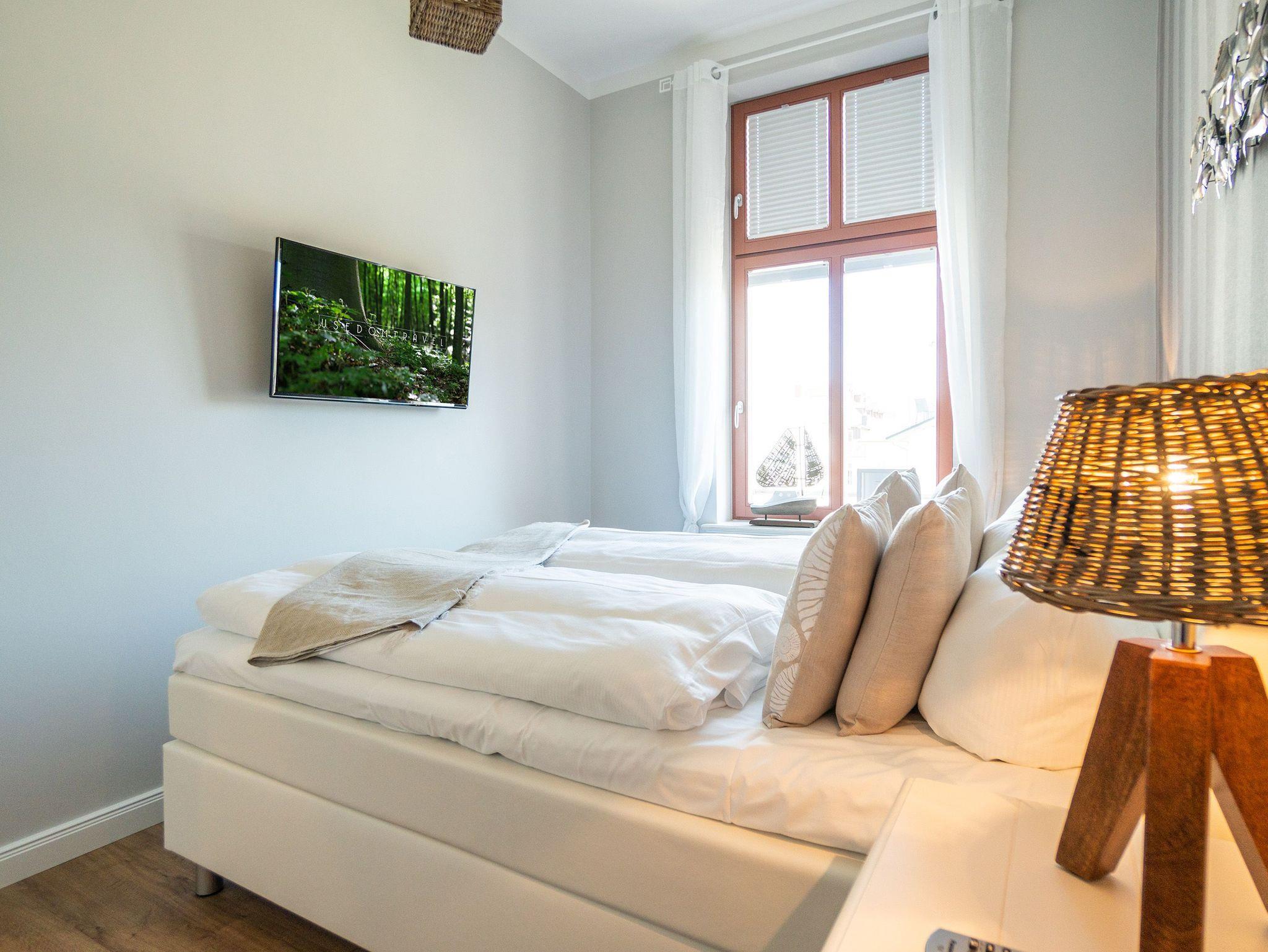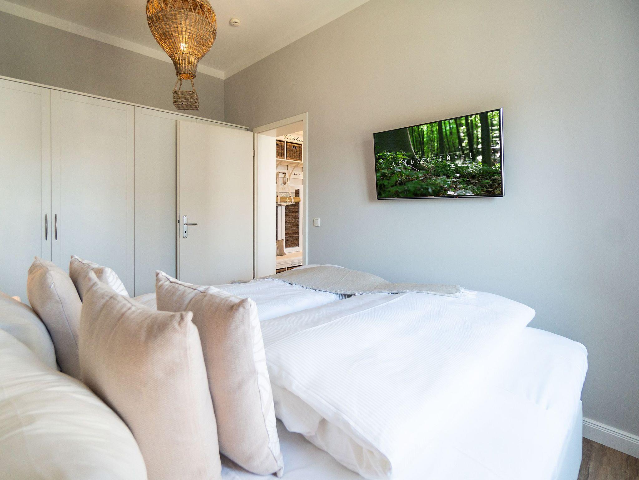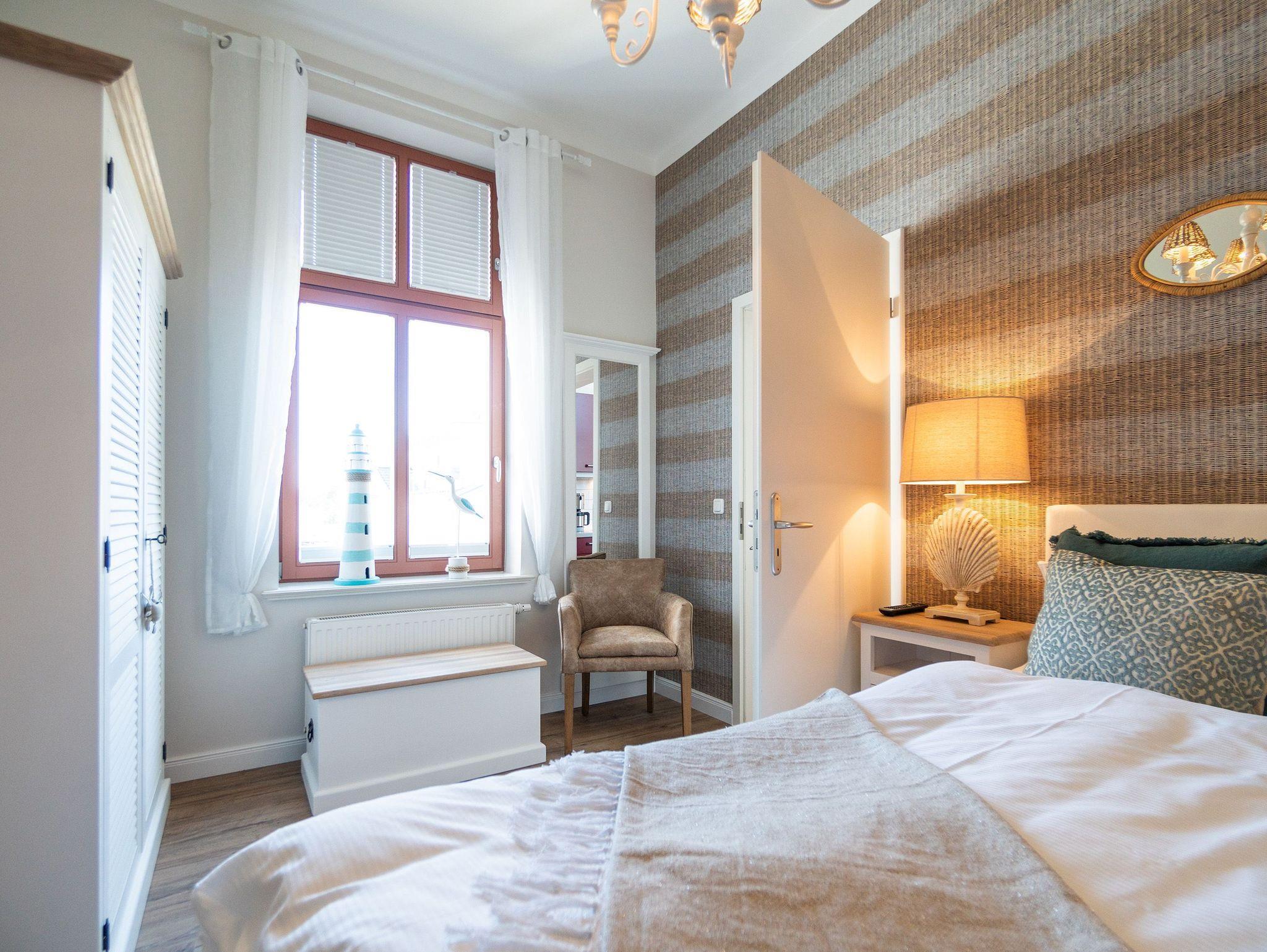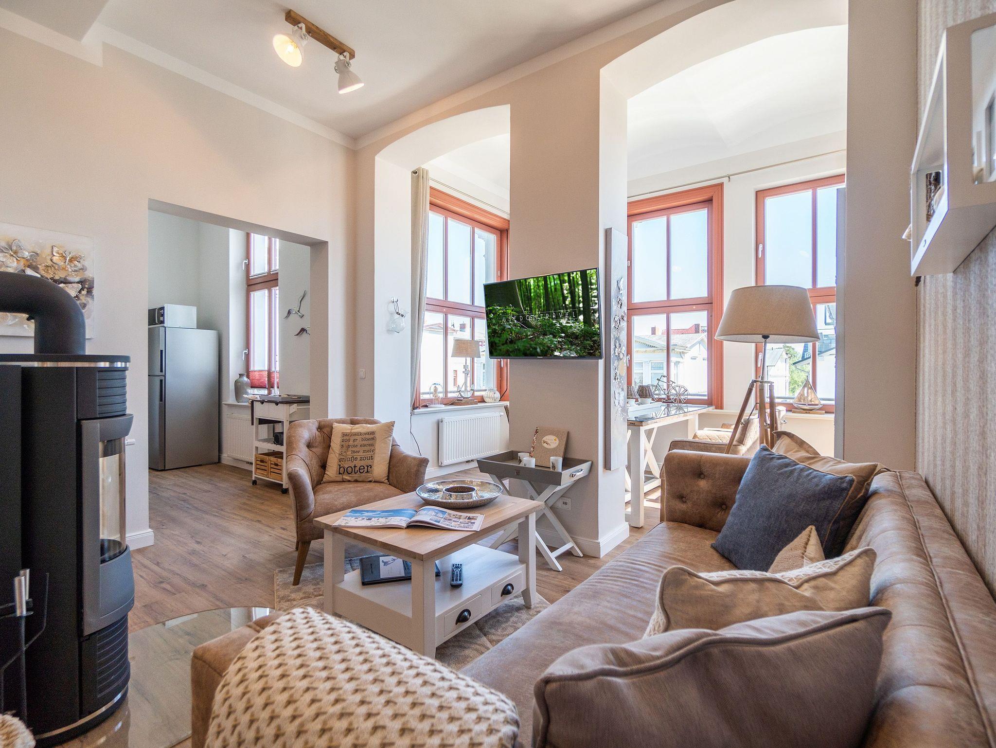 Viel Holz, Naturmaterialien, warme Naturtöne ? das Appartement Nummer 9 im ersten Obergeschoss des Ahlbecker Autorenhauses empfängt Ostseeliebhaber mit urig gemütlichem, maritimem Charme. Von der Naturtapete über die rustikalen und stylischen Möbel bis hin zu den Accessoires ? in diesem Urlaubsdomizil ist alles auf die wunderschöne Ostseelandschaft ausgerichtet. Die Liebe steckt in den vielen kleinen Details. Lassen Sie sich fallen und genießen Sie das entspannende Gefühl von viel Licht und Leichtigkeit. Die hohen Decken der alten Bädervilla lassen tief atmen und geben dem Freiheitsgefühl viel Raum. Benannt nach dem deutschen Schriftsteller Alfred Döblin, hätte dieses Ostseeparadies dem bekannten Essayisten während einer Auszeit am Meer ganz sicher jede Menge Inspiration für neue Werke gegeben. In dieser Wohnung trifft auf wunderbare Weise Alt auf Neu. Die drei Zimmer bieten Platz für vier Erwachsene und ein Kleinkind. Auf Wunsch kann für unsere kleinen Gäste ein Kinderreisebett (ohne zusätzliche Matratze [&] Bettzeug) und ein Kinderhochstuhl (gegen einen Aufpreis) zur Verfügung gestellt werden. Ganz besonders gemütlich wird es beim kuscheligen Beisammensitzen im Wohnzimmer vor dem Kaminofen. Für Unterhaltung sorgt der große Flat-TV. Die Küche ist offen. Vollausgestattet eignet sie sich sogar für kulinarische Meisterleistungen. Sie ist mit sämtlichen Geräten und Geschirr versehen. Essen können Sie im ebenfalls zum Wohnzimmer hin offenen Erker. Lichtdurchflutet, da von drei Seiten mit hohen Fenstern versehen, beginnt hier der Urlaub schon morgens perfekt. Von hier haben Sie uneingeschränkten Blick aufs Meer. Und nach Osten ausgerichtet scheint hier die Sonne auf den Frühstückstisch. Machen Sie die Fenster des Erkers weit auf und lassen Sie das Ostseerauschen in Ihr Appartement. Gebettet sind Sie in der Nummer 9 auf himmlisch komfortablen Boxspringdoppelbetten ( 1,80 m x 2,00 m). Jedes der beiden Schlafzimmer ist darüber hinaus mit einem Schrank und einem Flat-TV ausgestattet. Das Badezimmer ist geräumig. Ganz besonders die schöne Regendusche. Außerdem verfügt das Bad über einen Waschtisch und ein WC. In der Wohnung gibt es kostenfreies WLAN. Bei Anreise sind Ihre Betten bezogen und Handtücher liegen bereit. Falls Sie Ihre Wäsche einmal waschen wollen, steht dafür im Keller des Hauses eine Waschmaschine und ein Trockner zur Verfügung. Gegen eine Gebühr können Sie diese nutzen. Für Ihren Pkw steht Ihnen in der hauseigenen Tiefgarage ein fester Stellplatz zur Verfügung. Besonders praktisch: Für Gäste mit E-Auto steht eine gemeinschaftliche Lademöglichkeit in der Tiefgarage zur Verfügung (wird von vier Wohneinheiten genutzt). Die Abrechnung erfolgt bequem über eine Ladekarte eines bekannten Anbieters oder per Kreditkarte.