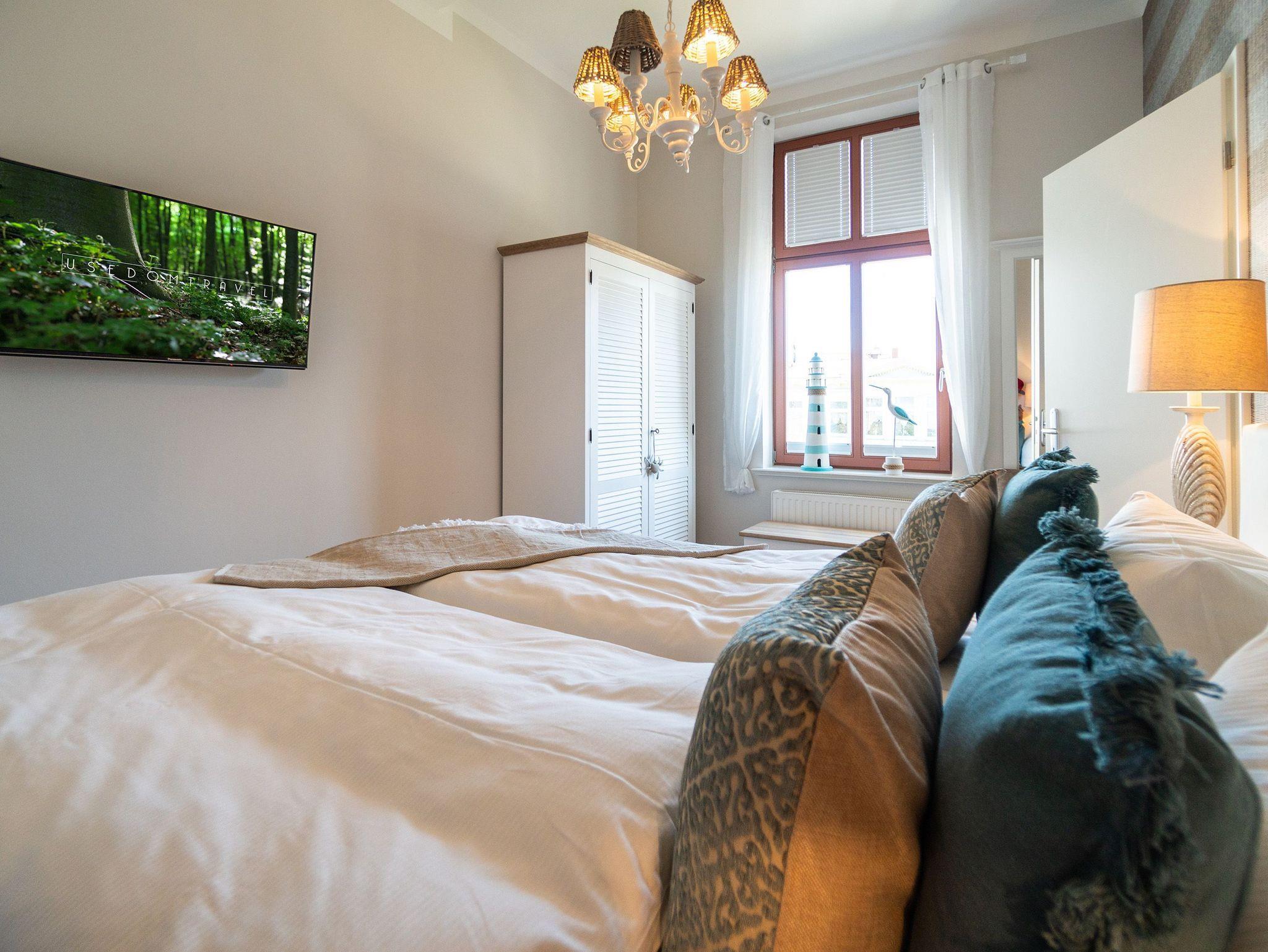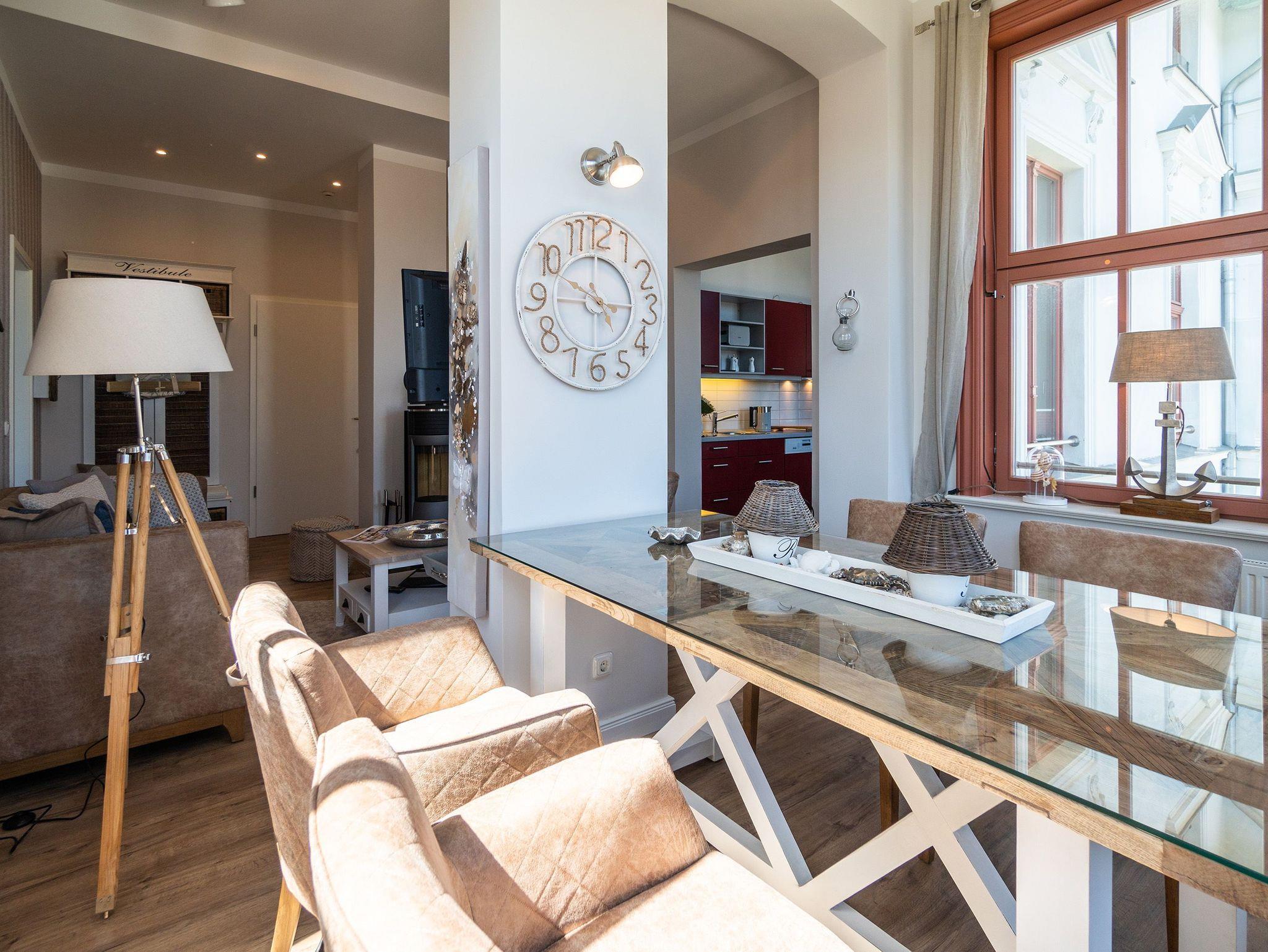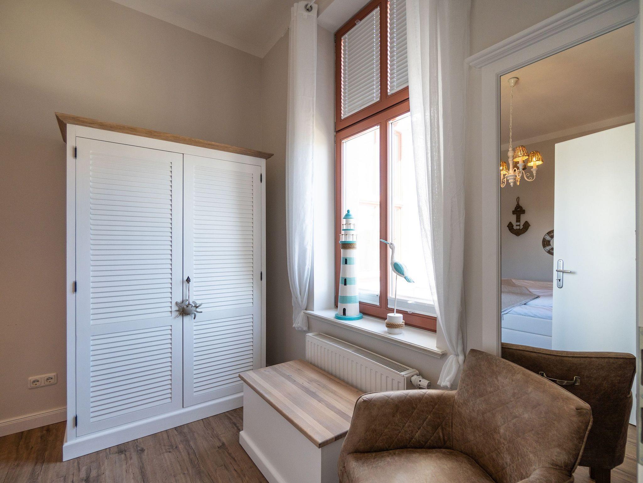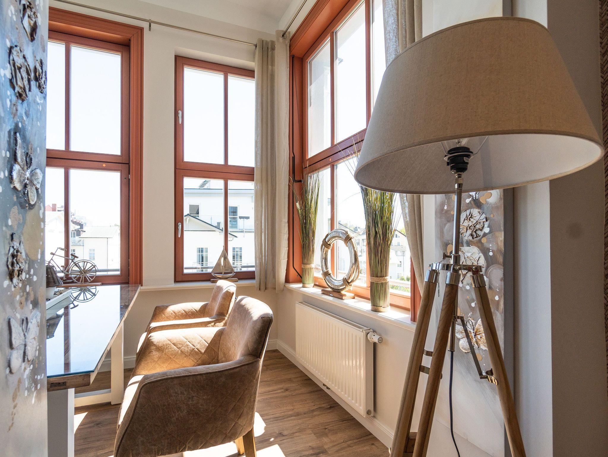 Viel Holz, Naturmaterialien, warme Naturtöne ? das Appartement Nummer 9 im ersten Obergeschoss des Ahlbecker Autorenhauses empfängt Ostseeliebhaber mit urig gemütlichem, maritimem Charme. Von der Naturtapete über die rustikalen und stylischen Möbel bis hin zu den Accessoires ? in diesem Urlaubsdomizil ist alles auf die wunderschöne Ostseelandschaft ausgerichtet. Die Liebe steckt in den vielen kleinen Details. Lassen Sie sich fallen und genießen Sie das entspannende Gefühl von viel Licht und Leichtigkeit. Die hohen Decken der alten Bädervilla lassen tief atmen und geben dem Freiheitsgefühl viel Raum. Benannt nach dem deutschen Schriftsteller Alfred Döblin, hätte dieses Ostseeparadies dem bekannten Essayisten während einer Auszeit am Meer ganz sicher jede Menge Inspiration für neue Werke gegeben. In dieser Wohnung trifft auf wunderbare Weise Alt auf Neu. Die drei Zimmer bieten Platz für vier Erwachsene und ein Kleinkind. Auf Wunsch kann für unsere kleinen Gäste ein Kinderreisebett (ohne zusätzliche Matratze [&] Bettzeug) und ein Kinderhochstuhl (gegen einen Aufpreis) zur Verfügung gestellt werden. Ganz besonders gemütlich wird es beim kuscheligen Beisammensitzen im Wohnzimmer vor dem Kaminofen. Für Unterhaltung sorgt der große Flat-TV. Die Küche ist offen. Vollausgestattet eignet sie sich sogar für kulinarische Meisterleistungen. Sie ist mit sämtlichen Geräten und Geschirr versehen. Essen können Sie im ebenfalls zum Wohnzimmer hin offenen Erker. Lichtdurchflutet, da von drei Seiten mit hohen Fenstern versehen, beginnt hier der Urlaub schon morgens perfekt. Von hier haben Sie uneingeschränkten Blick aufs Meer. Und nach Osten ausgerichtet scheint hier die Sonne auf den Frühstückstisch. Machen Sie die Fenster des Erkers weit auf und lassen Sie das Ostseerauschen in Ihr Appartement. Gebettet sind Sie in der Nummer 9 auf himmlisch komfortablen Boxspringdoppelbetten ( 1,80 m x 2,00 m). Jedes der beiden Schlafzimmer ist darüber hinaus mit einem Schrank und einem Flat-TV ausgestattet. Das Badezimmer ist geräumig. Ganz besonders die schöne Regendusche. Außerdem verfügt das Bad über einen Waschtisch und ein WC. In der Wohnung gibt es kostenfreies WLAN. Bei Anreise sind Ihre Betten bezogen und Handtücher liegen bereit. Falls Sie Ihre Wäsche einmal waschen wollen, steht dafür im Keller des Hauses eine Waschmaschine und ein Trockner zur Verfügung. Gegen eine Gebühr können Sie diese nutzen. Für Ihren Pkw steht Ihnen in der hauseigenen Tiefgarage ein fester Stellplatz zur Verfügung. Besonders praktisch: Für Gäste mit E-Auto steht eine gemeinschaftliche Lademöglichkeit in der Tiefgarage zur Verfügung (wird von vier Wohneinheiten genutzt). Die Abrechnung erfolgt bequem über eine Ladekarte eines bekannten Anbieters oder per Kreditkarte.