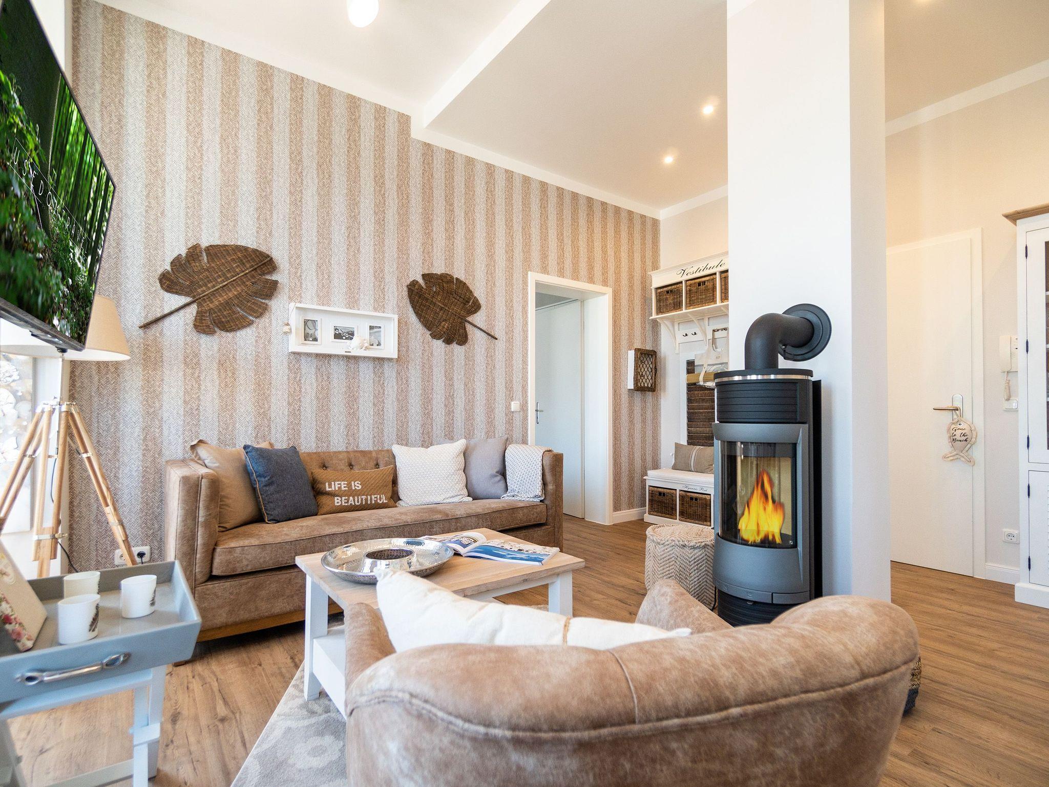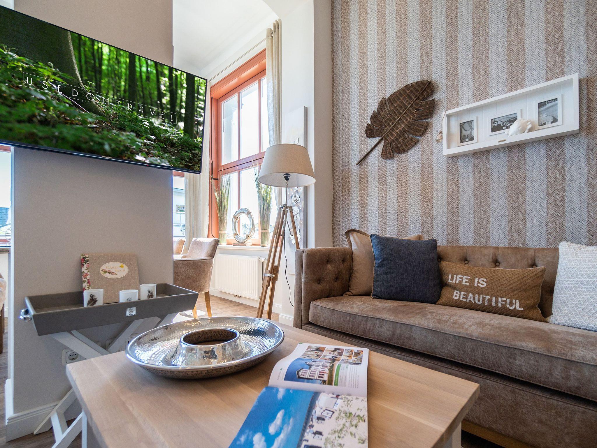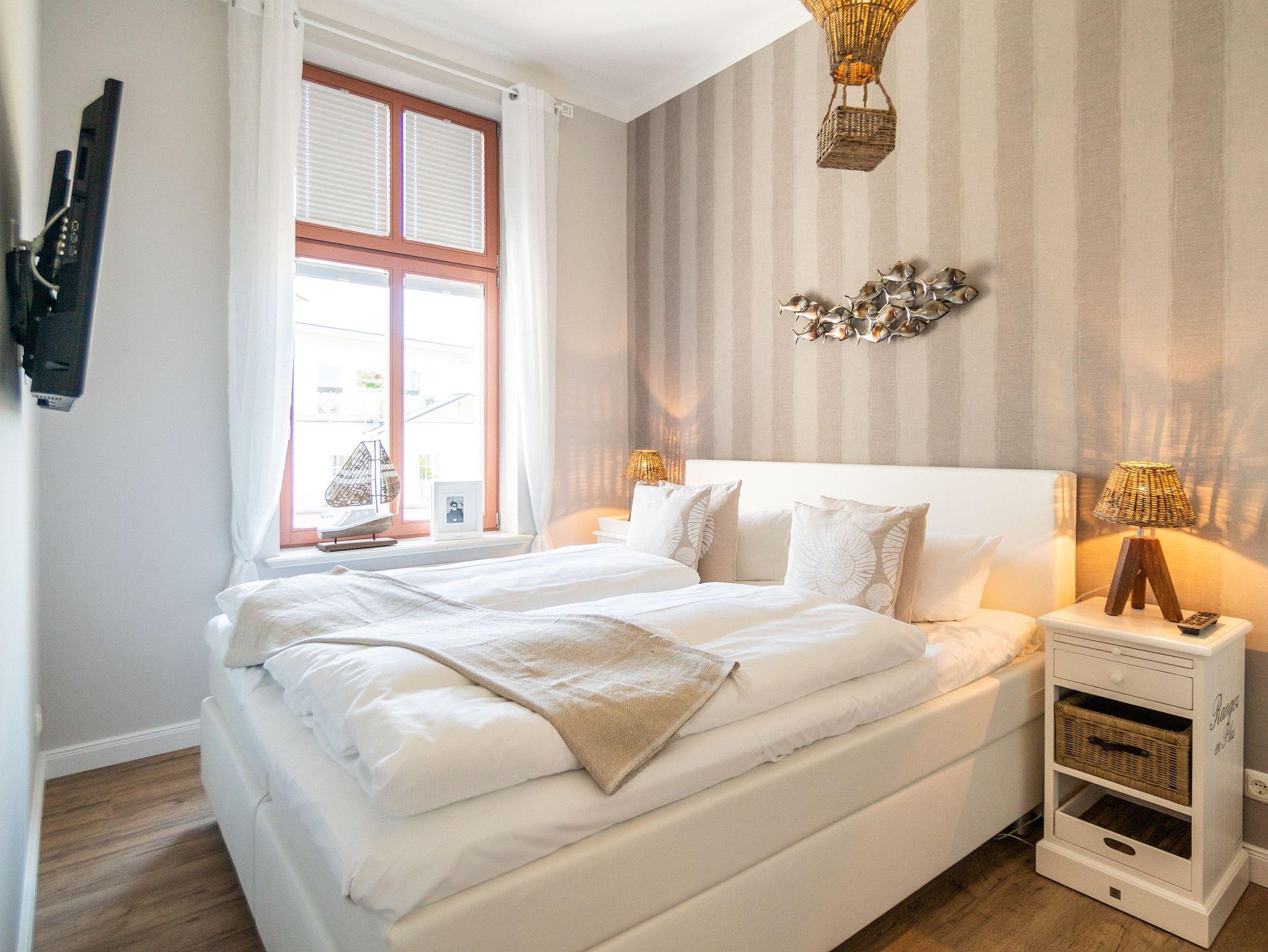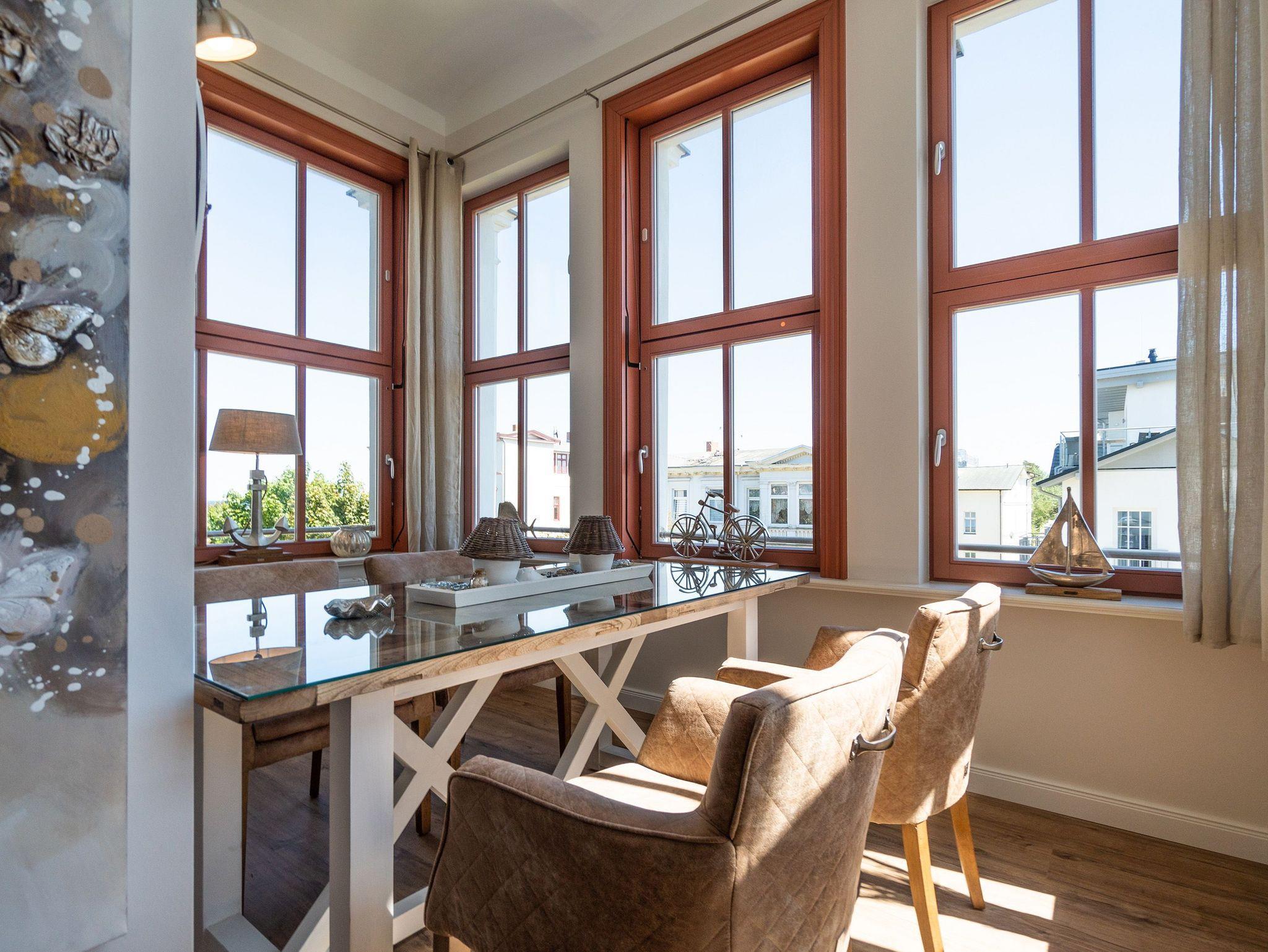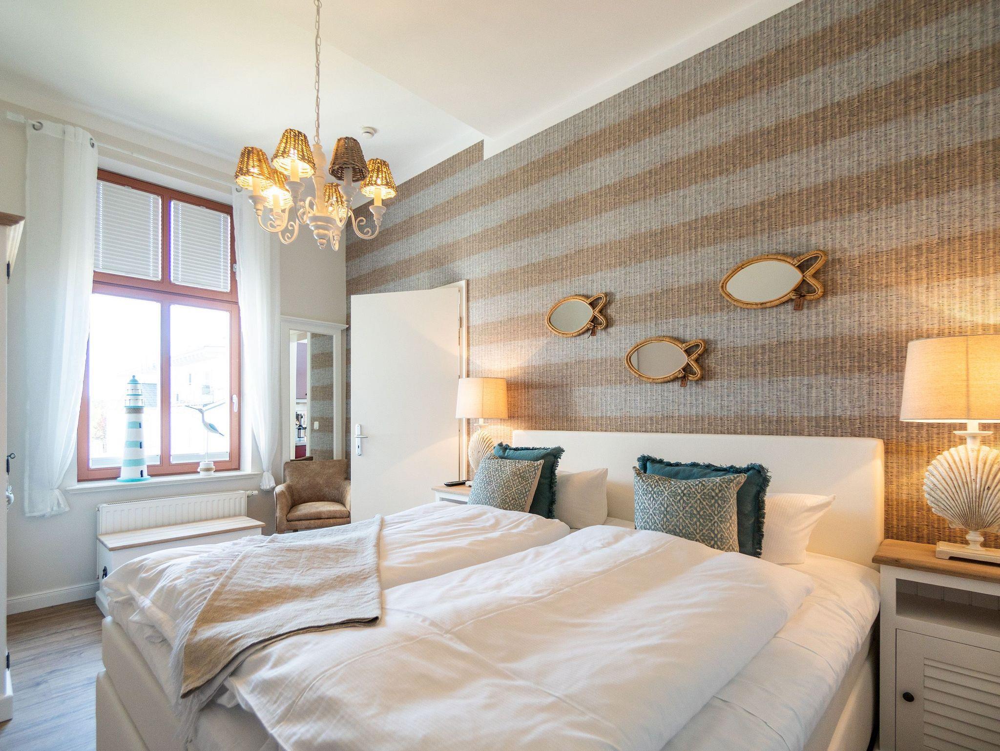 Viel Holz, Naturmaterialien, warme Naturtöne ? das Appartement Nummer 9 im ersten Obergeschoss des Ahlbecker Autorenhauses empfängt Ostseeliebhaber mit urig gemütlichem, maritimem Charme. Von der Naturtapete über die rustikalen und stylischen Möbel bis hin zu den Accessoires ? in diesem Urlaubsdomizil ist alles auf die wunderschöne Ostseelandschaft ausgerichtet. Die Liebe steckt in den vielen kleinen Details. Lassen Sie sich fallen und genießen Sie das entspannende Gefühl von viel Licht und Leichtigkeit. Die hohen Decken der alten Bädervilla lassen tief atmen und geben dem Freiheitsgefühl viel Raum. Benannt nach dem deutschen Schriftsteller Alfred Döblin, hätte dieses Ostseeparadies dem bekannten Essayisten während einer Auszeit am Meer ganz sicher jede Menge Inspiration für neue Werke gegeben. In dieser Wohnung trifft auf wunderbare Weise Alt auf Neu. Die drei Zimmer bieten Platz für vier Erwachsene und ein Kleinkind. Auf Wunsch kann für unsere kleinen Gäste ein Kinderreisebett (ohne zusätzliche Matratze [&] Bettzeug) und ein Kinderhochstuhl (gegen einen Aufpreis) zur Verfügung gestellt werden. Ganz besonders gemütlich wird es beim kuscheligen Beisammensitzen im Wohnzimmer vor dem Kaminofen. Für Unterhaltung sorgt der große Flat-TV. Die Küche ist offen. Vollausgestattet eignet sie sich sogar für kulinarische Meisterleistungen. Sie ist mit sämtlichen Geräten und Geschirr versehen. Essen können Sie im ebenfalls zum Wohnzimmer hin offenen Erker. Lichtdurchflutet, da von drei Seiten mit hohen Fenstern versehen, beginnt hier der Urlaub schon morgens perfekt. Von hier haben Sie uneingeschränkten Blick aufs Meer. Und nach Osten ausgerichtet scheint hier die Sonne auf den Frühstückstisch. Machen Sie die Fenster des Erkers weit auf und lassen Sie das Ostseerauschen in Ihr Appartement. Gebettet sind Sie in der Nummer 9 auf himmlisch komfortablen Boxspringdoppelbetten ( 1,80 m x 2,00 m). Jedes der beiden Schlafzimmer ist darüber hinaus mit einem Schrank und einem Flat-TV ausgestattet. Das Badezimmer ist geräumig. Ganz besonders die schöne Regendusche. Außerdem verfügt das Bad über einen Waschtisch und ein WC. In der Wohnung gibt es kostenfreies WLAN. Bei Anreise sind Ihre Betten bezogen und Handtücher liegen bereit. Falls Sie Ihre Wäsche einmal waschen wollen, steht dafür im Keller des Hauses eine Waschmaschine und ein Trockner zur Verfügung. Gegen eine Gebühr können Sie diese nutzen. Für Ihren Pkw steht Ihnen in der hauseigenen Tiefgarage ein fester Stellplatz zur Verfügung. Besonders praktisch: Für Gäste mit E-Auto steht eine gemeinschaftliche Lademöglichkeit in der Tiefgarage zur Verfügung (wird von vier Wohneinheiten genutzt). Die Abrechnung erfolgt bequem über eine Ladekarte eines bekannten Anbieters oder per Kreditkarte.