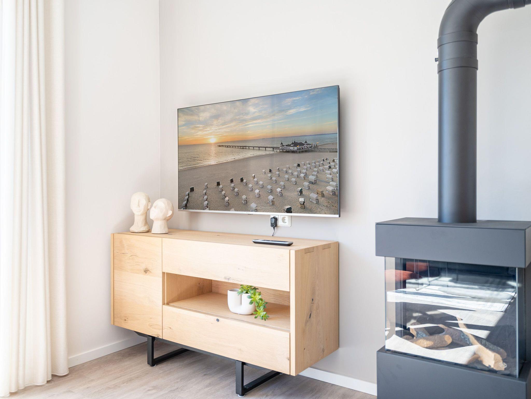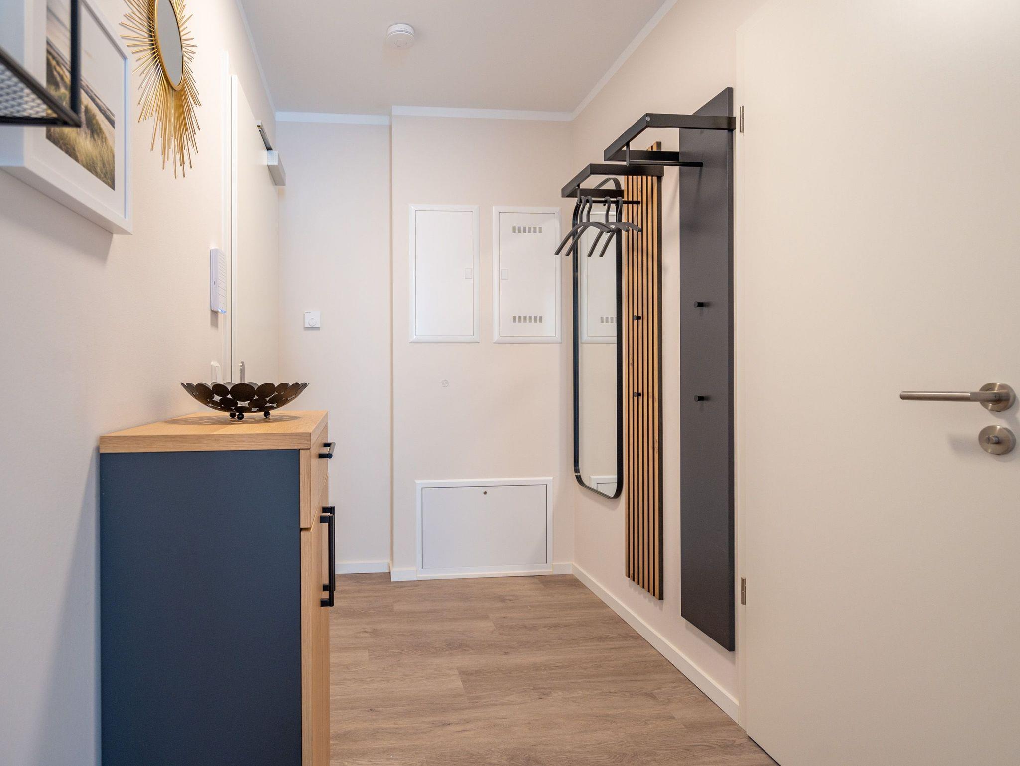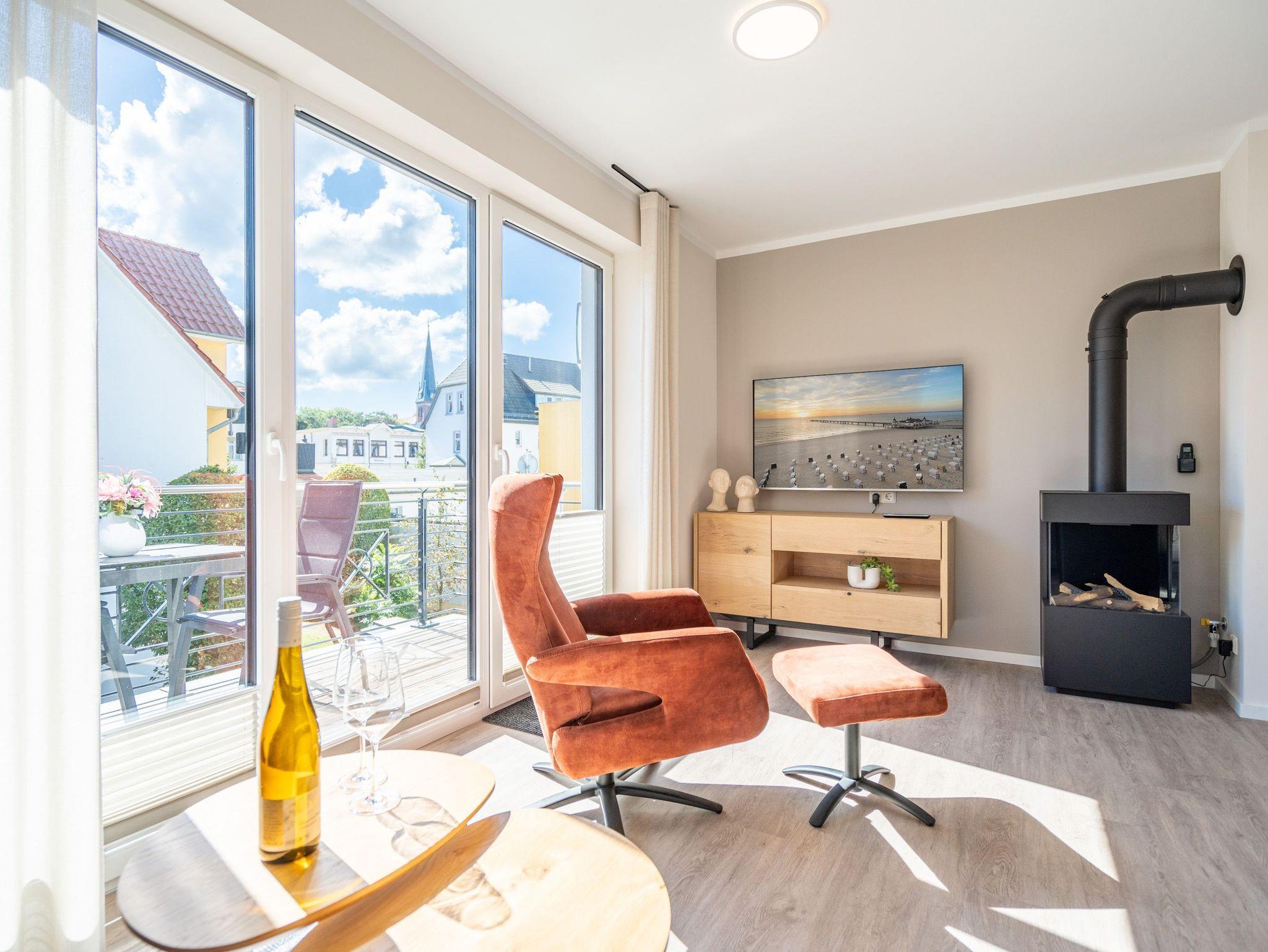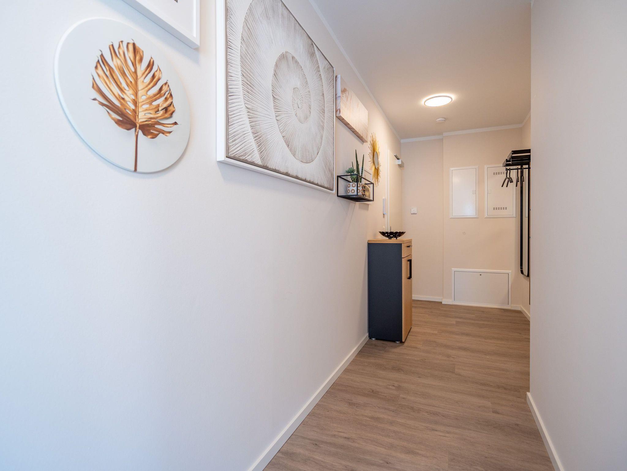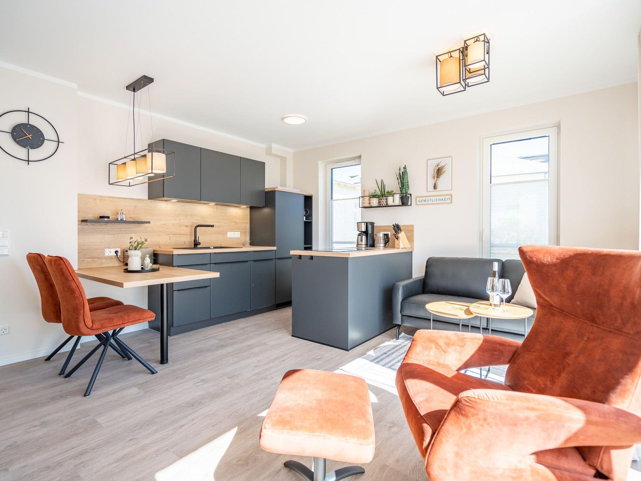 Diese einladende 2-Raum-Ferienwohnung N° 07 im Quartier 6 bietet auf 55 Quadratmetern in der ersten Etage ein komfortables Zuhause für bis zu 2 Personen und ein Kleinkind (im Kinderreisebett). Der offene Wohn-Essbereich ist stilvoll gestaltet und umfasst eine voll ausgestattete Küchenzeile mit einem Essplatz sowie einer einladenden Sitzgruppe. Hier können Sie entspannt auf dem 55-Zoll-Flat-TV fernsehen oder den Gaskamin per Fernbedienung genießen. Vom Wohnbereich aus haben Sie Zugang zu einem Süd-Ost-Balkon, der mit Gartenmöbeln ausgestattet ist ? perfekt für ein Frühstück in der Sonne. Im Schlafzimmer erwartet Sie ein komfortables Boxspringdoppelbett (1,80m x 2,00m), ein geräumiger Kleiderschrank, eine Kommode und ein weiterer Flat-TV (43 Zoll). Das Badezimmer ist modern eingerichtet und verfügt über eine Dusche, einen Waschtisch, ein WC und eine finnische Sauna, die Ihnen entspannte Stunden verspricht. Zu den weiteren Annehmlichkeiten gehören die kostenfreie Nutzung einer Waschmaschine sowie ein PKW-Stellplatz in der Tiefgarage. Zusätzlich steht Ihnen ein eigener Kellerraum zur Verfügung, in dem Sie Ihre Fahrräder sicher unterbringen können ? inklusive Lademöglichkeit für E-Bikes. Diese Ferienwohnung bietet alles, was Sie für einen rundum gelungenen Aufenthalt benötigen.