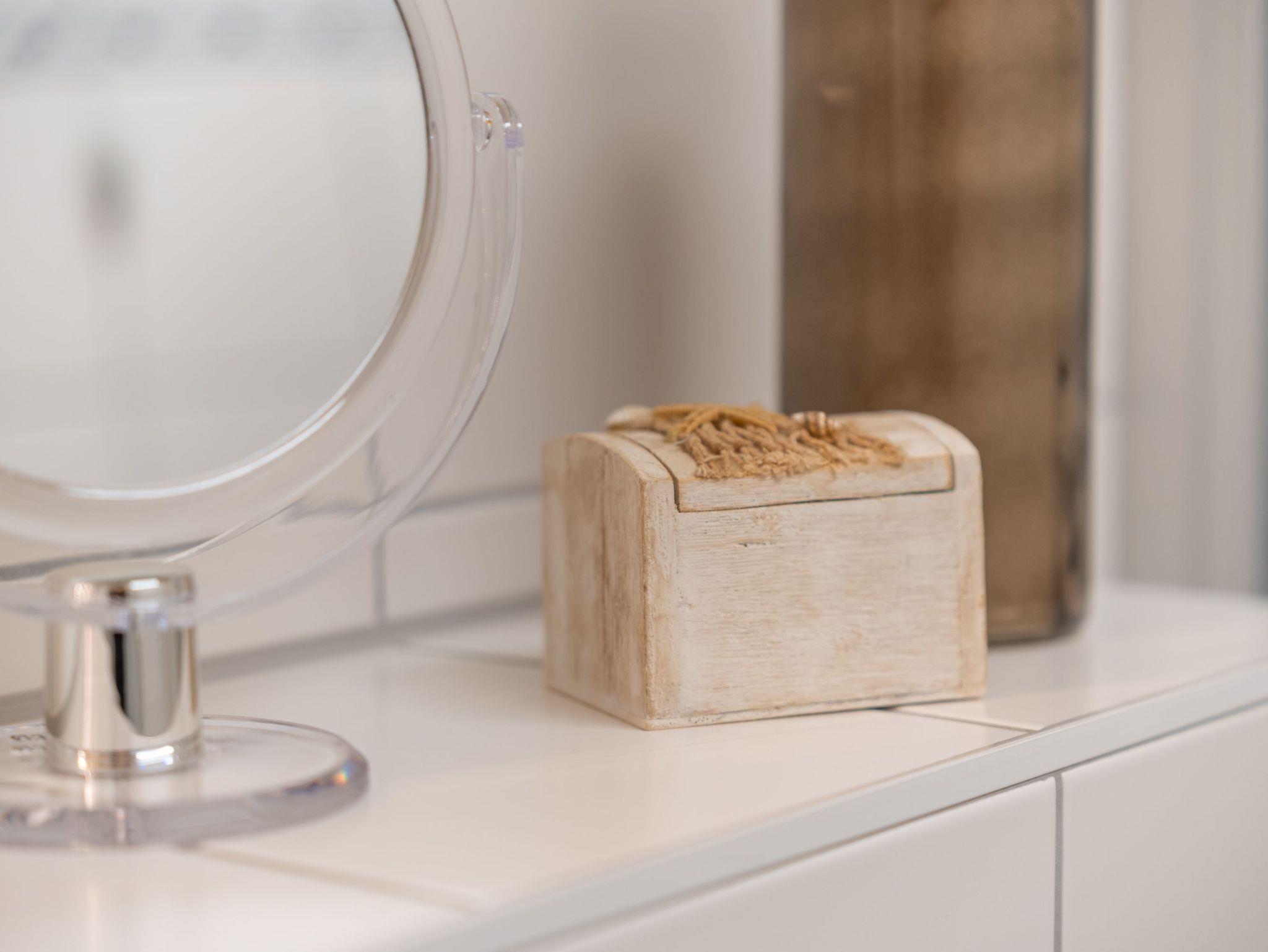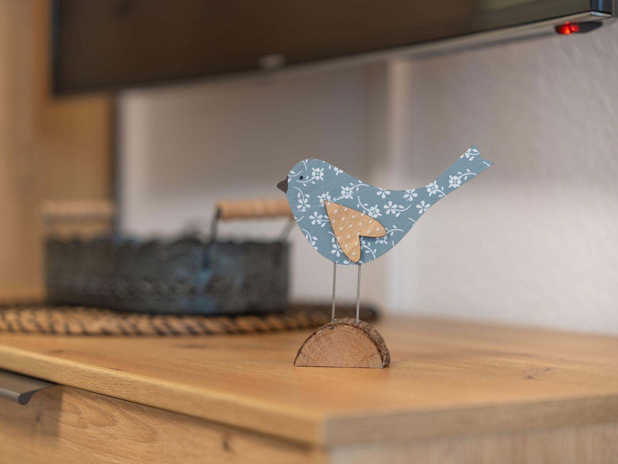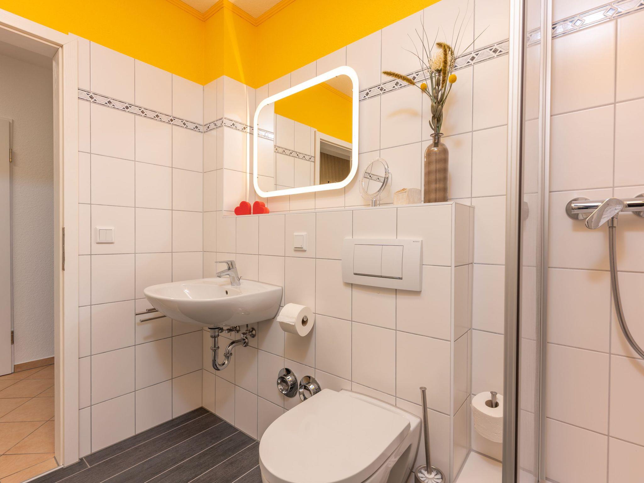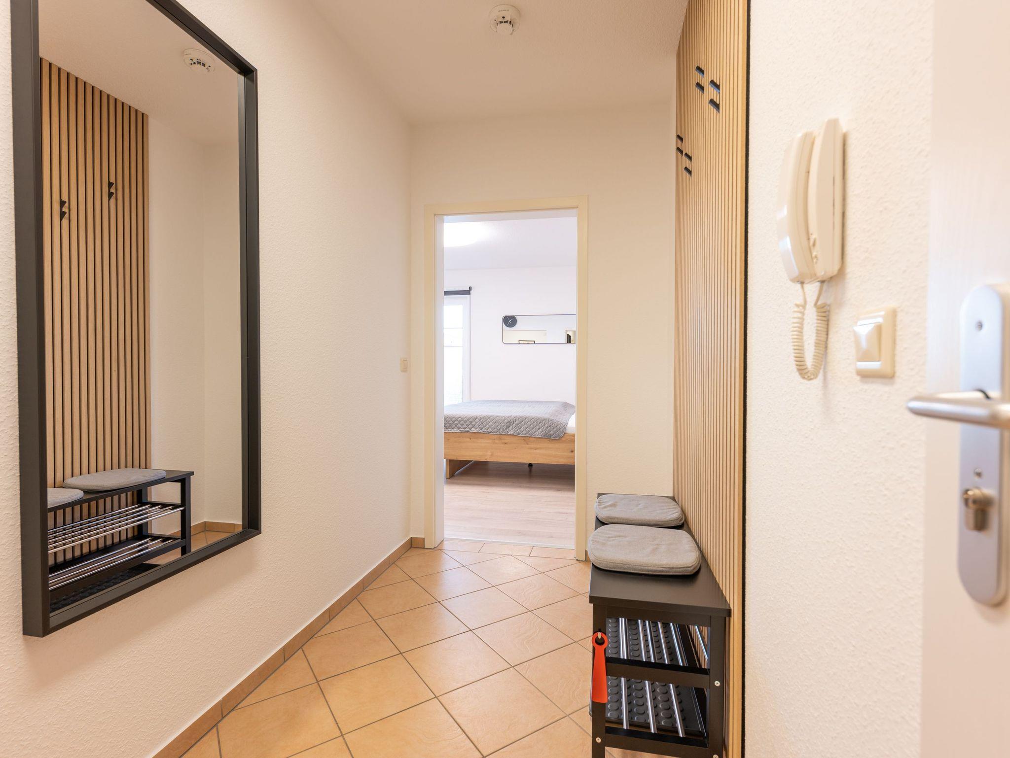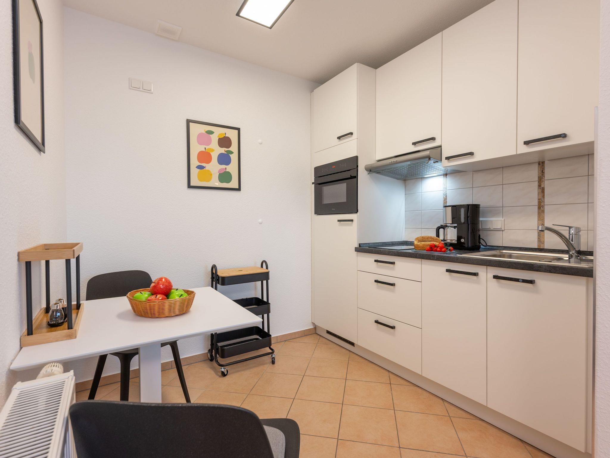 Die kleine offene Küche ist funktional eingerichtet und bietet alles, was man im Urlaub braucht: Glaskeramik-Kochfeld, Backofen, Wasserkocher, Toaster und Kaffeemaschine für den schnellen Kaffee am Morgen. Das moderne Bad verfügt über Dusche und WC und rundet den Komfort der Wohnung ab.