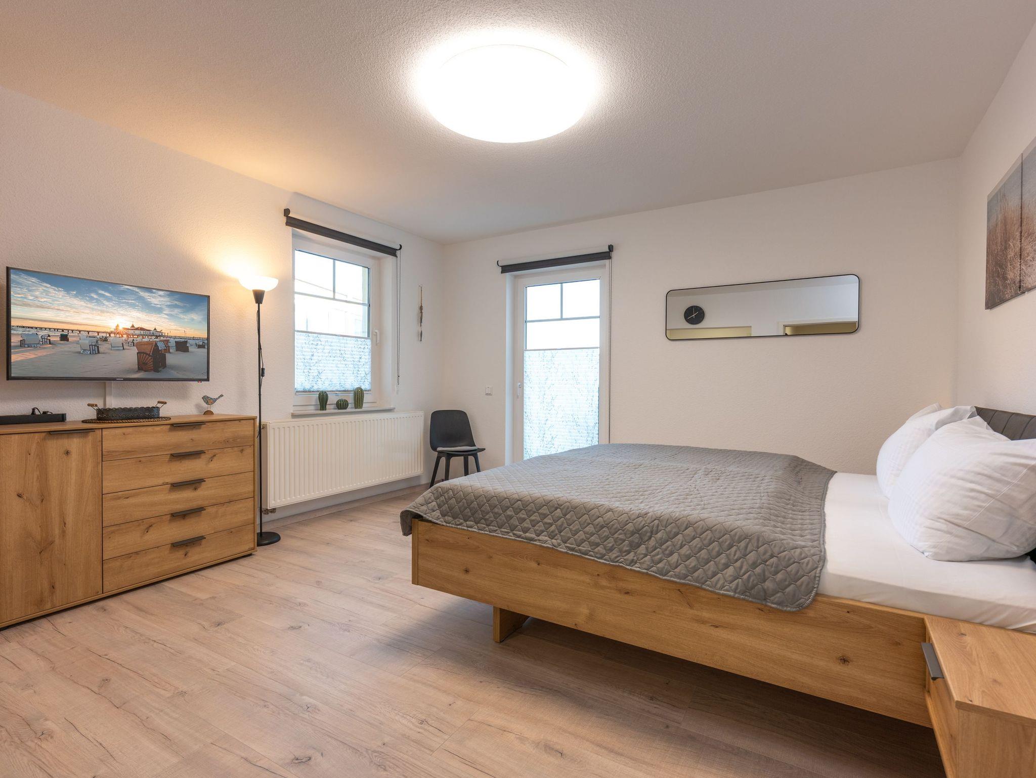 Der Wohn- und Schlafbereich erinnert an ein stilvolles Hotelzimmer und ist mit einem komfortablen Doppelbett, Flachbild-TV und einer charmanten Wohlfühlatmosphäre ausgestattet. Bei Bedarf lassen sich Babybett und Hochstuhl bequem und stressfrei hinzubuchen ? perfekt für junge Familien.