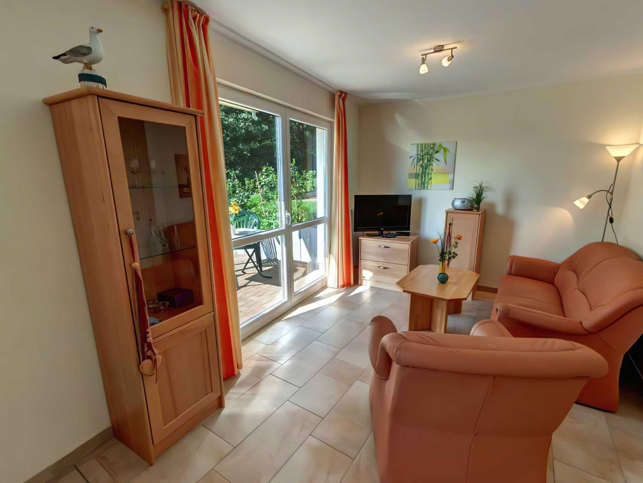 Erdgeschoss 38 m² (2 Personen) Zur Ausstattung der Erdgeschoss Wohnung gehört ein Schlafzimmer mit Doppeltbett , ein Wohnzimmer mit integrierter vollausgestatteter Küche (Geschirrspüler, Ceranherd mit Backofen, Mikrowelle, Kaffeemaschine) einem Bad mit Dusche/WC und einer großen Terrasse mit Sitzmöglichkeiten.