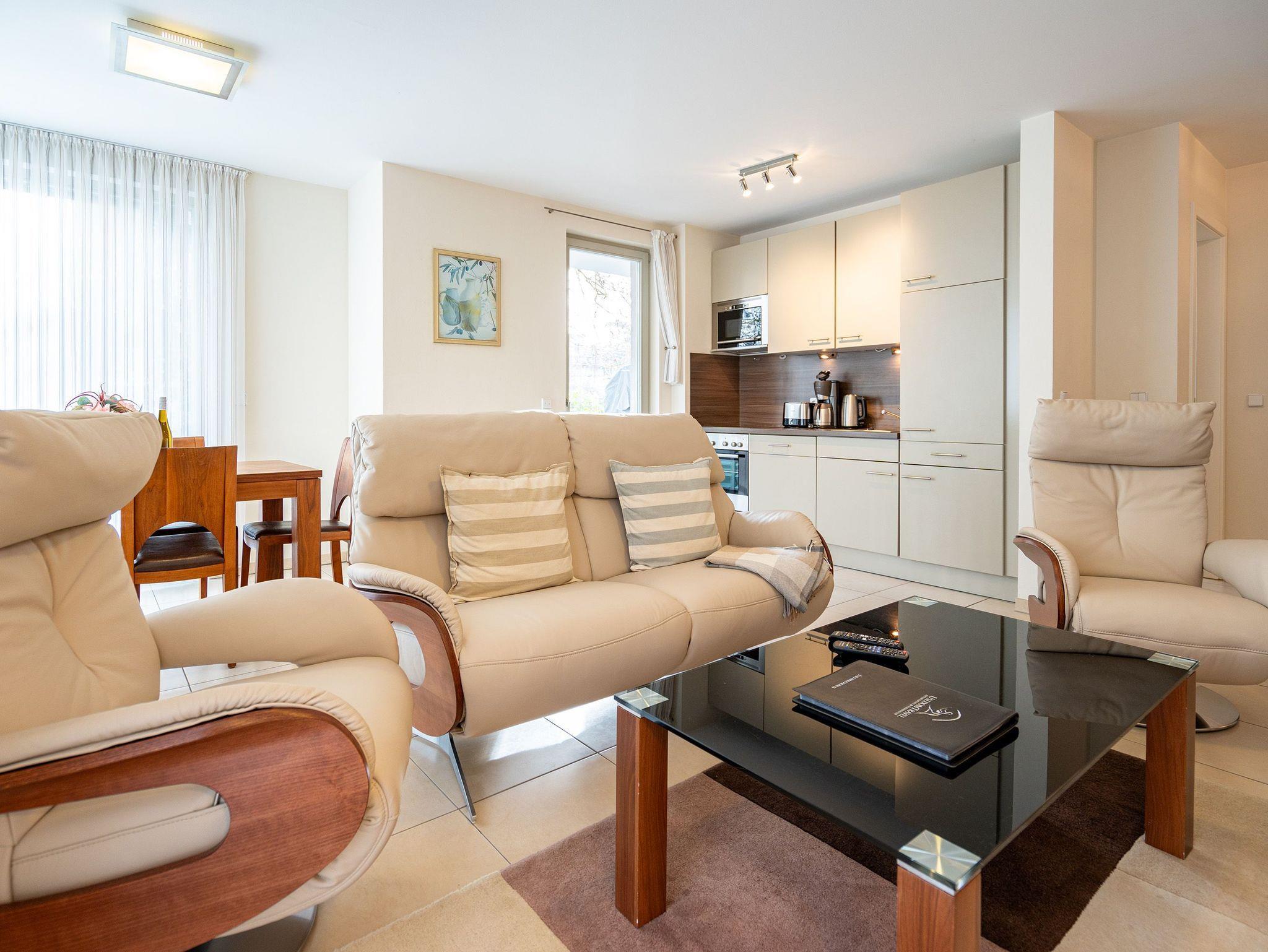 Die stilvolle 3-Raum-Ferienwohnung (68 m²) im Hochparterre der Villa Estrelia heißt bis zu 4 Gäste herzlich willkommen. Helle Räume und eine geschmackvolle Einrichtung schaffen eine Atmosphäre zum Entspannen und Wohlfühlen. Das Appartement verfügt über ein gemütliches Wohnzimmer mit Sitzgruppe, eine gut ausgestattete Küchenzeile mit Essbereich sowie zwei Schlafzimmer mit komfortablen Doppelbetten. Das moderne Badezimmer bietet eine Dusche, eine Badewanne und einen Doppelwaschtisch, ergänzt durch ein separates Gäste-WC. Ein besonderes Highlight ist die schöne Ost-/Südterrasse mit Strandkorb ideal, um die frische Meeresluft zu genießen. Für Ihren Komfort sind die Betten bei Anreise bezogen, und Handtücher liegen in Erstausstattung bereit. Das kostenfreie WLAN-Netz im Haus rundet das Angebot ab.
