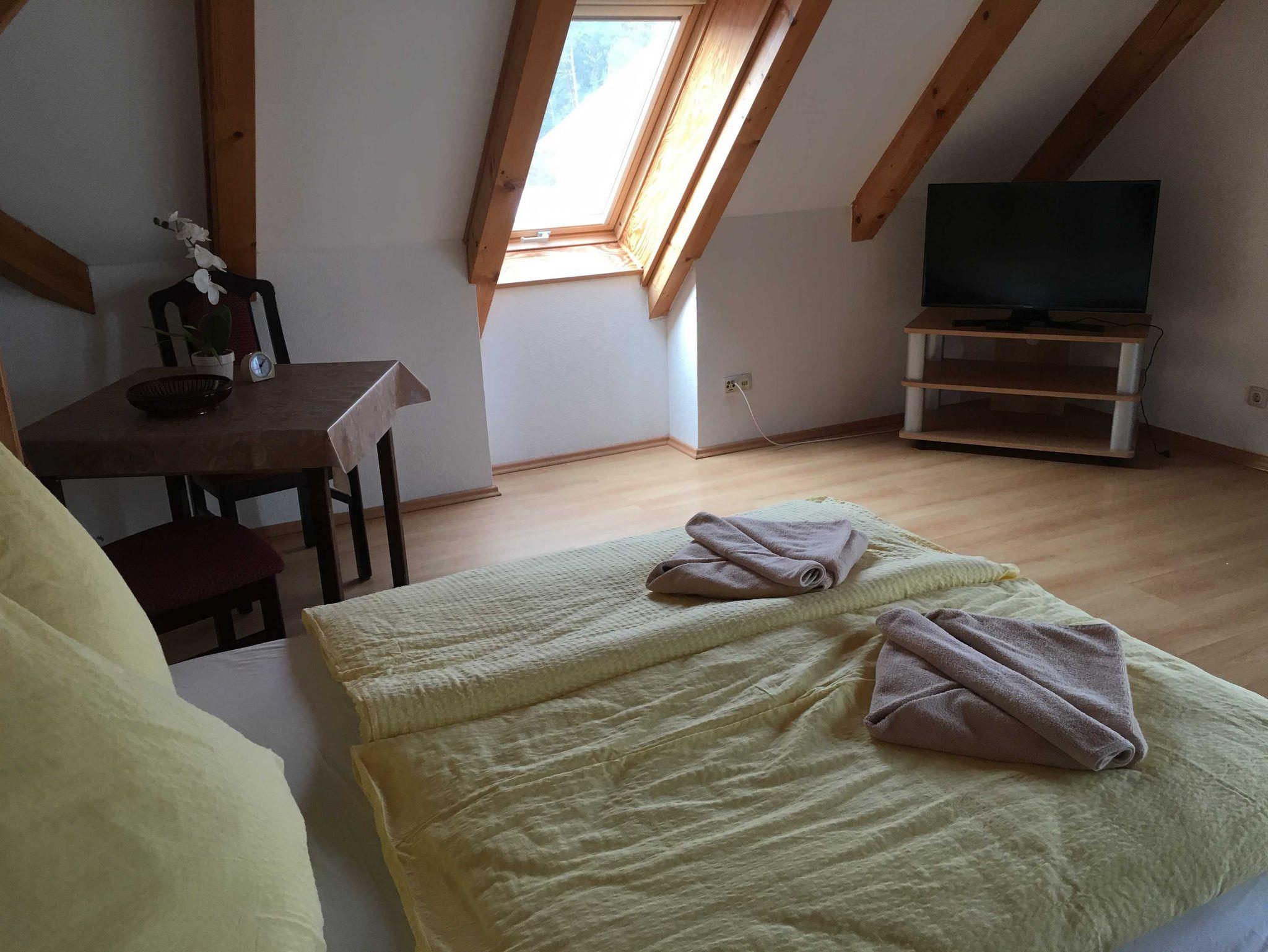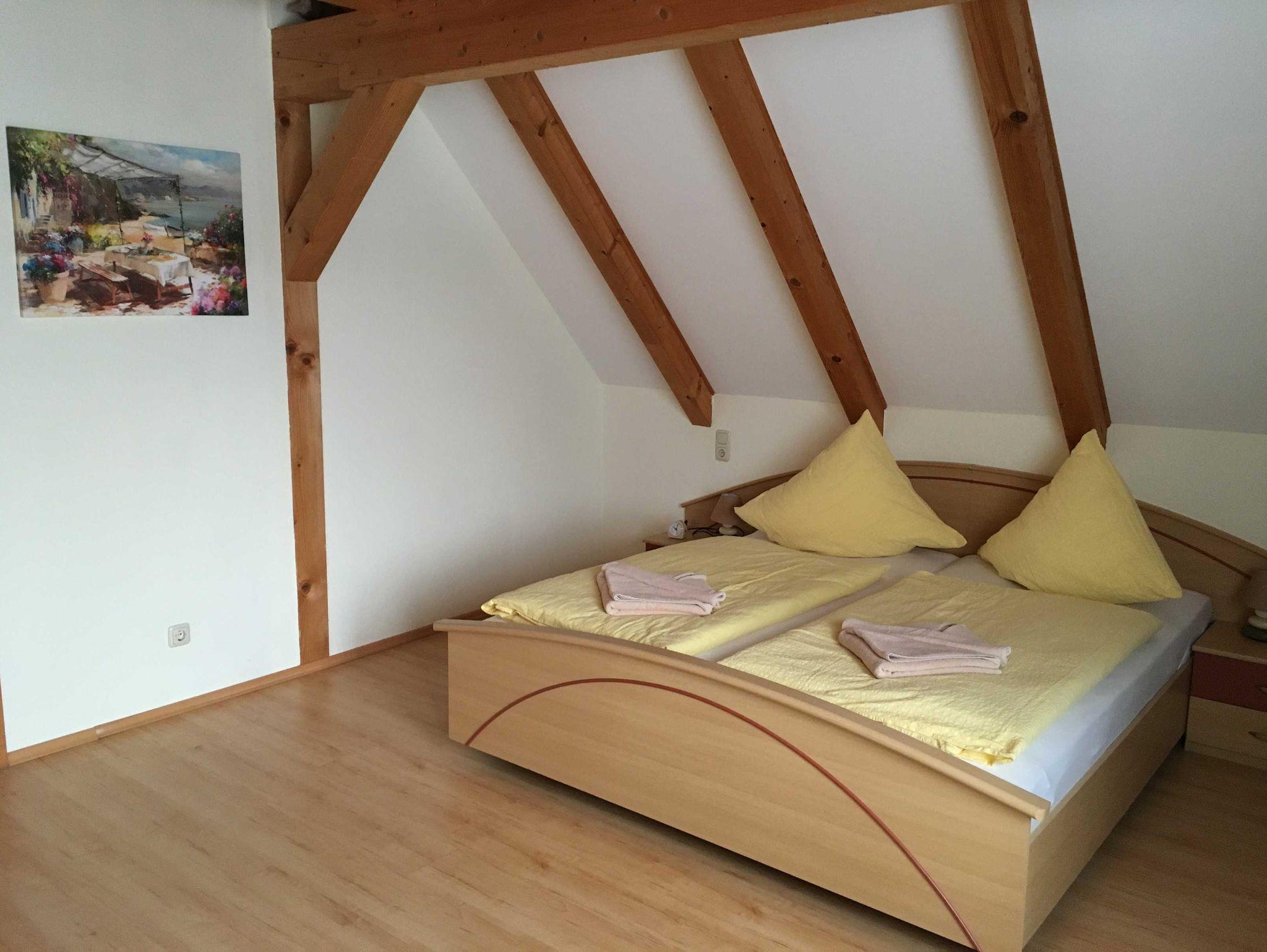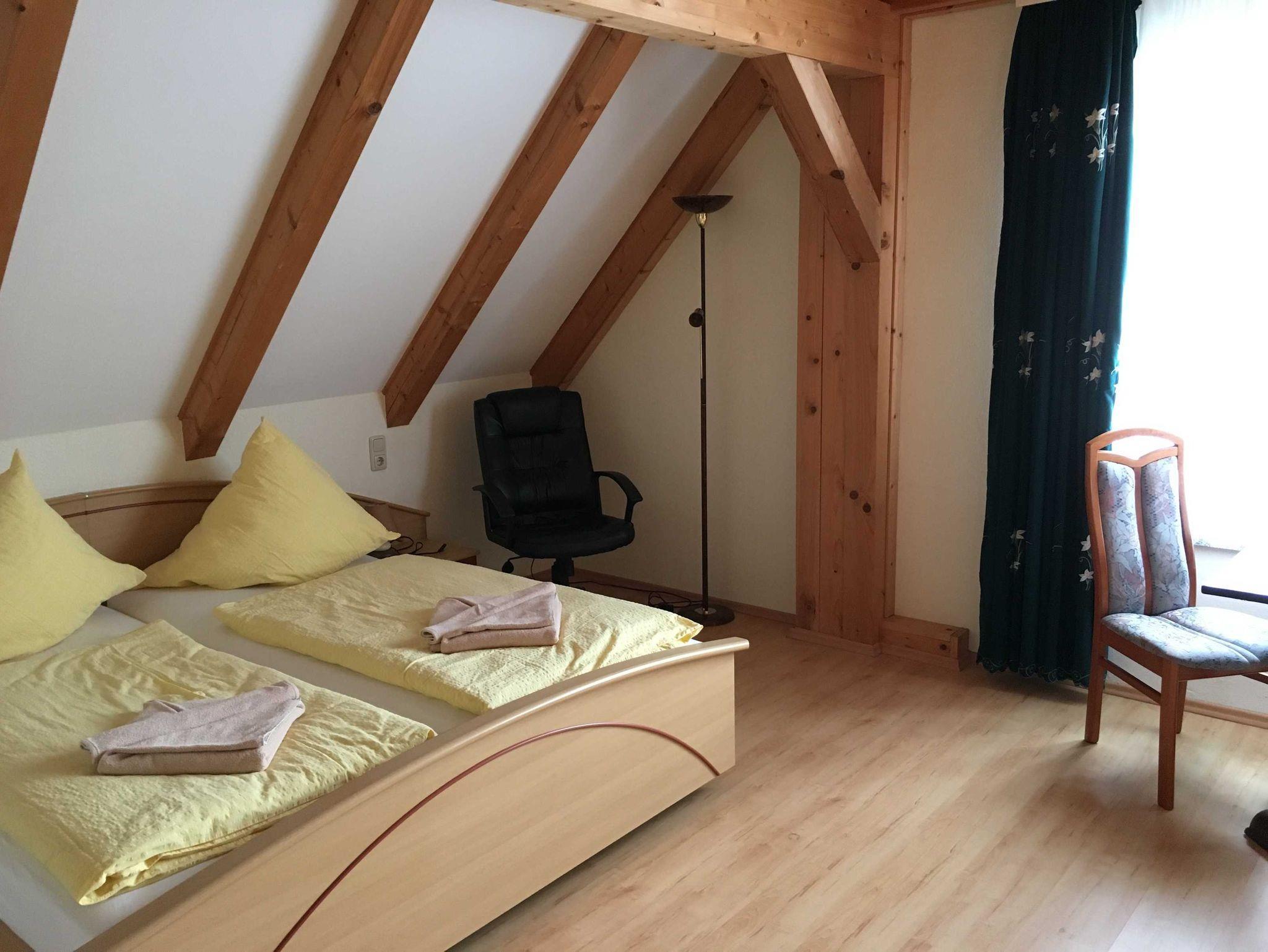 Im ersten Stock sind 2 Schlafzimmer, ein Wannenbad mit WC und BD sowie ein kleiner Aufenthaltsraum mit Kühlschrank, Wasserkocher, Bügeleisen und Bügelbrett.