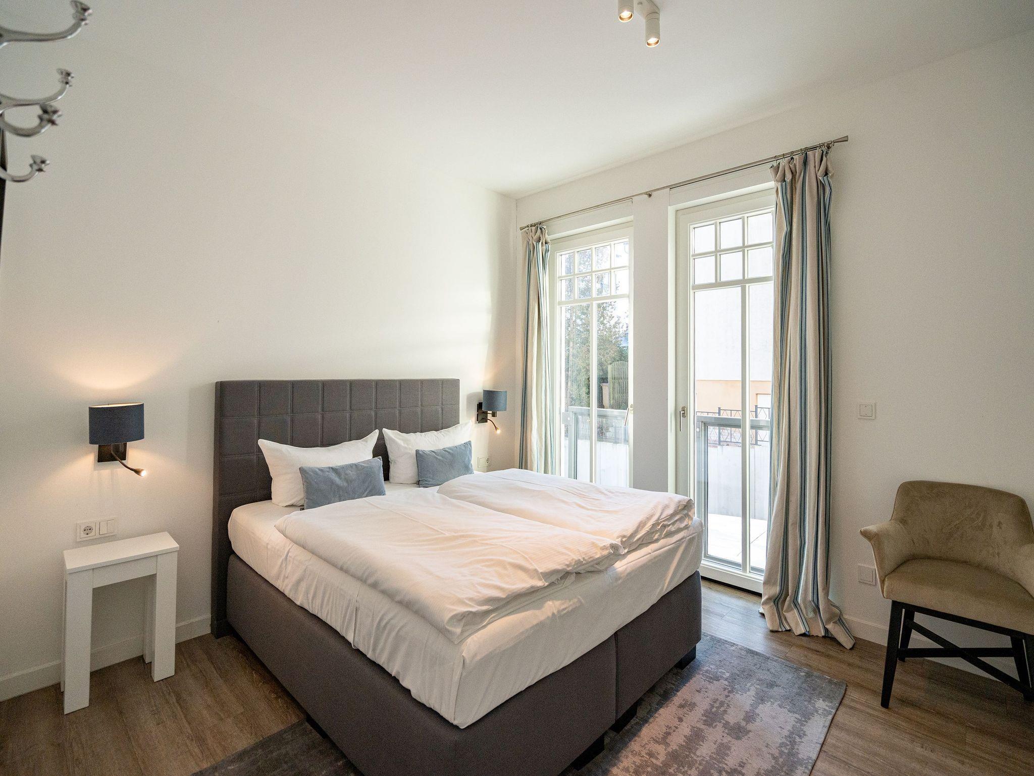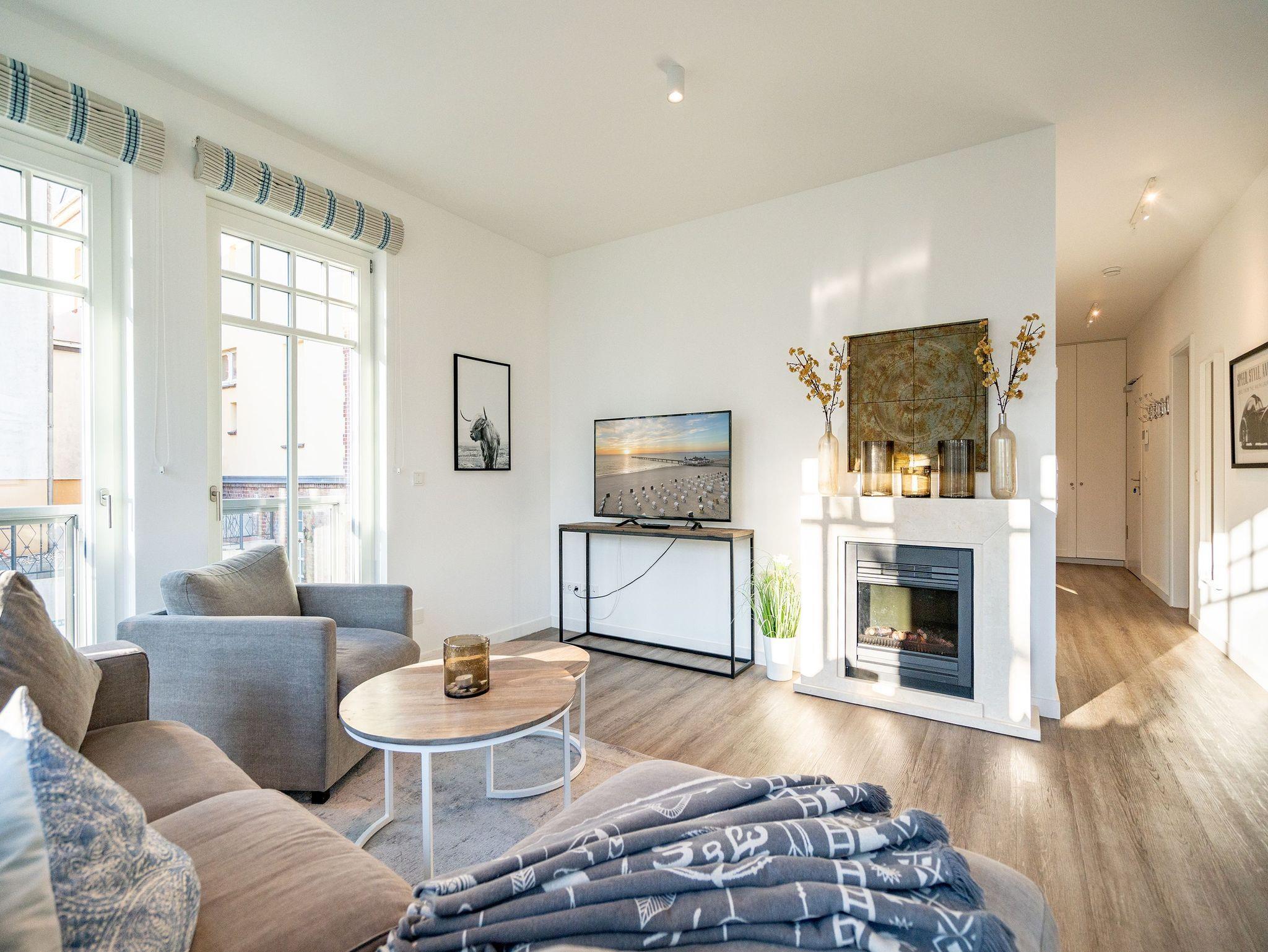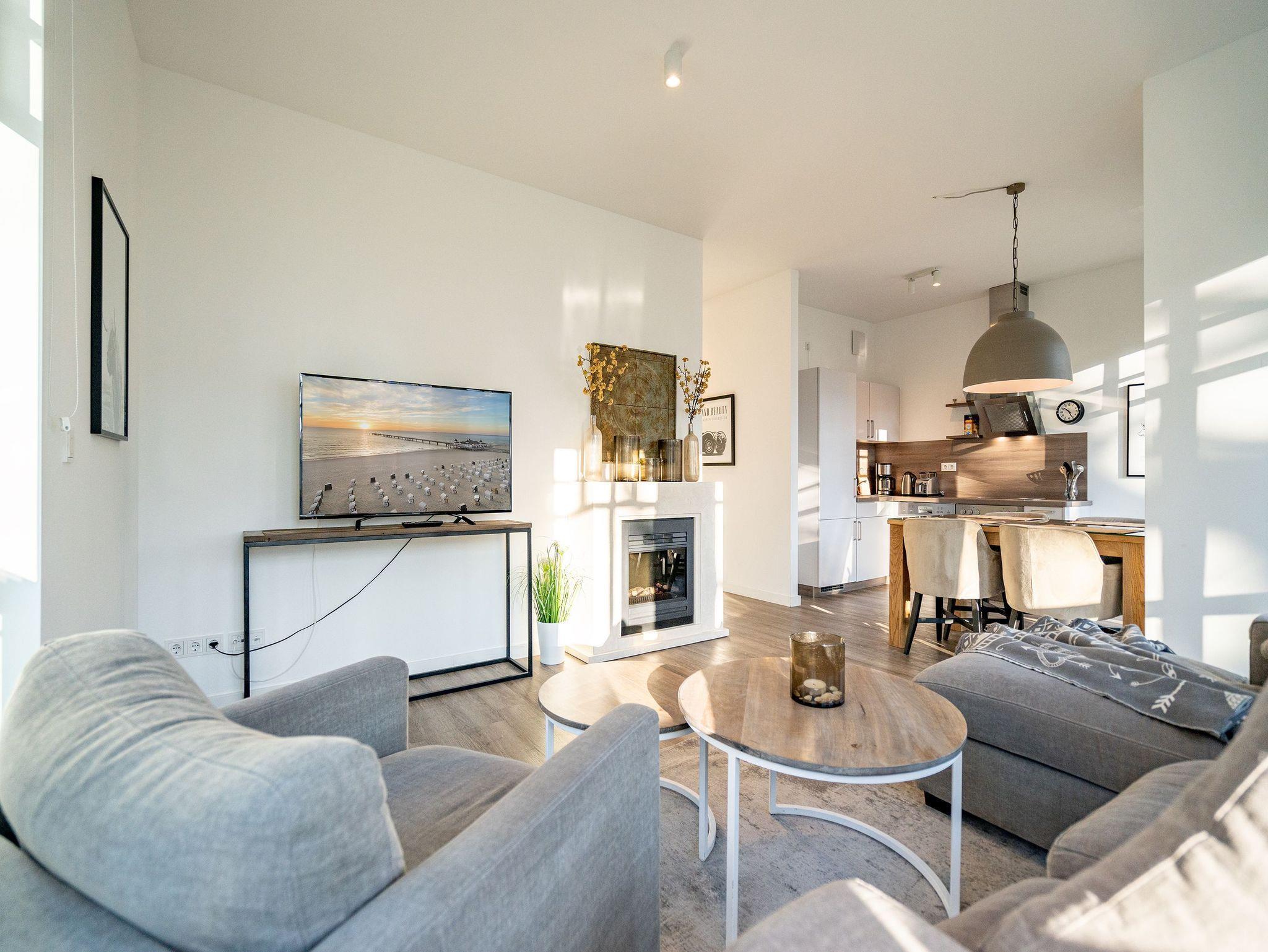 Eine harmonisch abgestimmte Inneneinrichtung und dezente Farben - so begrüßt Sie das gemütliche 68 Quadratmeter große Appartement 8 im Westendpalais. Das exklusive 3-Raum-Domizil eignet sich für maximal 2 Erwachsene, 2 Kinder und ein Kleinkind (bis 3 Jahre im Kinderreisebett). Viel Platz zum Entspannen bietet der offene Wohn-Essbereich mit Sofalandschaft und Flat-TV. Ein Elektro-Kamin sorgt für zusätzliche Wohlfühlatmosphäre, besonders an kühleren Tagen. Einen seitlichen Blick auf die Ostsee gibt der kleine Balkon frei, der auch von der angrenzenden Küche begehbar ist. Die hochwertige Küchenzeile ist u.a. mit einem Induktionsherd und allem, was Sie zum Zubereiten Ihrer Speisen benötigen, ausgestattet. Ein Essplatz für bis zu 5 Personen rundet den Wohn-Essbereich ab. Sollten Sie die Ostsee nachts einmal nicht hören, können Sie zumindest von ihr träumen. Dafür steht ein Schlafzimmer mit Doppelbett (1,60m x 2,00m) und eine Schlafcouch (1,20m x 2,00m) in einem separaten Wohnraum zur Verfügung. Beide Zimmer verfügen darüber hinaus über Flat-TVs. Das großzügig geschnittene Badezimmer mit Badewanne, Waschtisch und WC hält als Highlight eine Finnische Sauna für Sie bereit. Ein Tiefgaragenstellplatz ist für Sie reserviert. Für einen sorgenfreien Urlaub sind die Betten bei Anreise bezogen und Handtücher liegen für Sie bereit. Kostenfreies WLAN und ein Fahrstuhl machen den Komfort in diesem Appartement komplett.